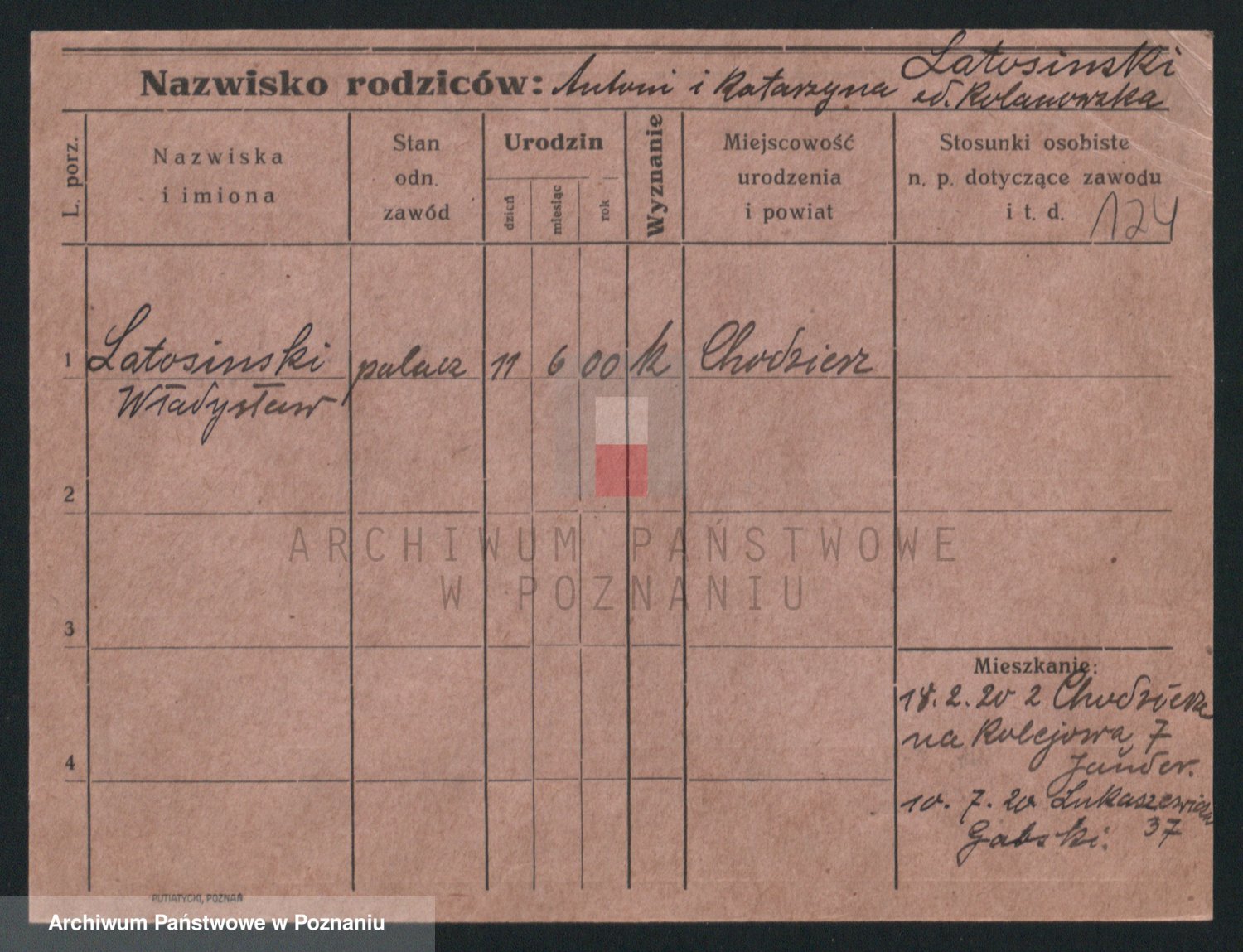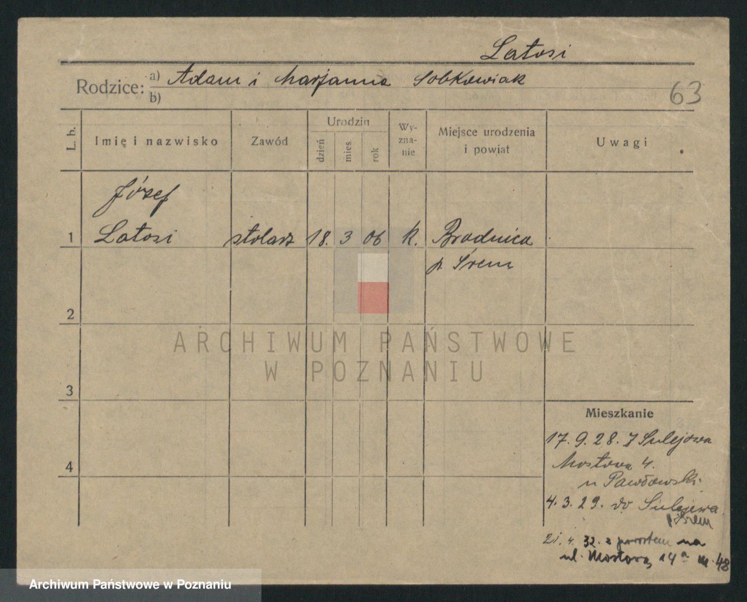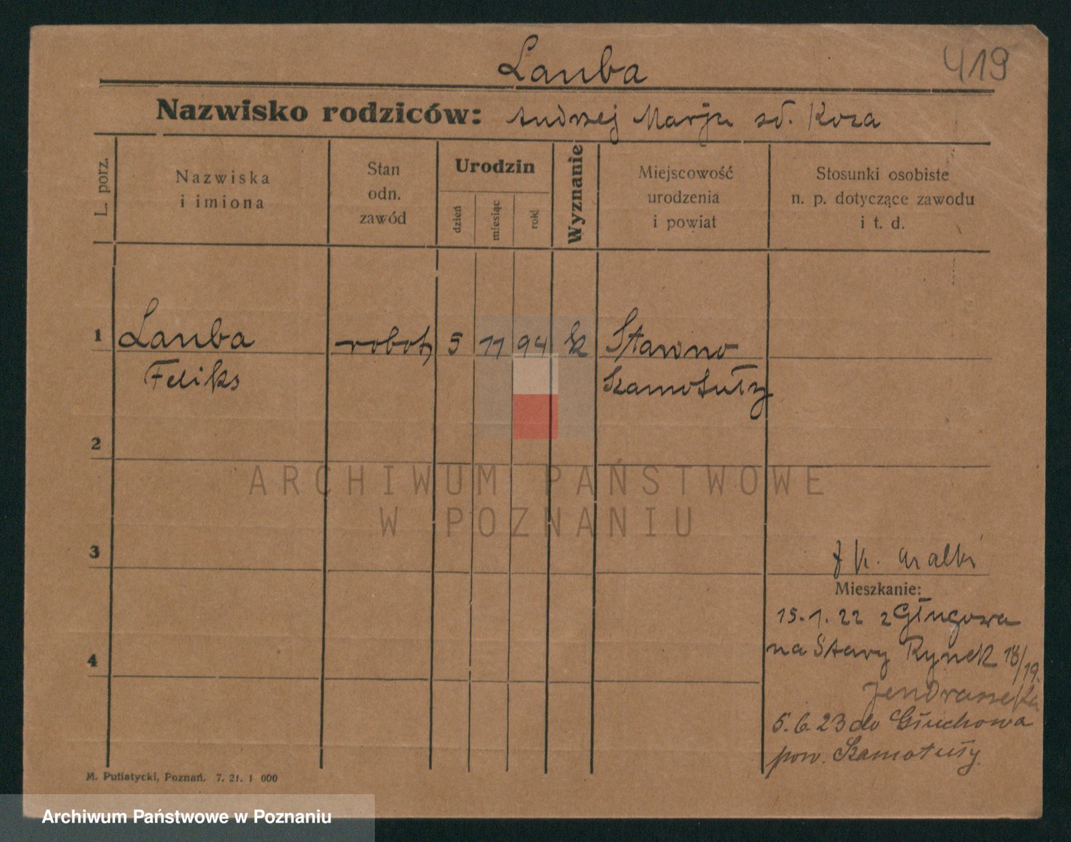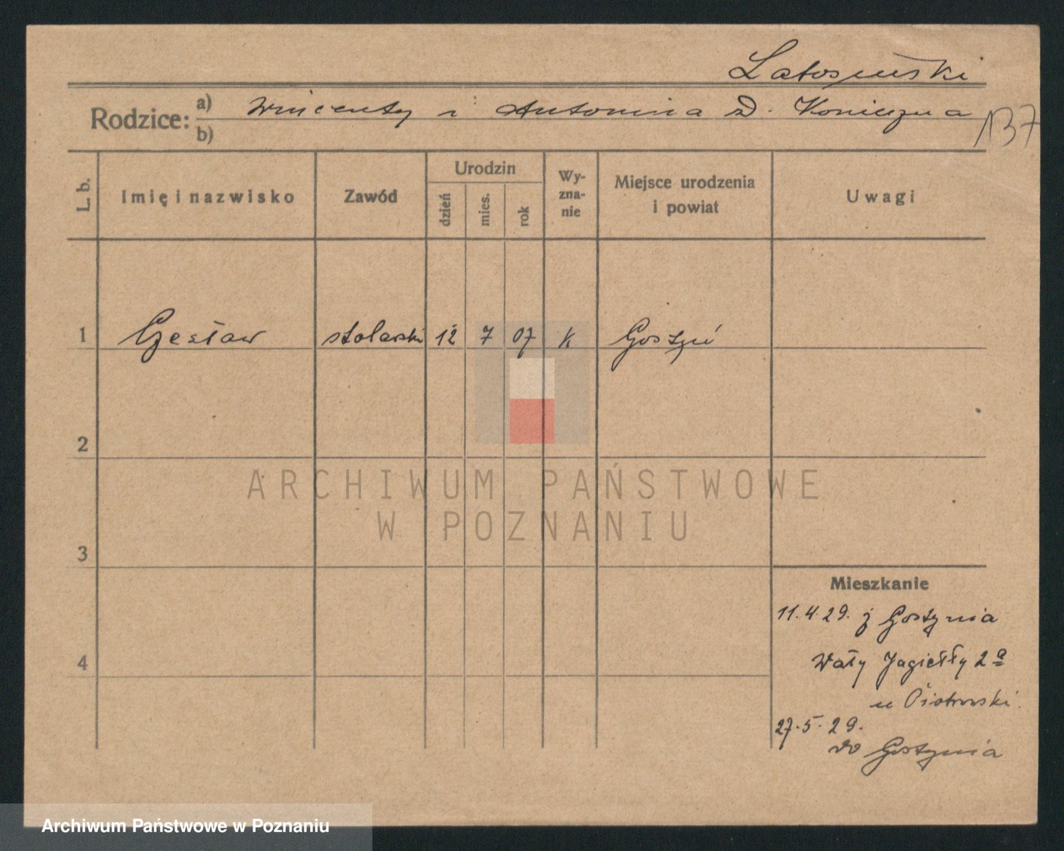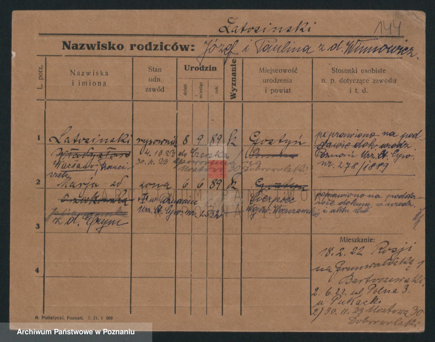 Podgląd karty osobowej dostępny jest po kliknięciu na nazwisko lub ikonkę karty. Można dokonywać powiększenia (ikony na górze) lub przechodzić między kolejnymi skanami (strzałki po bokach).