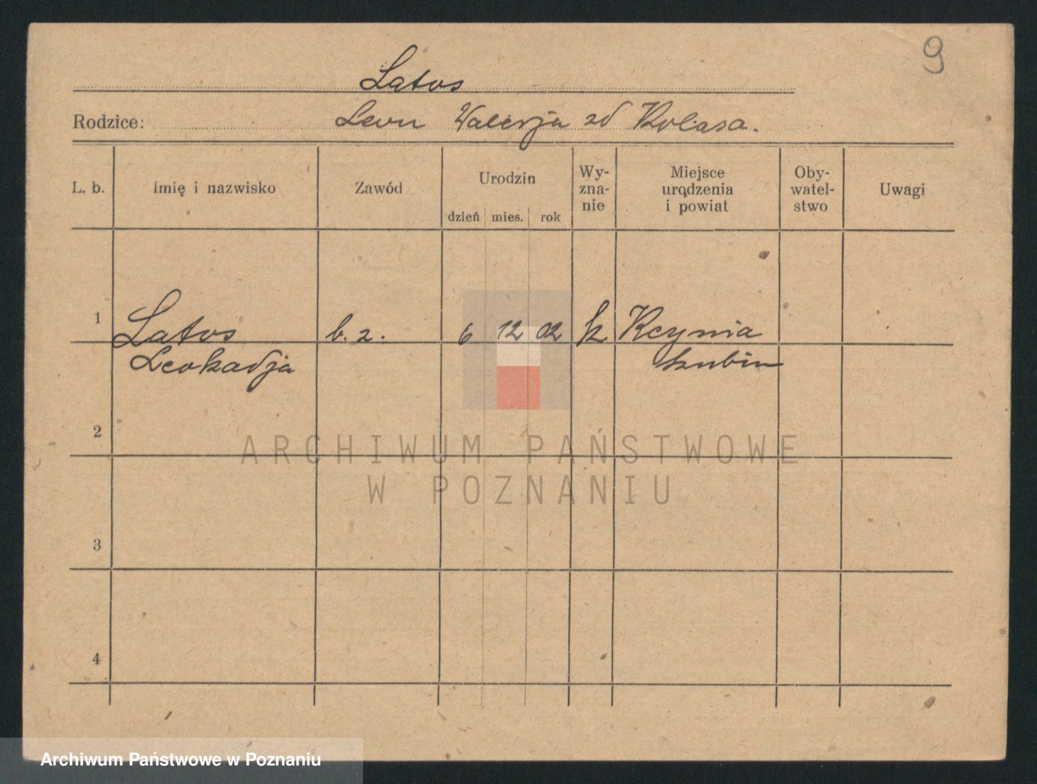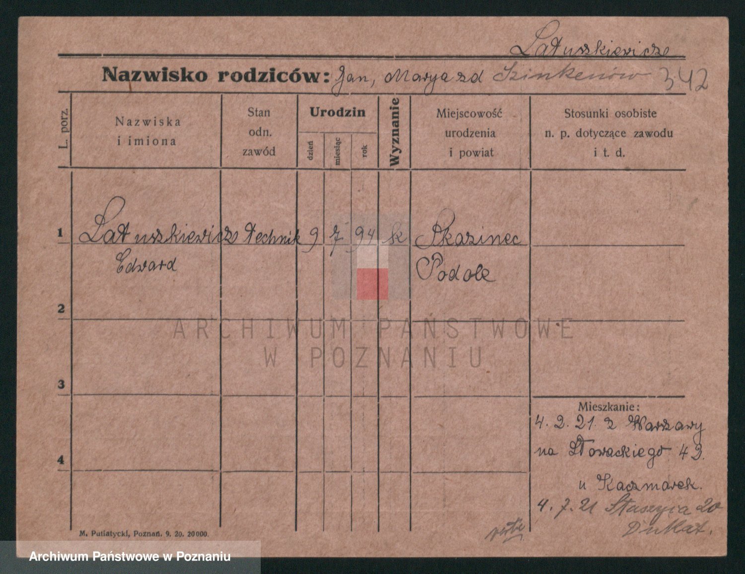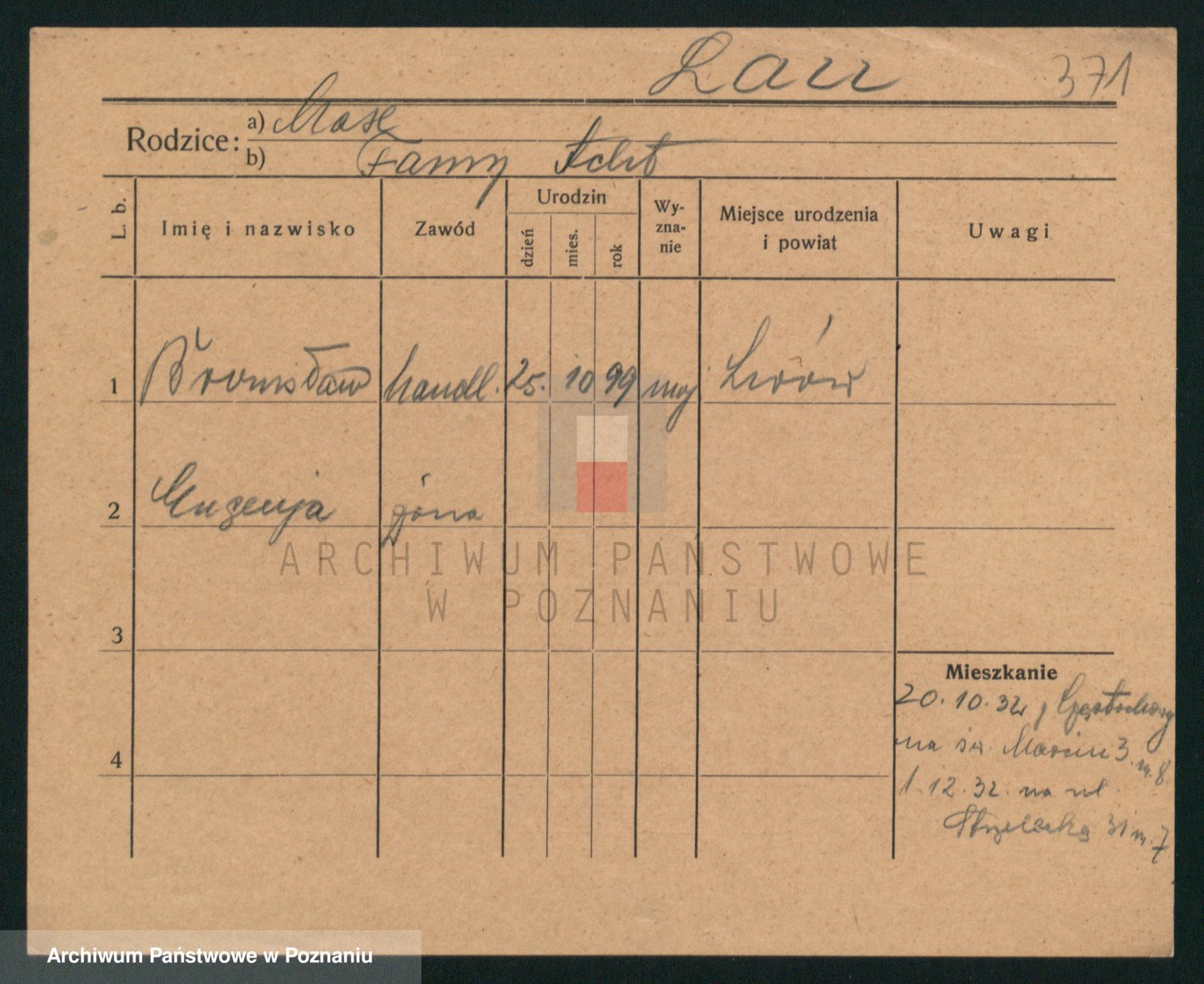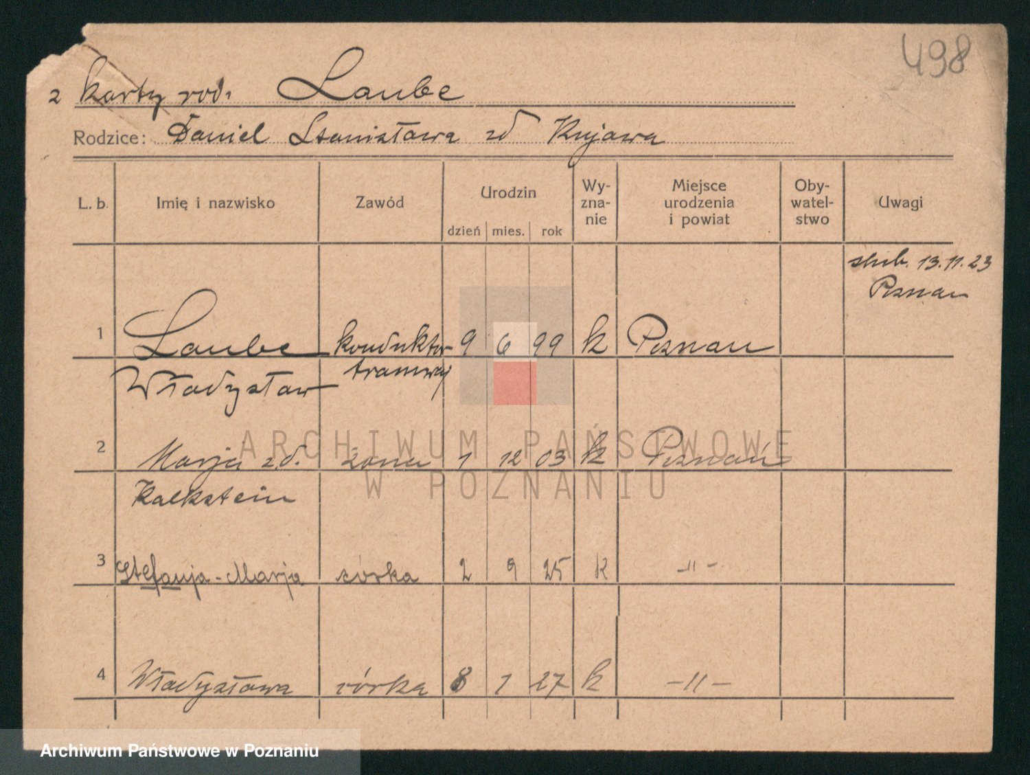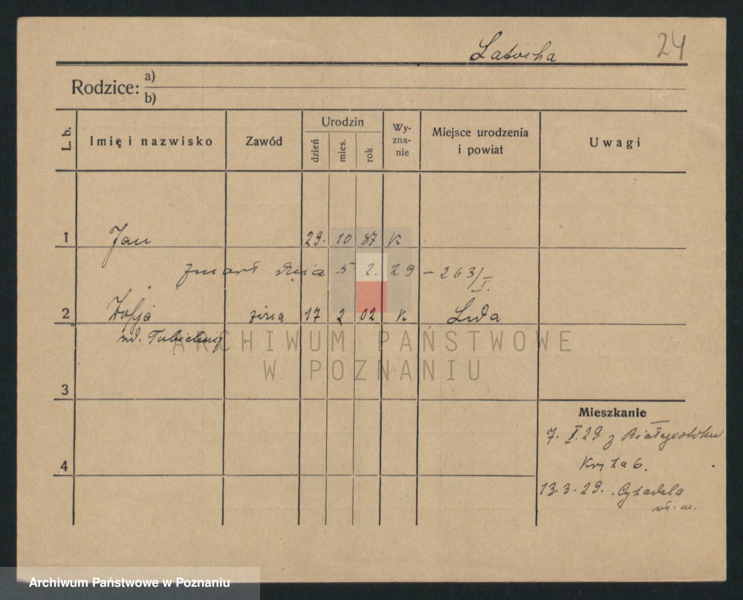 Podgląd karty osobowej dostępny jest po kliknięciu na nazwisko lub ikonkę karty. Można dokonywać powiększenia (ikony na górze) lub przechodzić między kolejnymi skanami (strzałki po bokach).