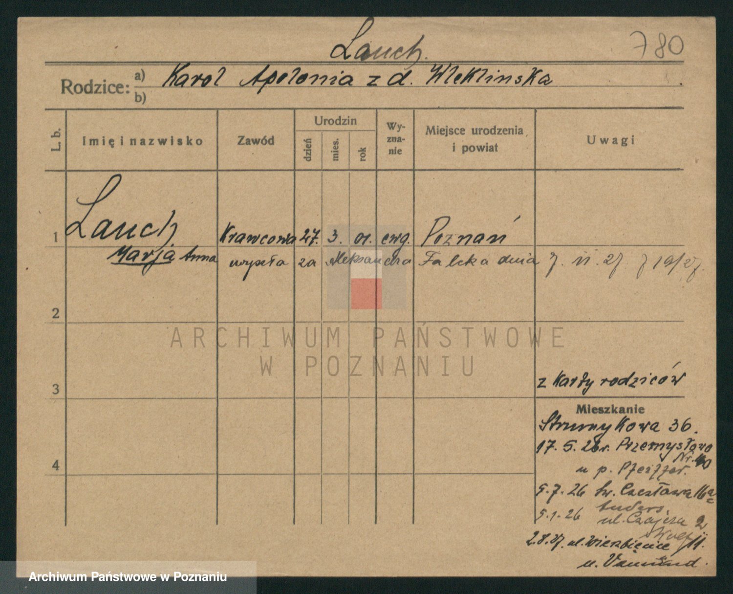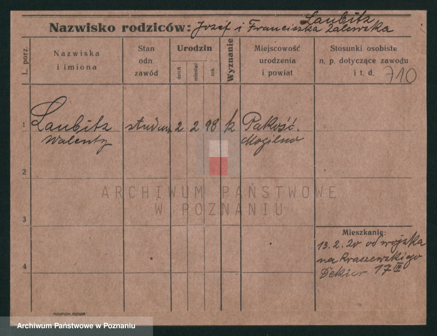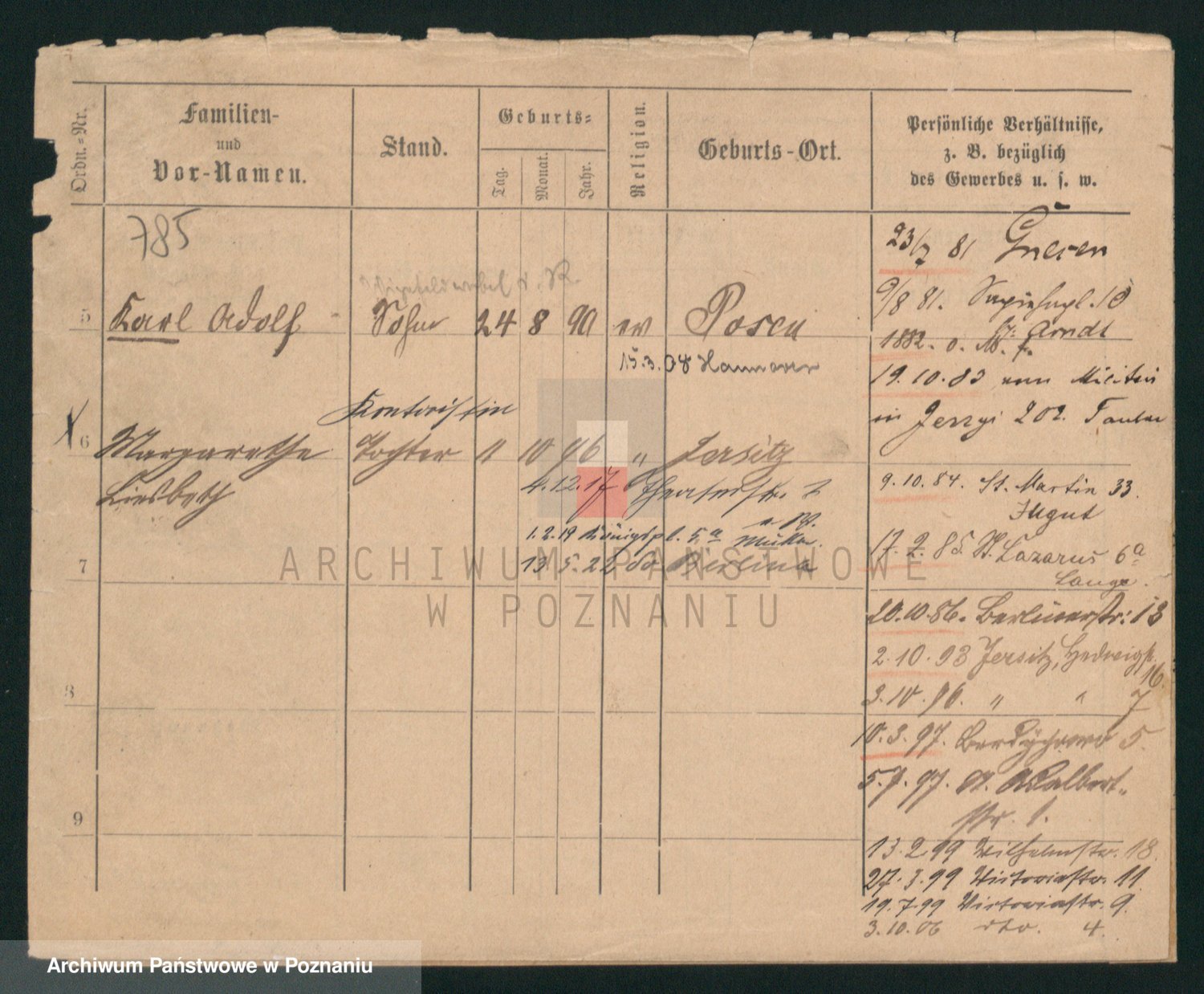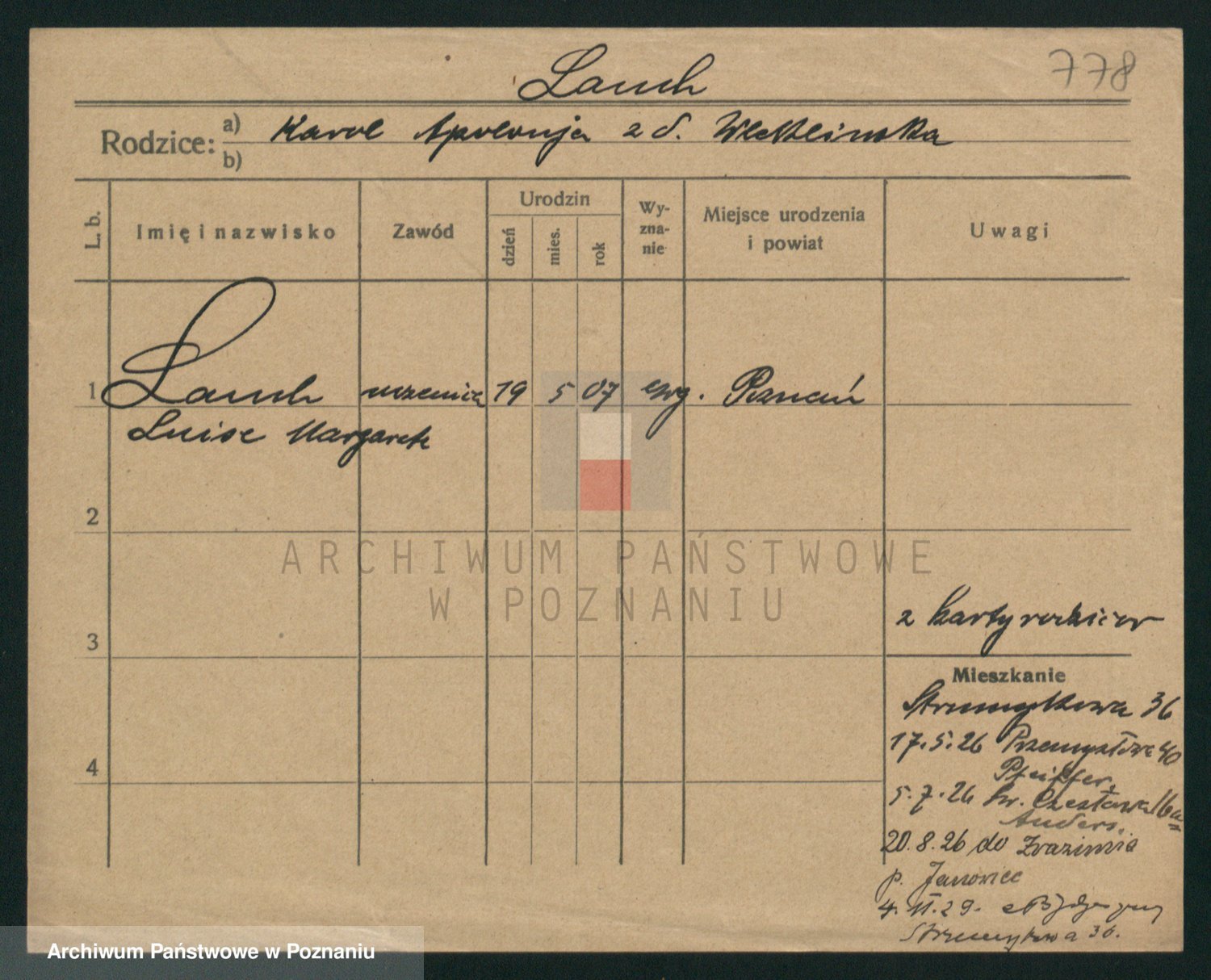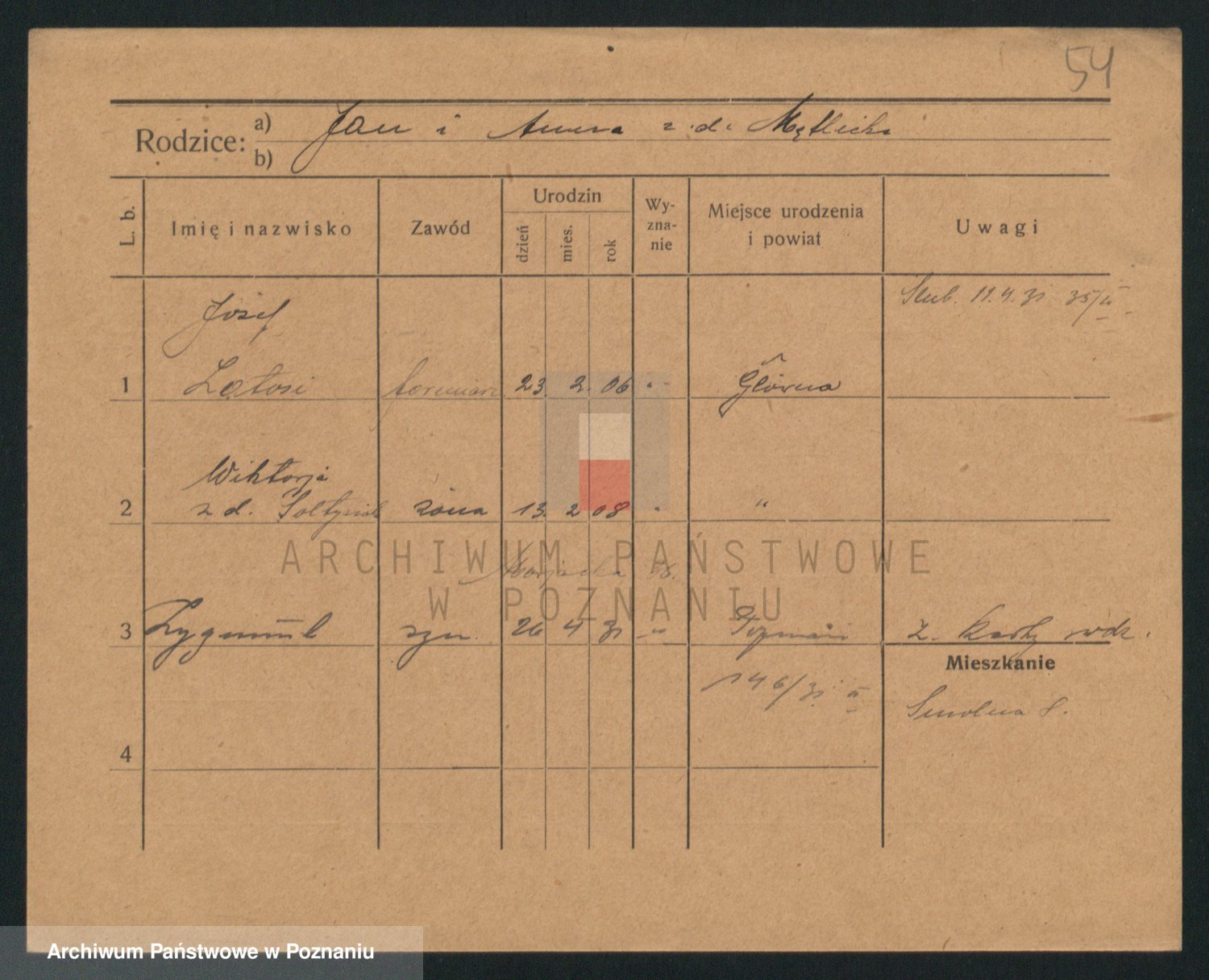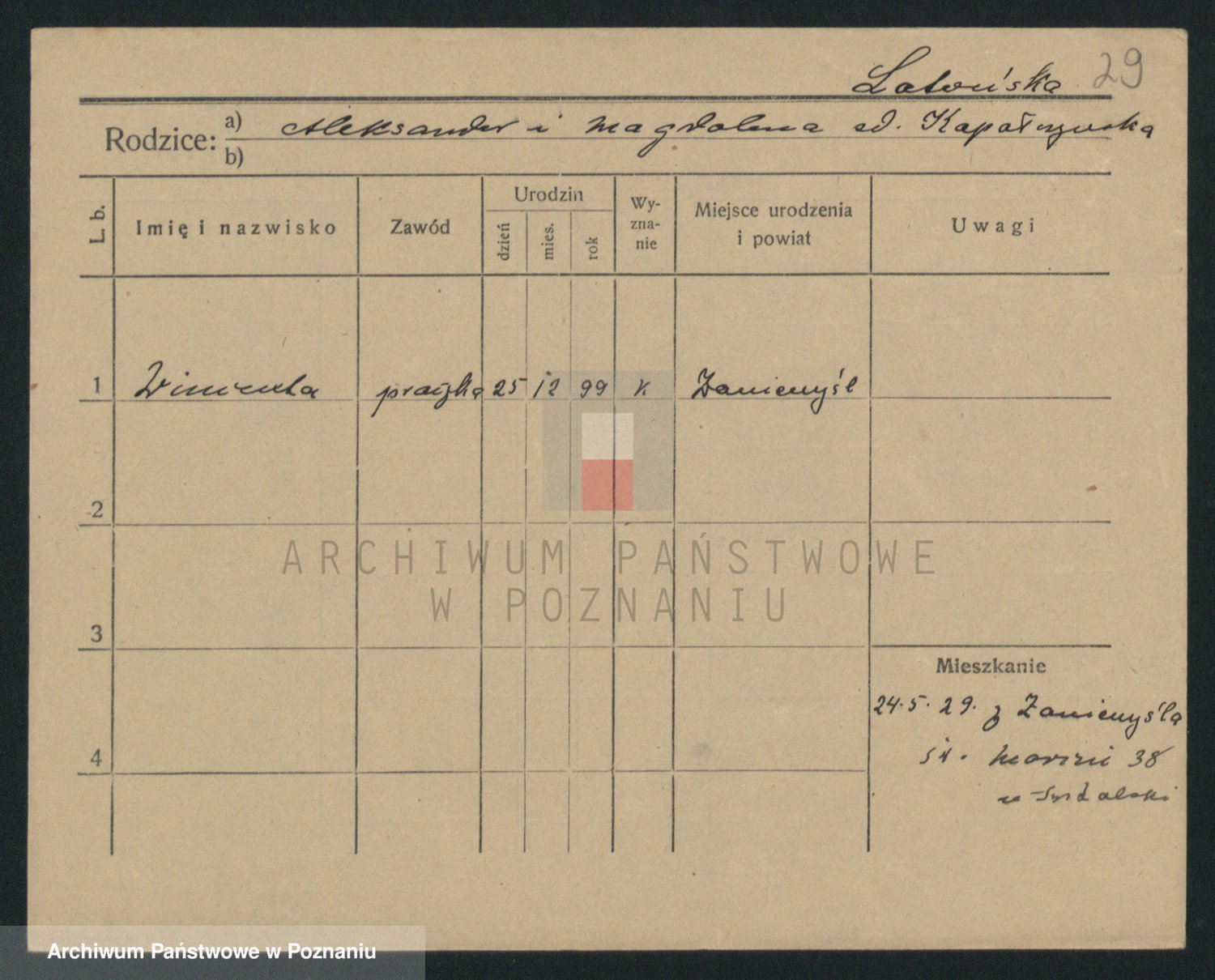 Podgląd karty osobowej dostępny jest po kliknięciu na nazwisko lub ikonkę karty. Można dokonywać powiększenia (ikony na górze) lub przechodzić między kolejnymi skanami (strzałki po bokach).