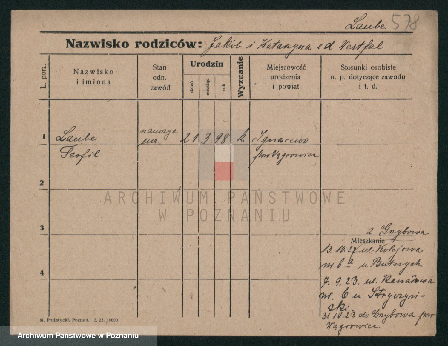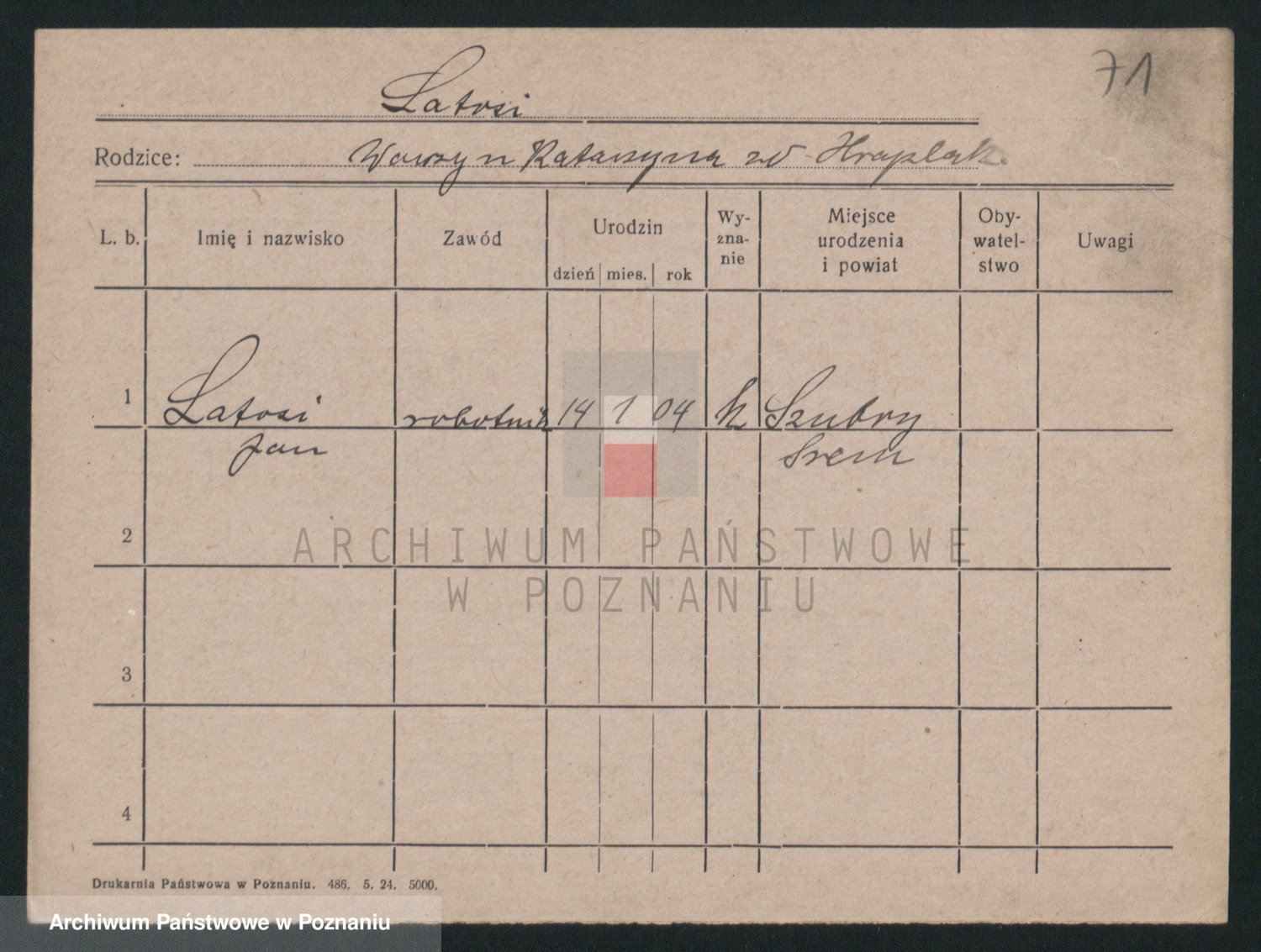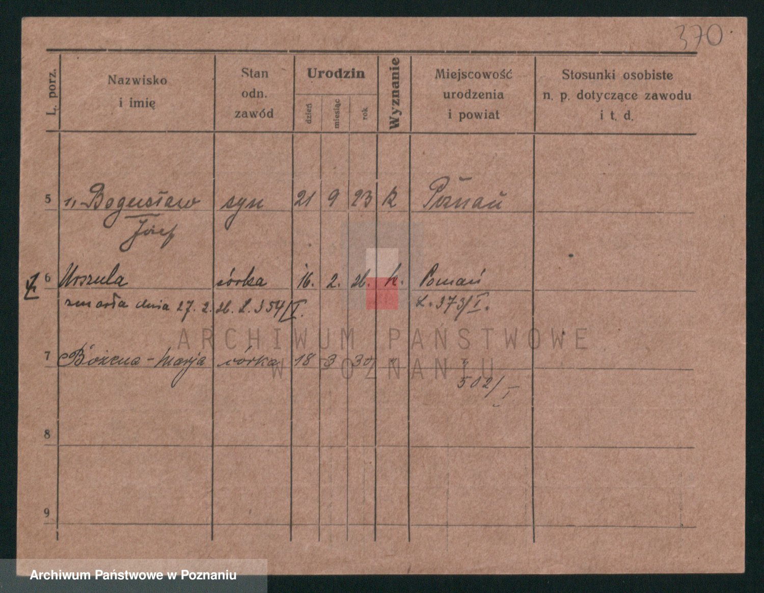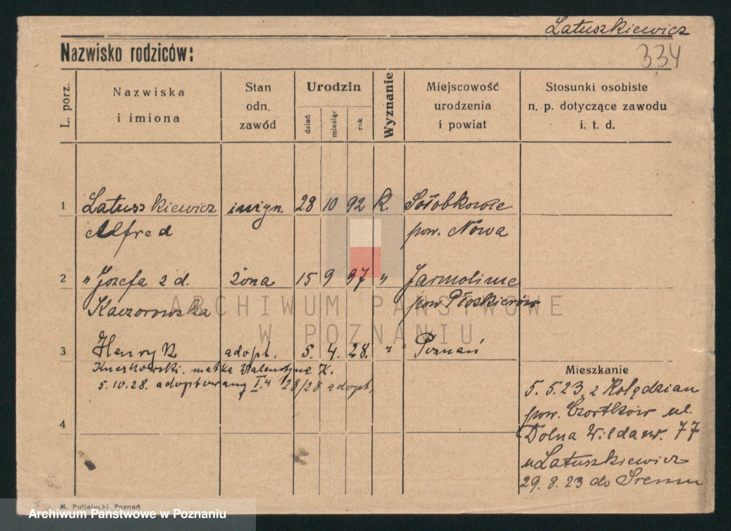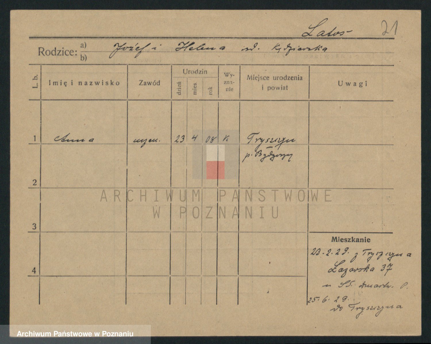 Podgląd karty osobowej dostępny jest po kliknięciu na nazwisko lub ikonkę karty. Można dokonywać powiększenia (ikony na górze) lub przechodzić między kolejnymi skanami (strzałki po bokach).