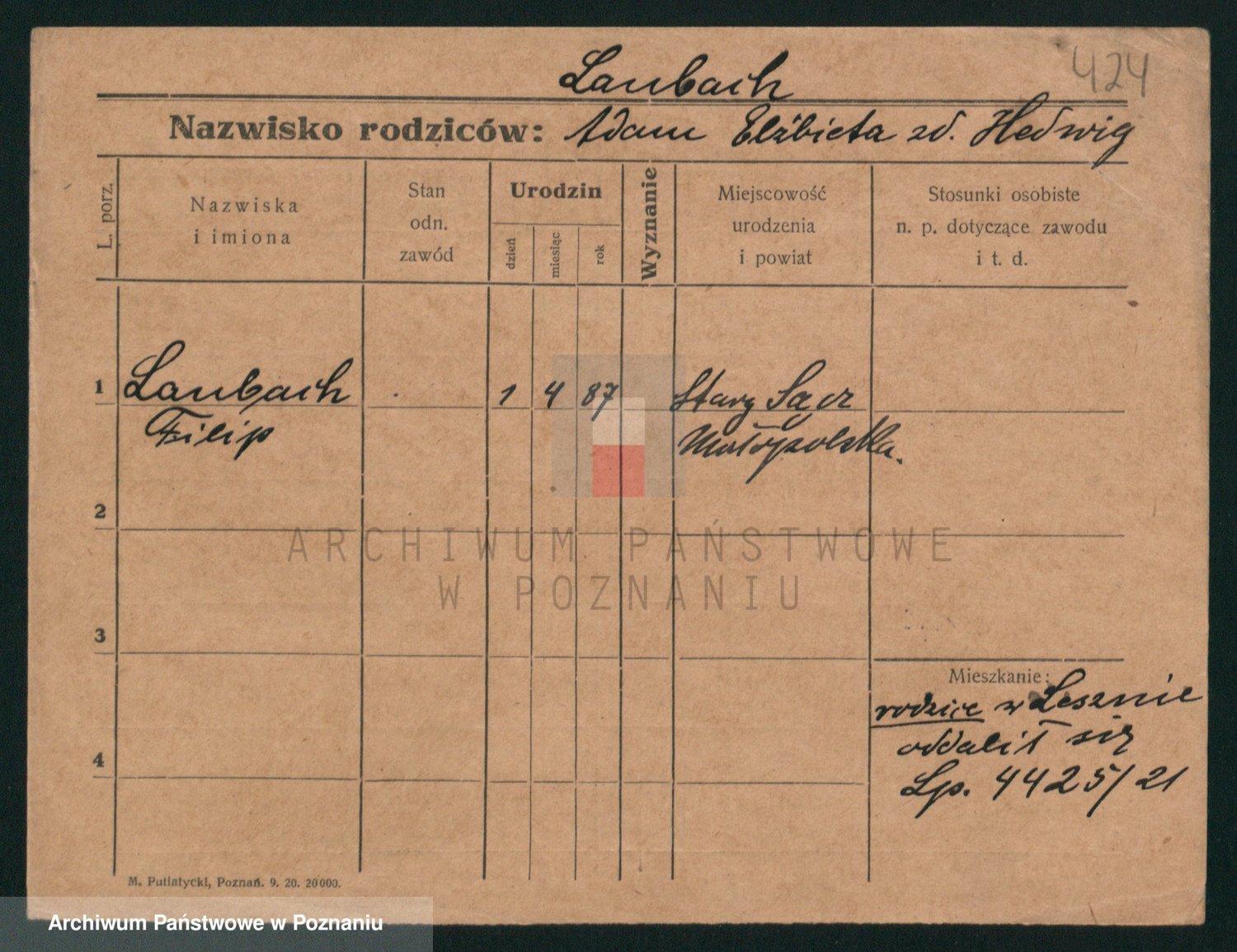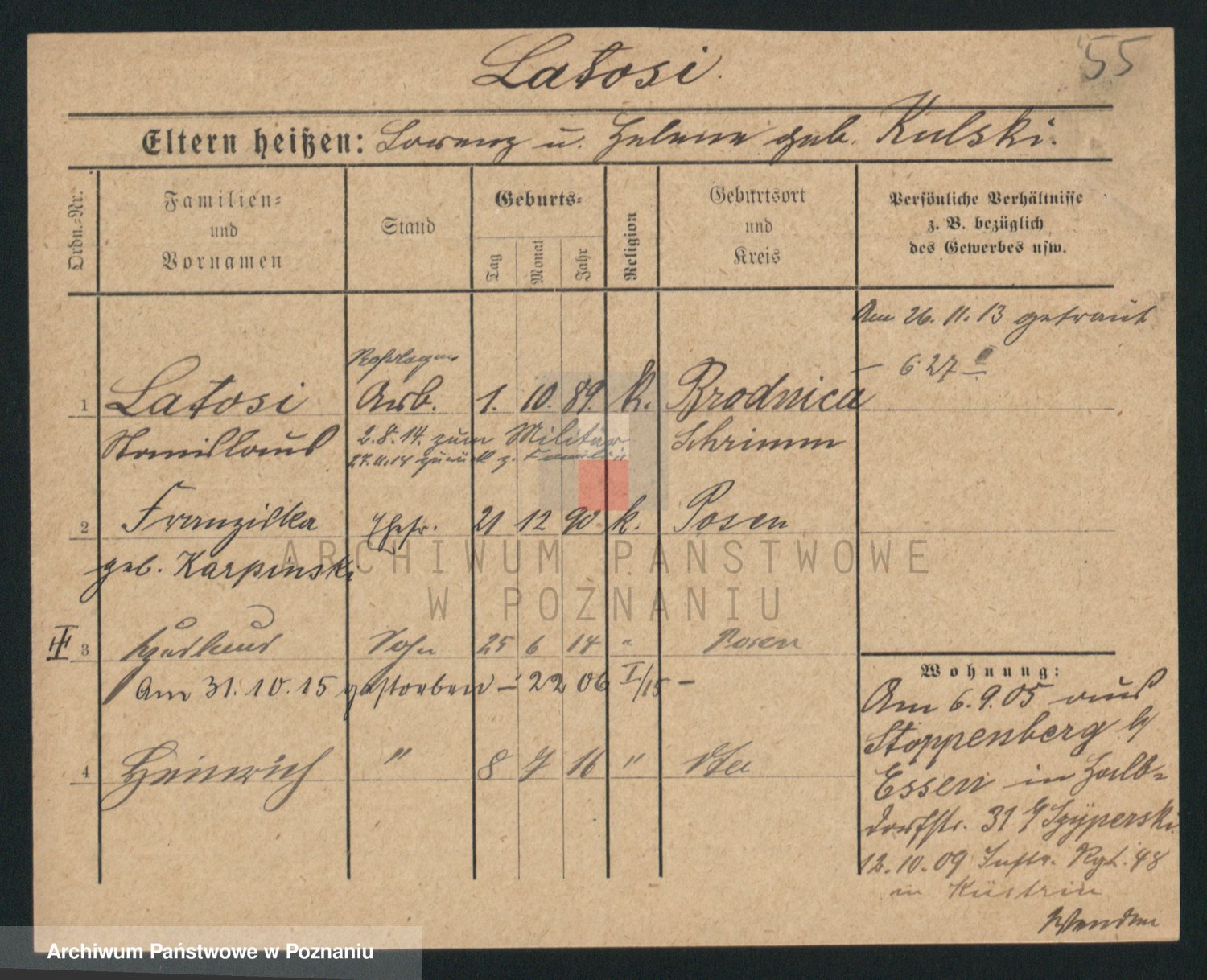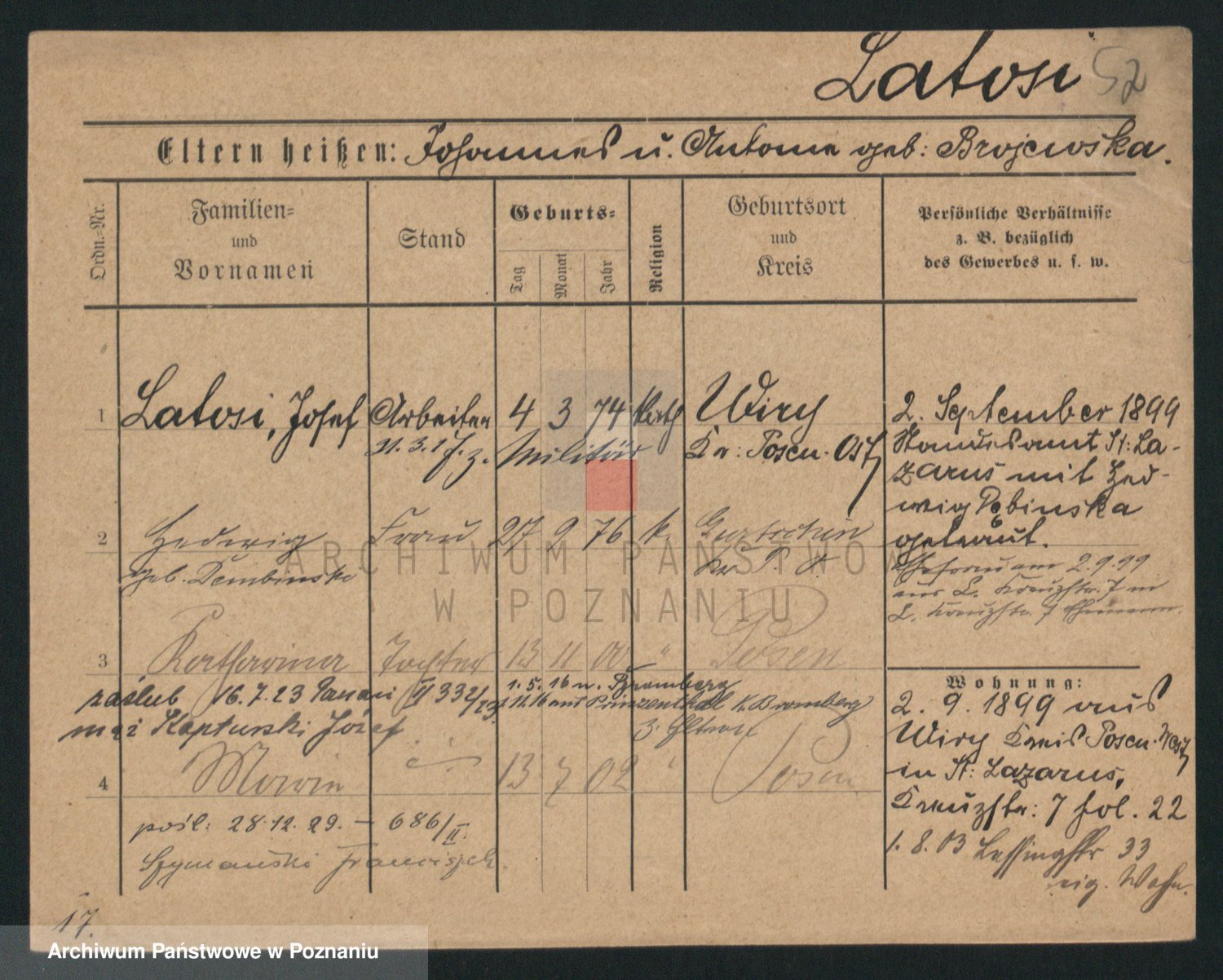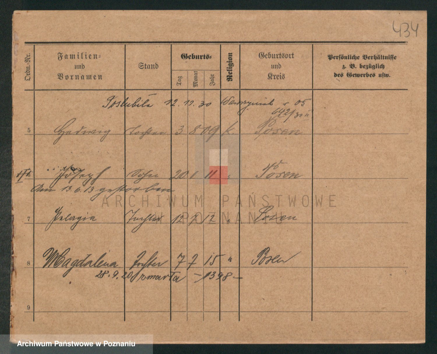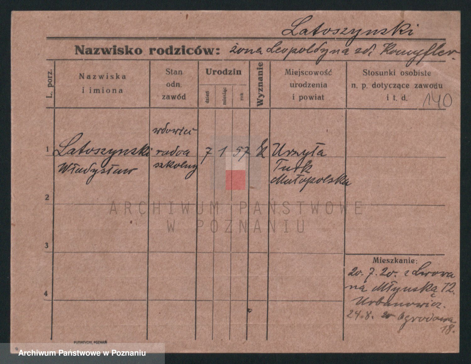 Podgląd karty osobowej dostępny jest po kliknięciu na nazwisko lub ikonkę karty. Można dokonywać powiększenia (ikony na górze) lub przechodzić między kolejnymi skanami (strzałki po bokach).