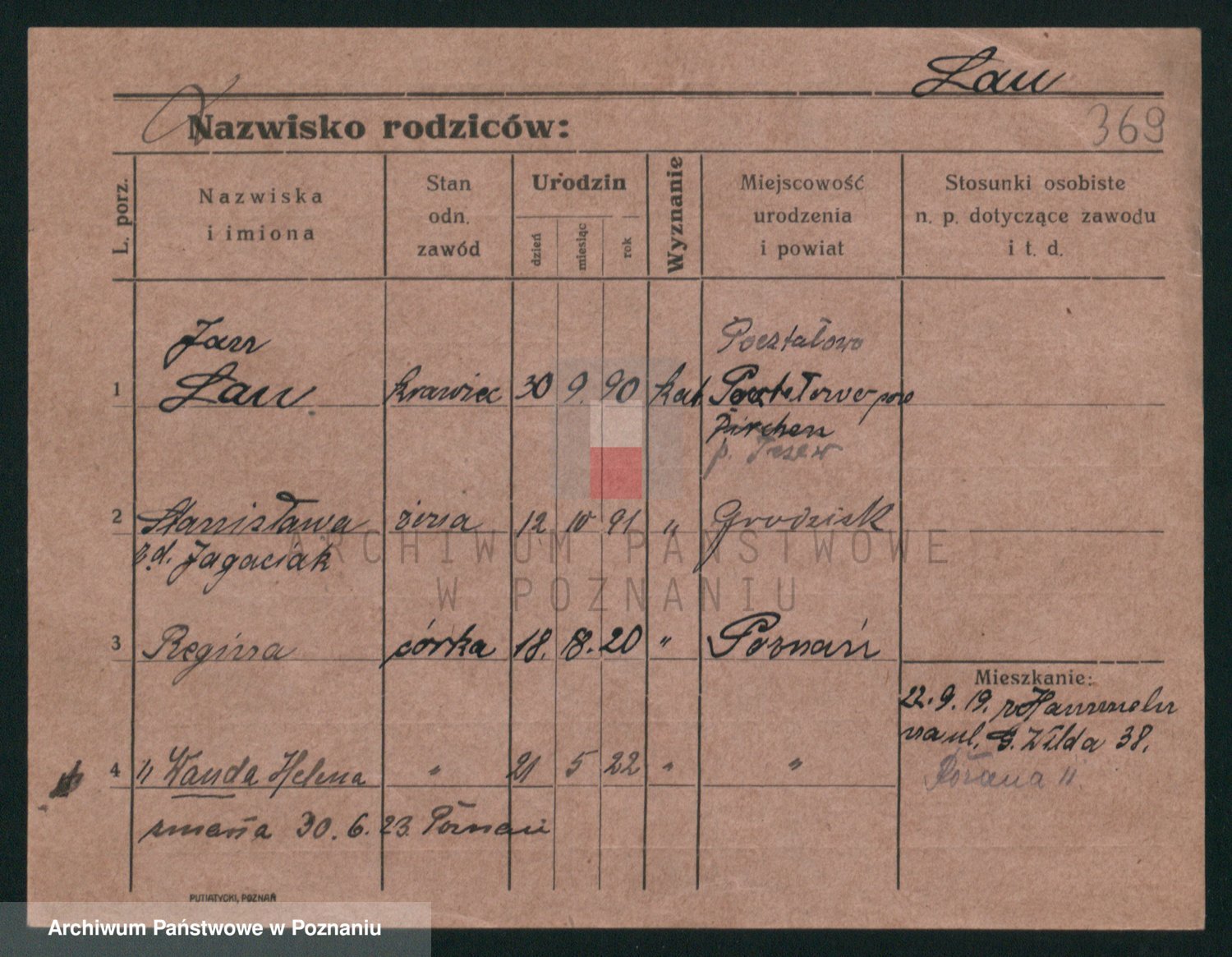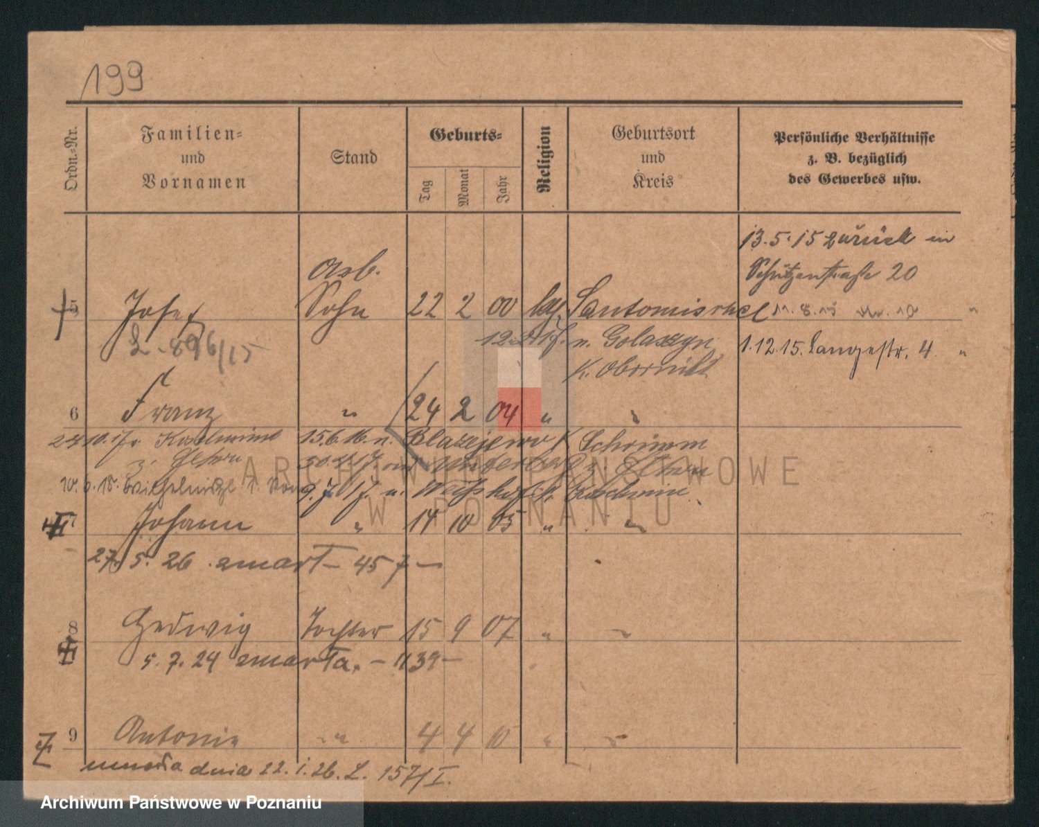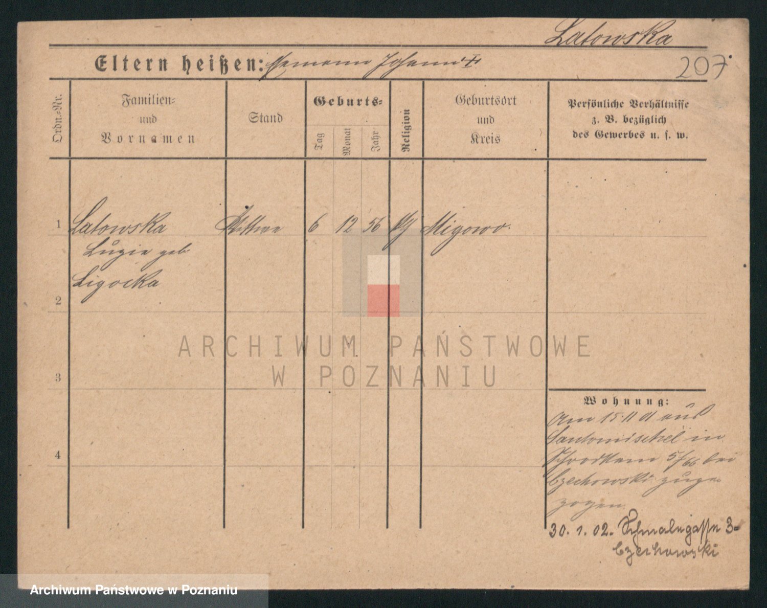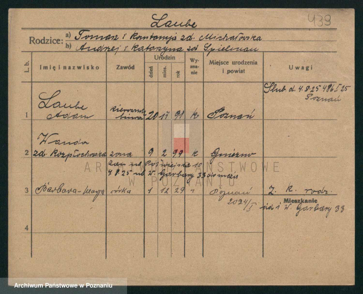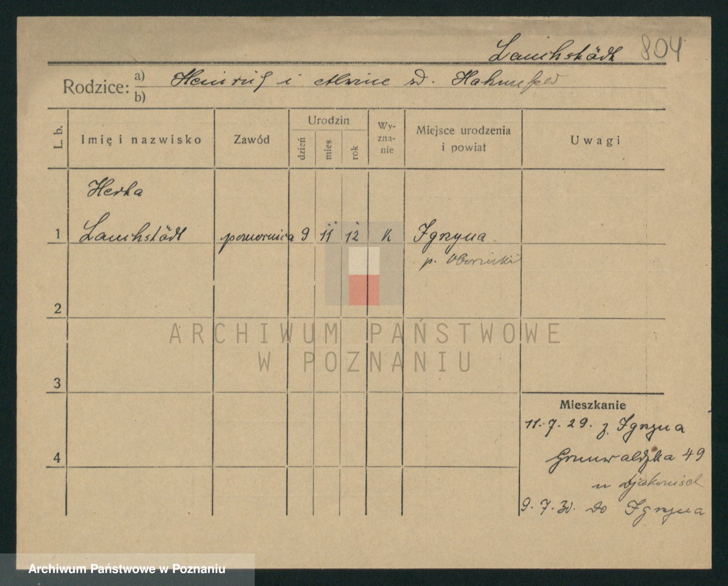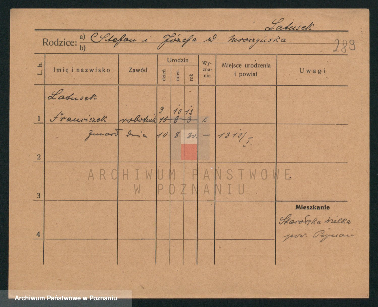 Podgląd karty osobowej dostępny jest po kliknięciu na nazwisko lub ikonkę karty. Można dokonywać powiększenia (ikony na górze) lub przechodzić między kolejnymi skanami (strzałki po bokach).