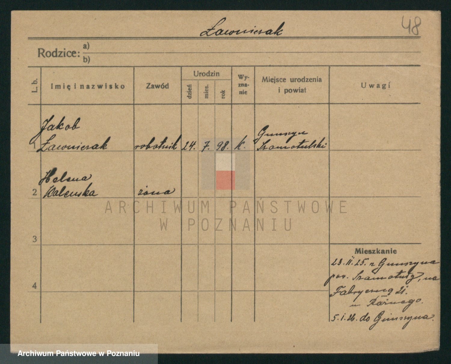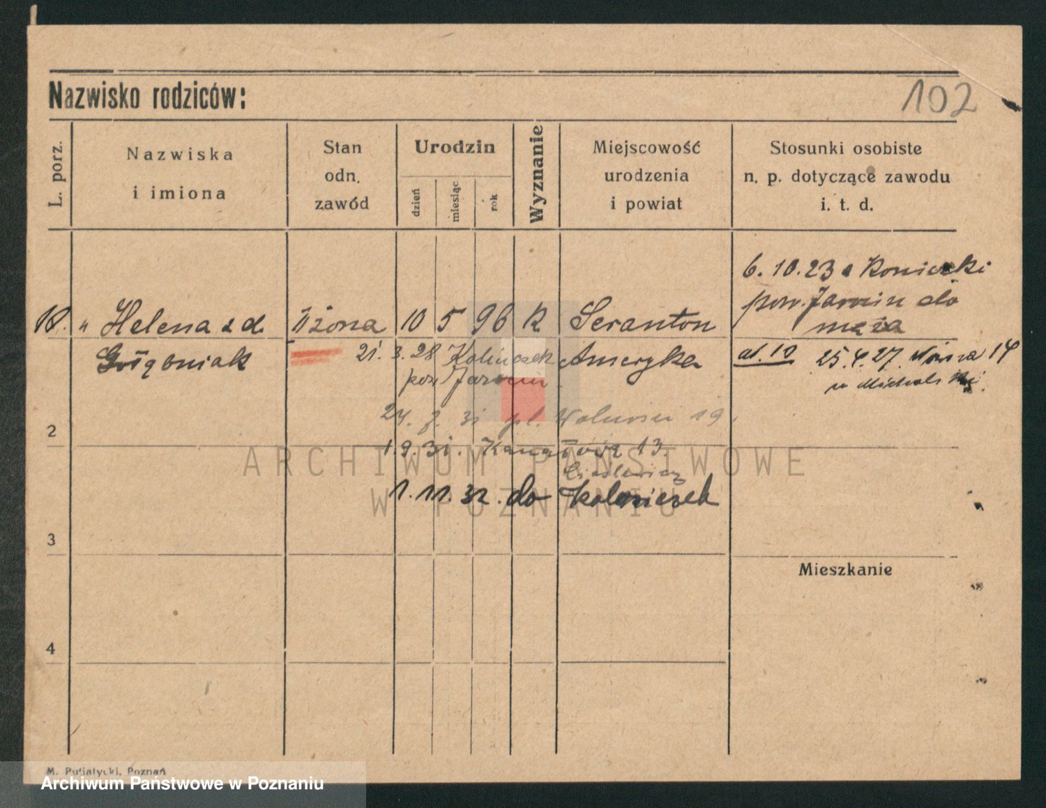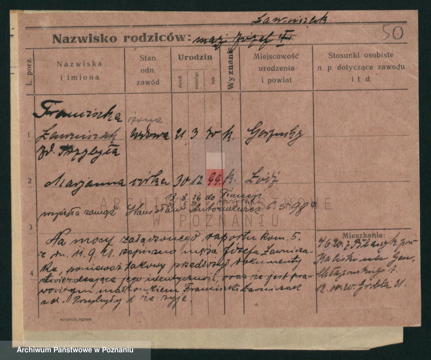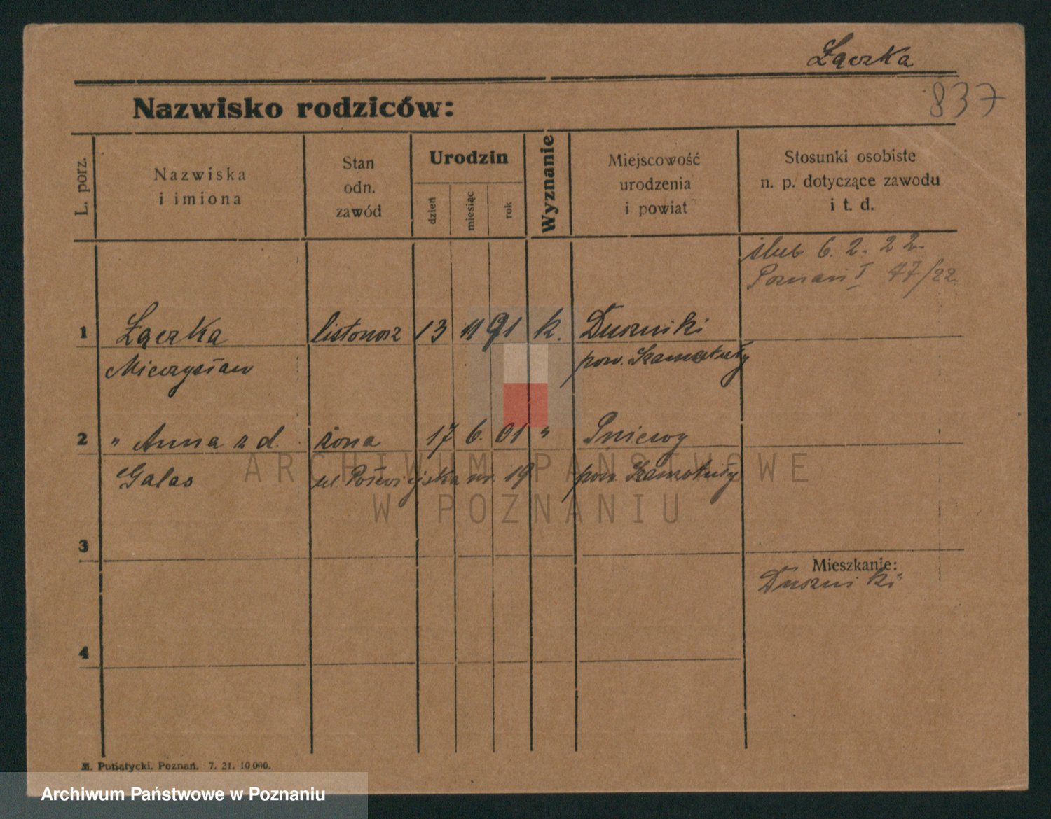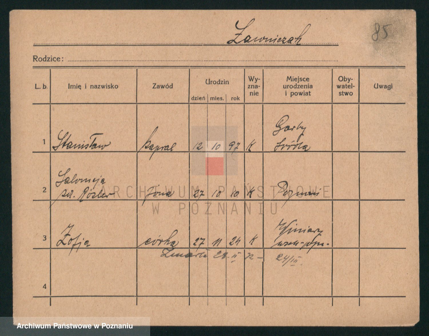 Podgląd karty osobowej dostępny jest po kliknięciu na nazwisko lub ikonkę karty. Można dokonywać powiększenia (ikony na górze) lub przechodzić między kolejnymi skanami (strzałki po bokach).