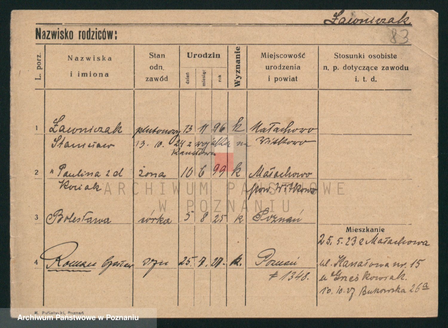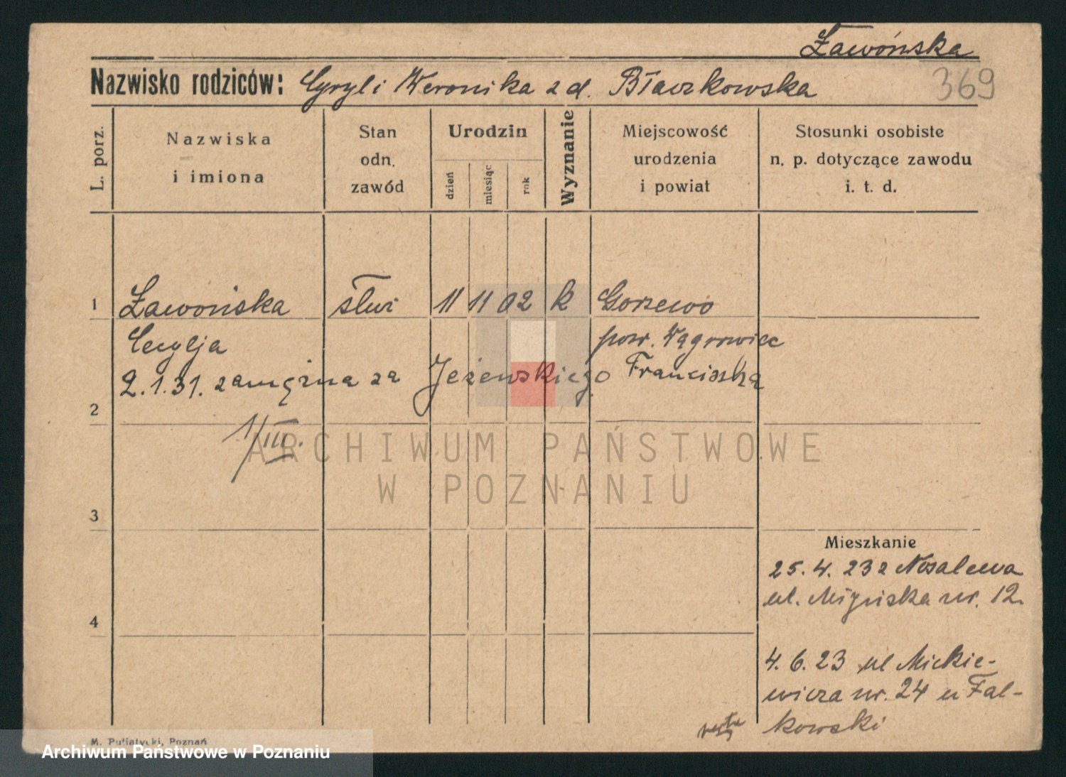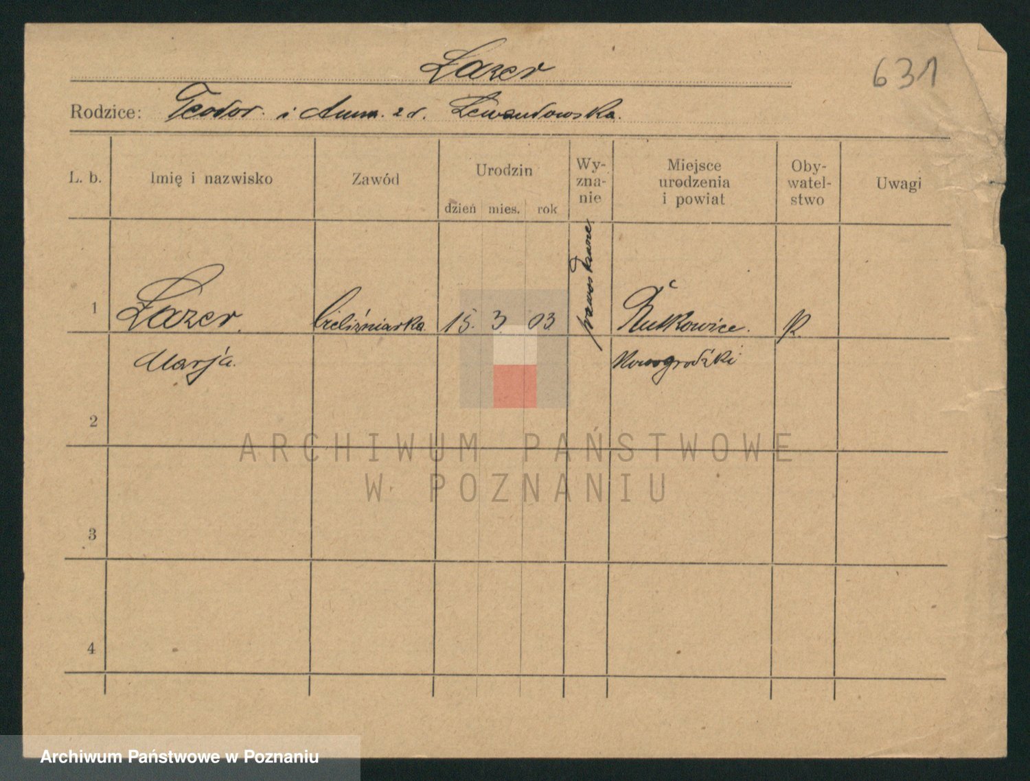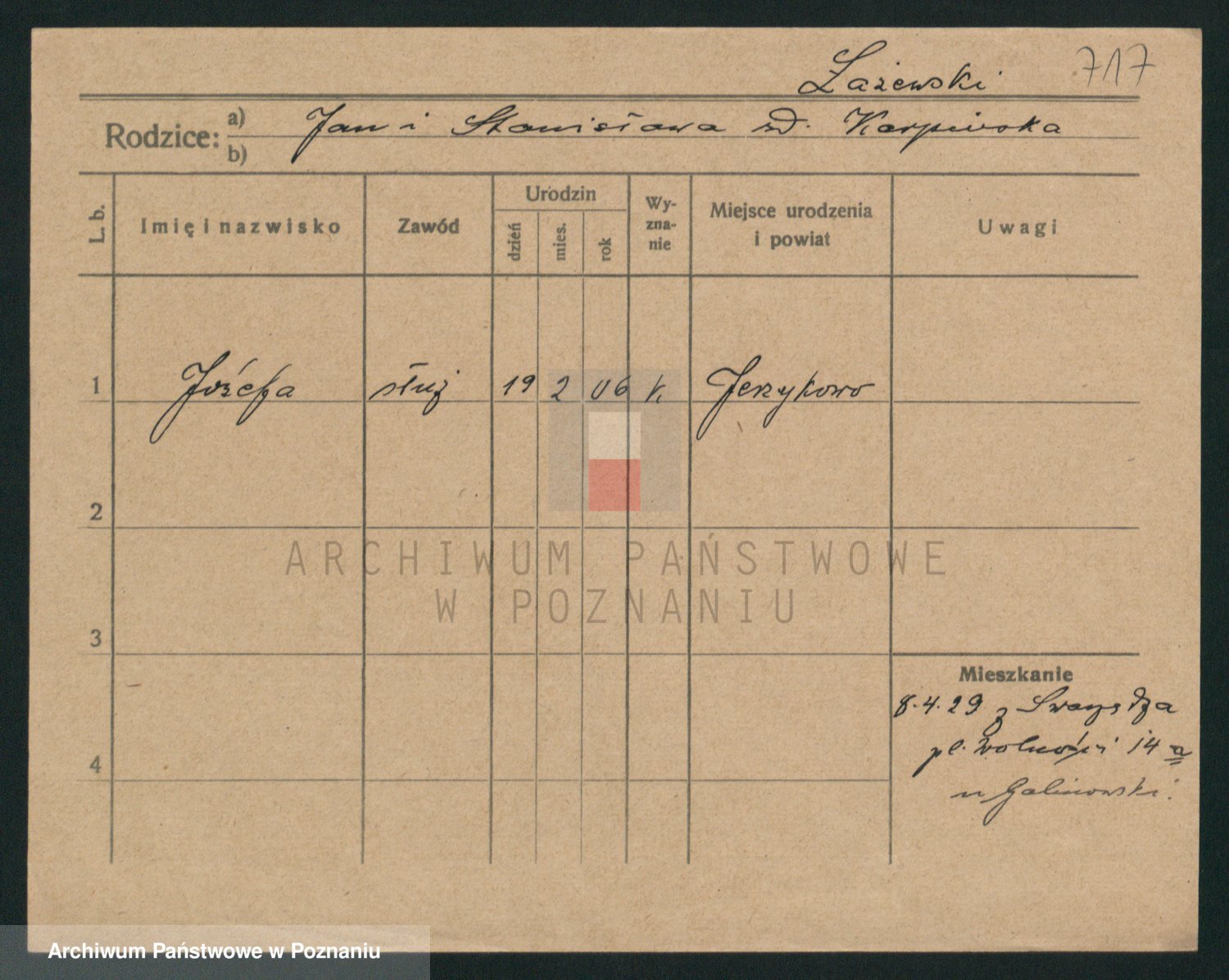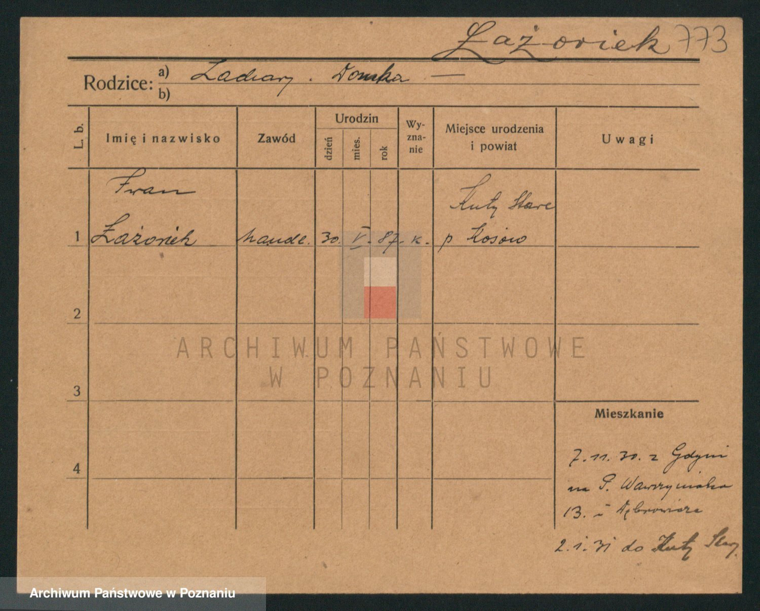 Podgląd karty osobowej dostępny jest po kliknięciu na nazwisko lub ikonkę karty. Można dokonywać powiększenia (ikony na górze) lub przechodzić między kolejnymi skanami (strzałki po bokach).