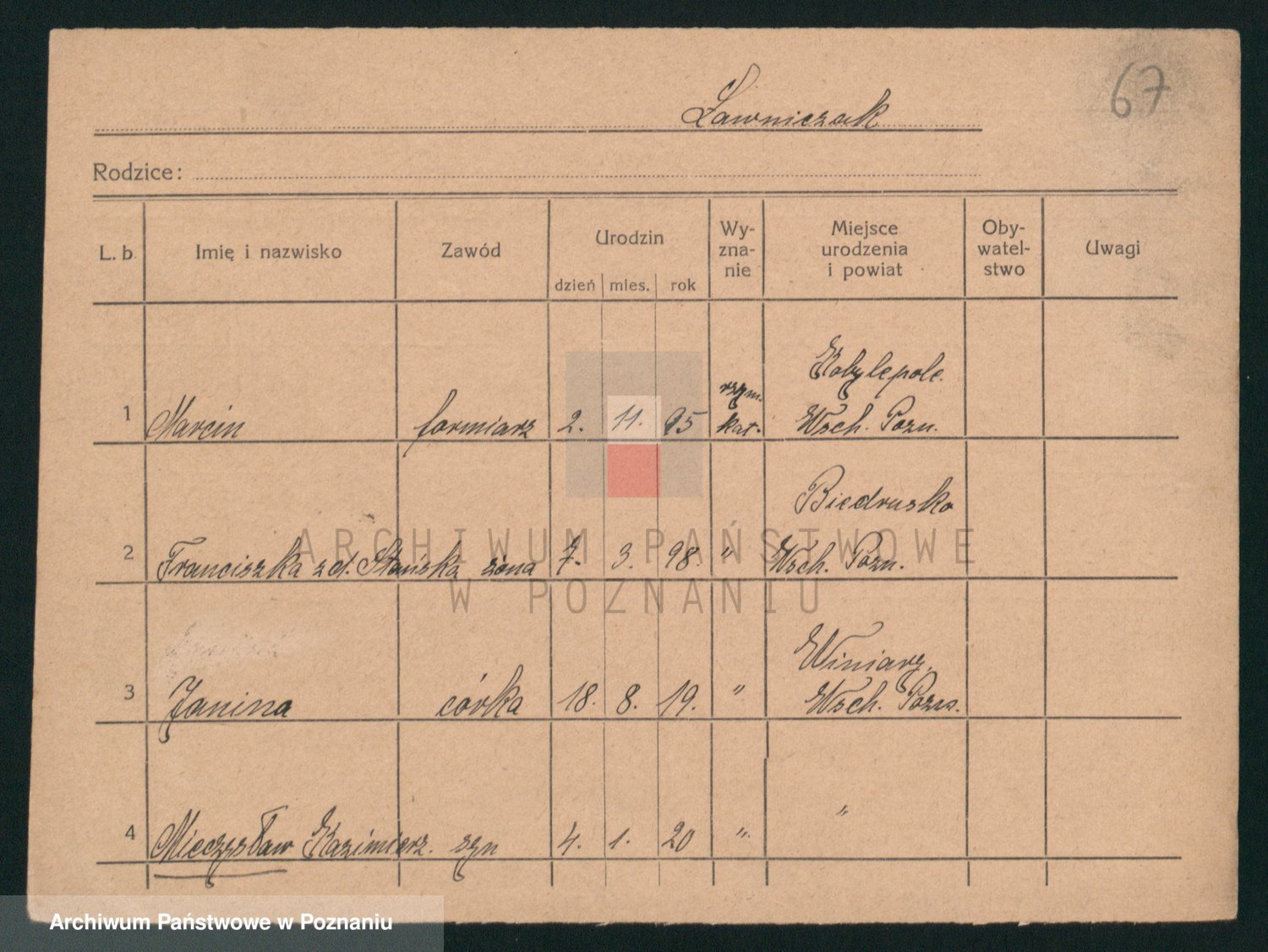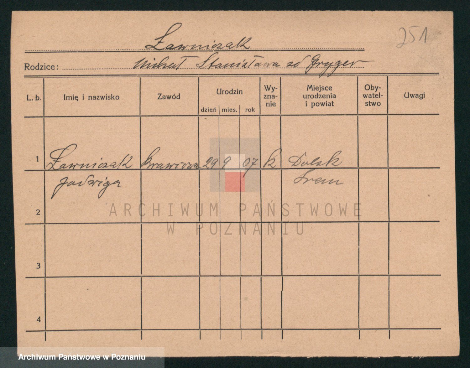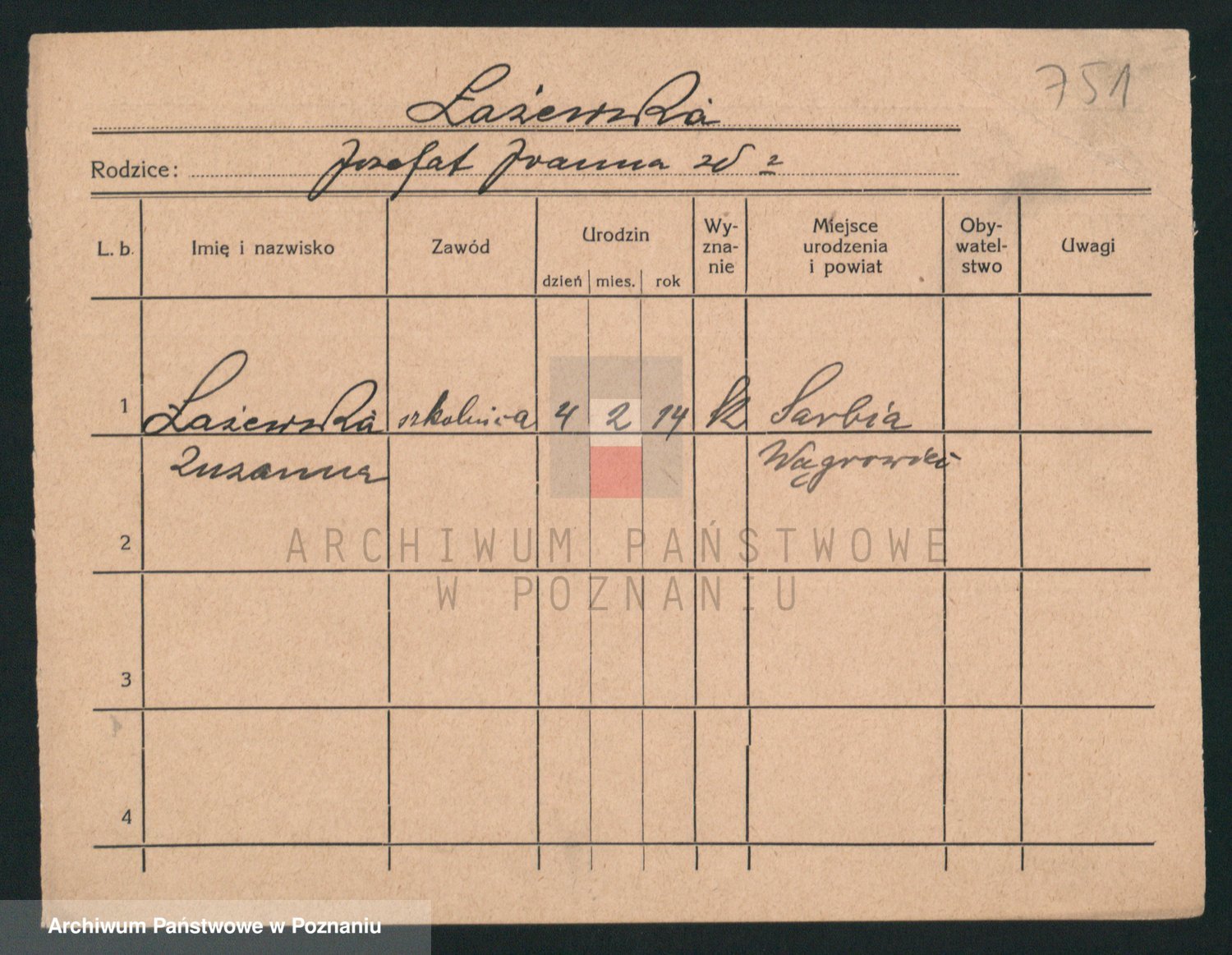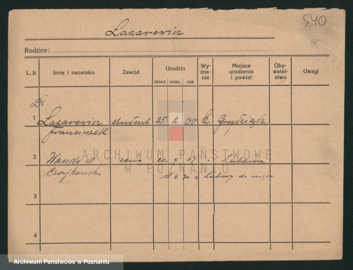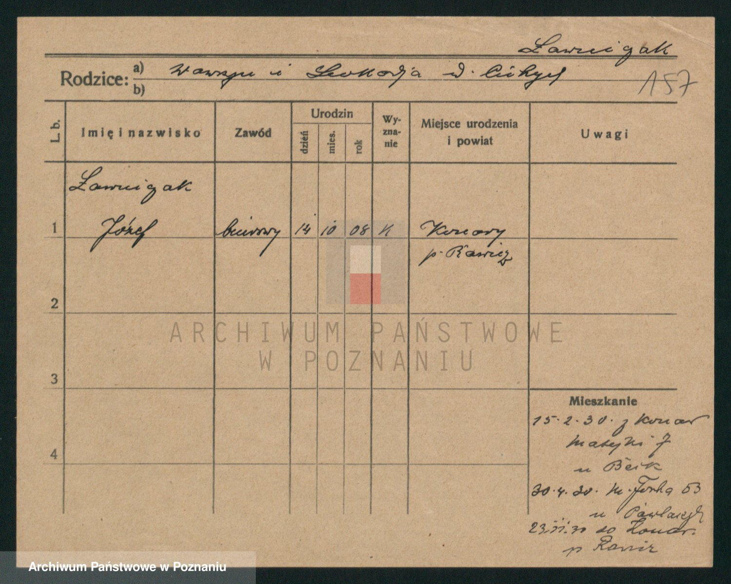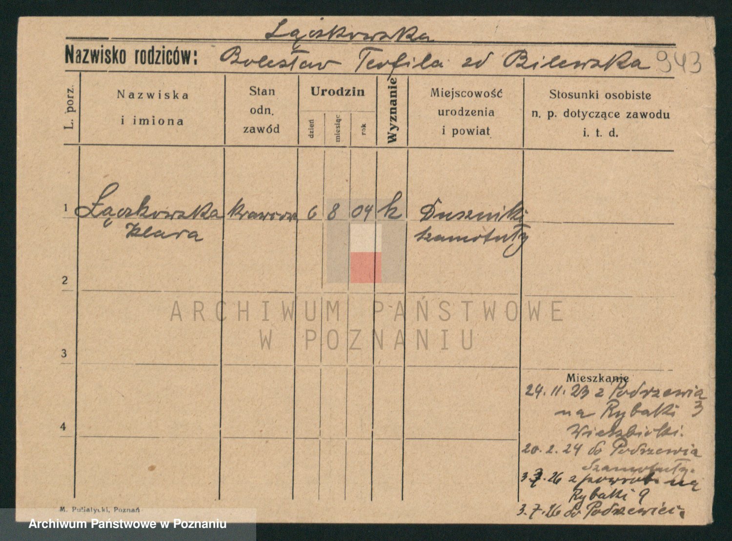 Podgląd karty osobowej dostępny jest po kliknięciu na nazwisko lub ikonkę karty. Można dokonywać powiększenia (ikony na górze) lub przechodzić między kolejnymi skanami (strzałki po bokach).