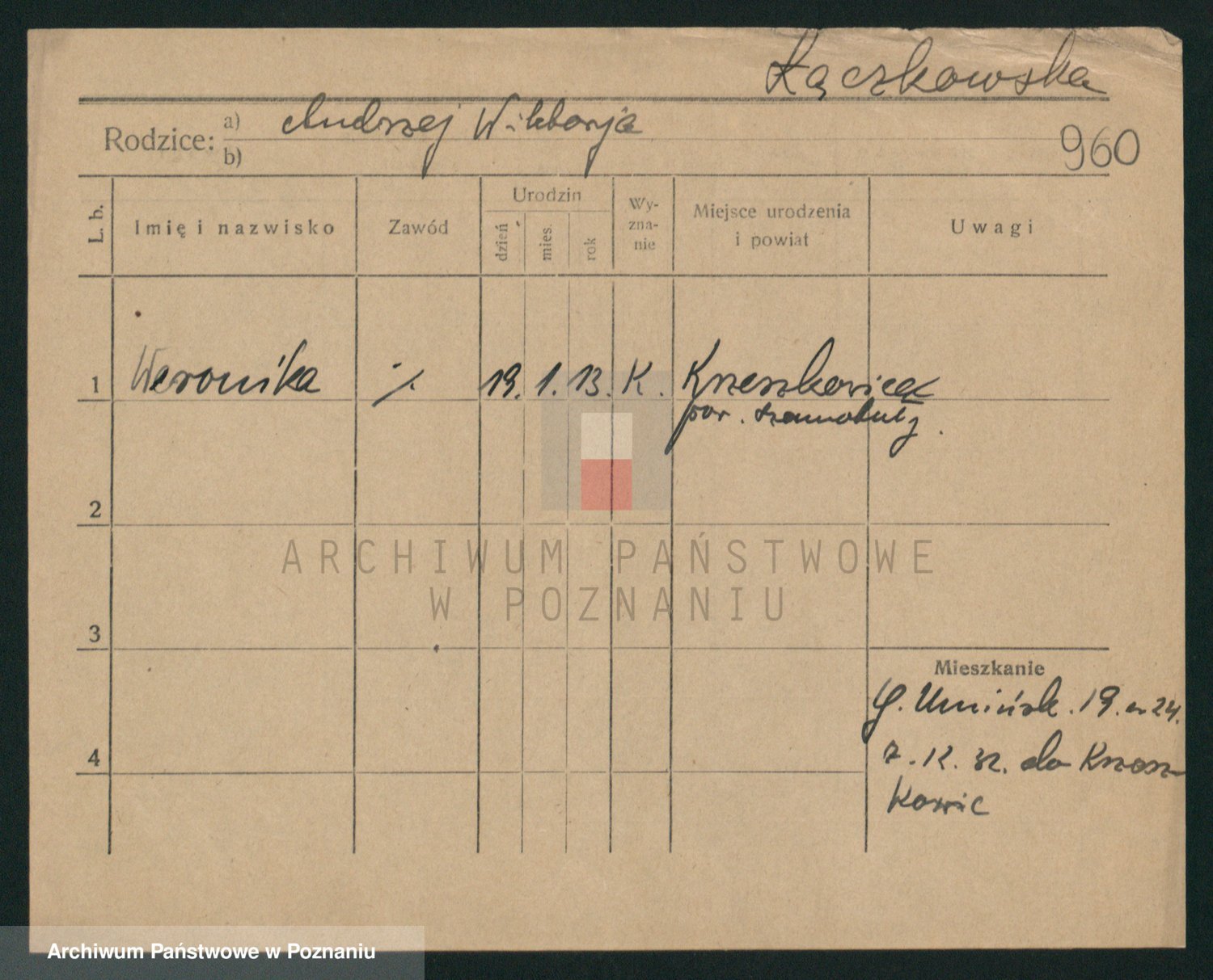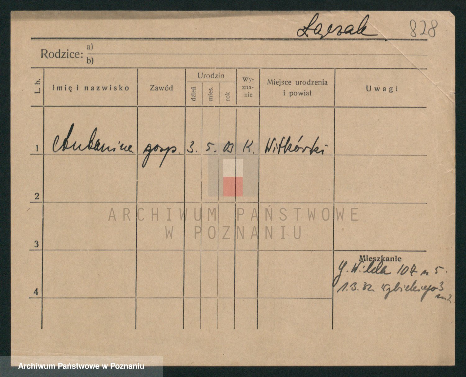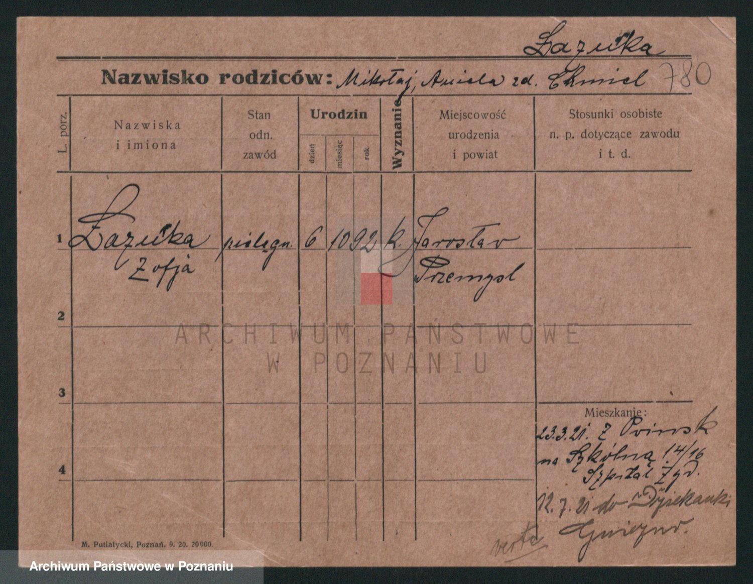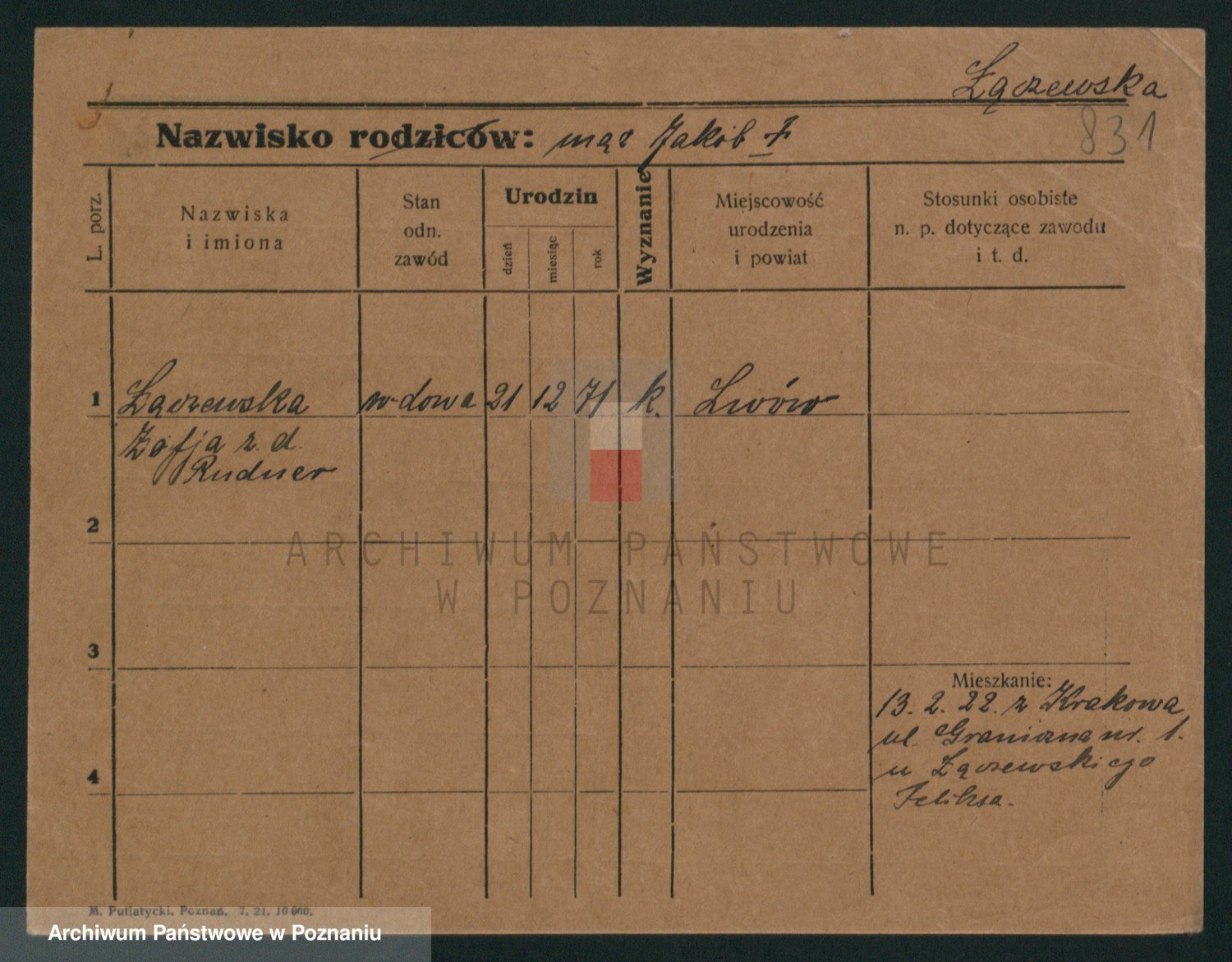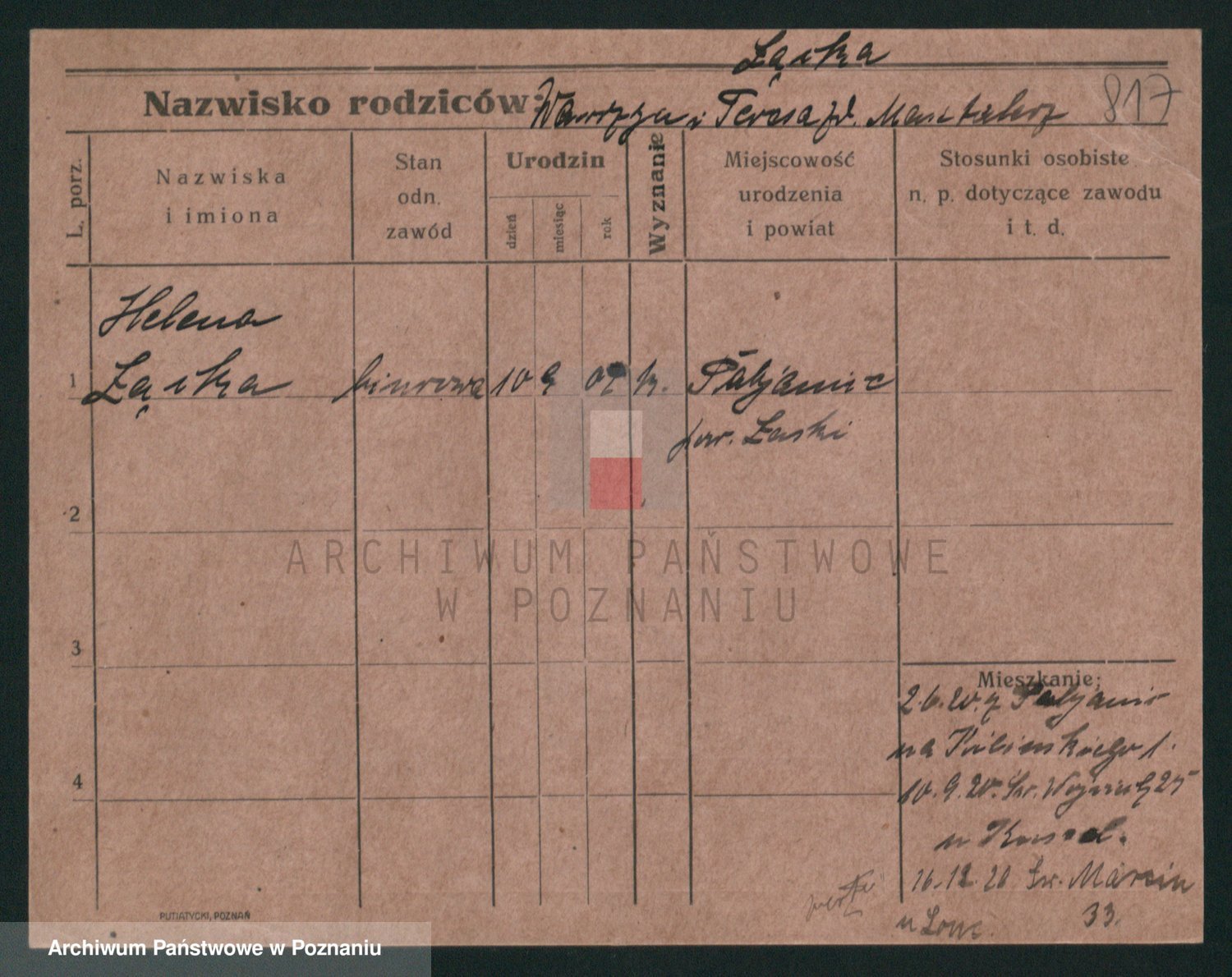 Podgląd karty osobowej dostępny jest po kliknięciu na nazwisko lub ikonkę karty. Można dokonywać powiększenia (ikony na górze) lub przechodzić między kolejnymi skanami (strzałki po bokach).
