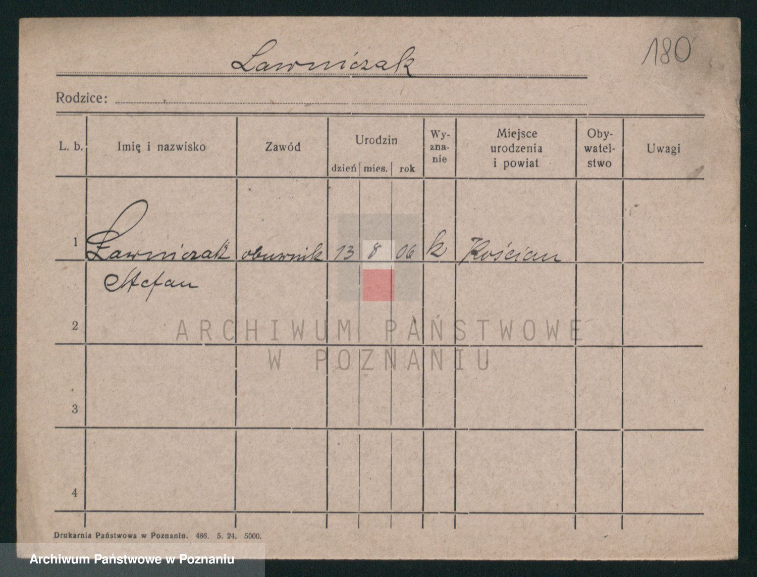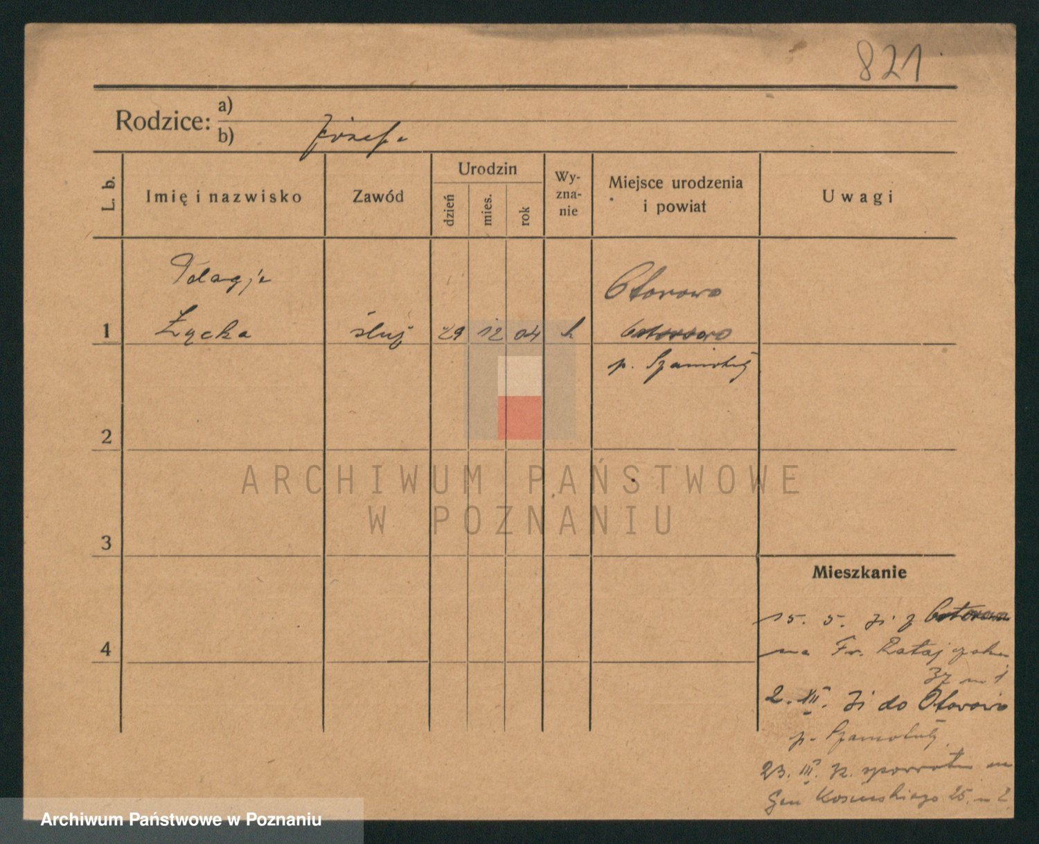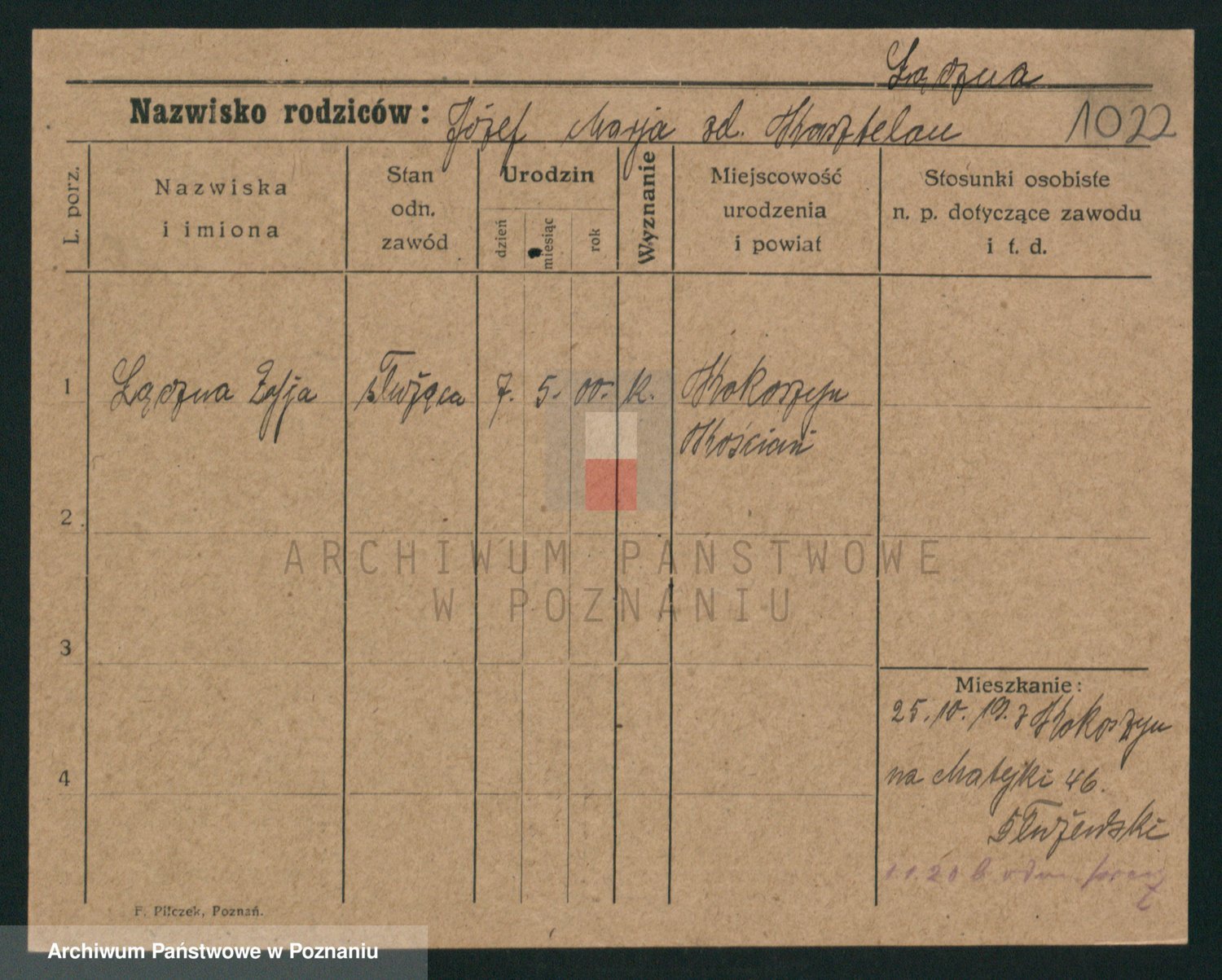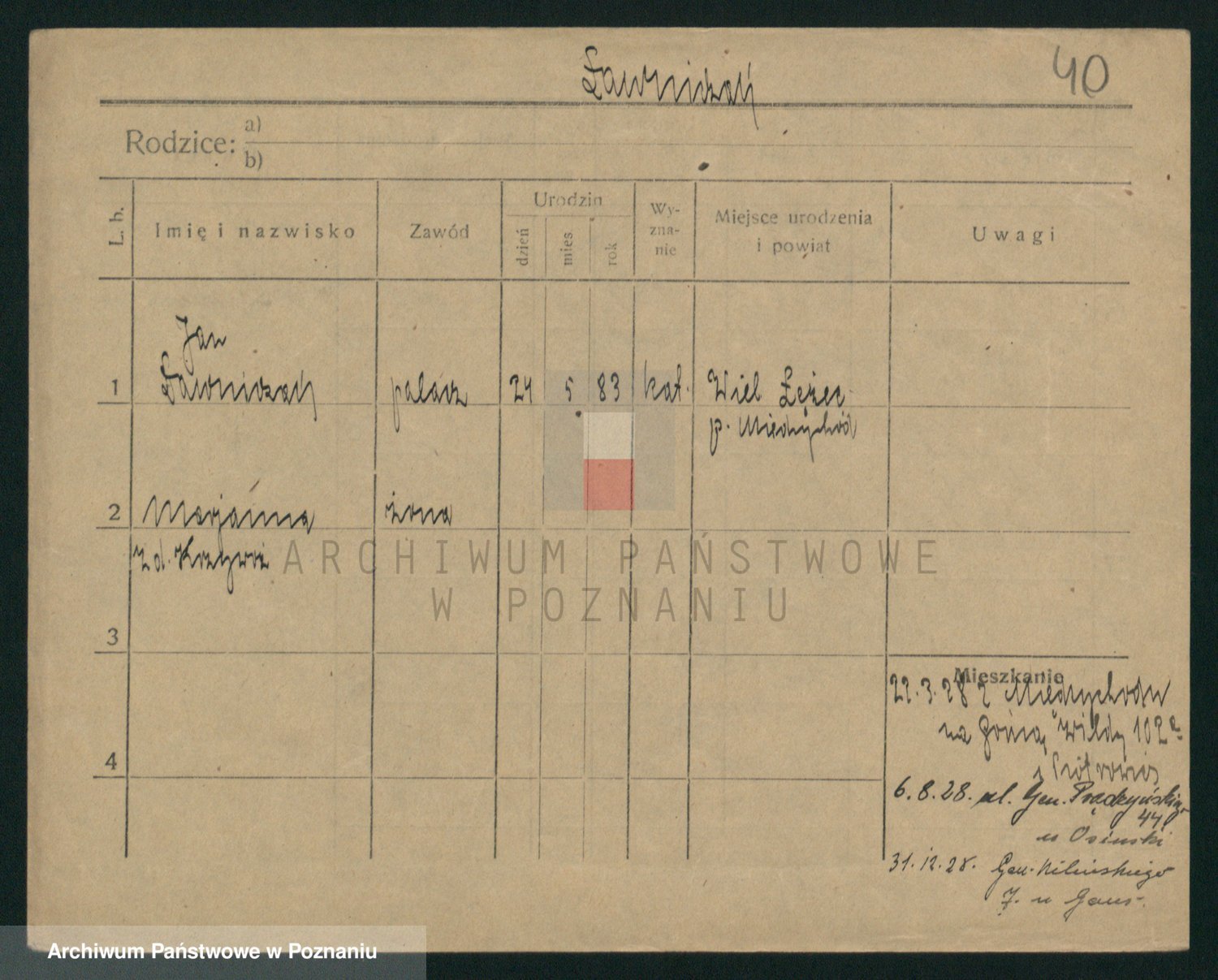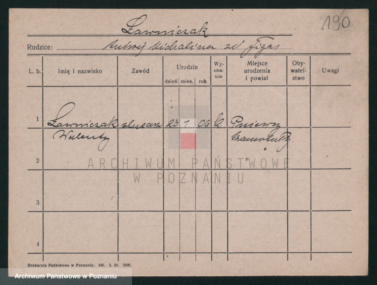 Podgląd karty osobowej dostępny jest po kliknięciu na nazwisko lub ikonkę karty. Można dokonywać powiększenia (ikony na górze) lub przechodzić między kolejnymi skanami (strzałki po bokach).