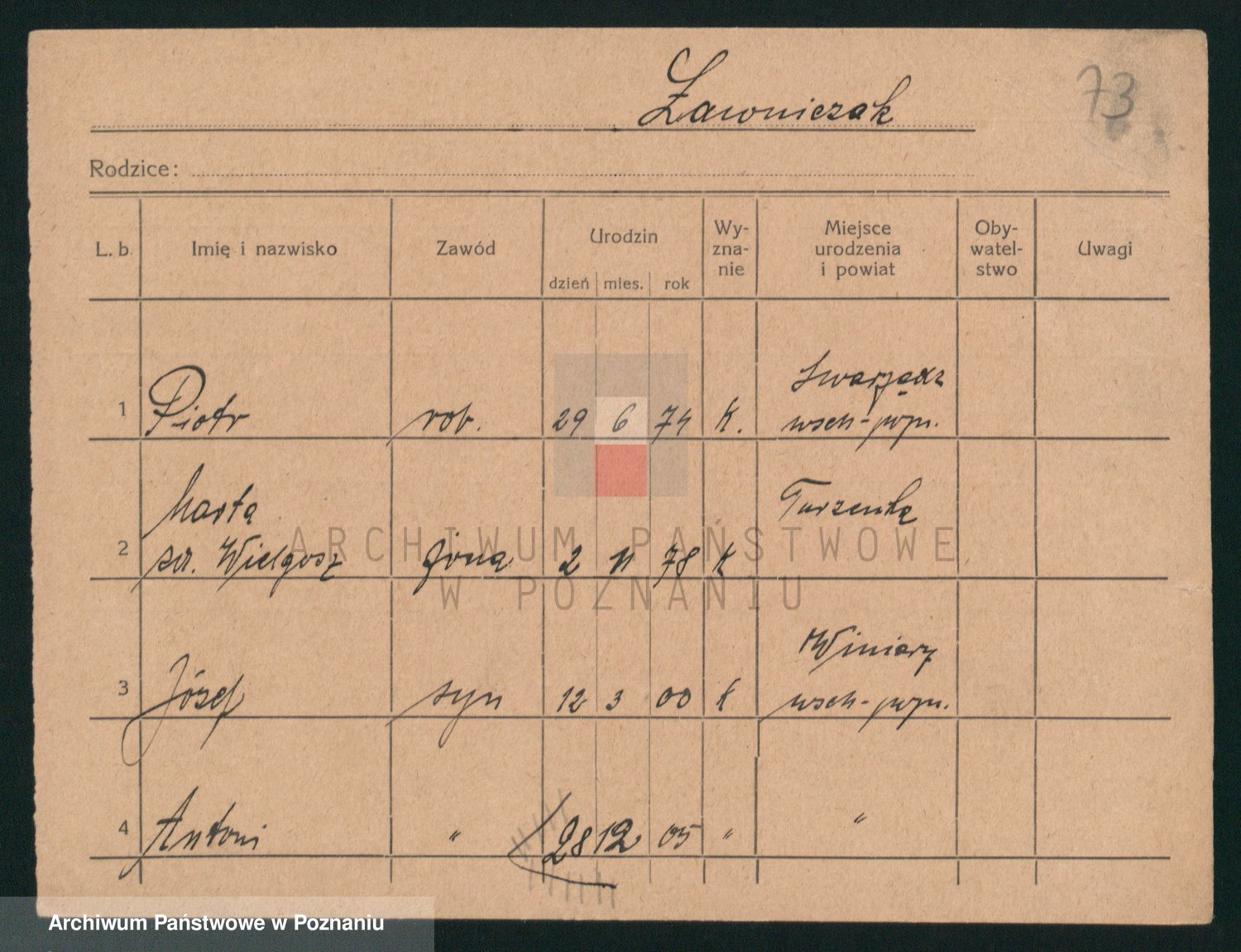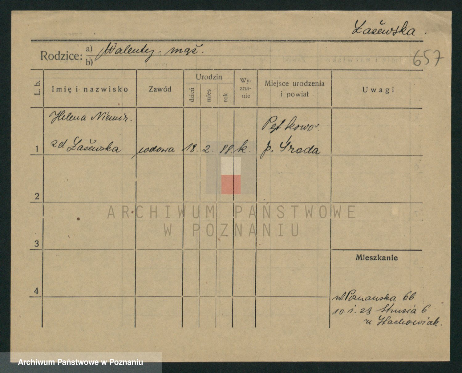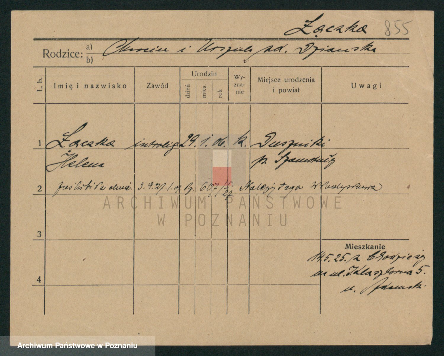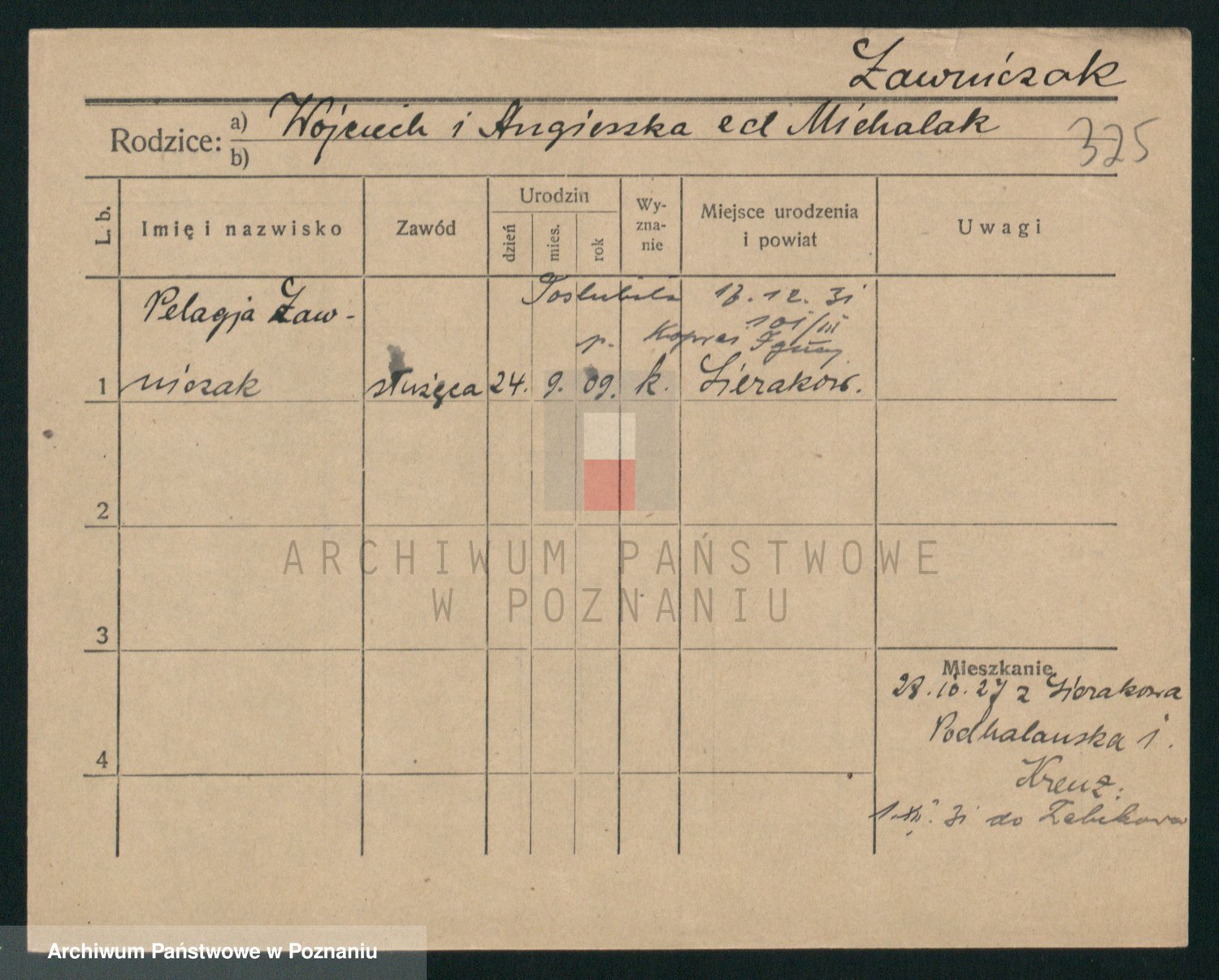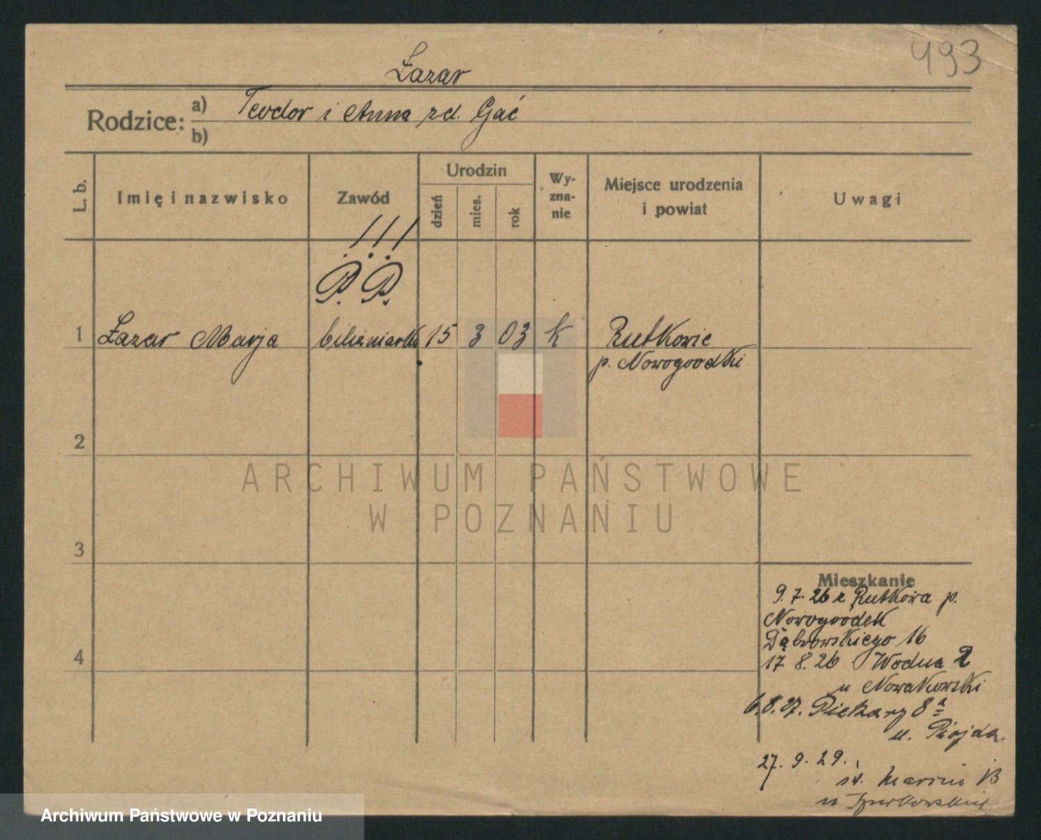 Podgląd karty osobowej dostępny jest po kliknięciu na nazwisko lub ikonkę karty. Można dokonywać powiększenia (ikony na górze) lub przechodzić między kolejnymi skanami (strzałki po bokach).