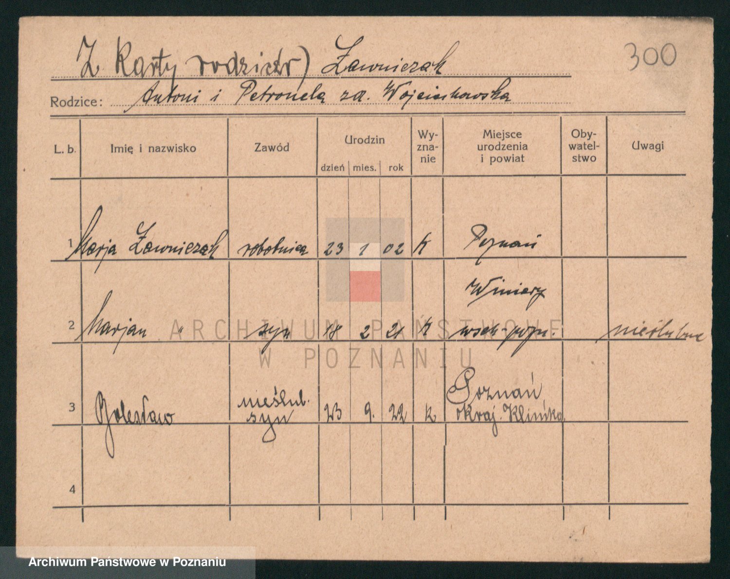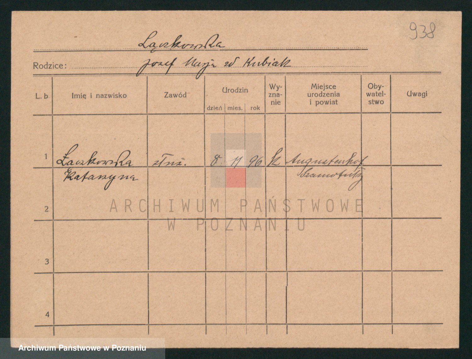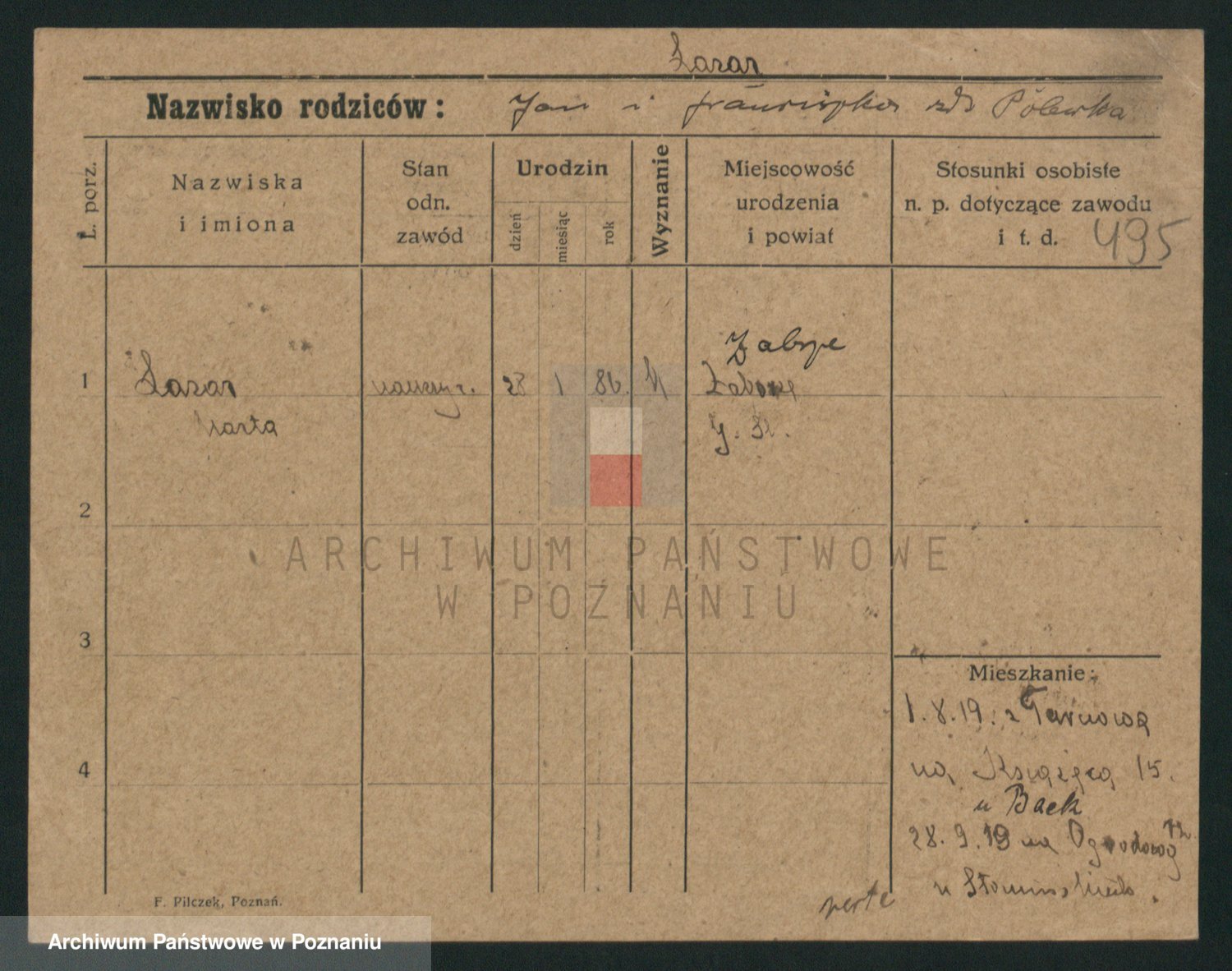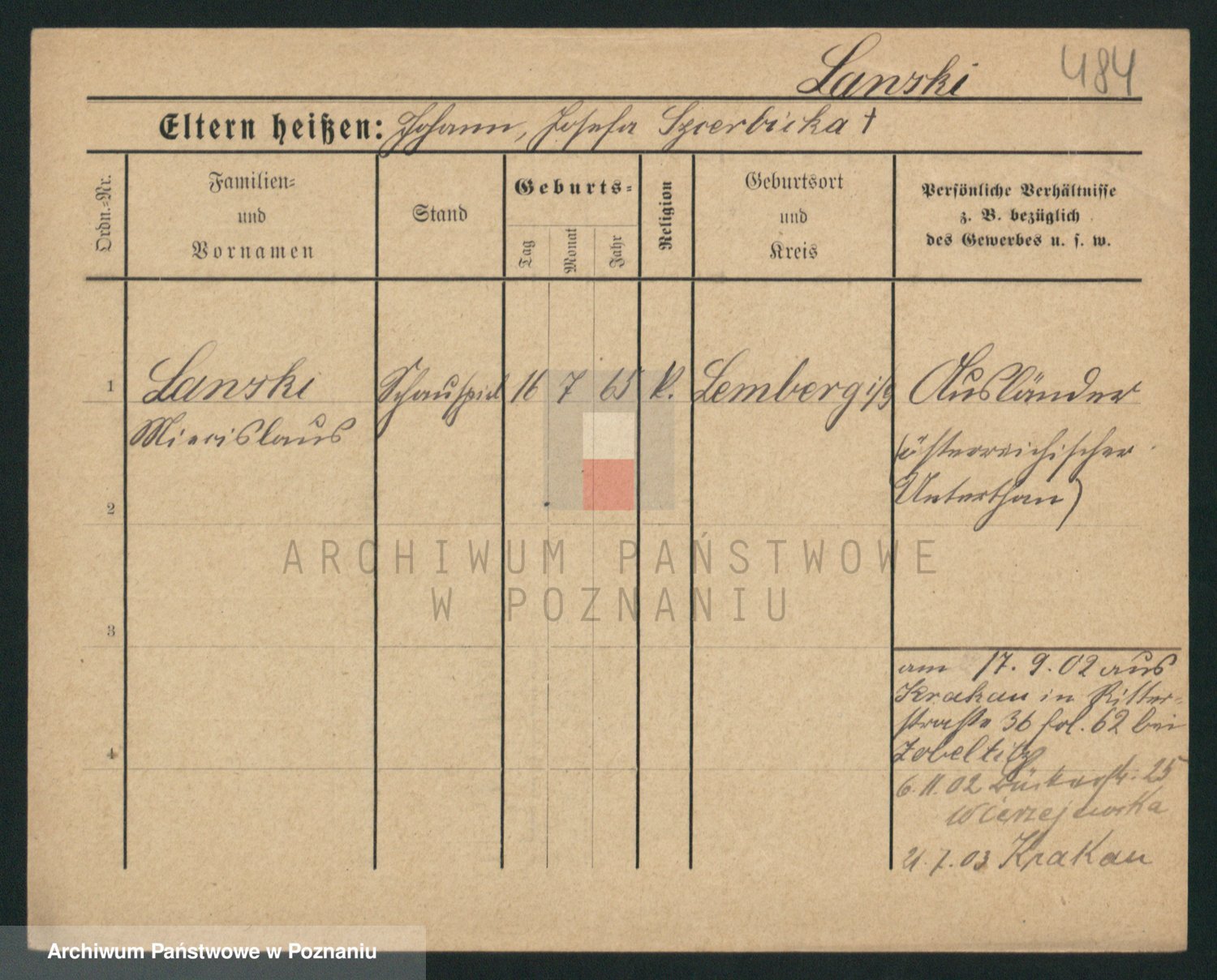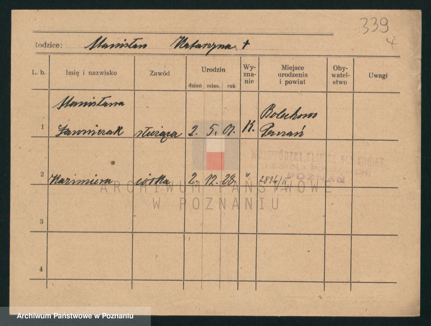 Podgląd karty osobowej dostępny jest po kliknięciu na nazwisko lub ikonkę karty. Można dokonywać powiększenia (ikony na górze) lub przechodzić między kolejnymi skanami (strzałki po bokach).