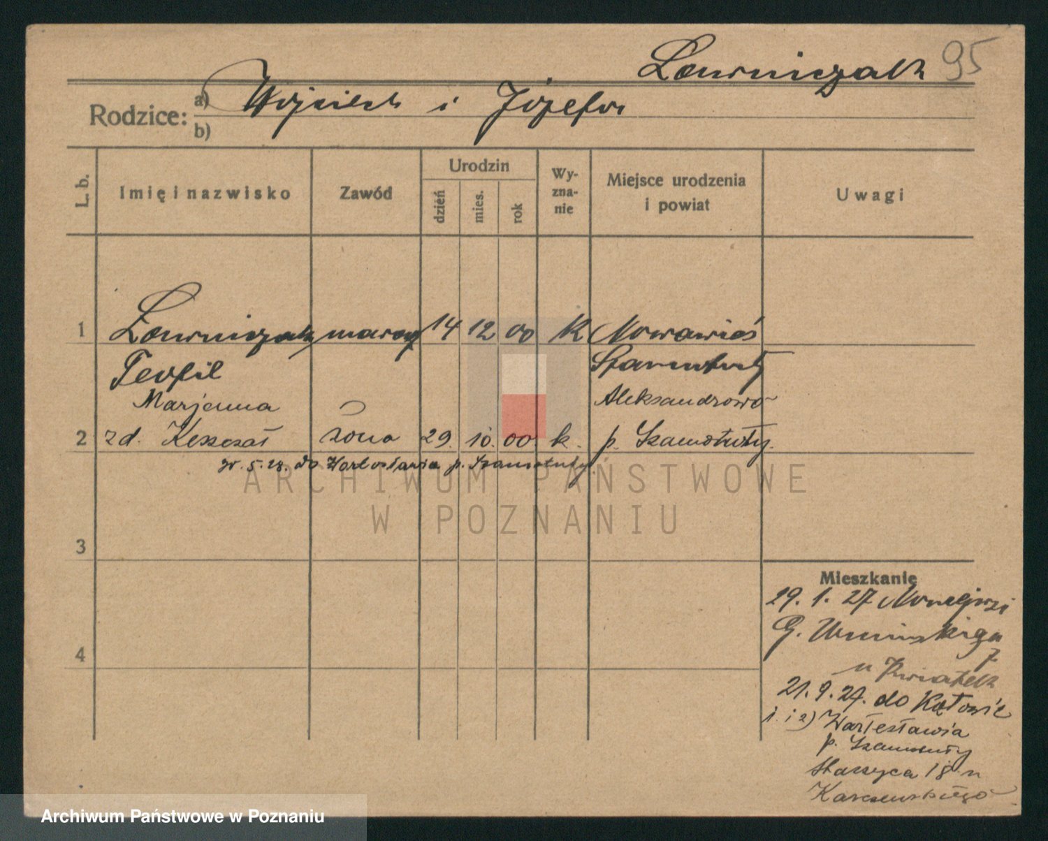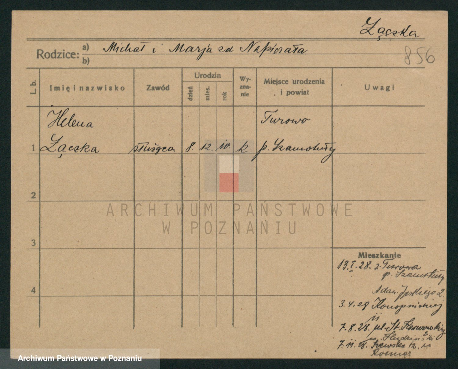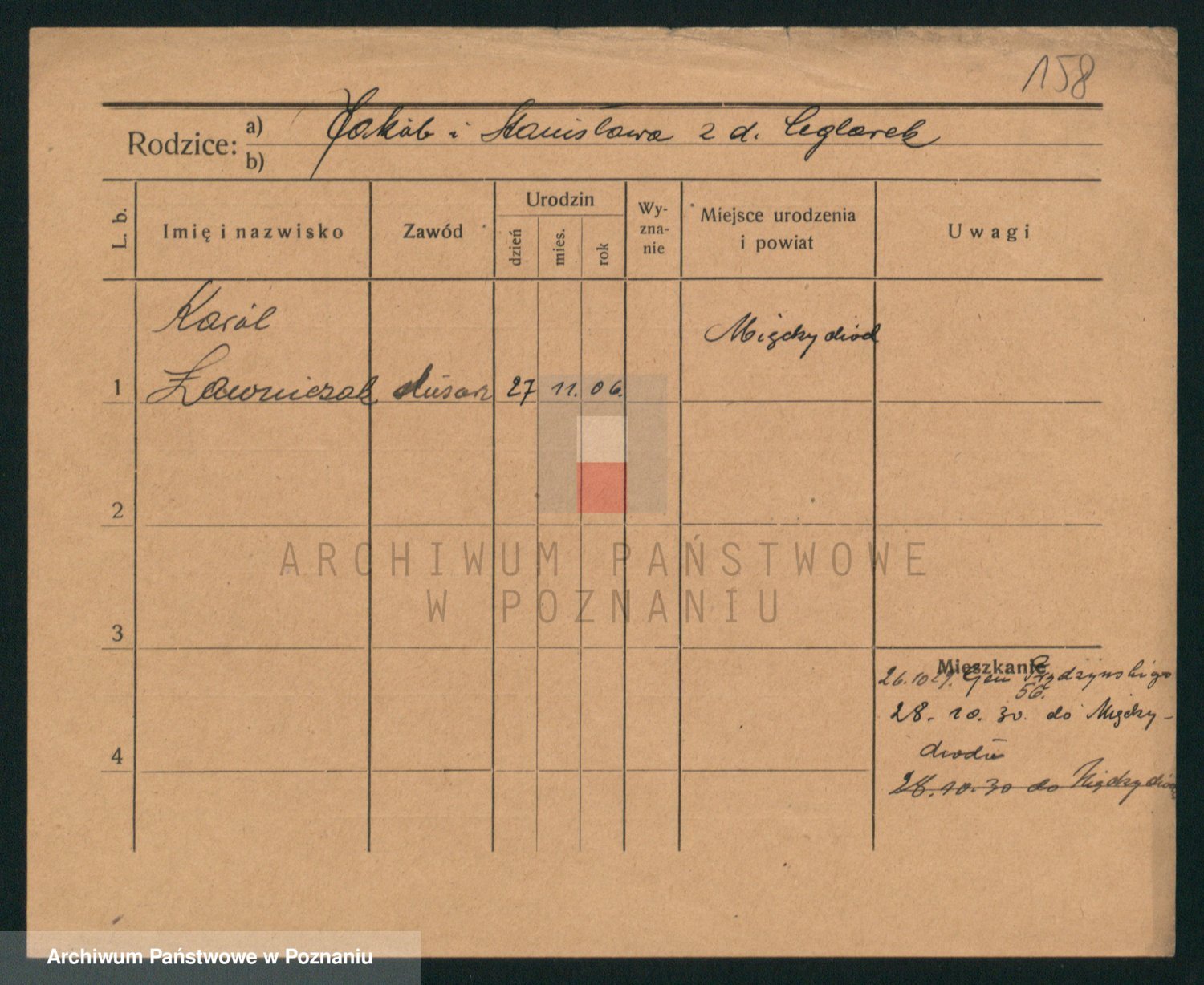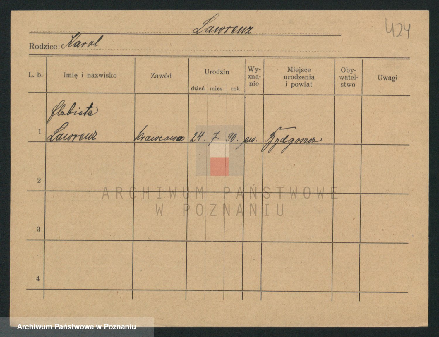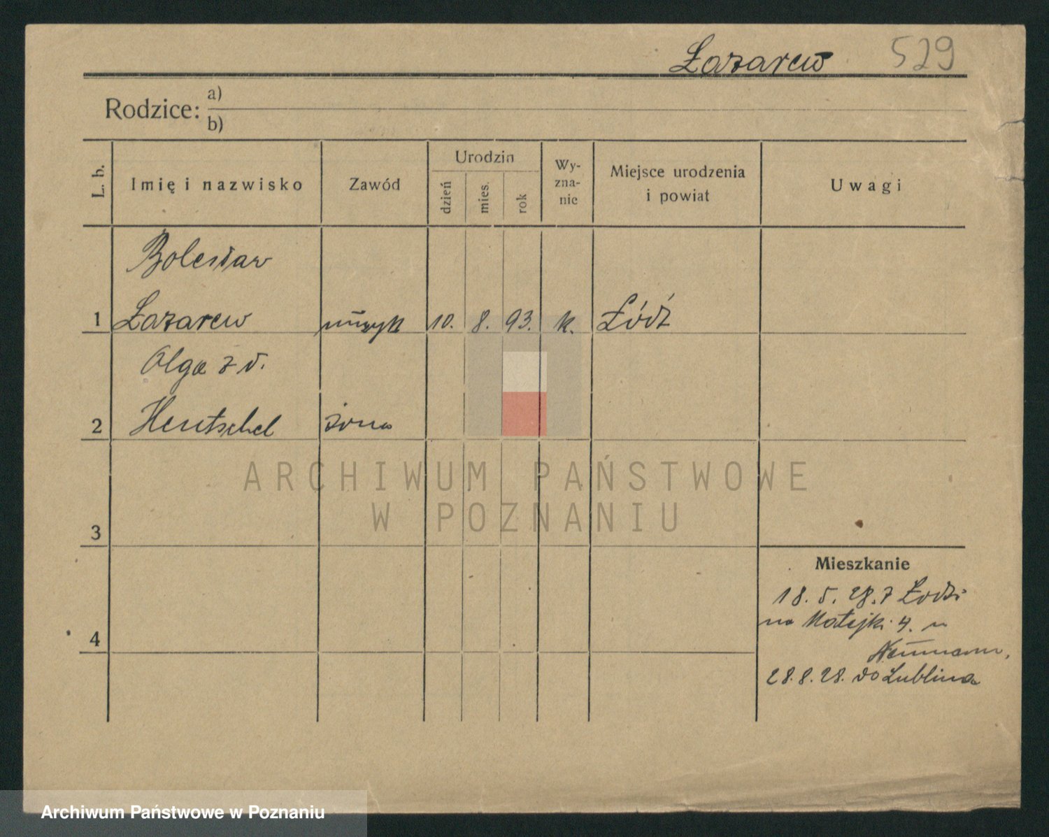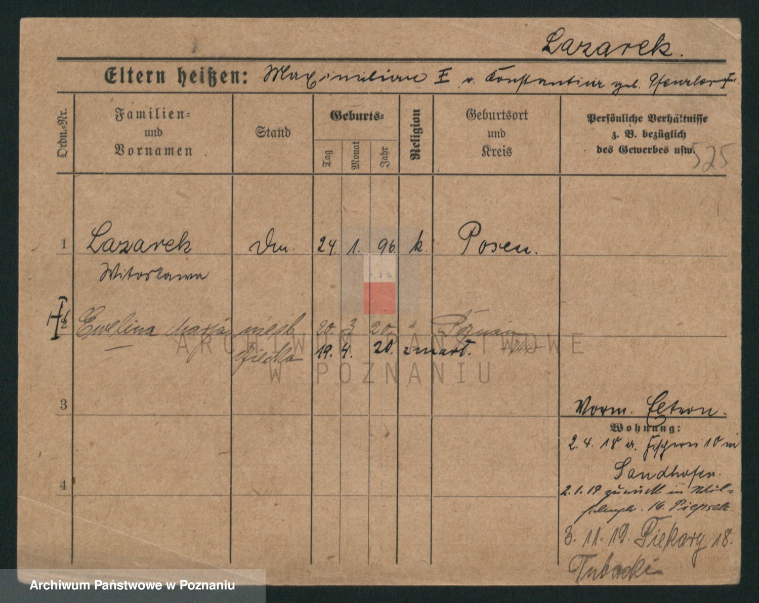 Podgląd karty osobowej dostępny jest po kliknięciu na nazwisko lub ikonkę karty. Można dokonywać powiększenia (ikony na górze) lub przechodzić między kolejnymi skanami (strzałki po bokach).