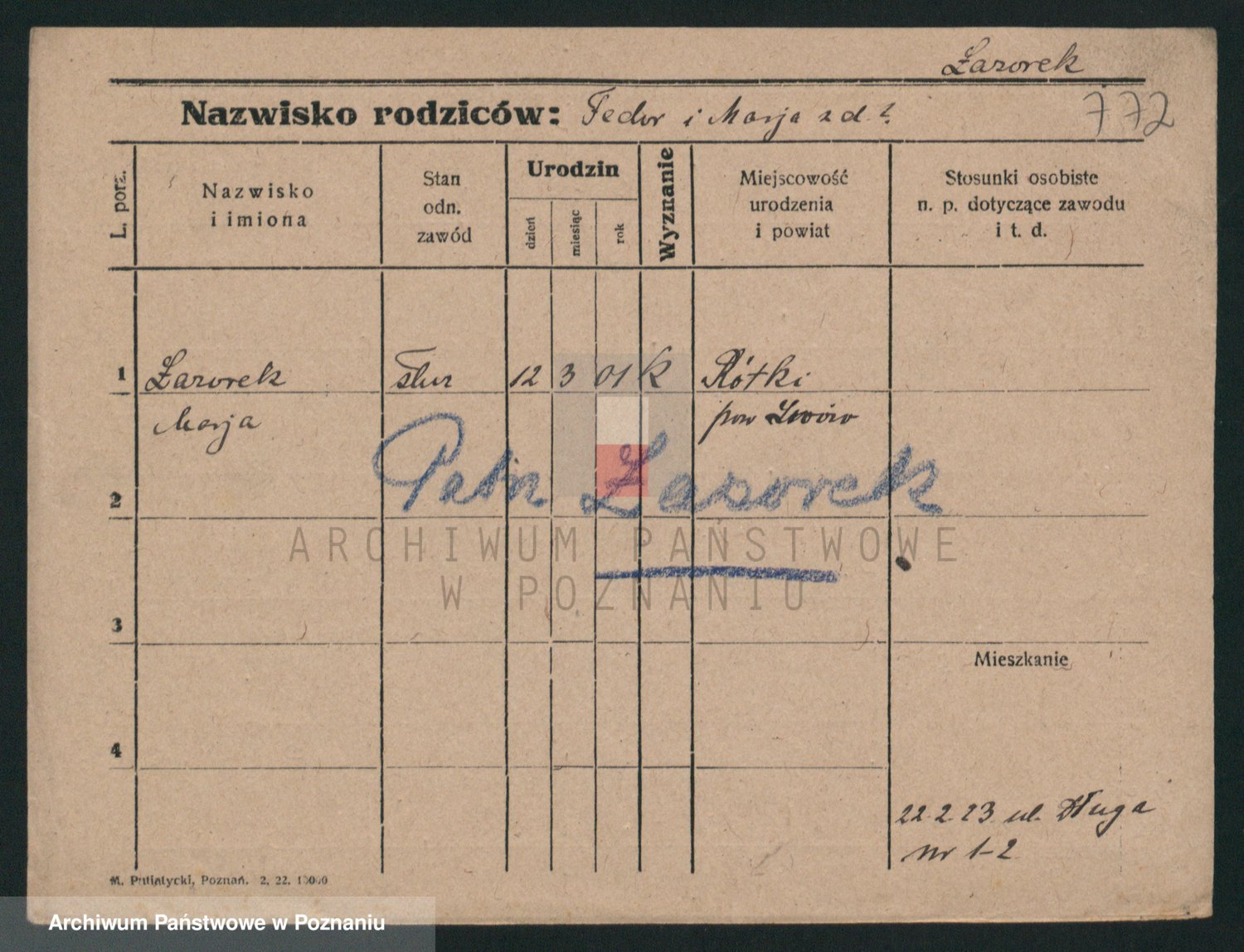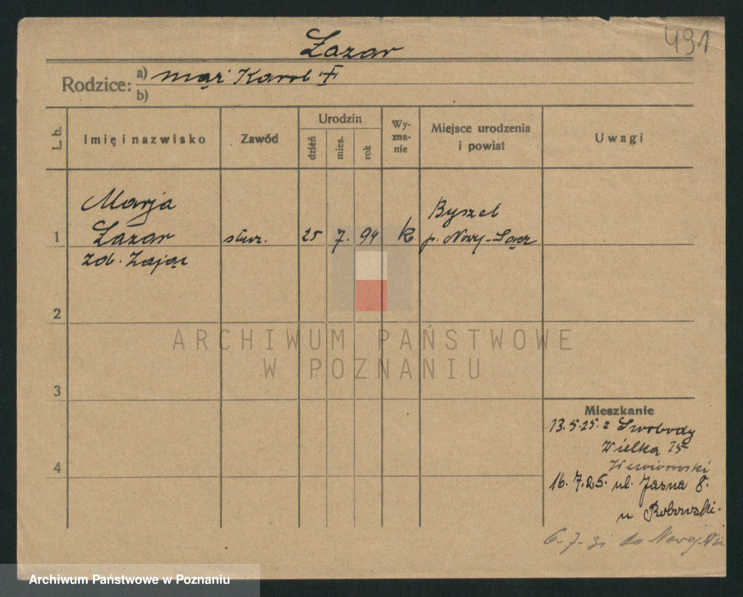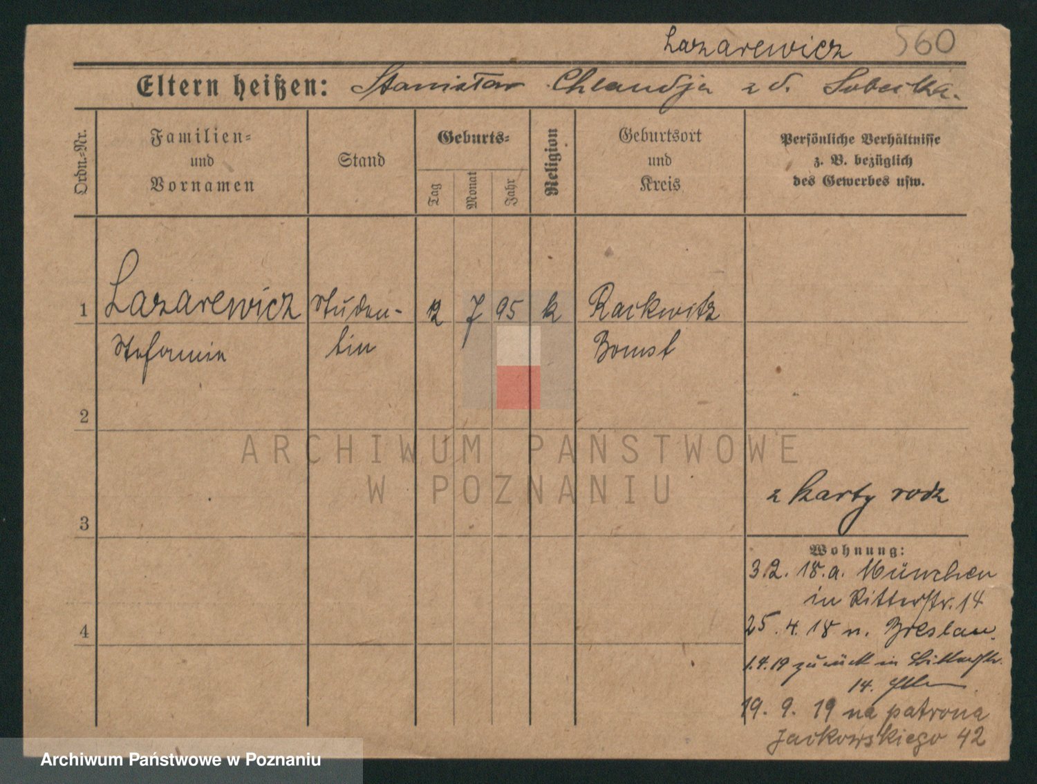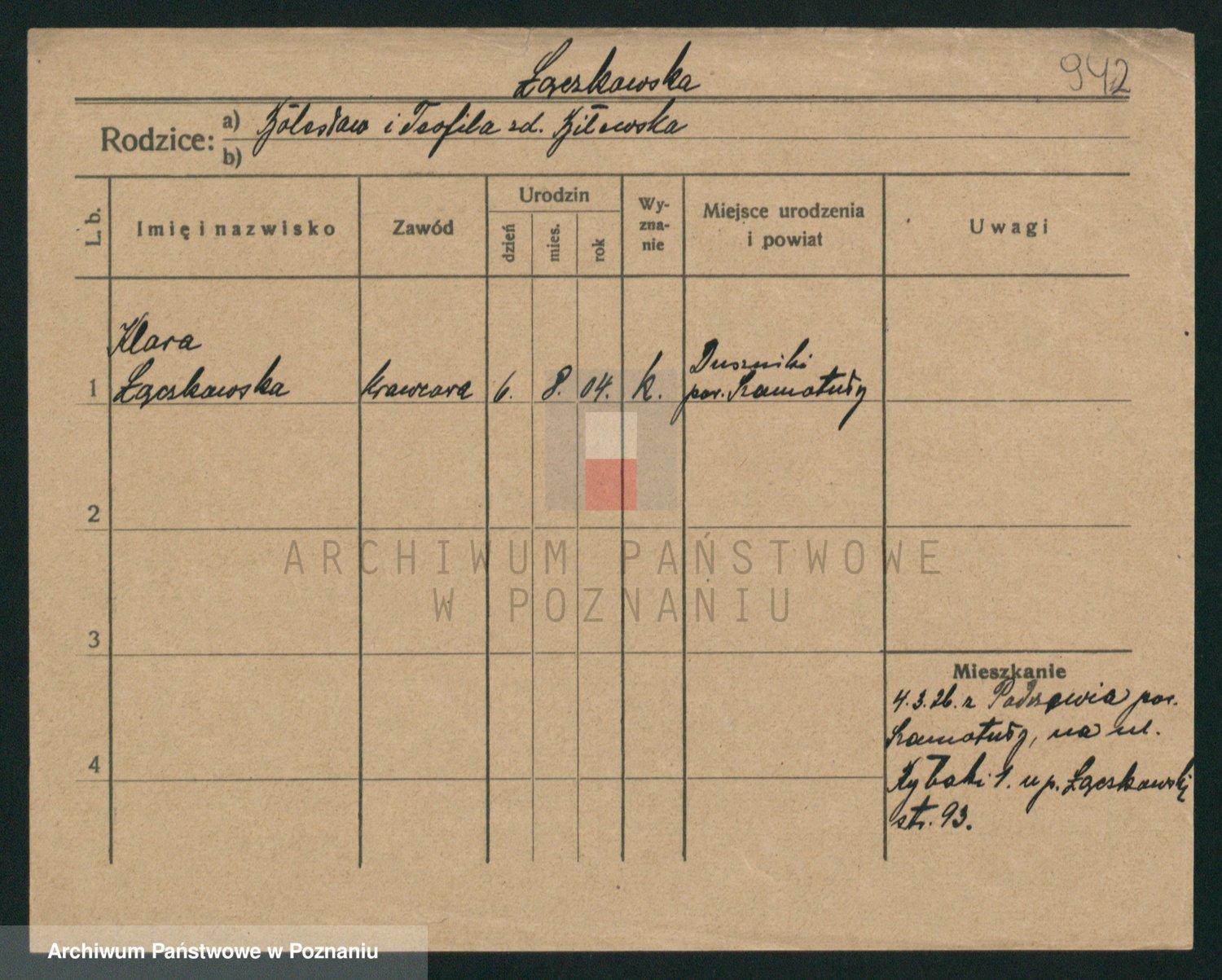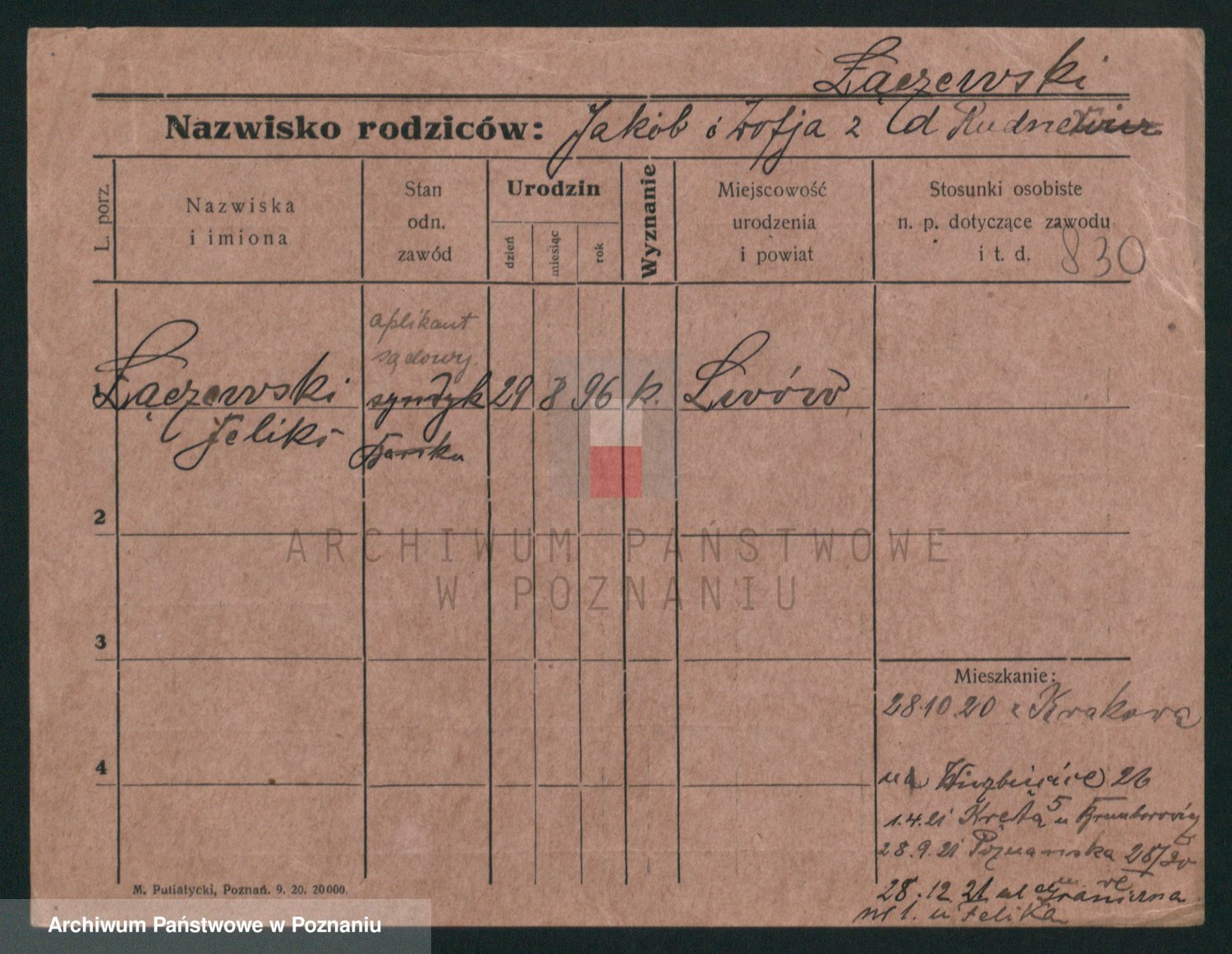 Podgląd karty osobowej dostępny jest po kliknięciu na nazwisko lub ikonkę karty. Można dokonywać powiększenia (ikony na górze) lub przechodzić między kolejnymi skanami (strzałki po bokach).
