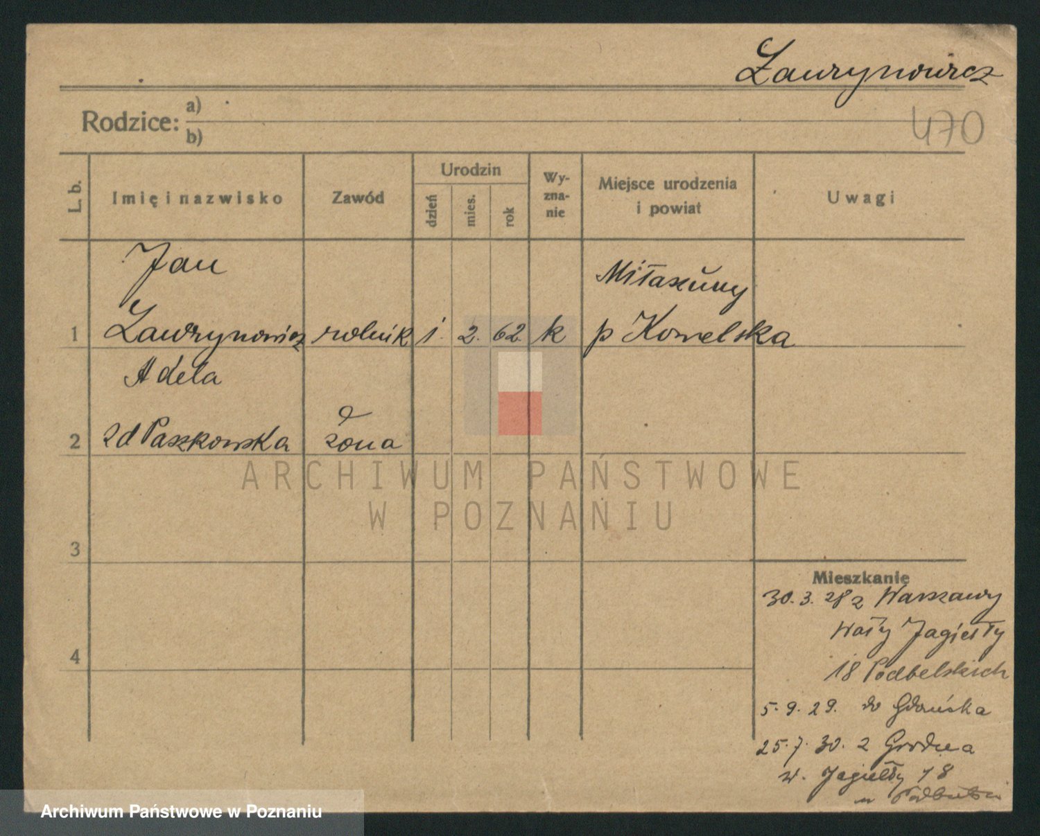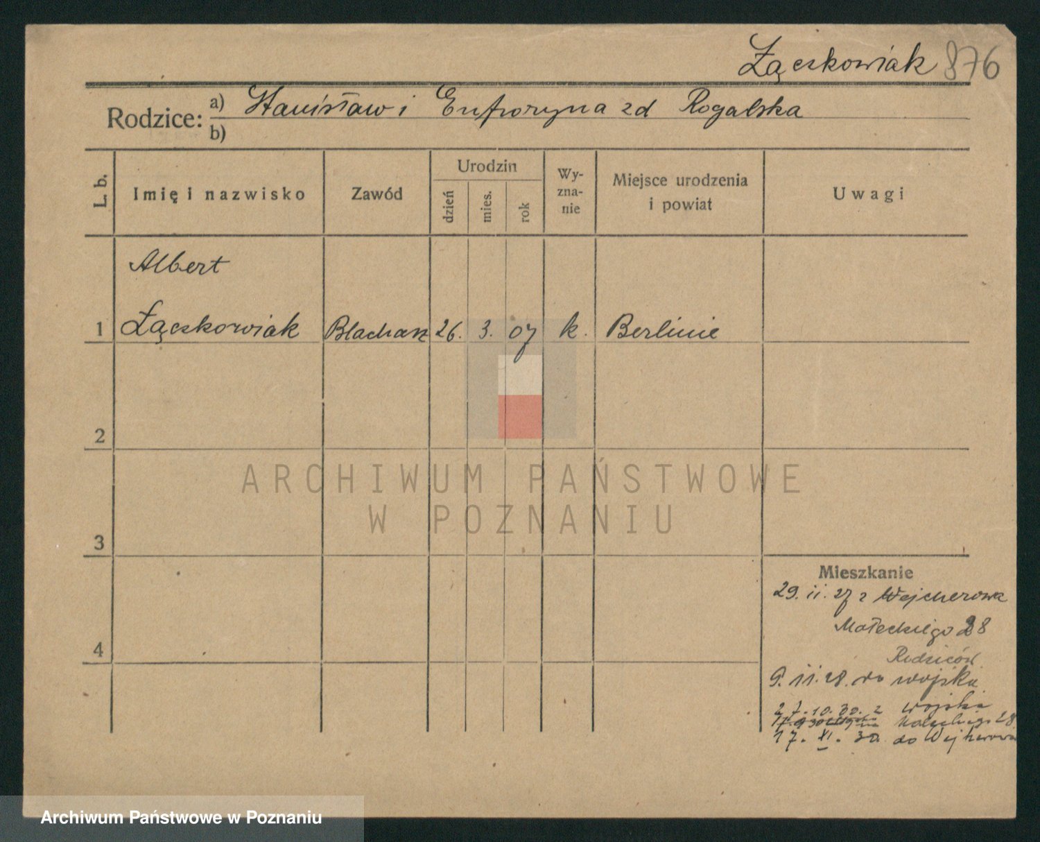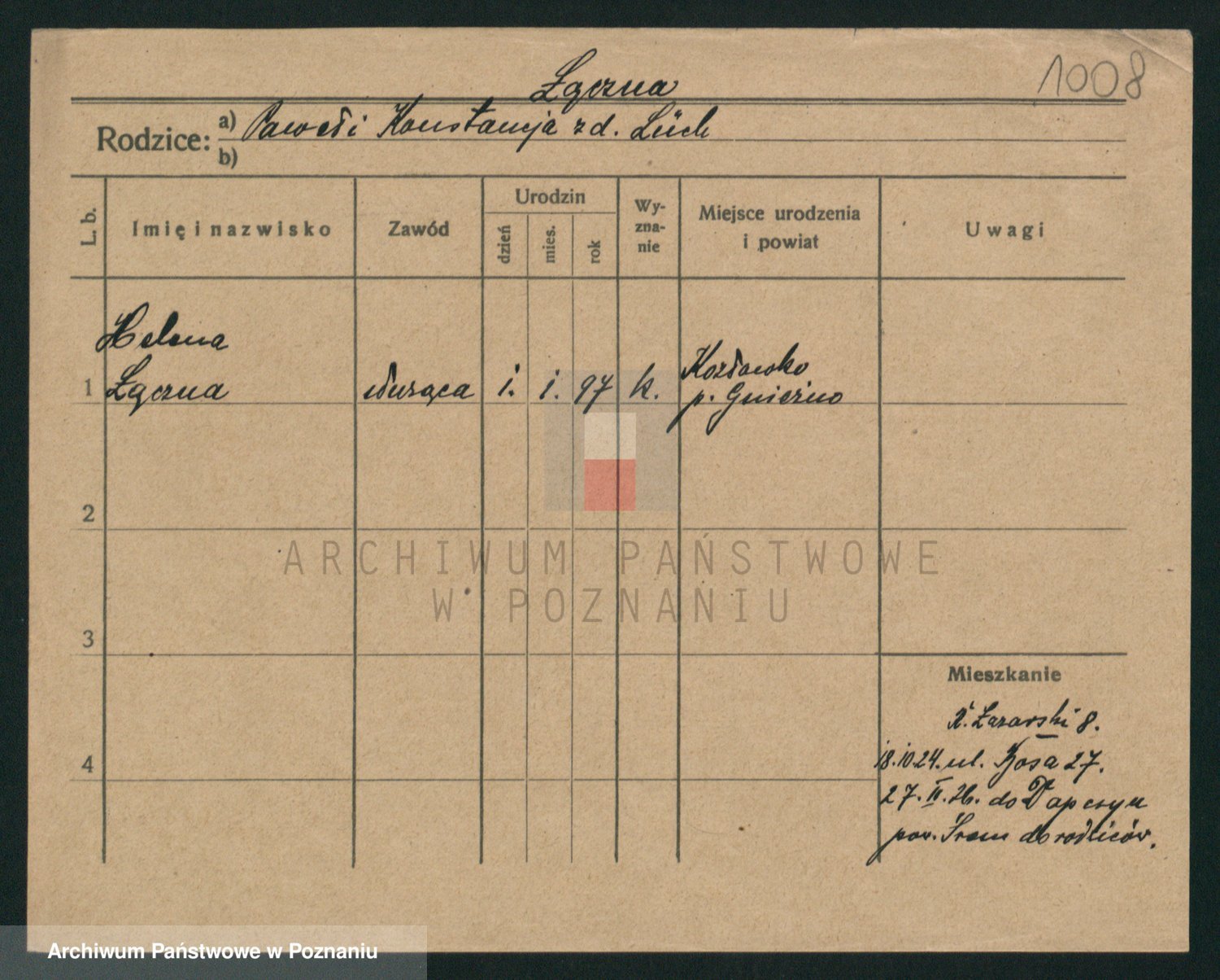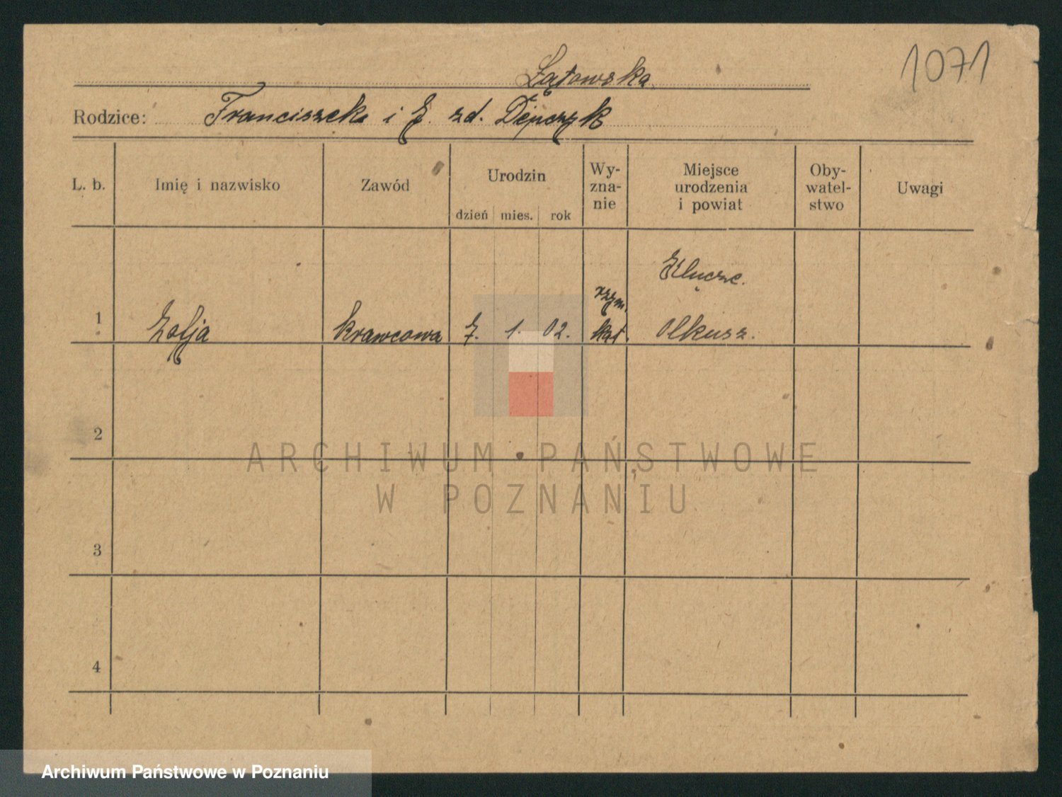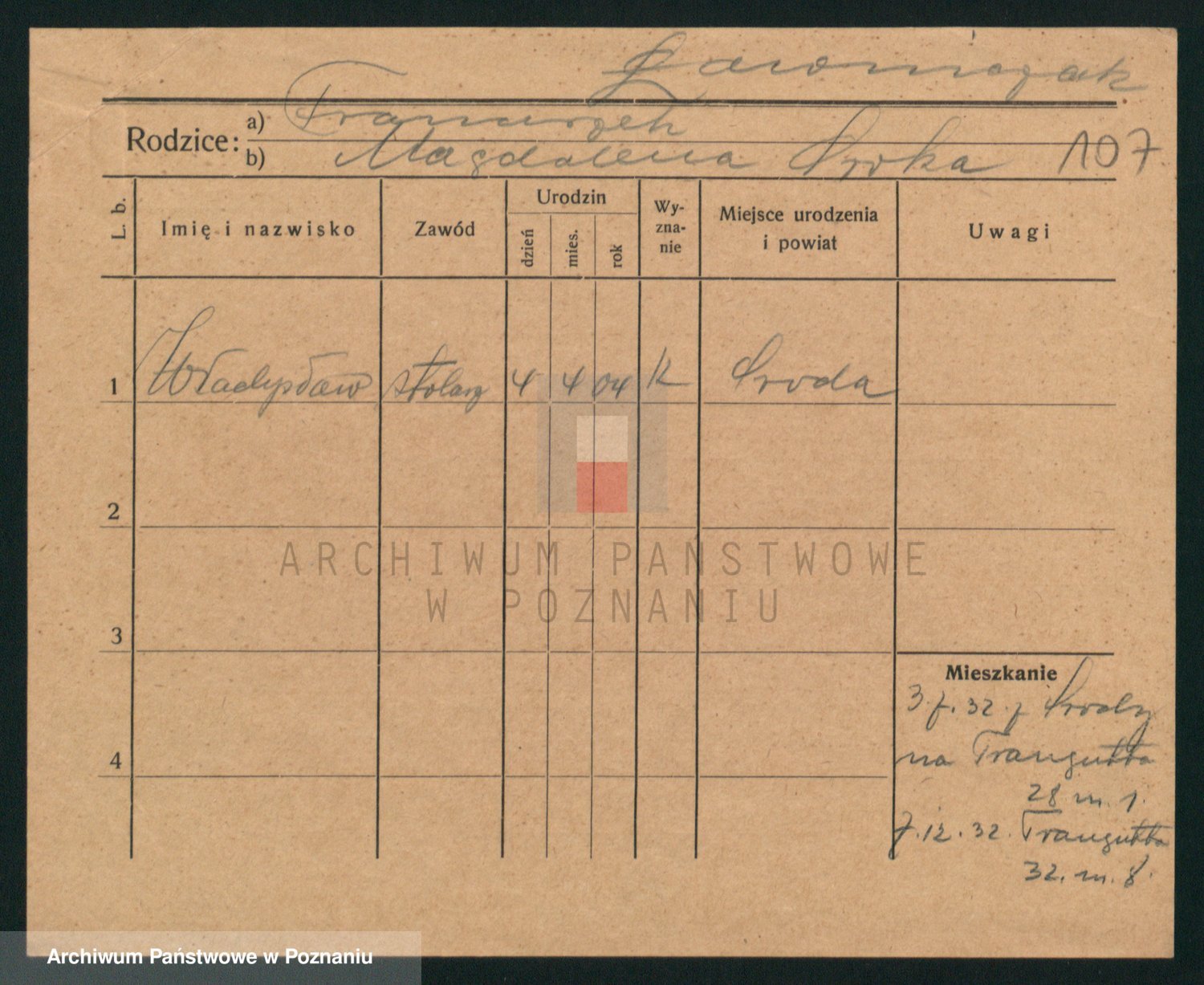Podgląd karty osobowej dostępny jest po kliknięciu na nazwisko lub ikonkę karty. Można dokonywać powiększenia (ikony na górze) lub przechodzić między kolejnymi skanami (strzałki po bokach).