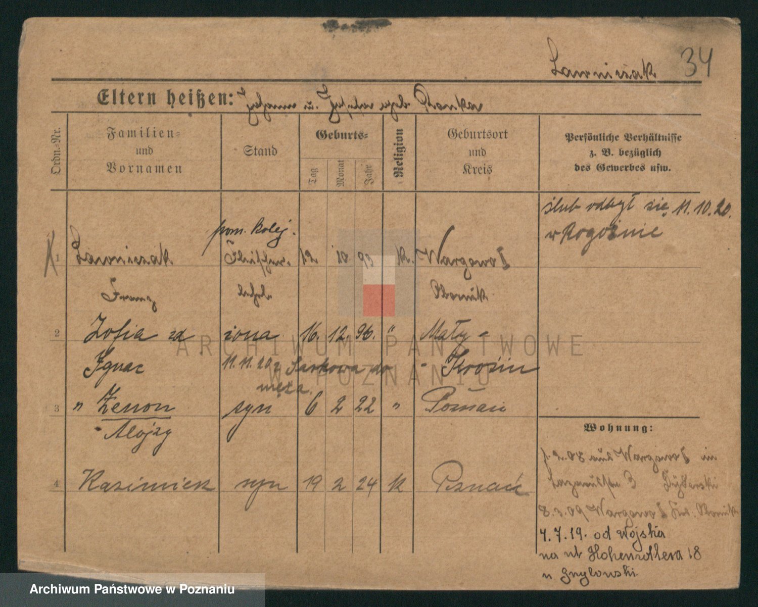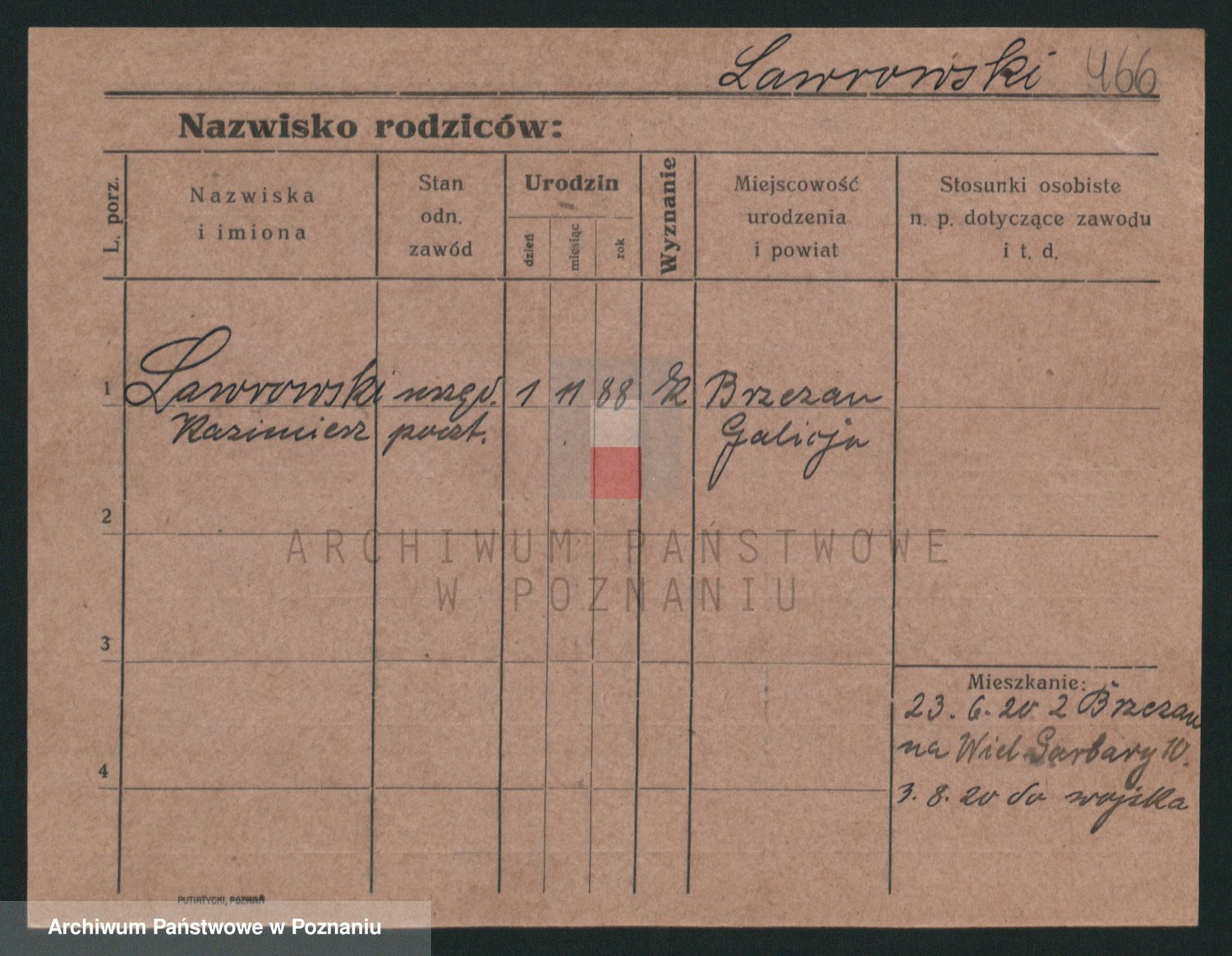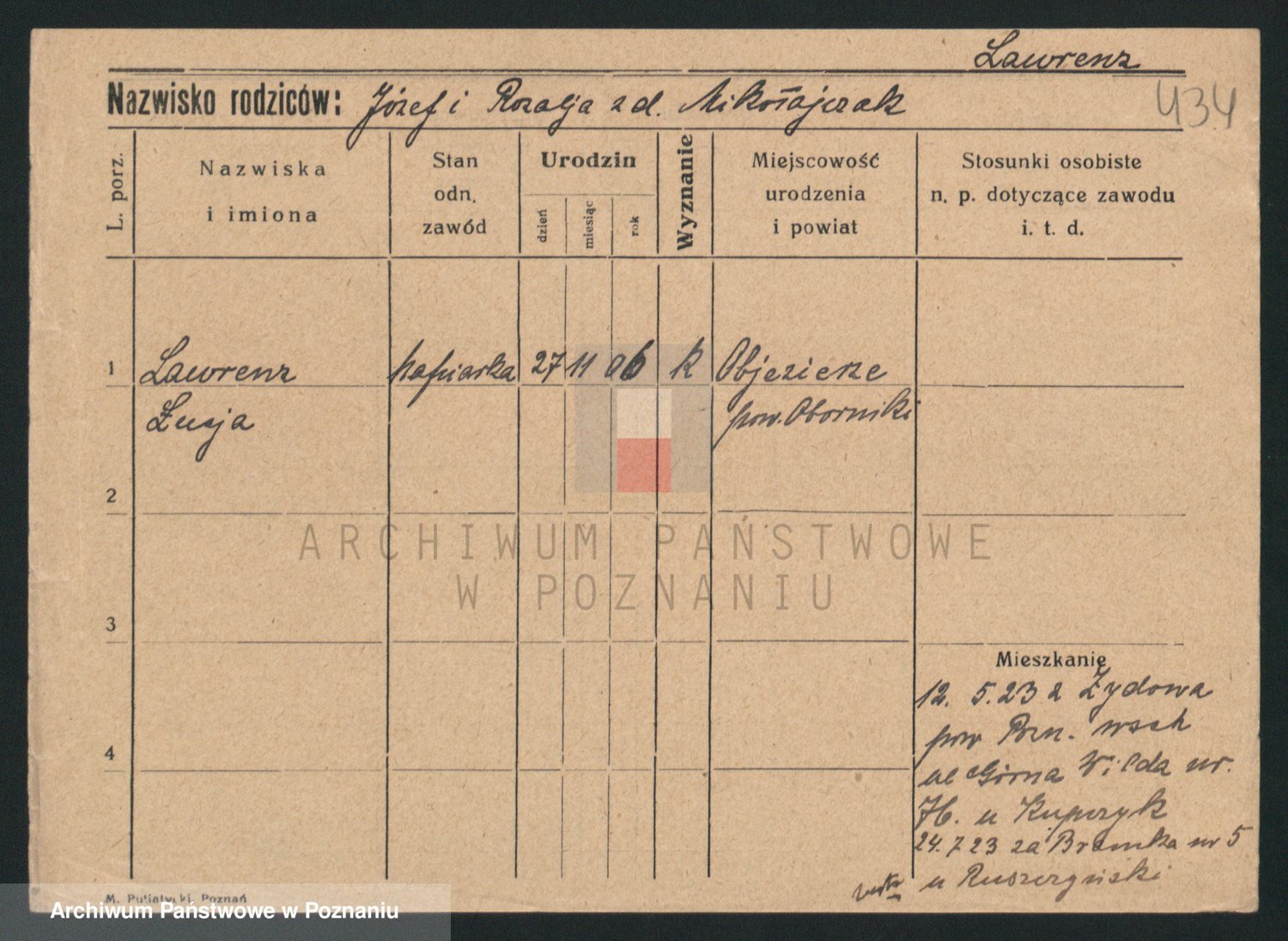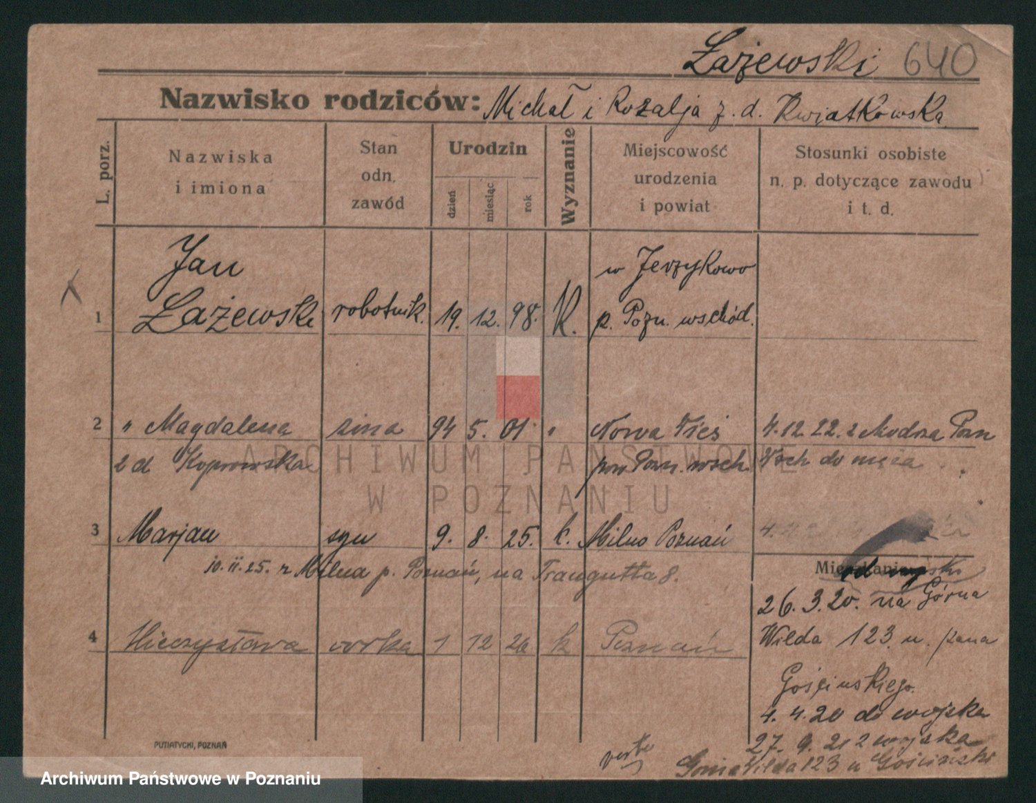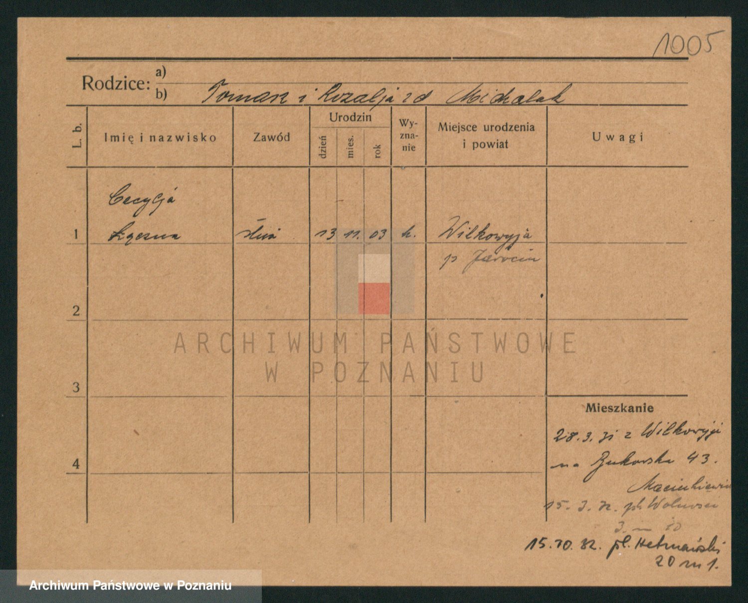Podgląd karty osobowej dostępny jest po kliknięciu na nazwisko lub ikonkę karty. Można dokonywać powiększenia (ikony na górze) lub przechodzić między kolejnymi skanami (strzałki po bokach).