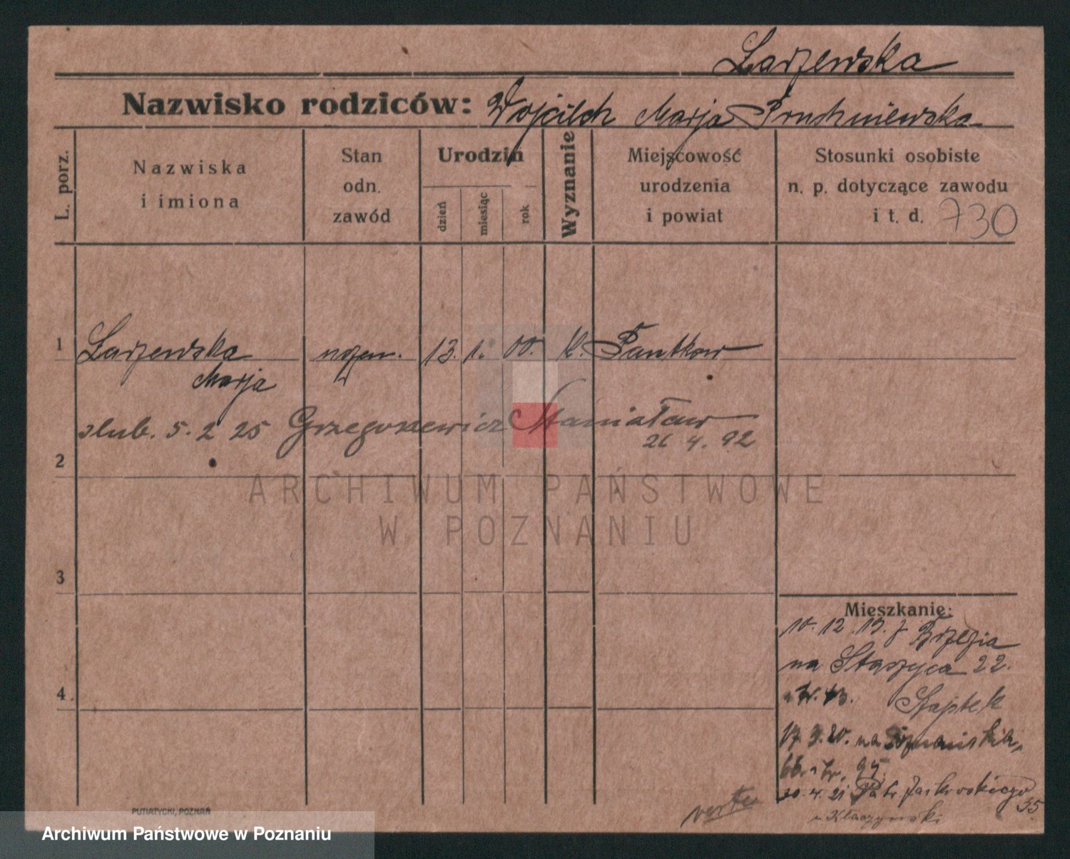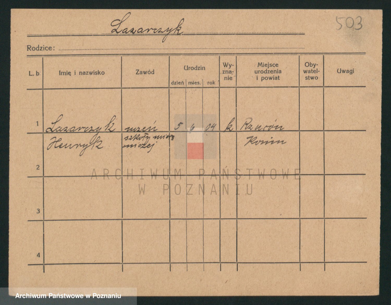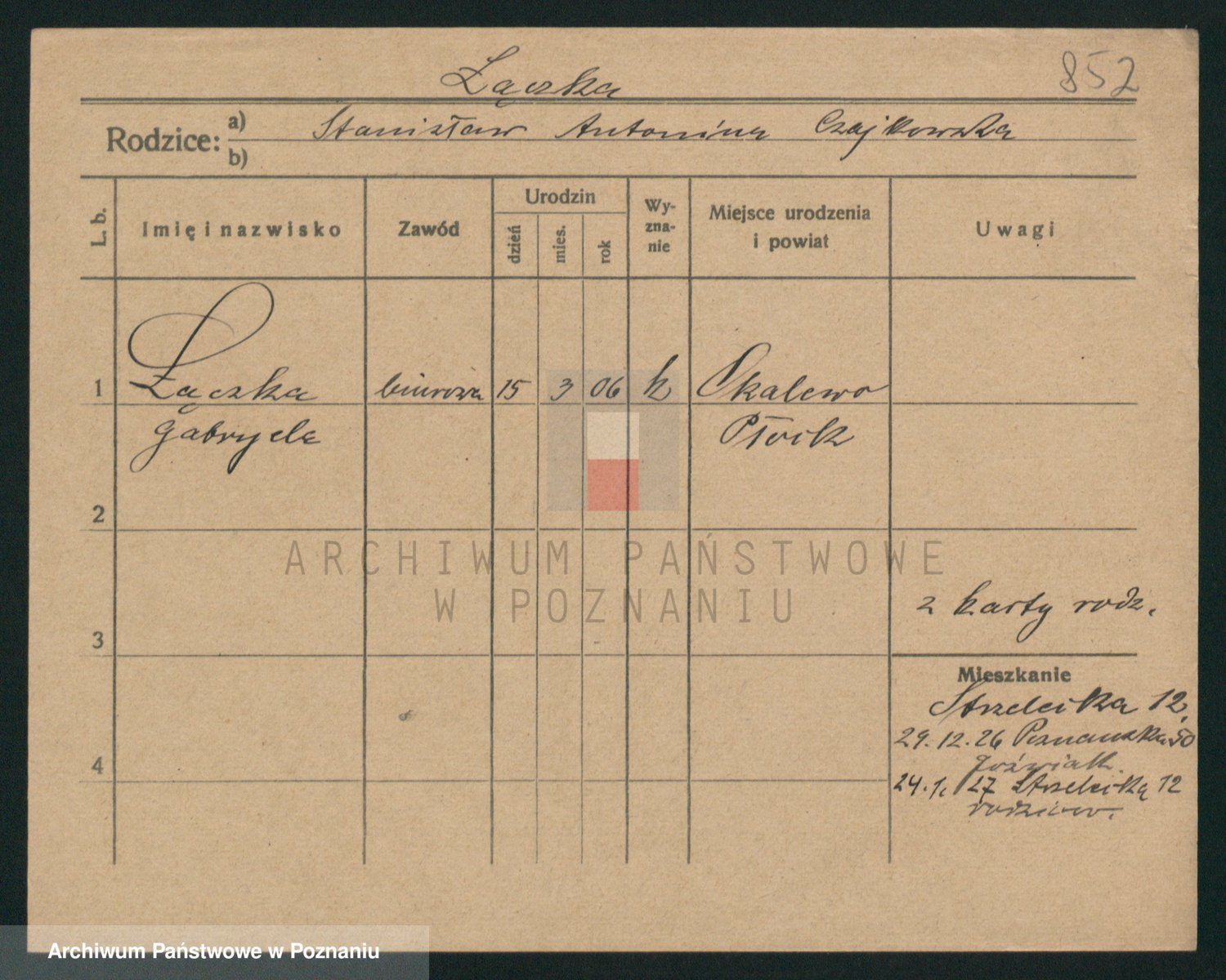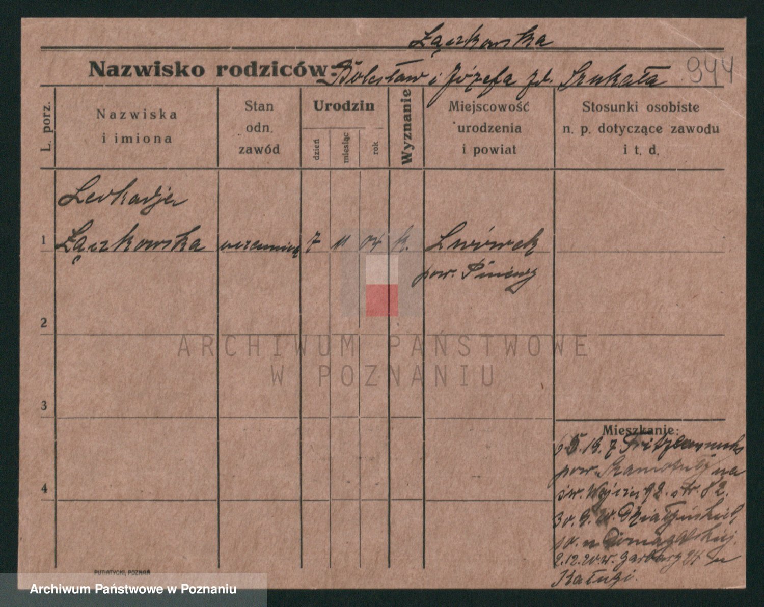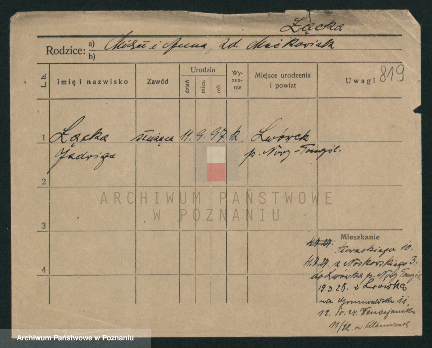 Podgląd karty osobowej dostępny jest po kliknięciu na nazwisko lub ikonkę karty. Można dokonywać powiększenia (ikony na górze) lub przechodzić między kolejnymi skanami (strzałki po bokach).