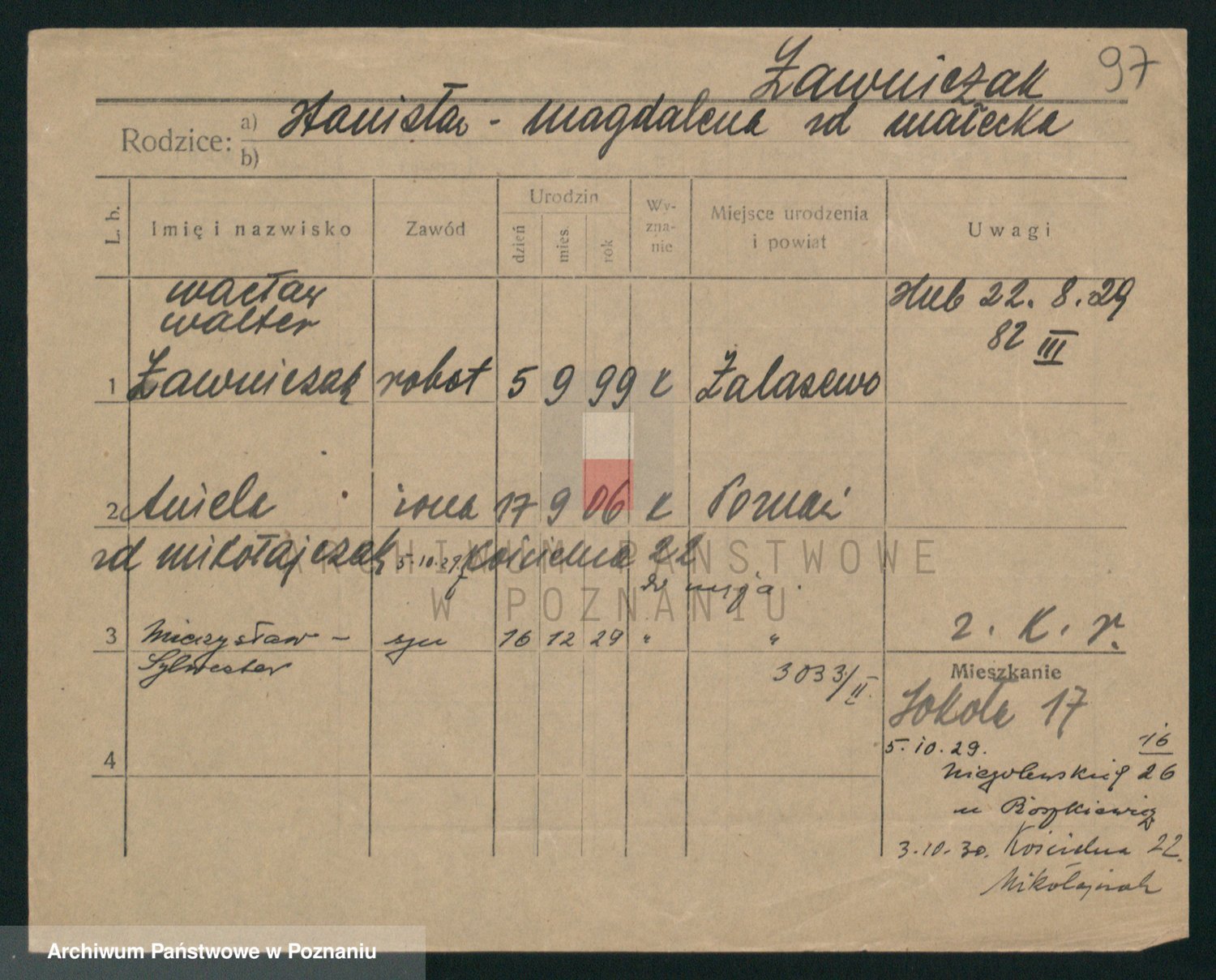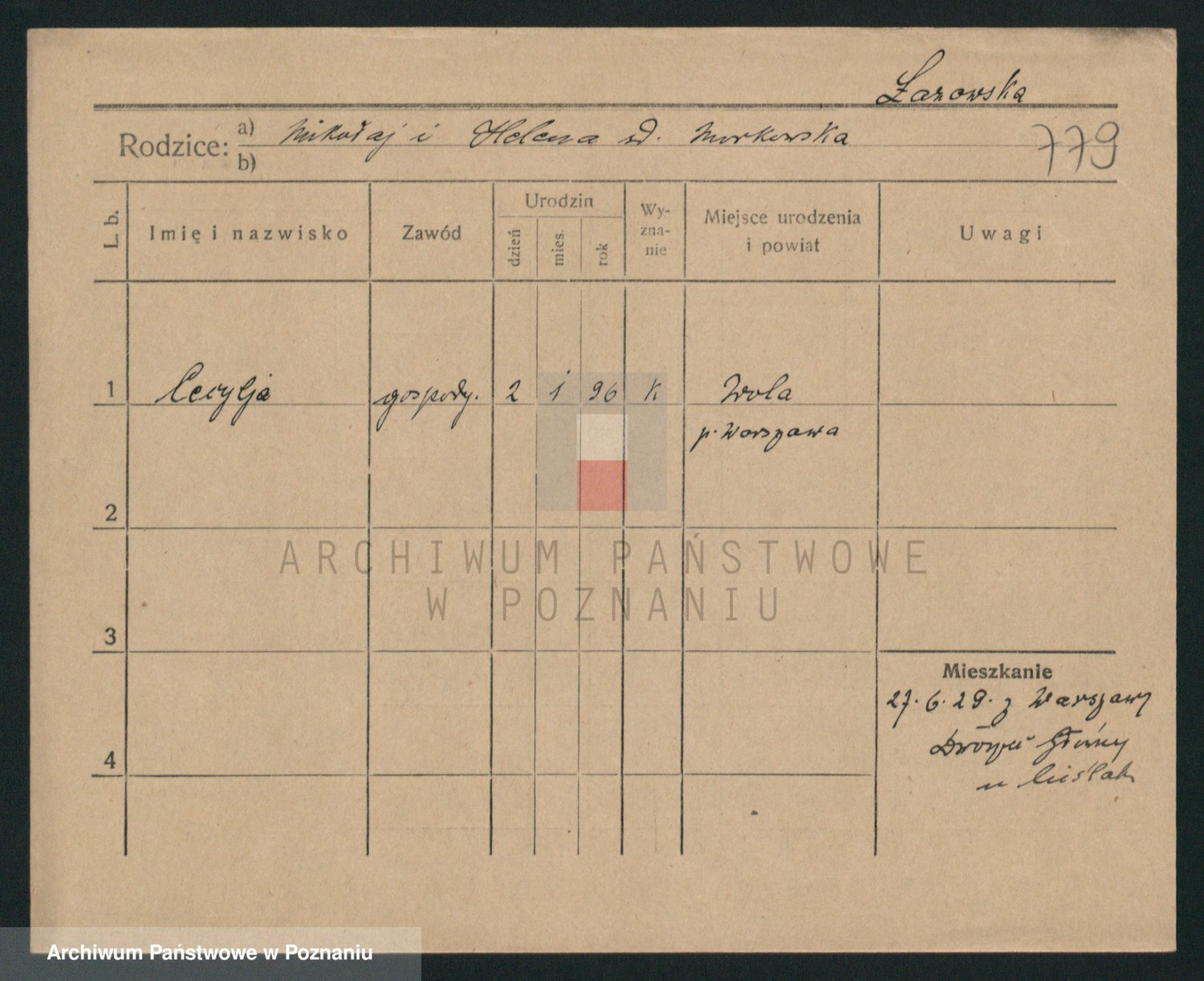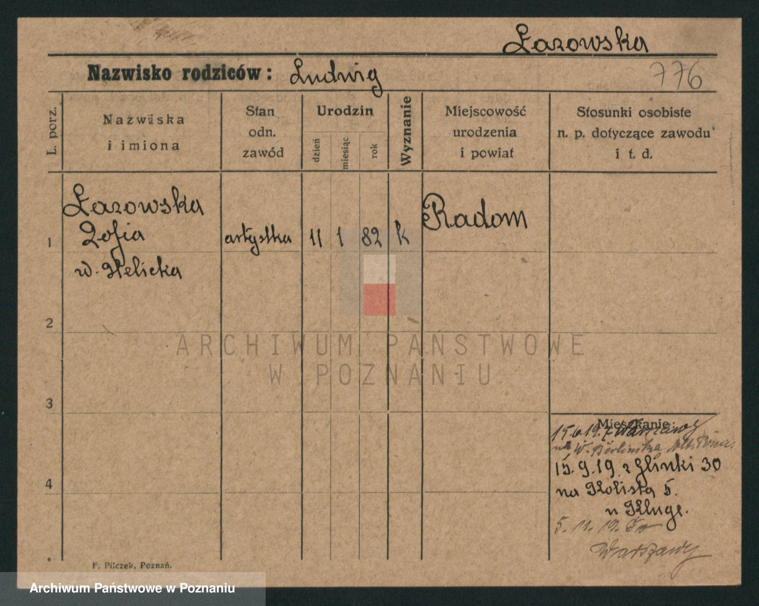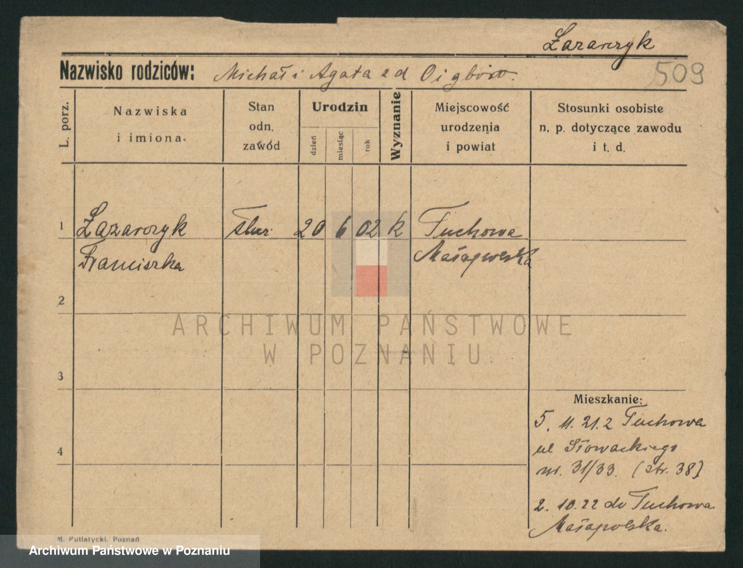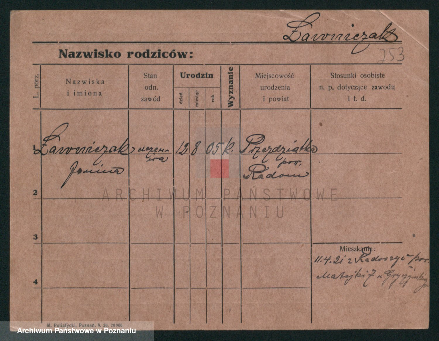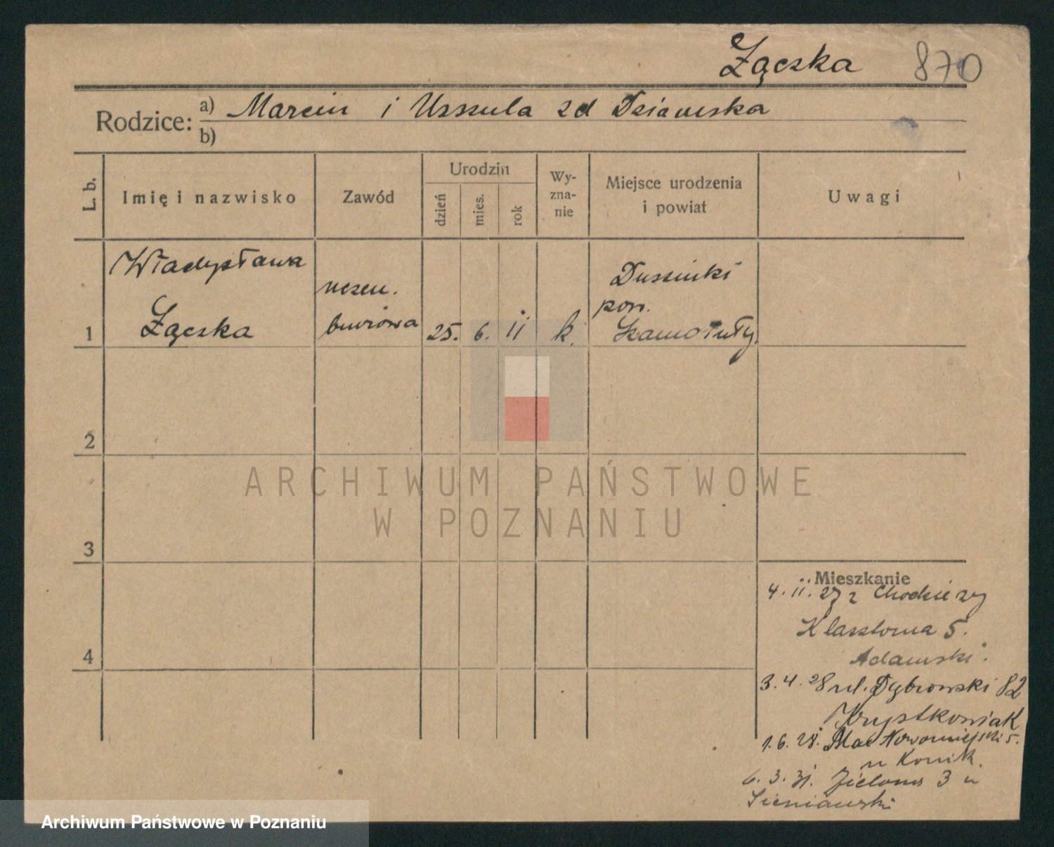 Podgląd karty osobowej dostępny jest po kliknięciu na nazwisko lub ikonkę karty. Można dokonywać powiększenia (ikony na górze) lub przechodzić między kolejnymi skanami (strzałki po bokach).