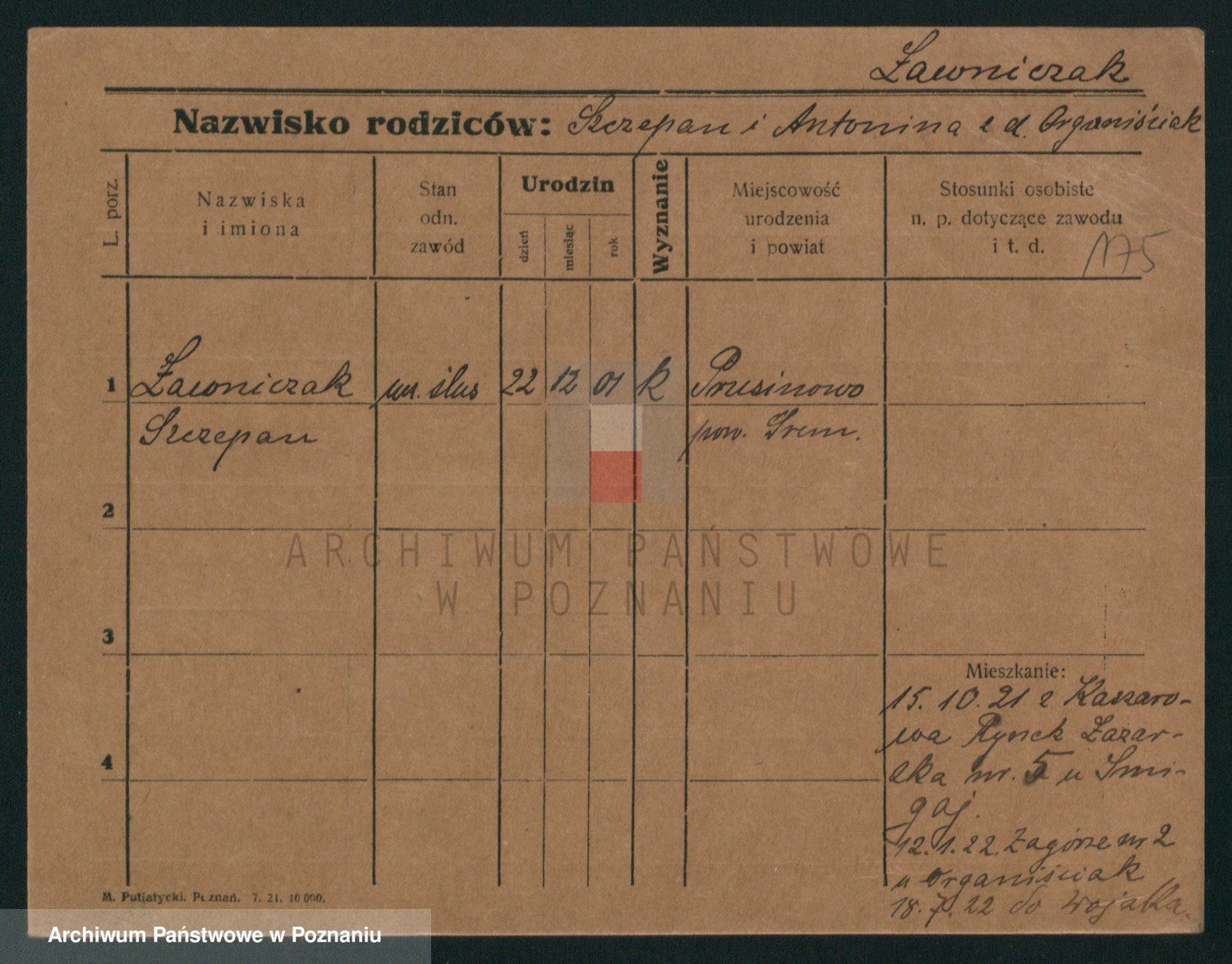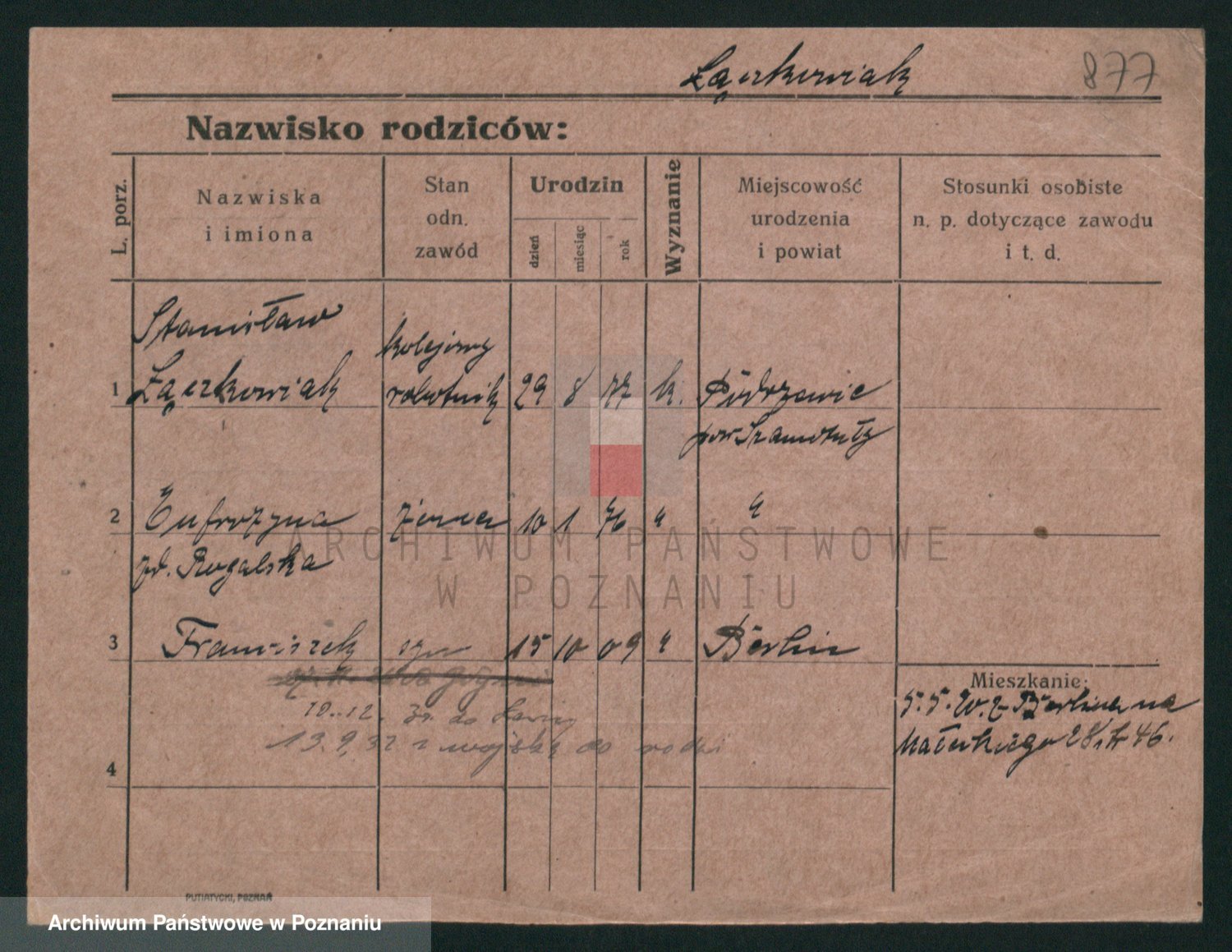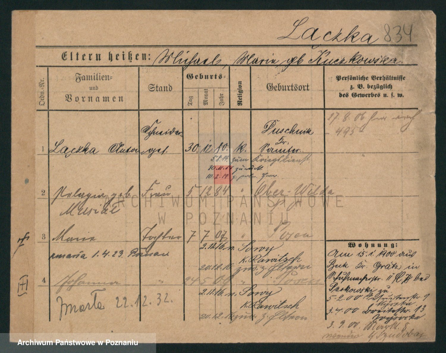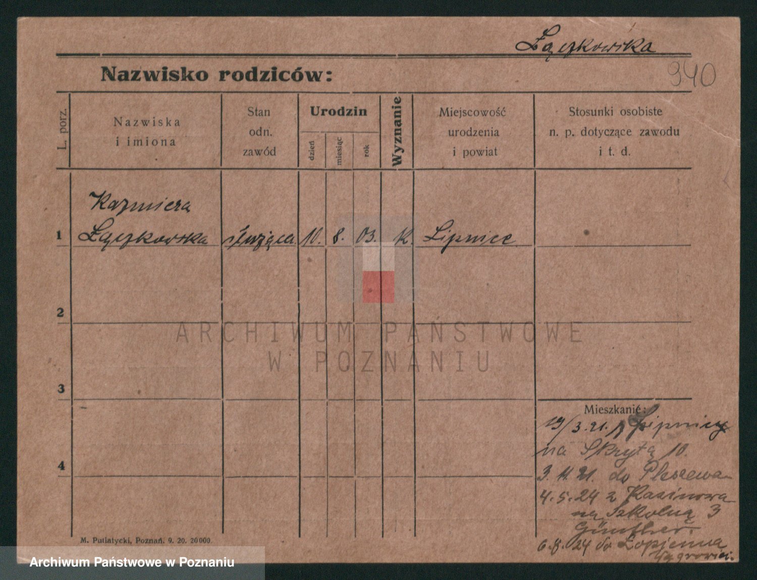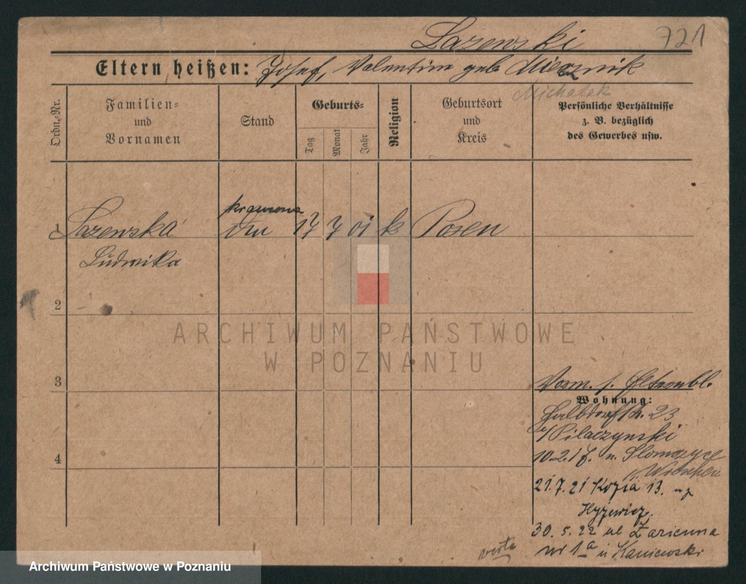 Podgląd karty osobowej dostępny jest po kliknięciu na nazwisko lub ikonkę karty. Można dokonywać powiększenia (ikony na górze) lub przechodzić między kolejnymi skanami (strzałki po bokach).