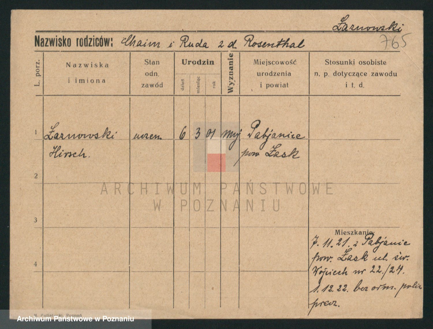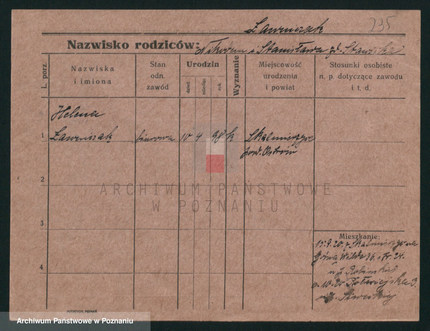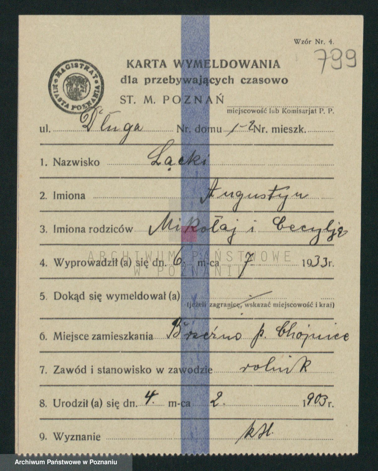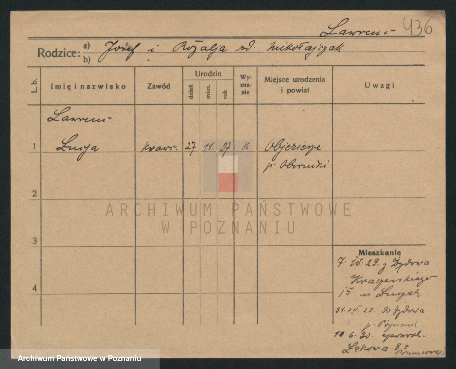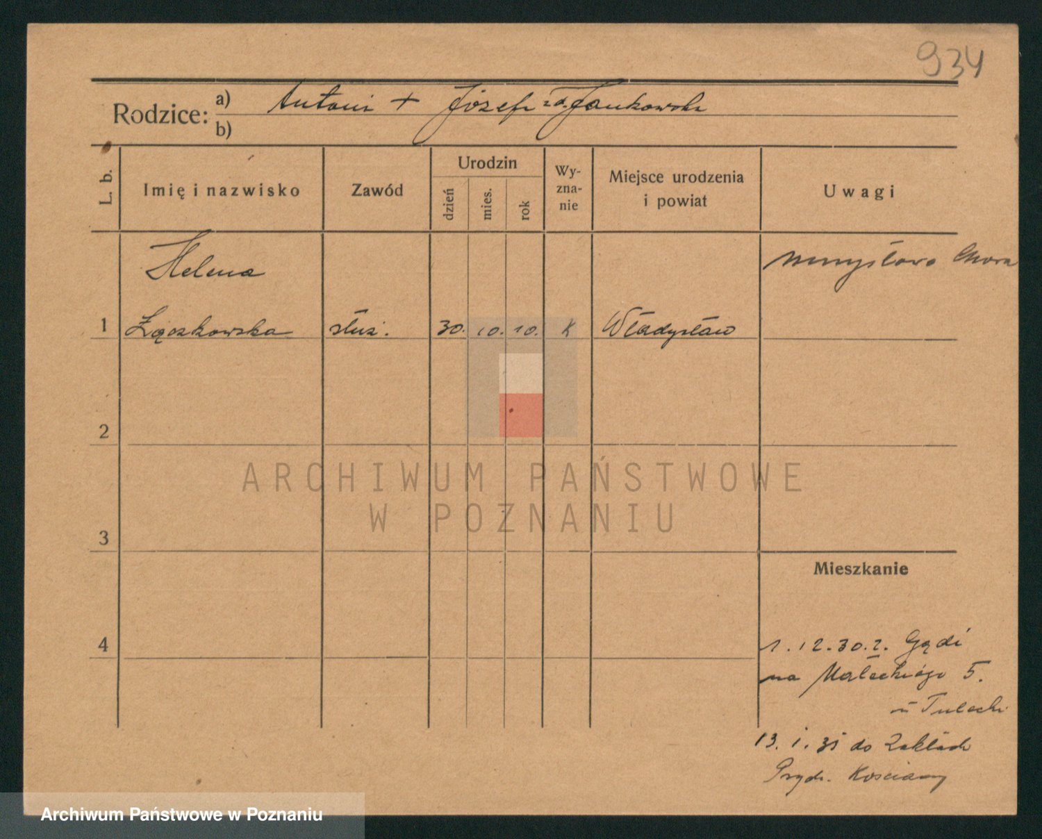 Podgląd karty osobowej dostępny jest po kliknięciu na nazwisko lub ikonkę karty. Można dokonywać powiększenia (ikony na górze) lub przechodzić między kolejnymi skanami (strzałki po bokach).