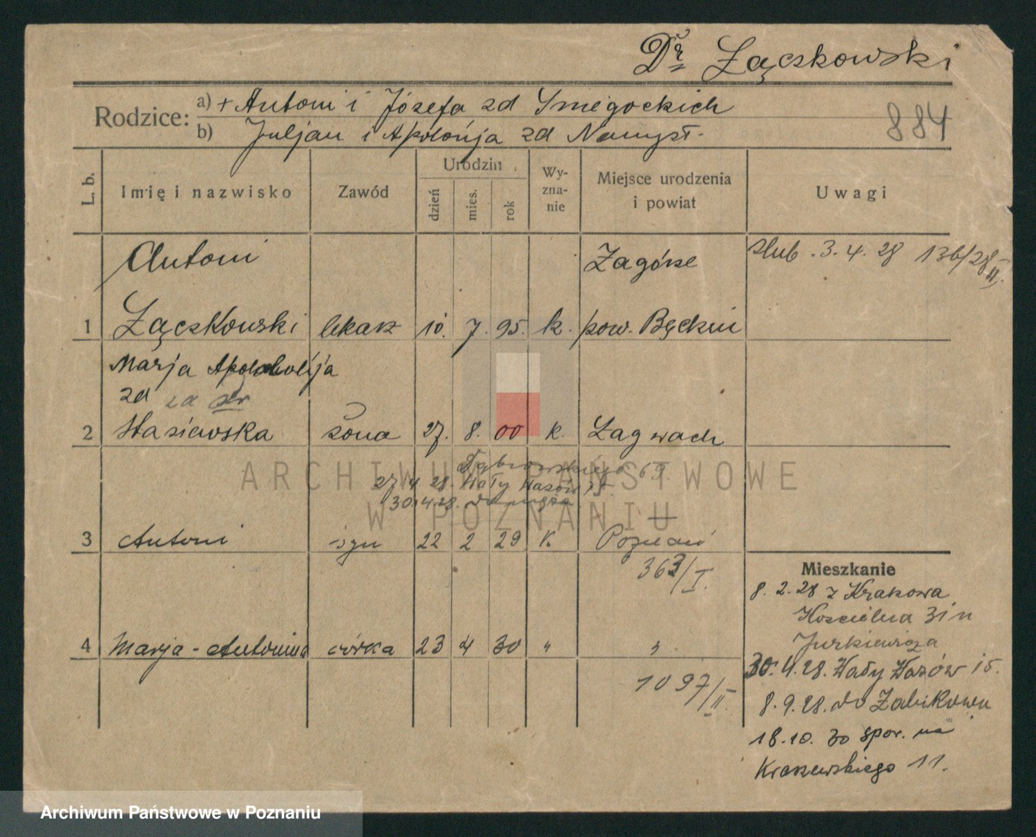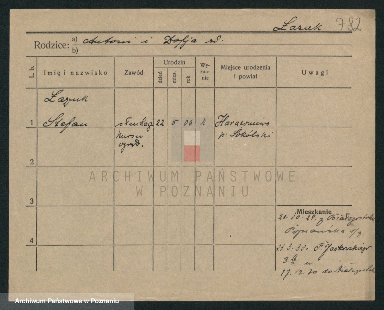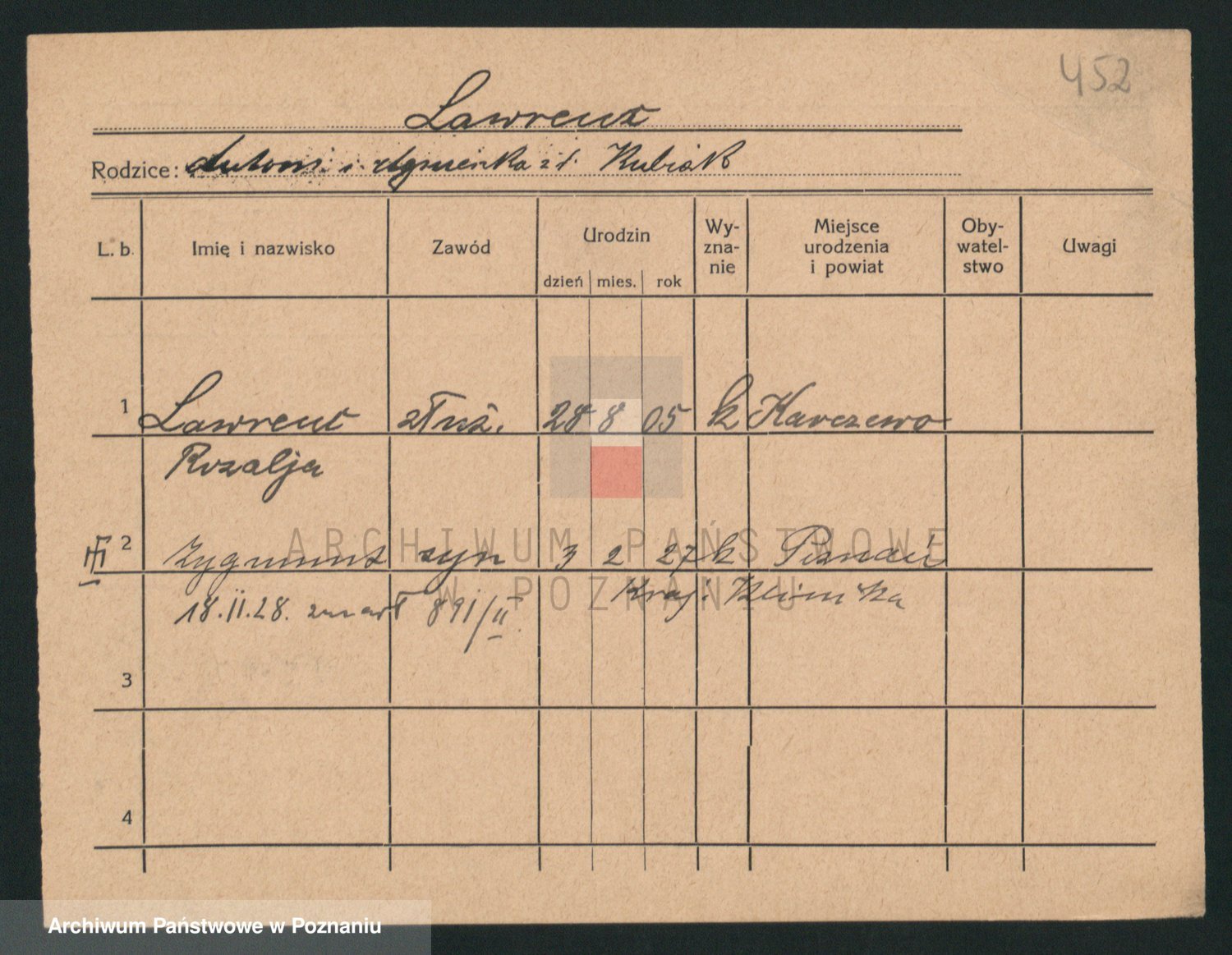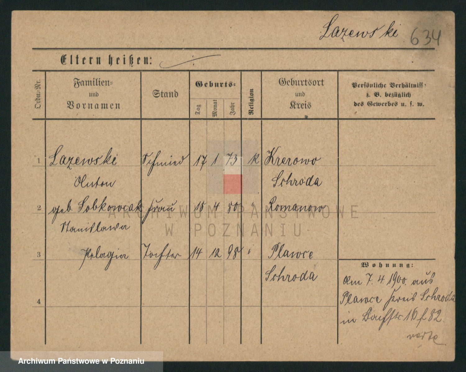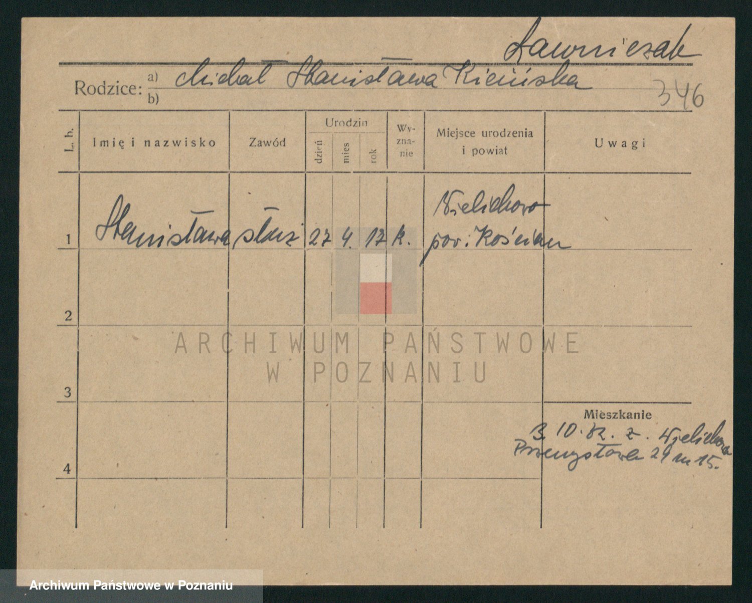 Podgląd karty osobowej dostępny jest po kliknięciu na nazwisko lub ikonkę karty. Można dokonywać powiększenia (ikony na górze) lub przechodzić między kolejnymi skanami (strzałki po bokach).