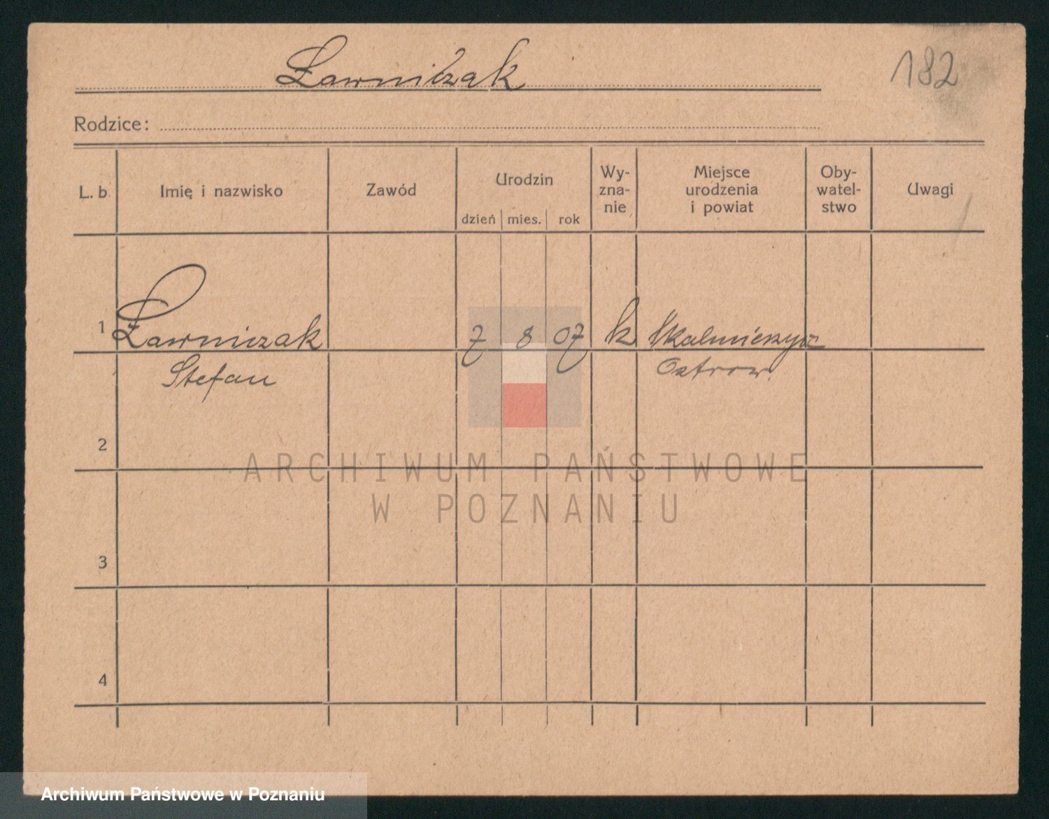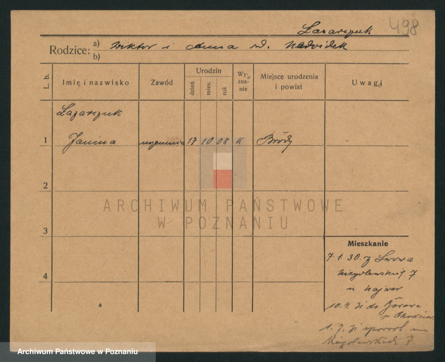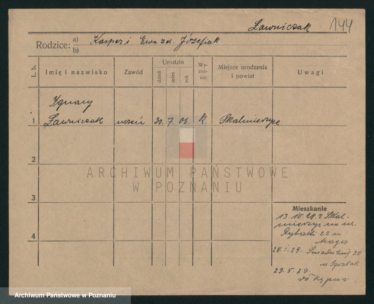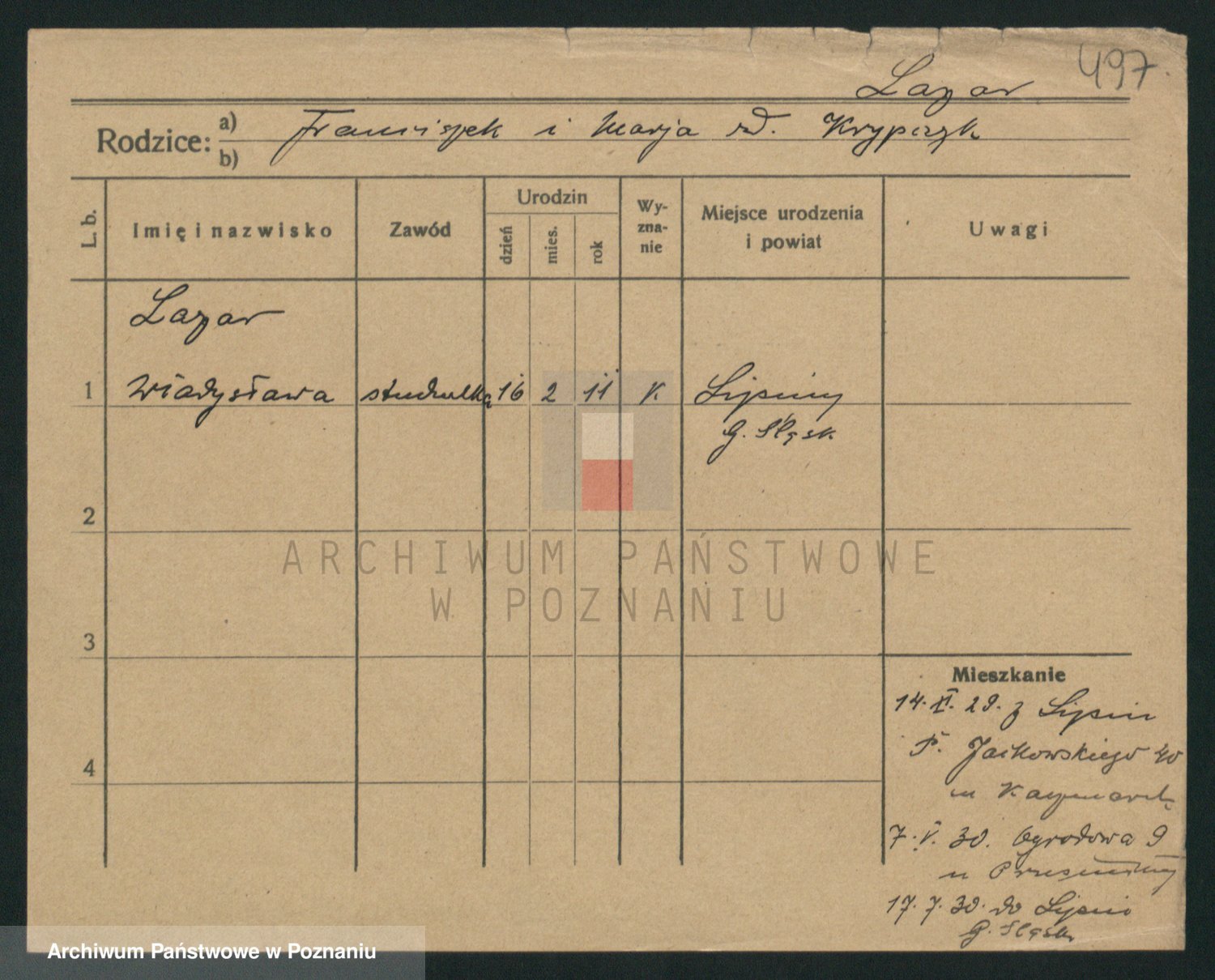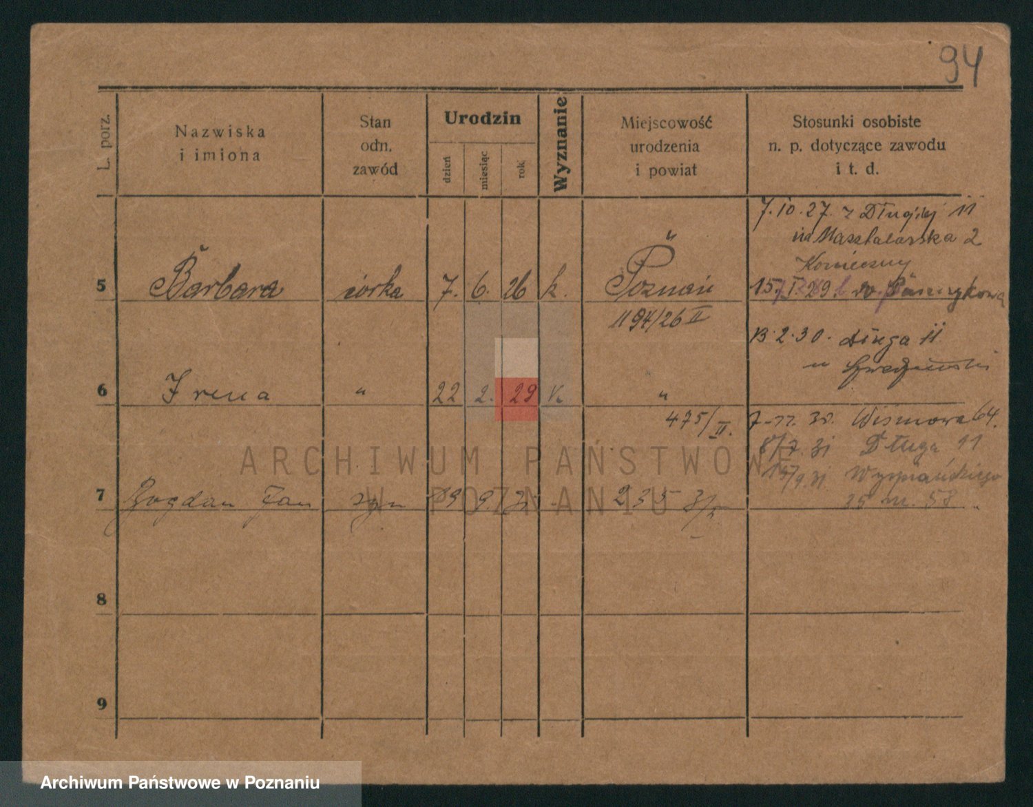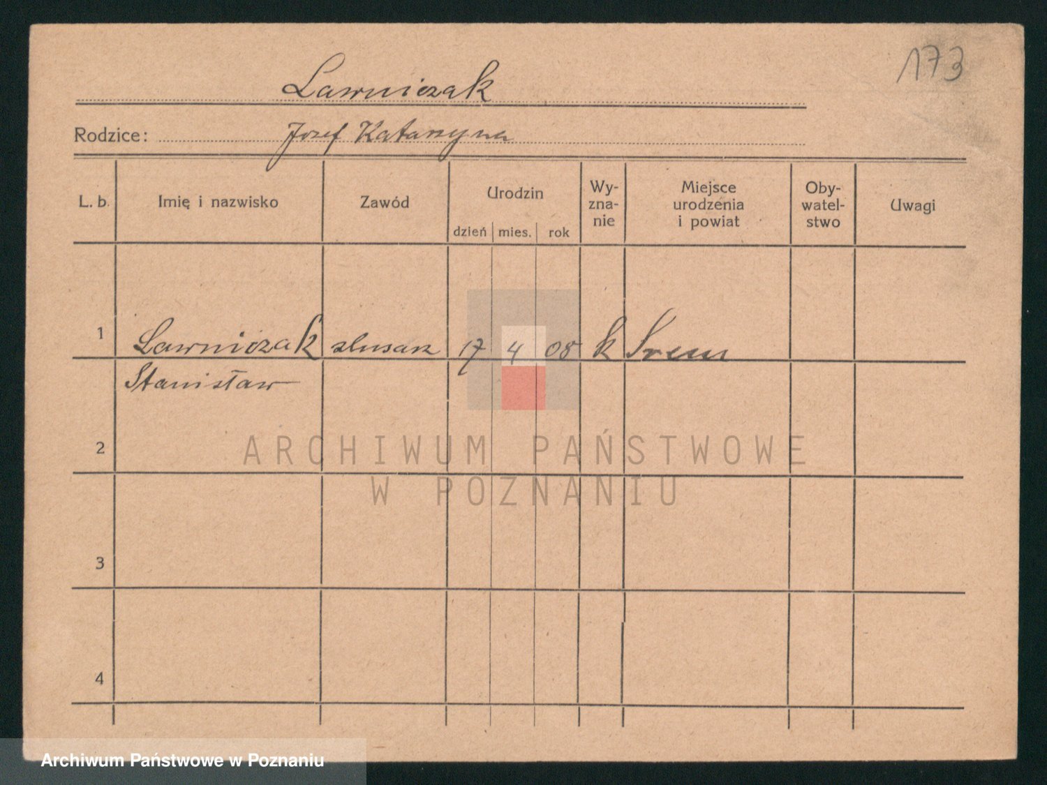 Podgląd karty osobowej dostępny jest po kliknięciu na nazwisko lub ikonkę karty. Można dokonywać powiększenia (ikony na górze) lub przechodzić między kolejnymi skanami (strzałki po bokach).