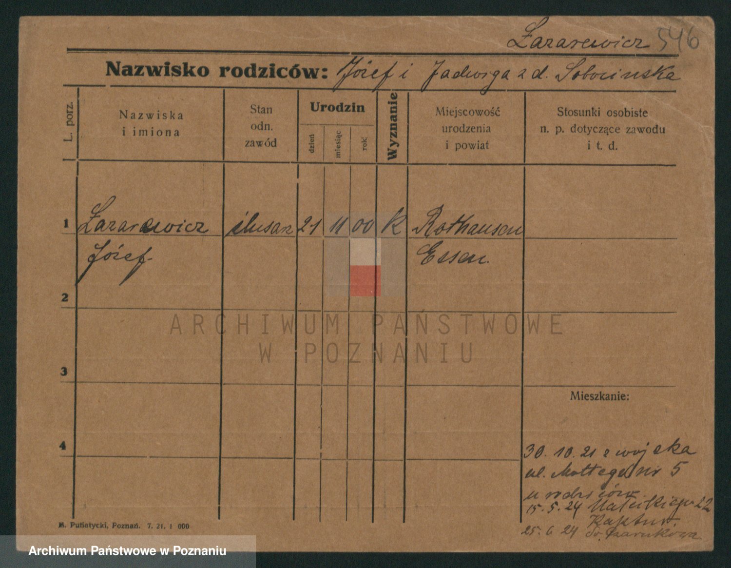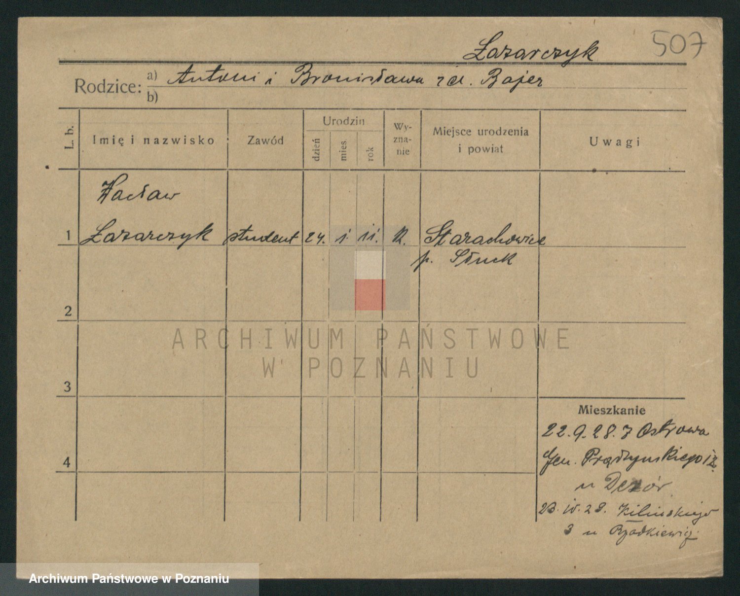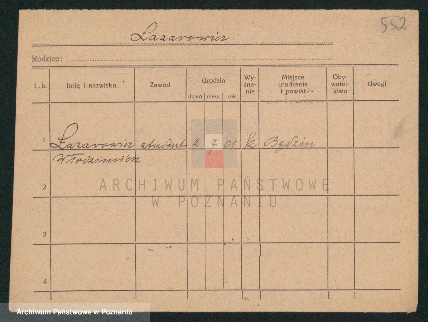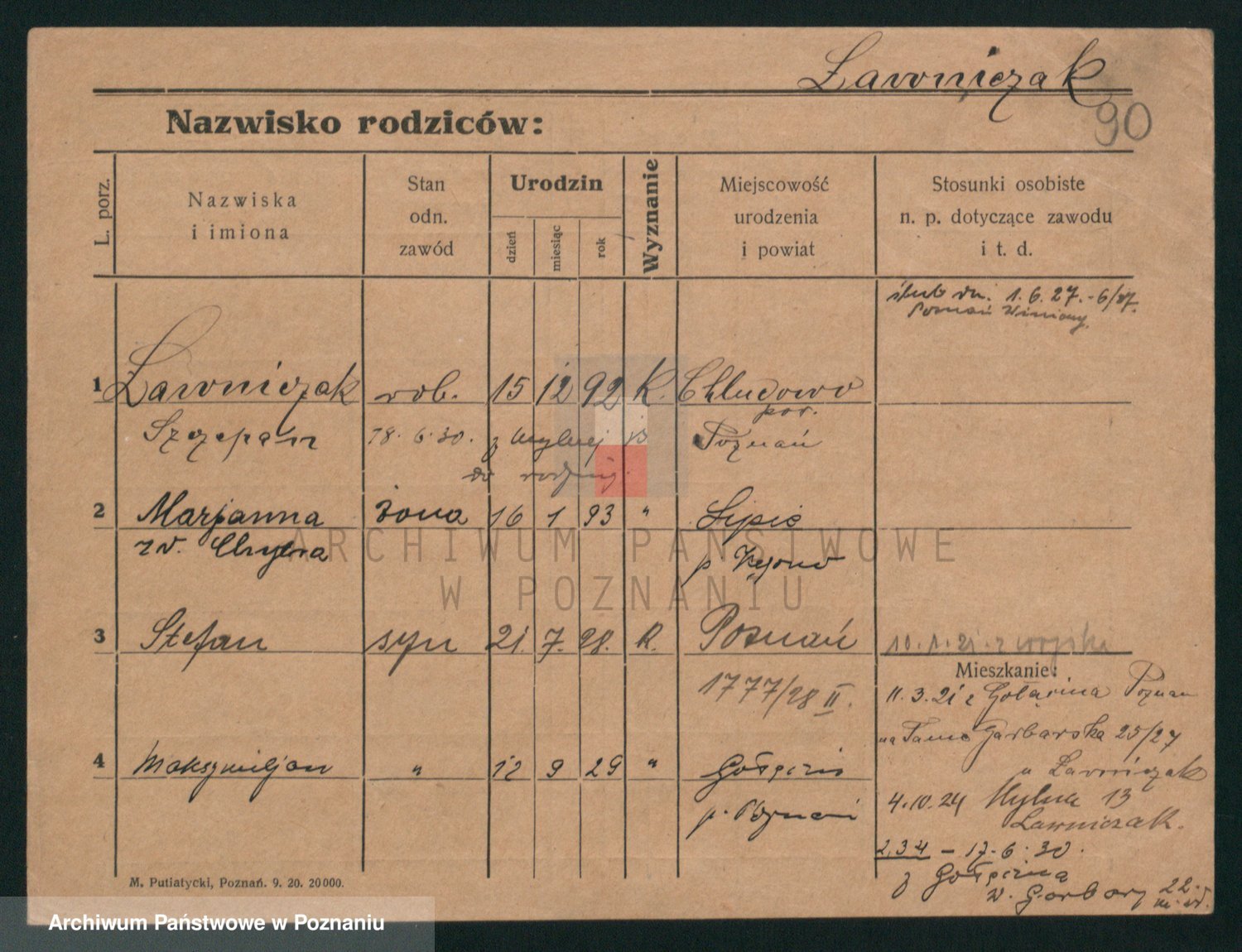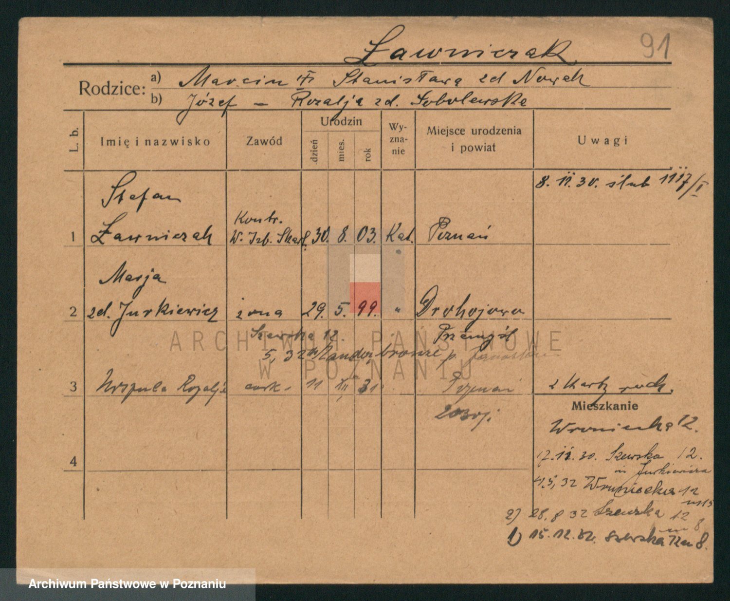 Podgląd karty osobowej dostępny jest po kliknięciu na nazwisko lub ikonkę karty. Można dokonywać powiększenia (ikony na górze) lub przechodzić między kolejnymi skanami (strzałki po bokach).