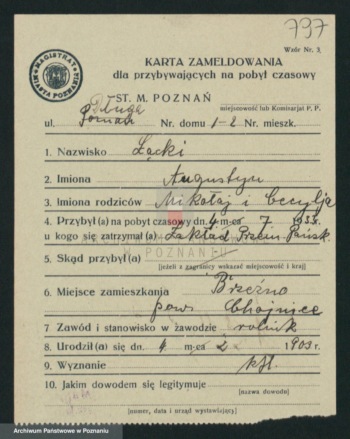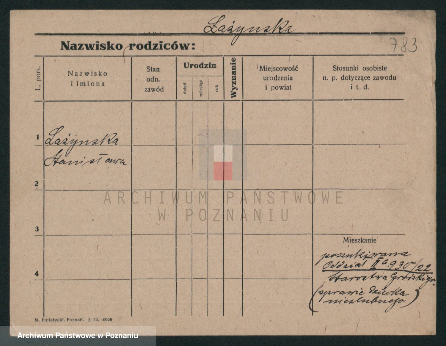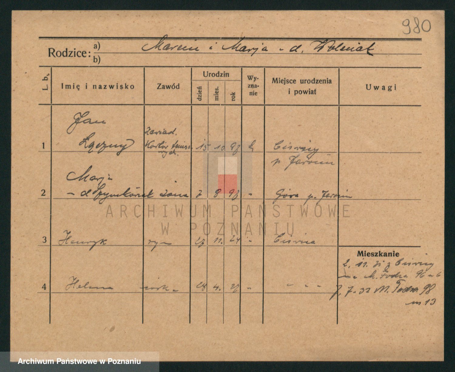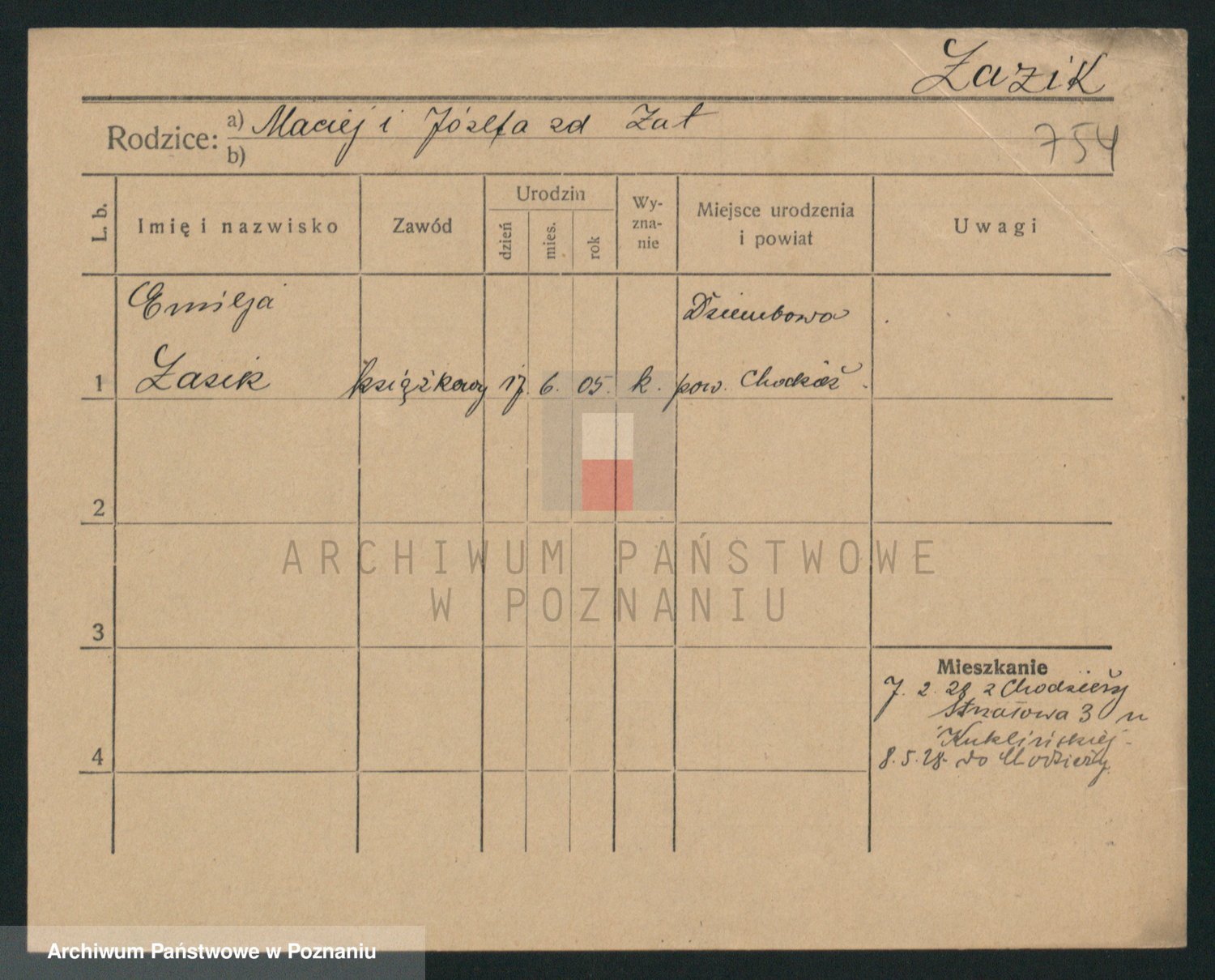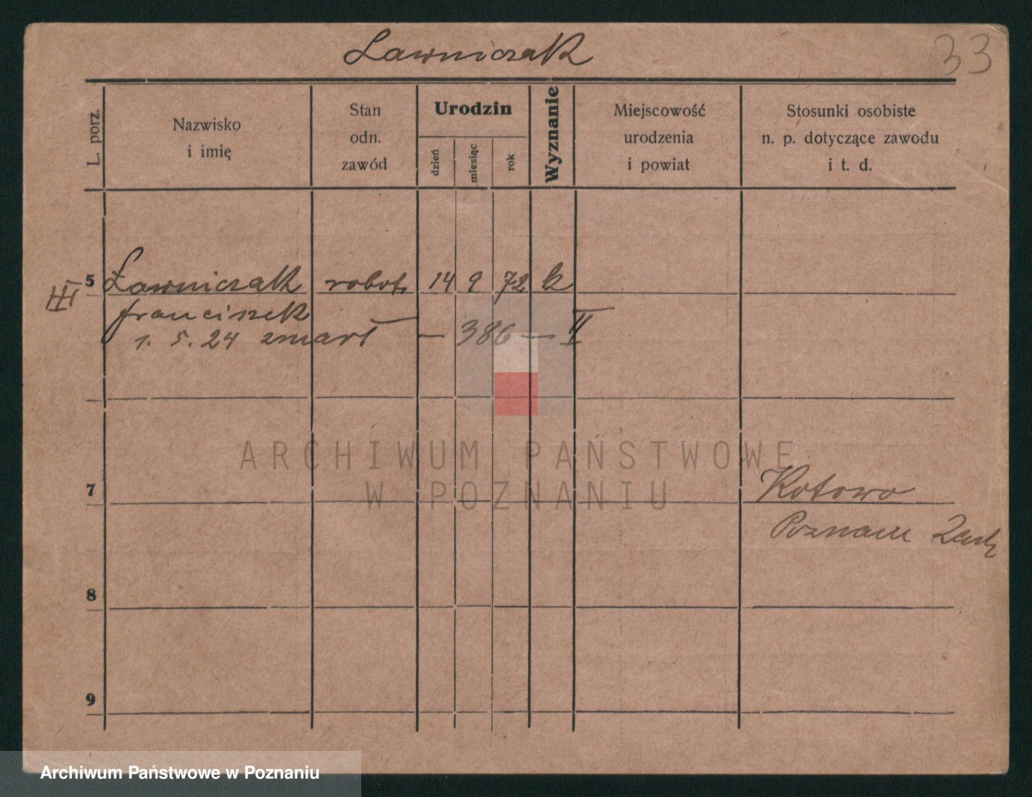 Podgląd karty osobowej dostępny jest po kliknięciu na nazwisko lub ikonkę karty. Można dokonywać powiększenia (ikony na górze) lub przechodzić między kolejnymi skanami (strzałki po bokach).