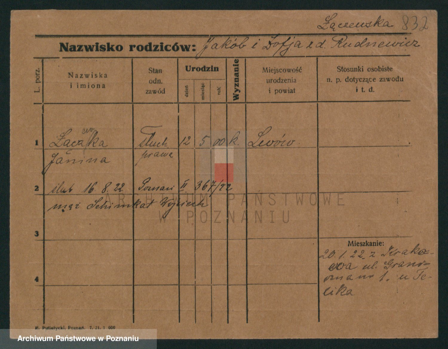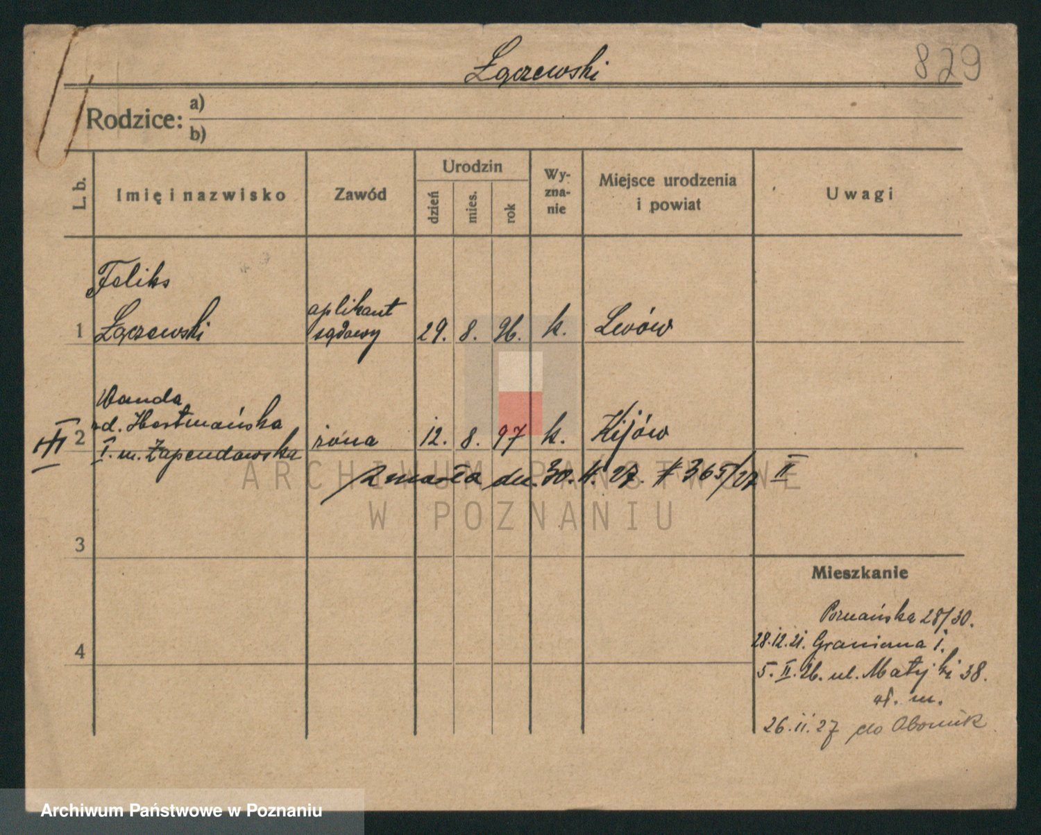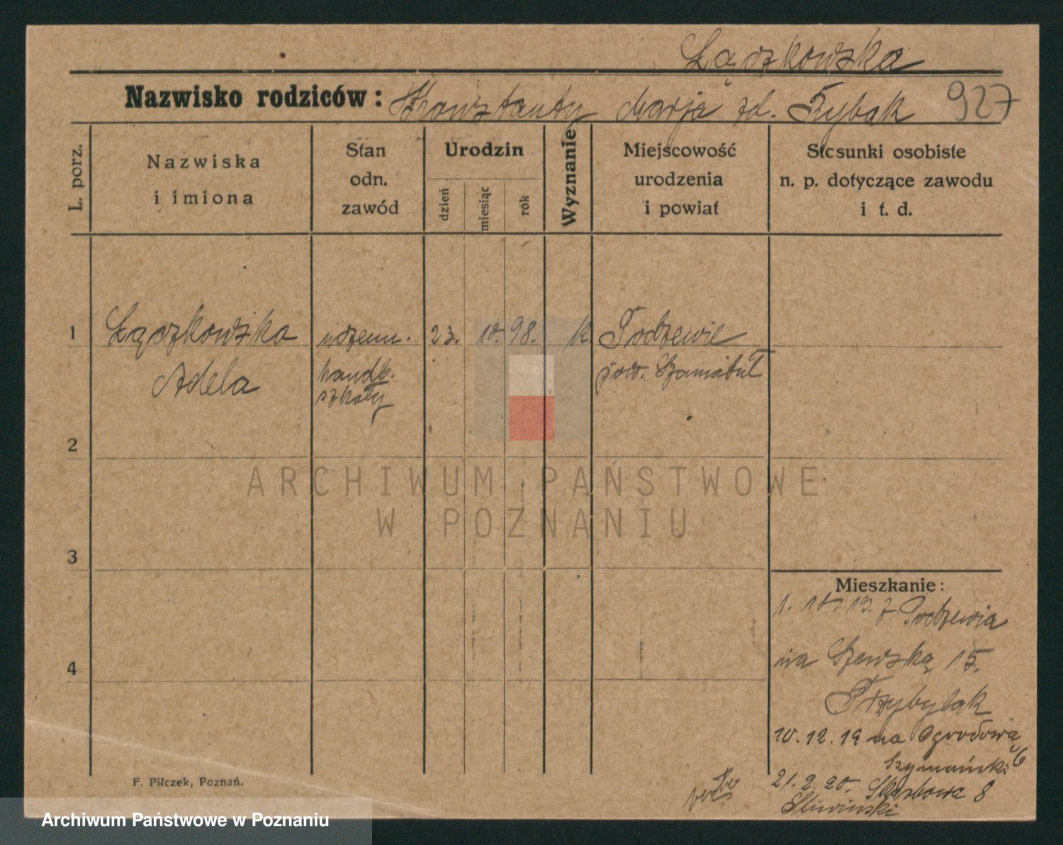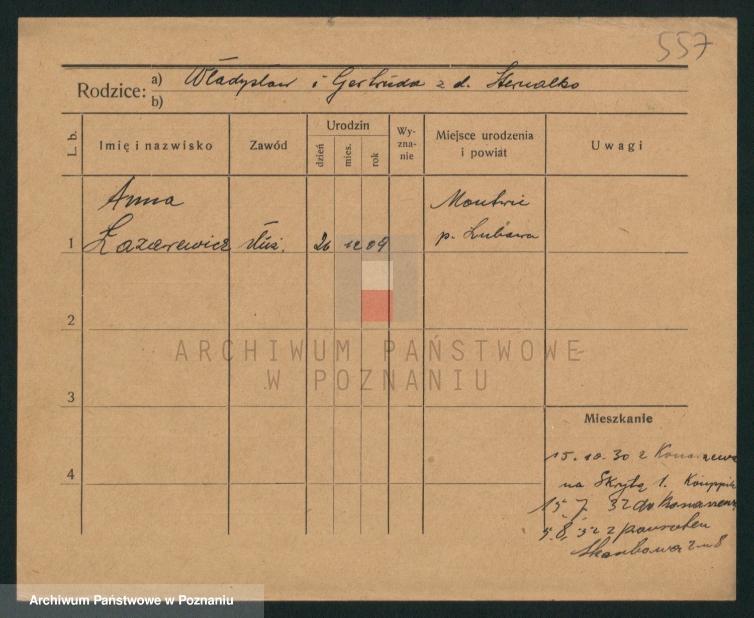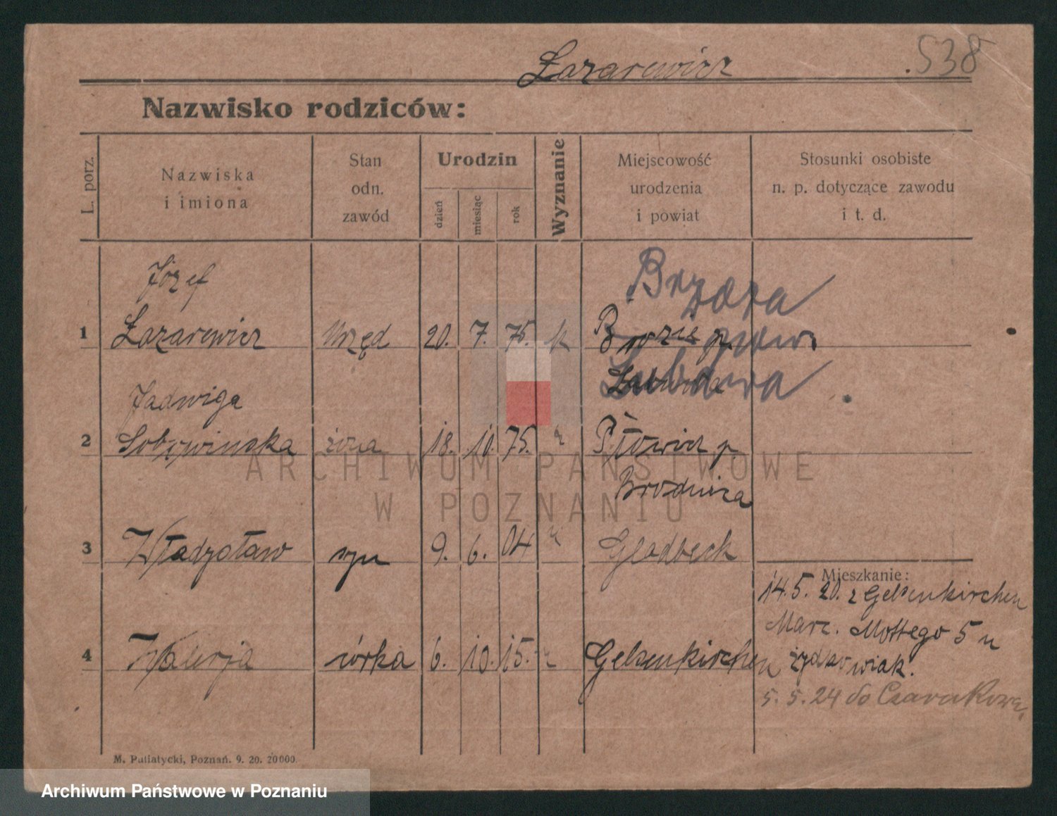 Podgląd karty osobowej dostępny jest po kliknięciu na nazwisko lub ikonkę karty. Można dokonywać powiększenia (ikony na górze) lub przechodzić między kolejnymi skanami (strzałki po bokach).