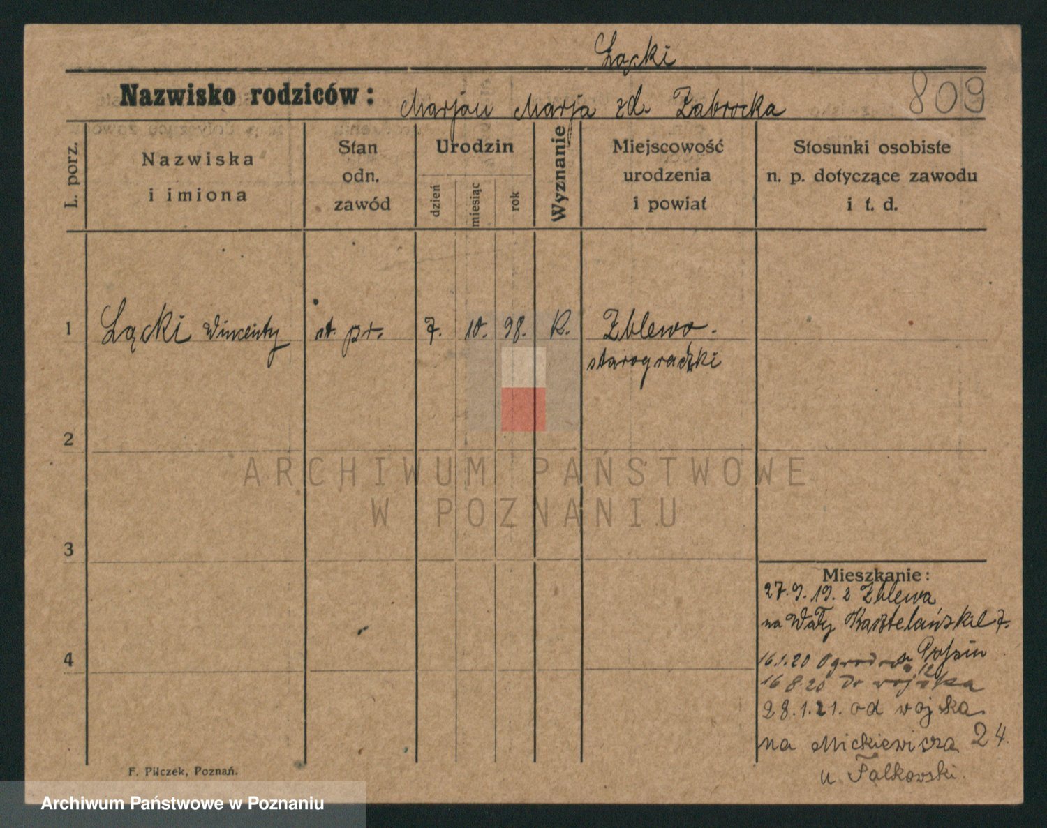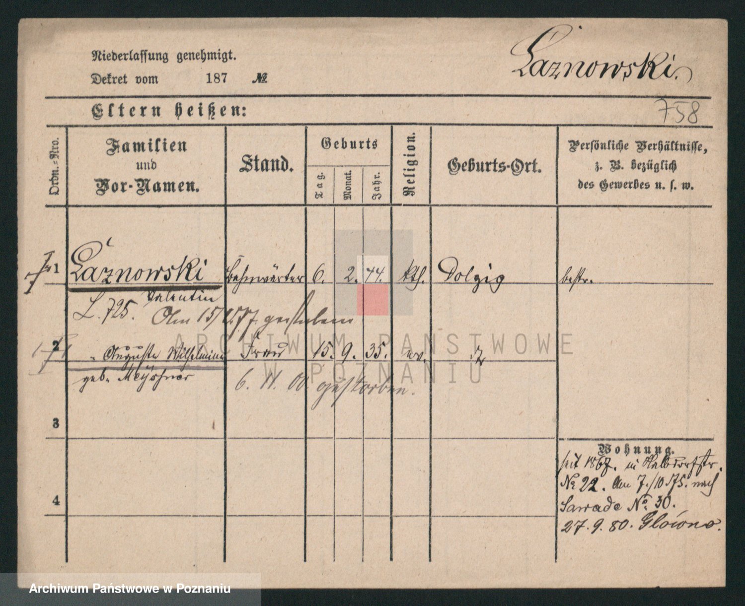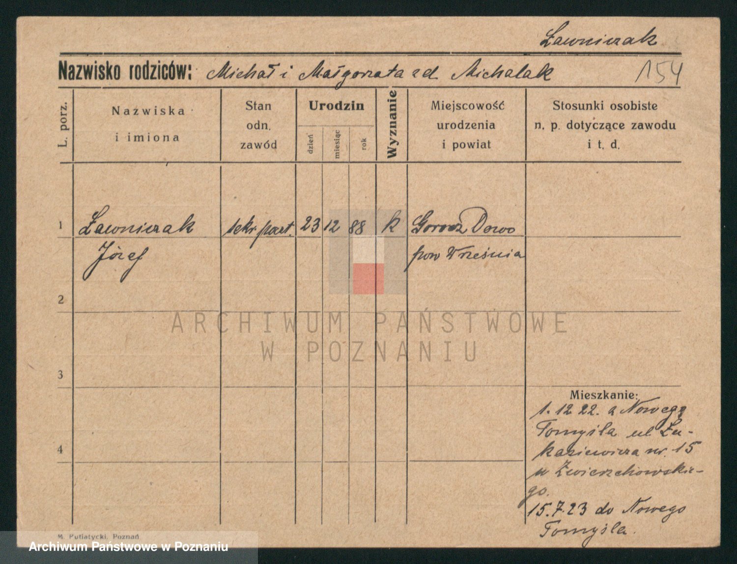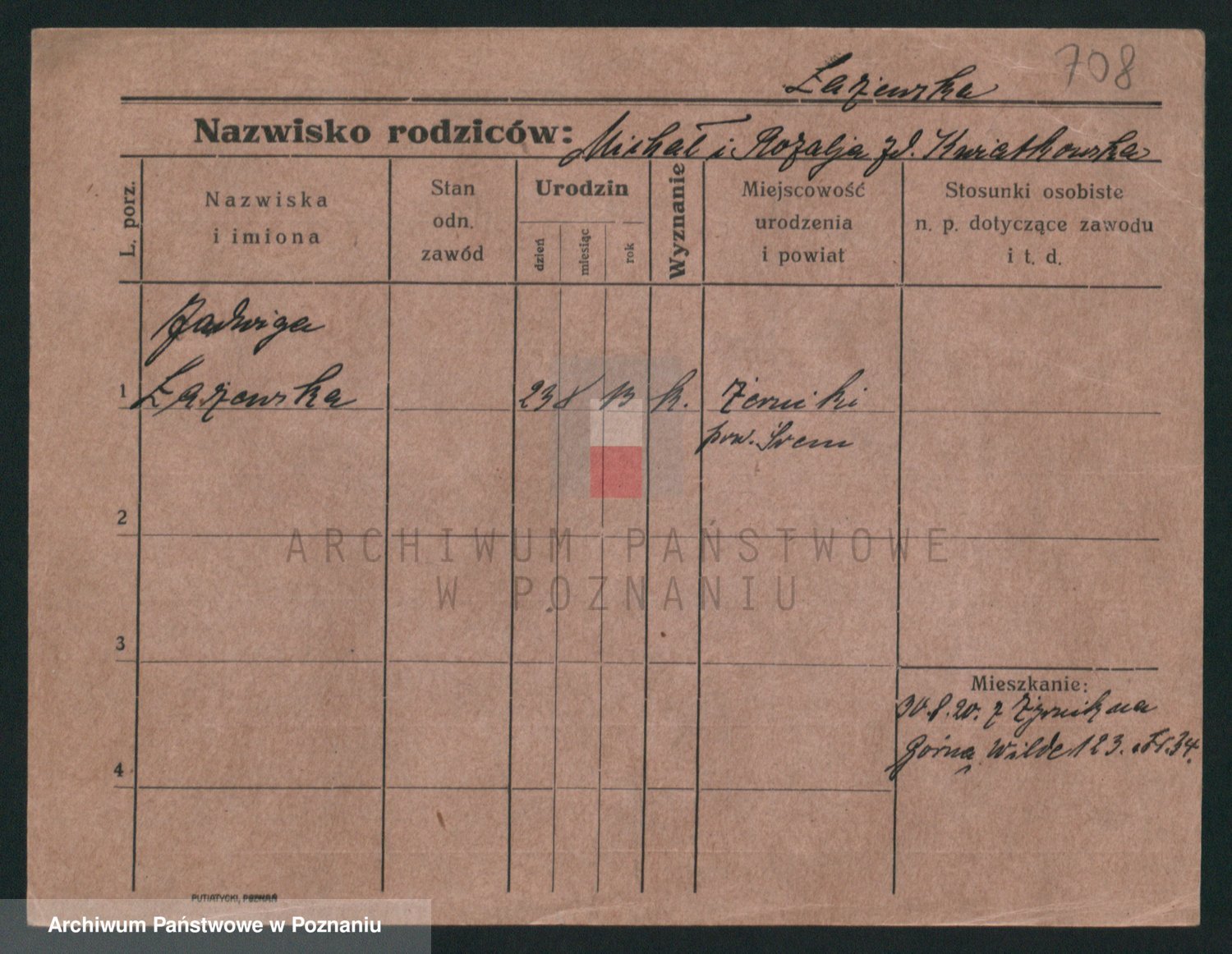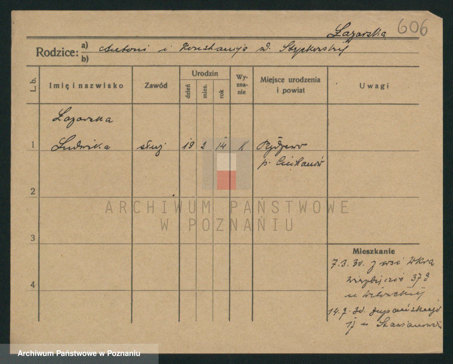 Podgląd karty osobowej dostępny jest po kliknięciu na nazwisko lub ikonkę karty. Można dokonywać powiększenia (ikony na górze) lub przechodzić między kolejnymi skanami (strzałki po bokach).