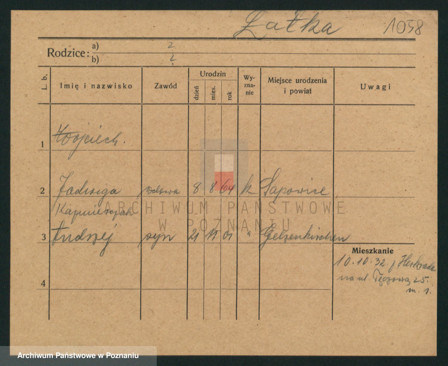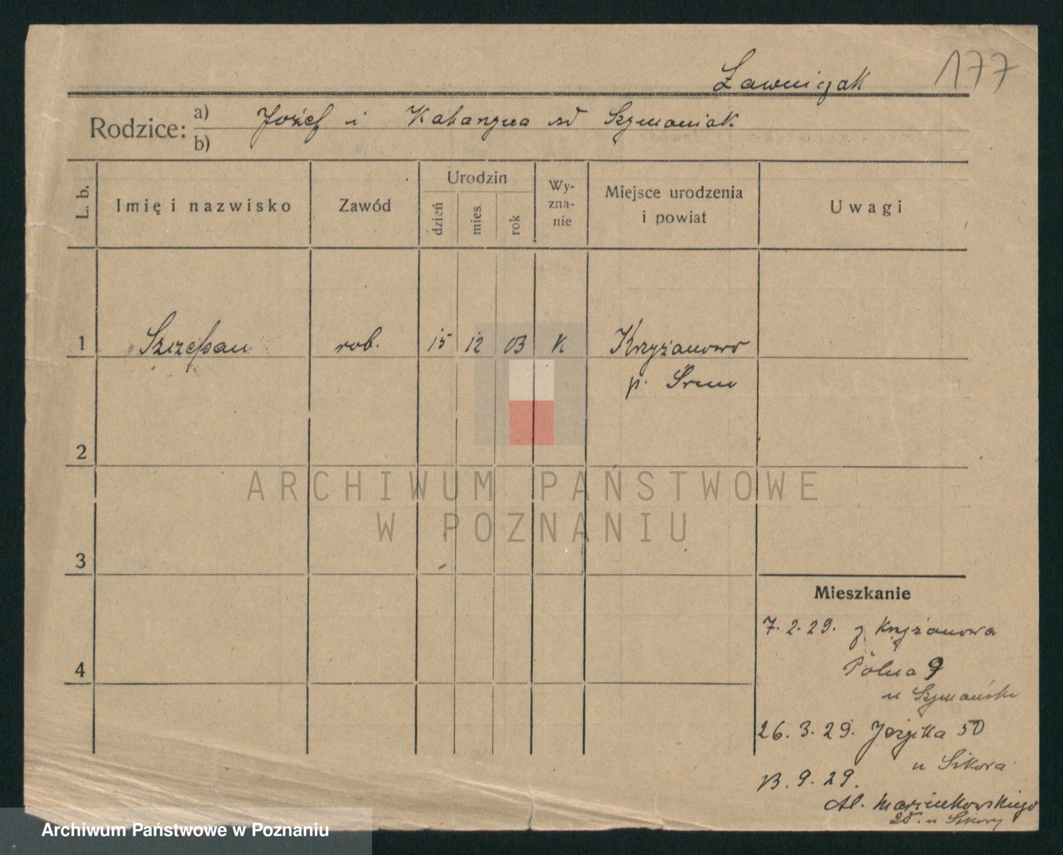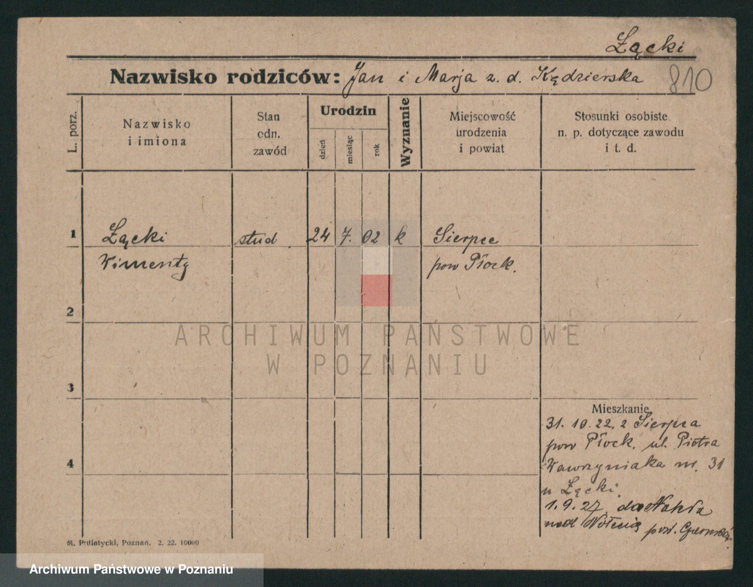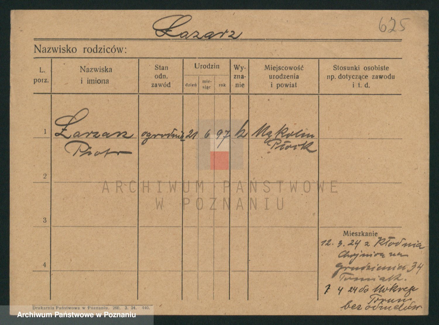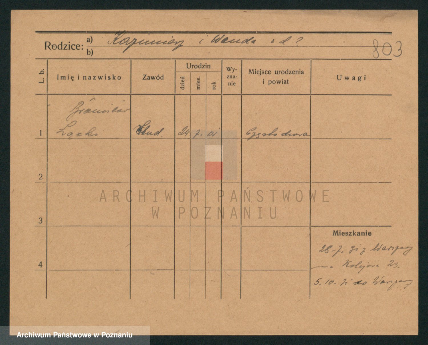 Podgląd karty osobowej dostępny jest po kliknięciu na nazwisko lub ikonkę karty. Można dokonywać powiększenia (ikony na górze) lub przechodzić między kolejnymi skanami (strzałki po bokach).