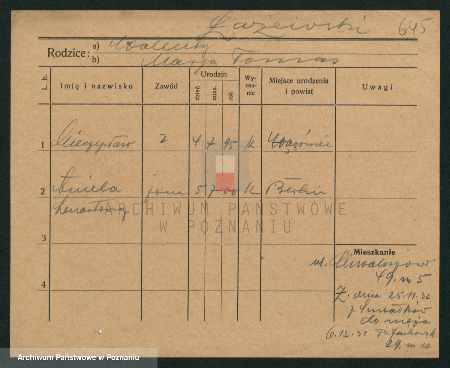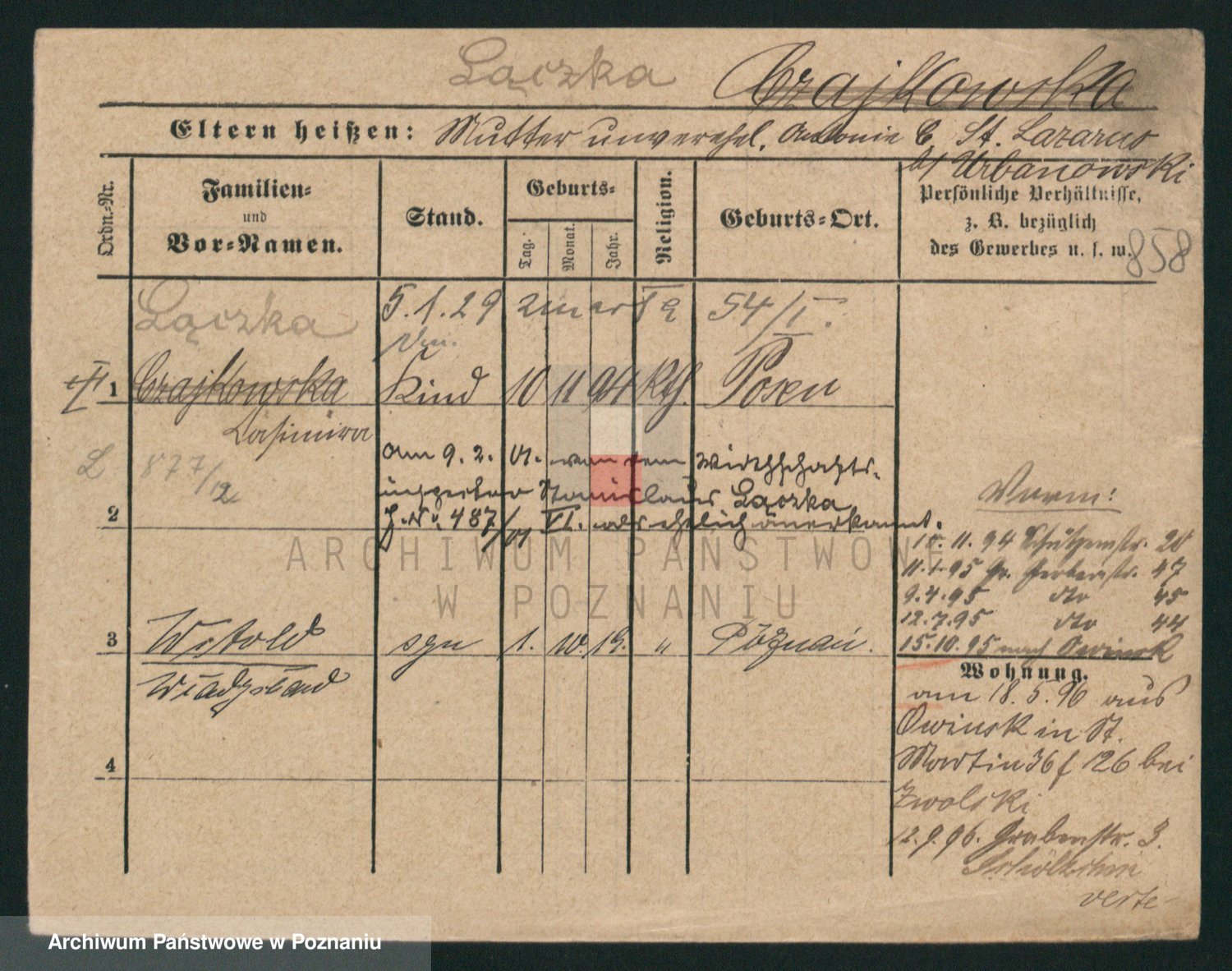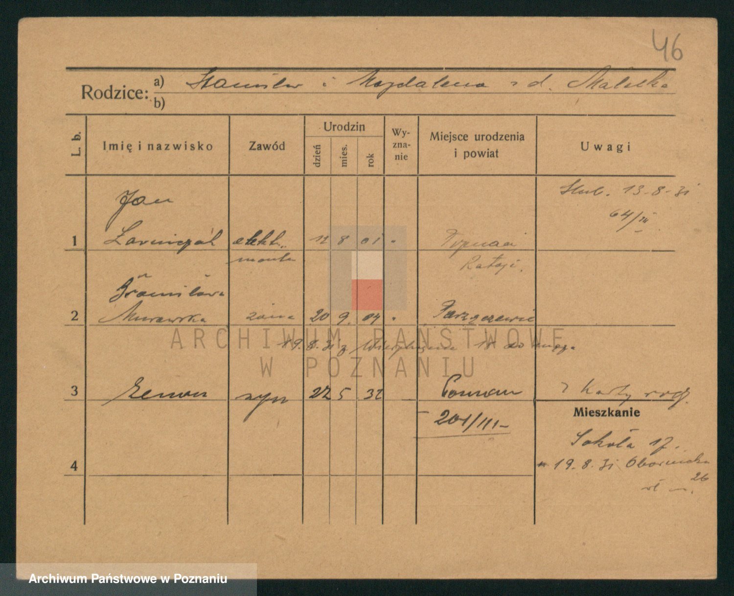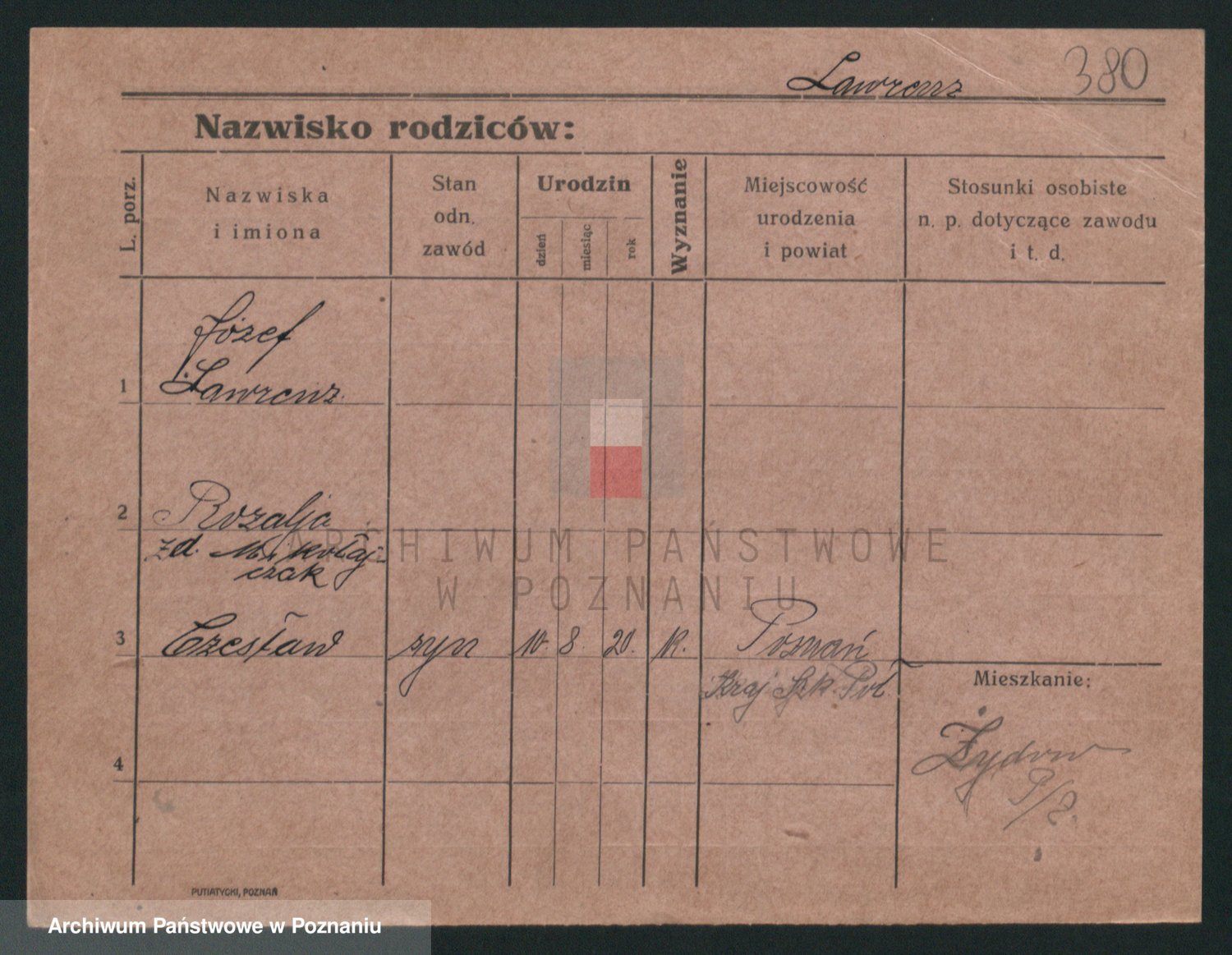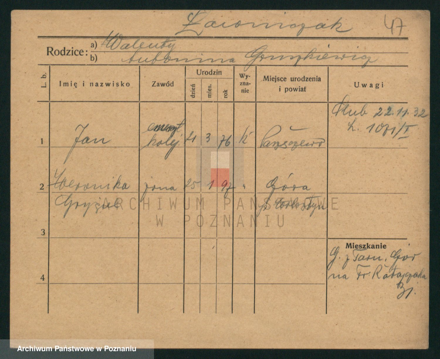 Podgląd karty osobowej dostępny jest po kliknięciu na nazwisko lub ikonkę karty. Można dokonywać powiększenia (ikony na górze) lub przechodzić między kolejnymi skanami (strzałki po bokach).