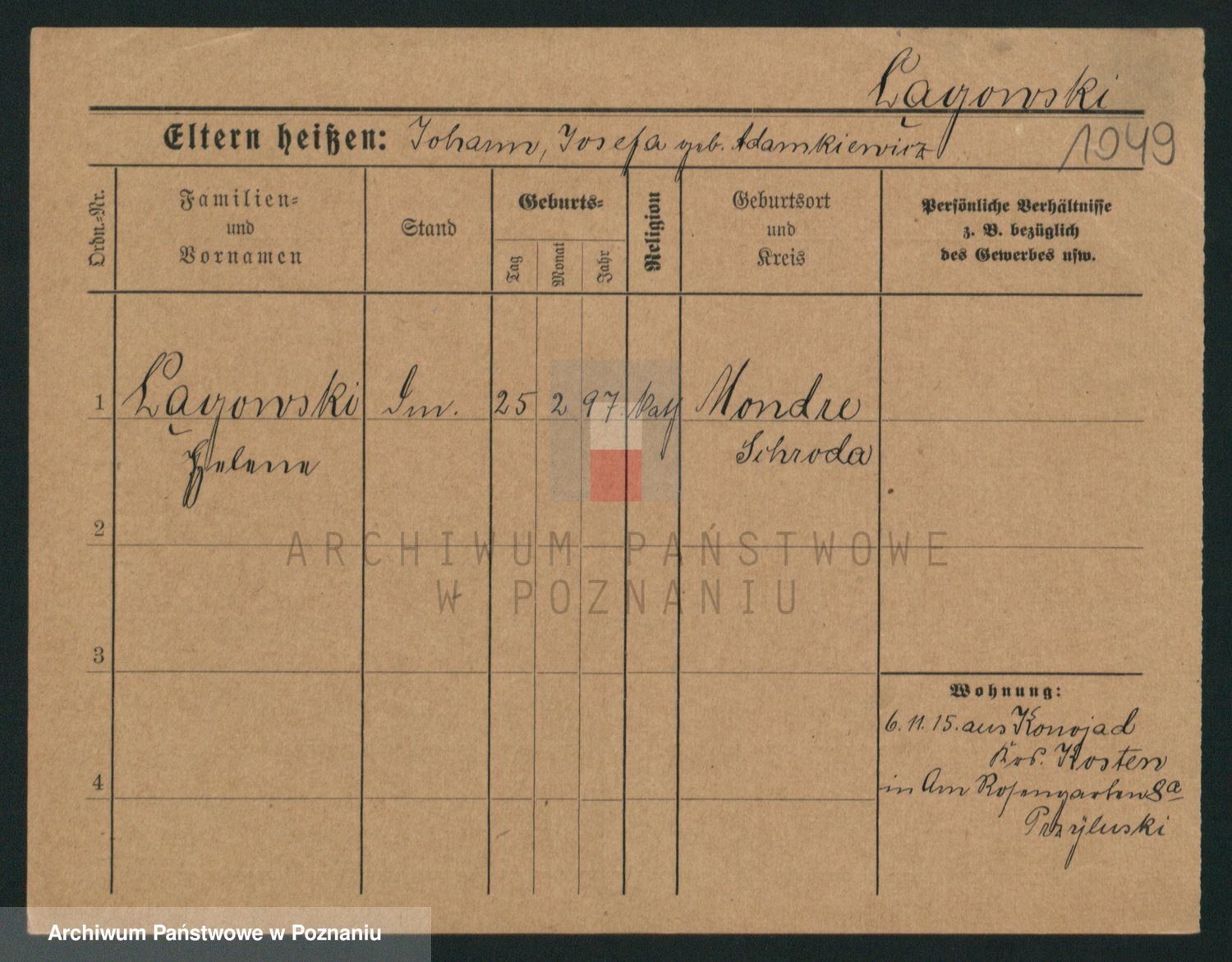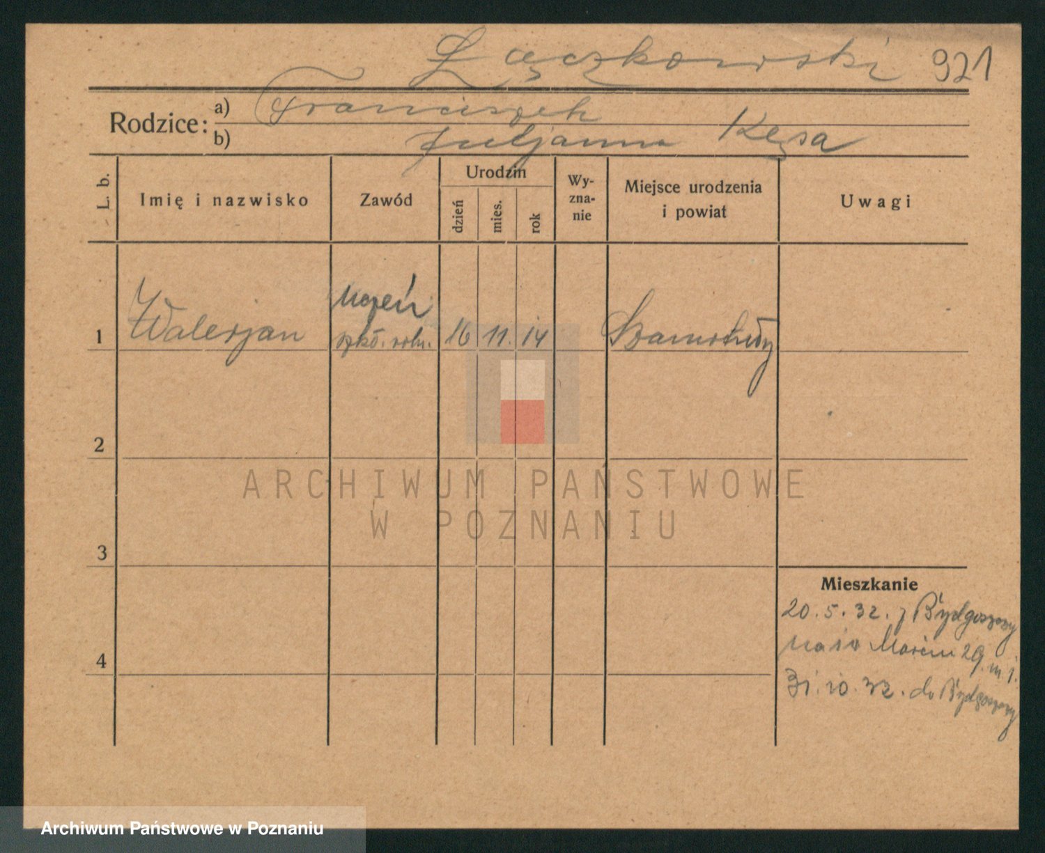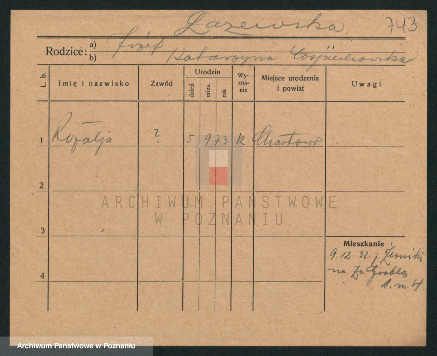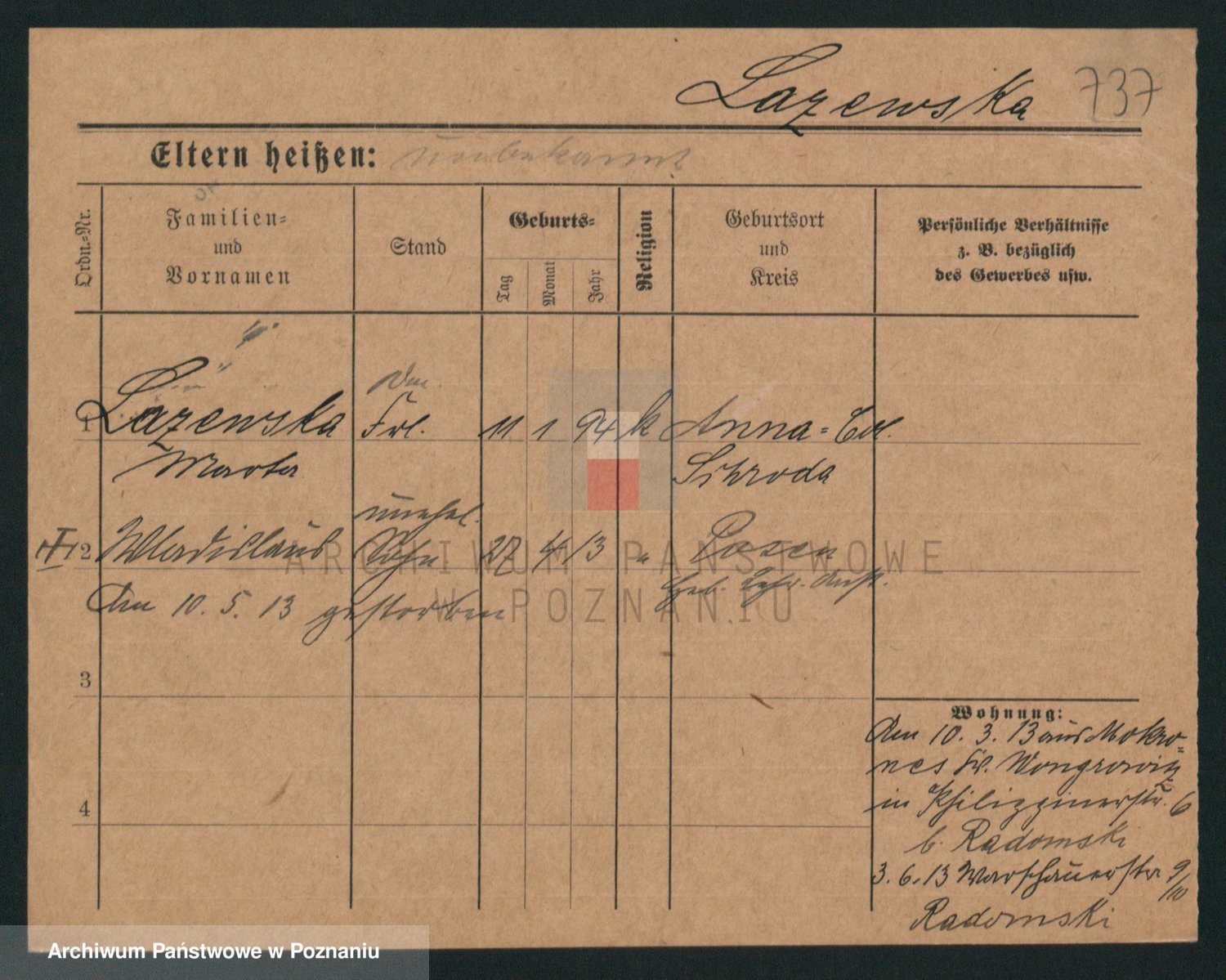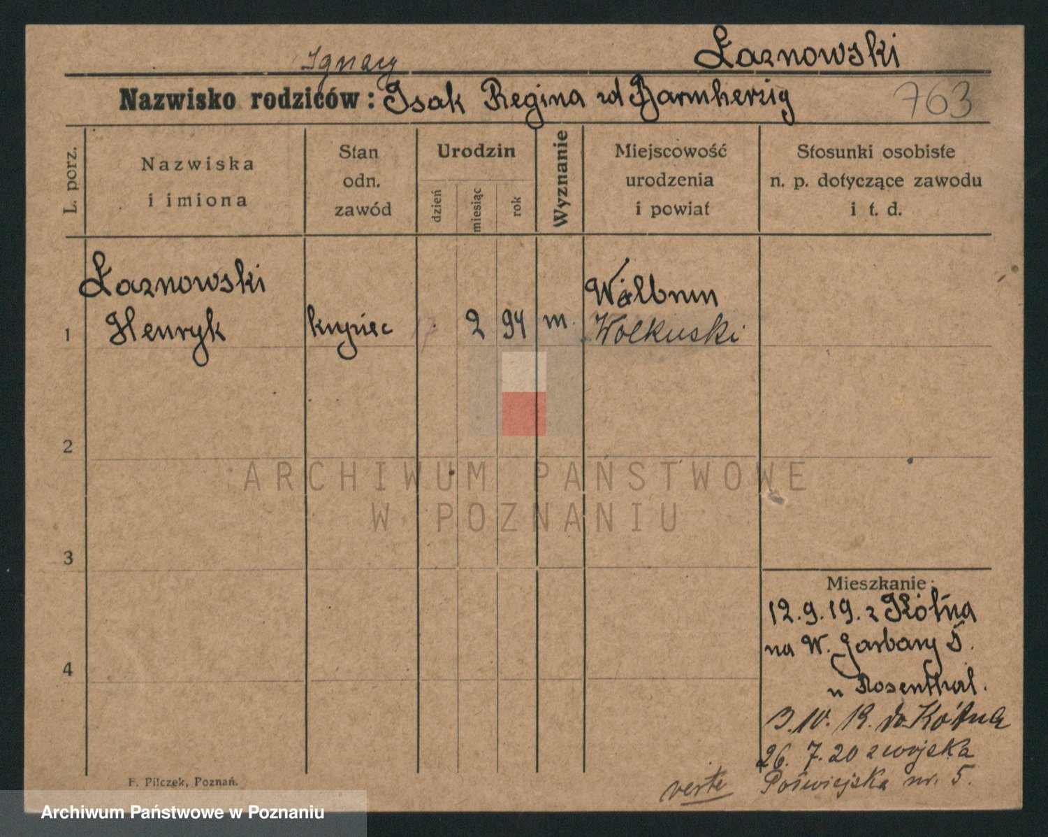 Podgląd karty osobowej dostępny jest po kliknięciu na nazwisko lub ikonkę karty. Można dokonywać powiększenia (ikony na górze) lub przechodzić między kolejnymi skanami (strzałki po bokach).