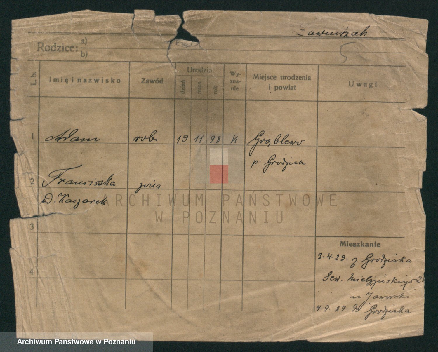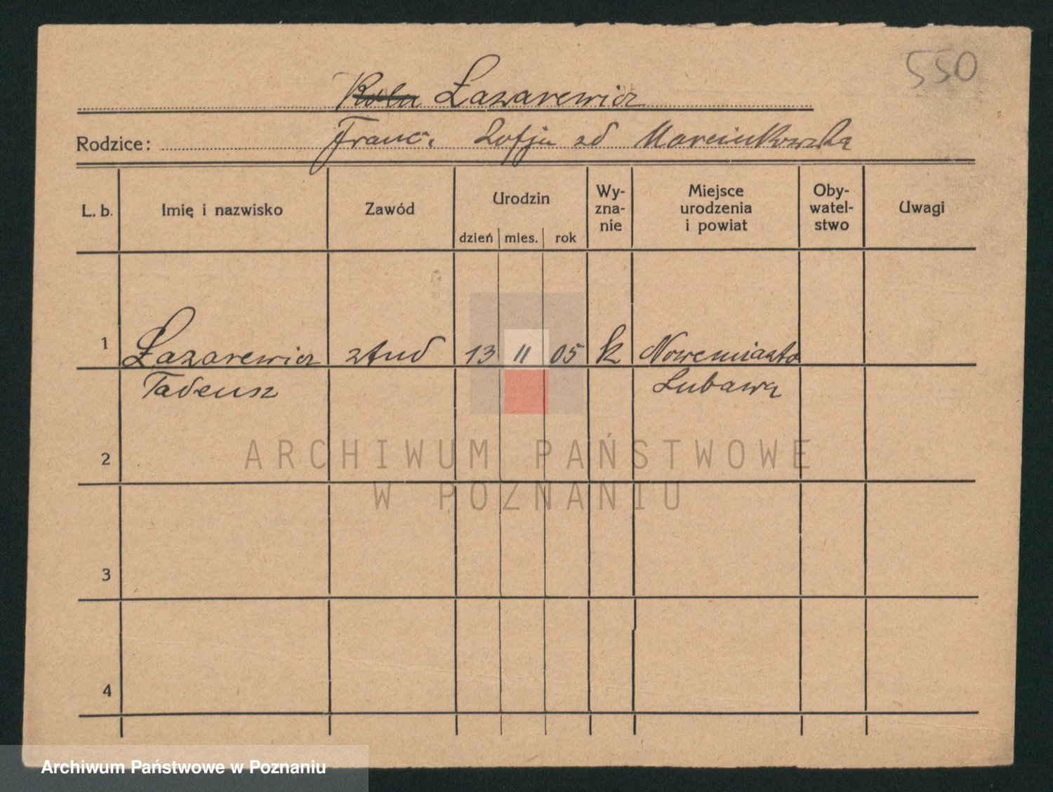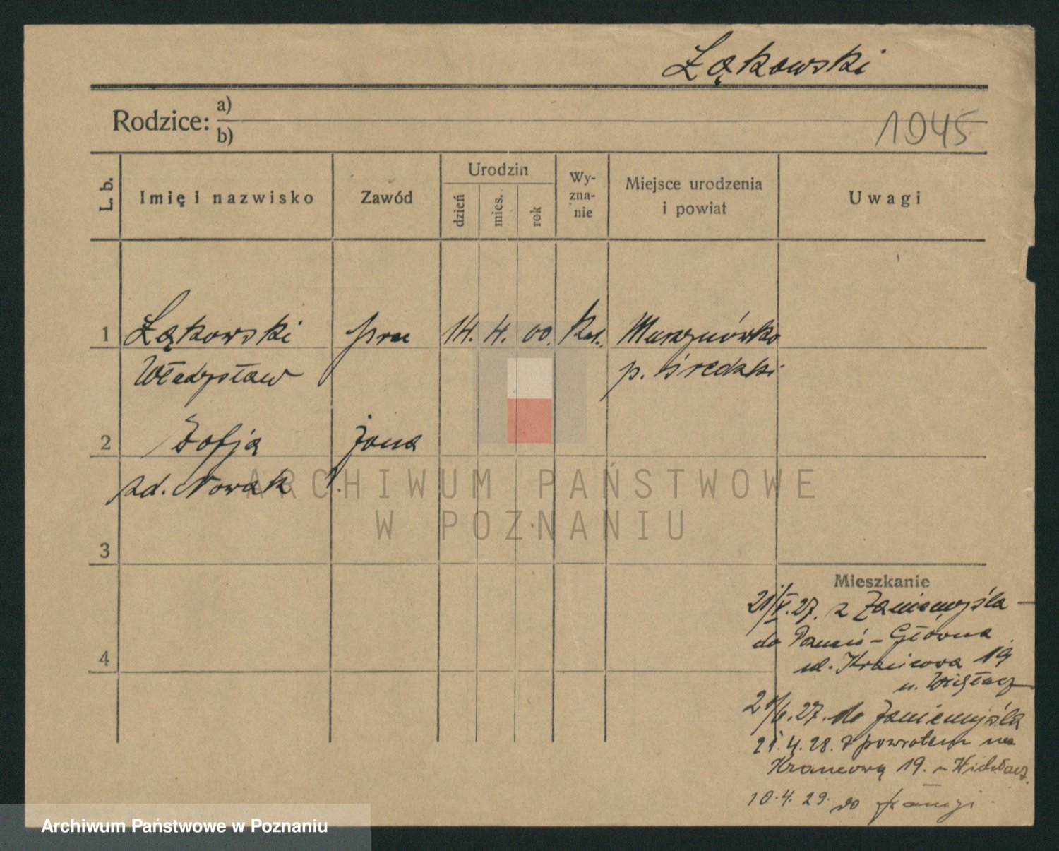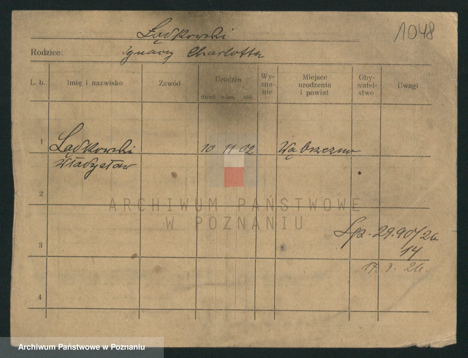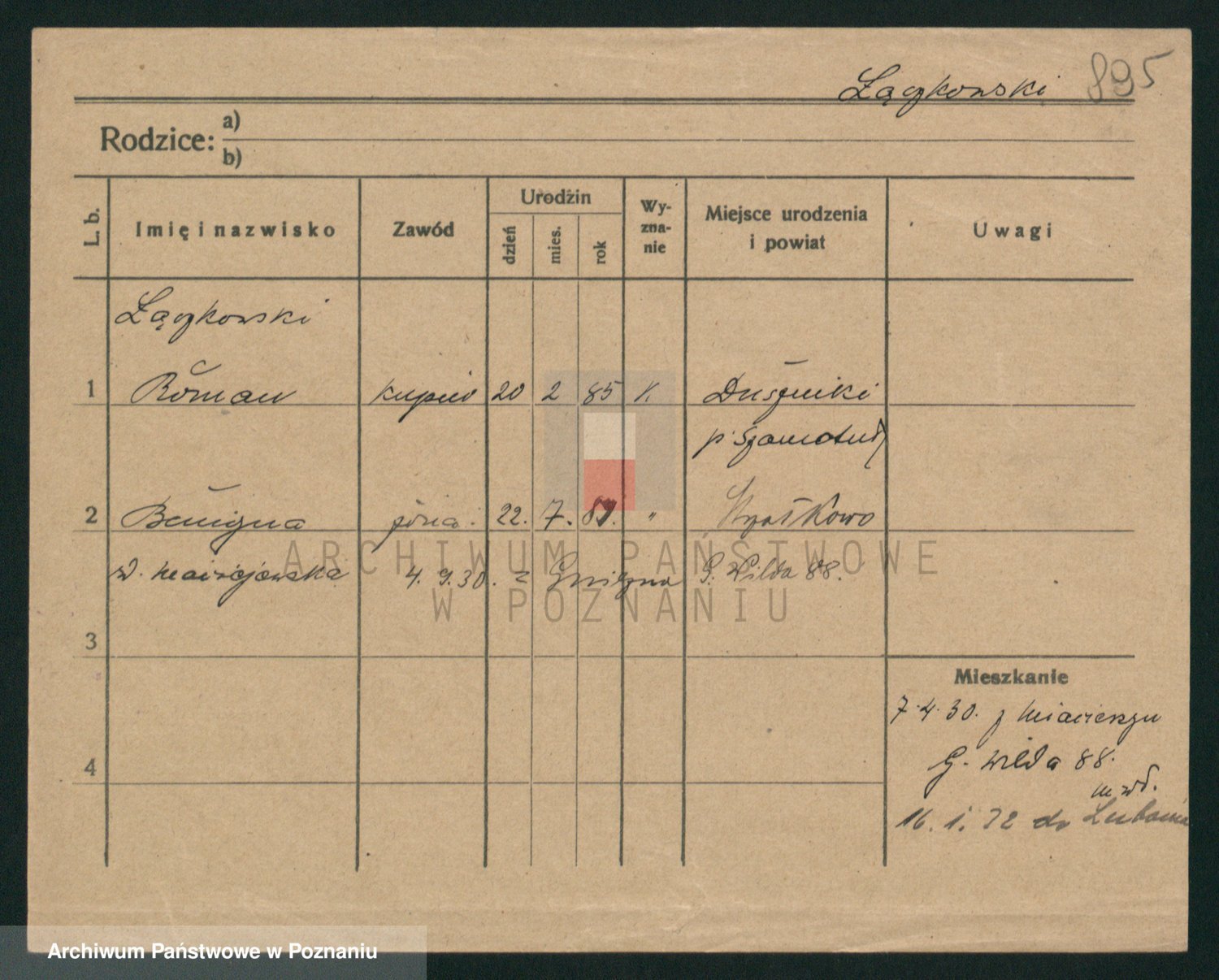 Podgląd karty osobowej dostępny jest po kliknięciu na nazwisko lub ikonkę karty. Można dokonywać powiększenia (ikony na górze) lub przechodzić między kolejnymi skanami (strzałki po bokach).