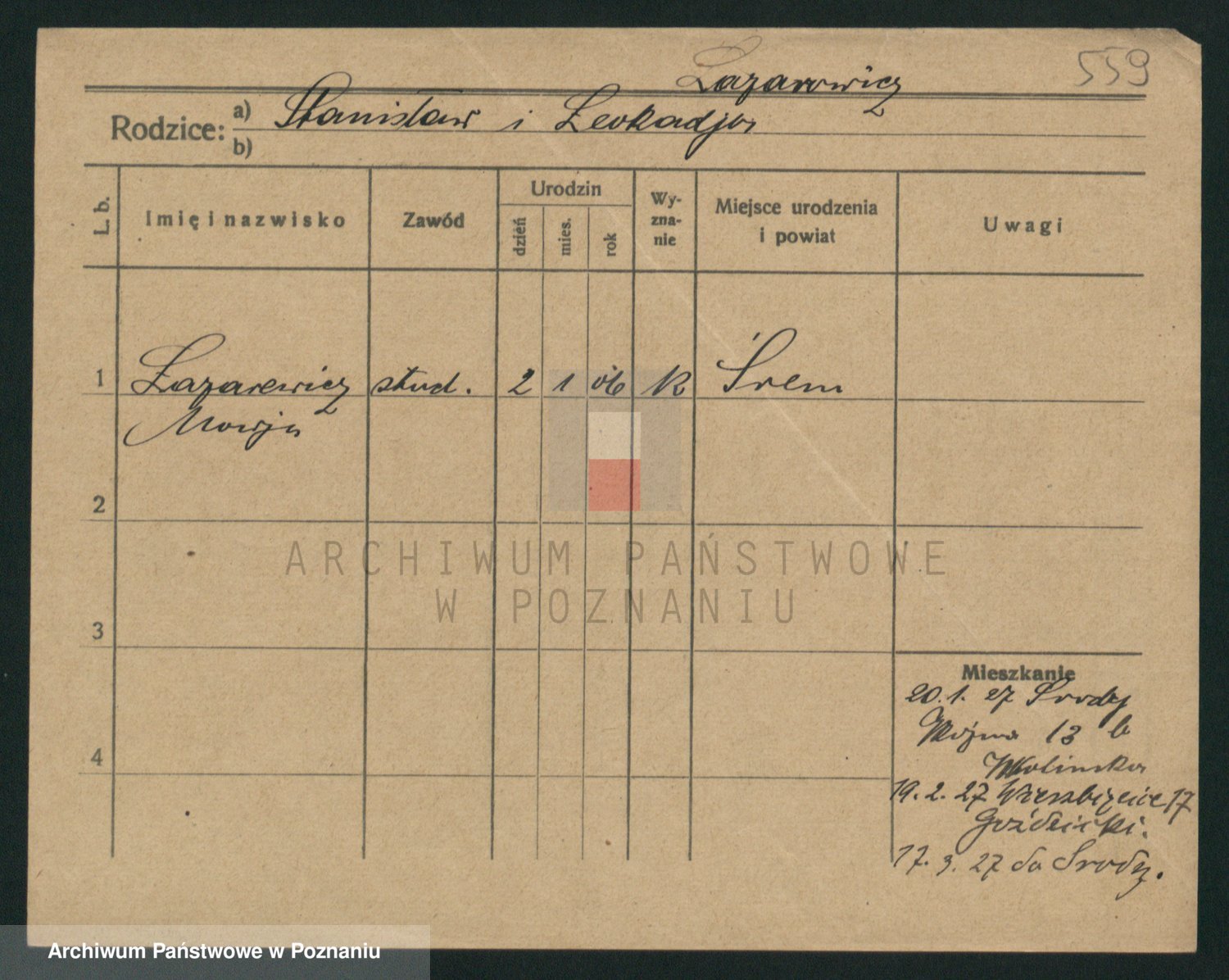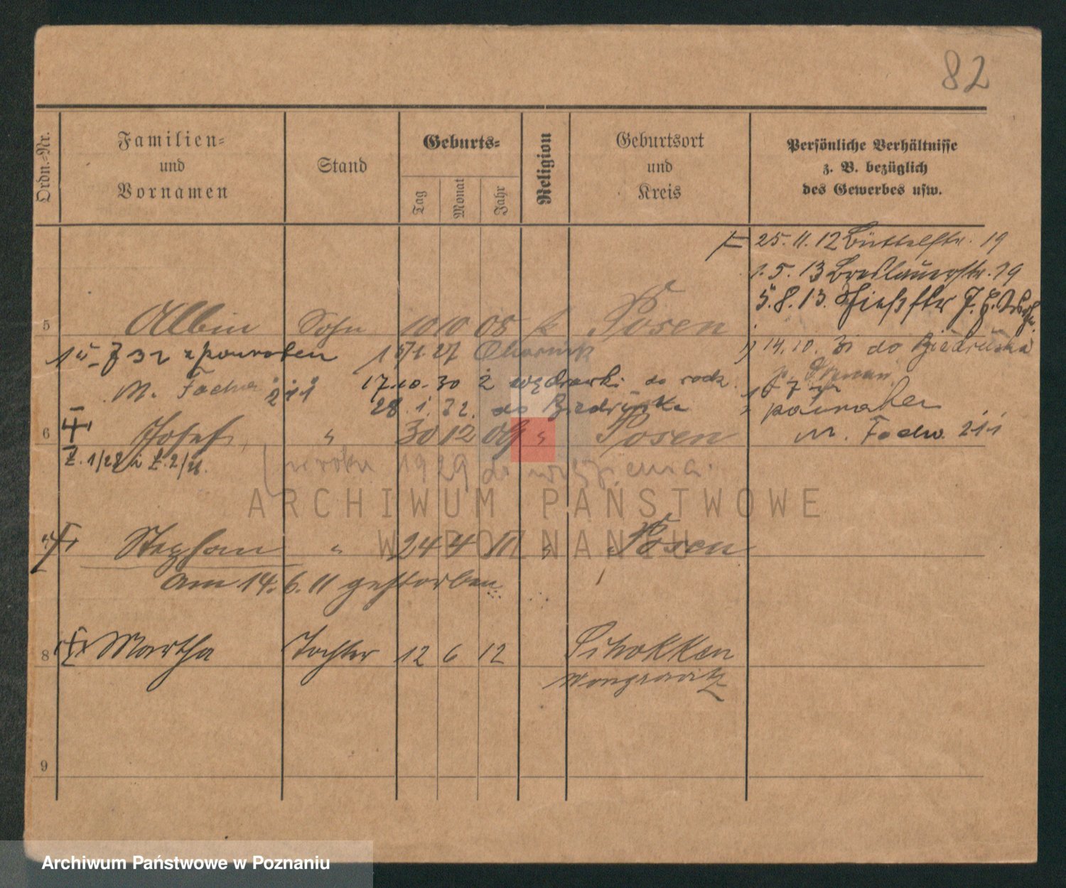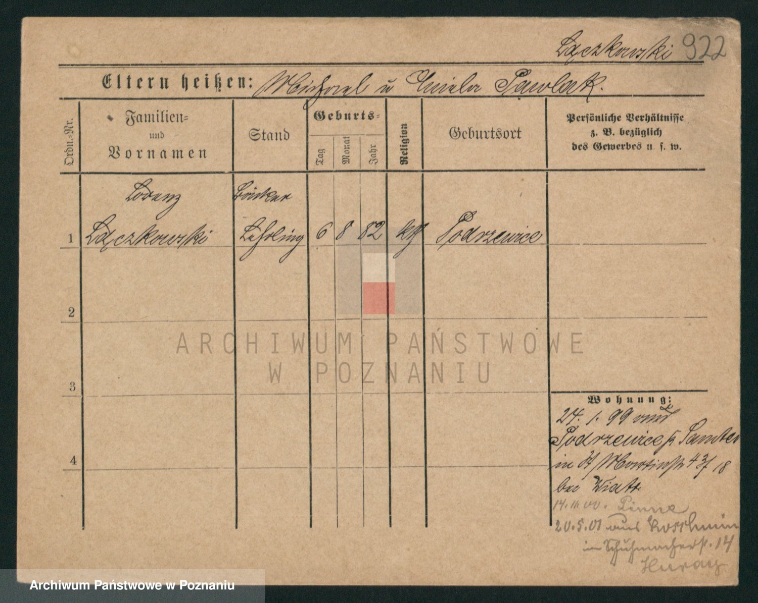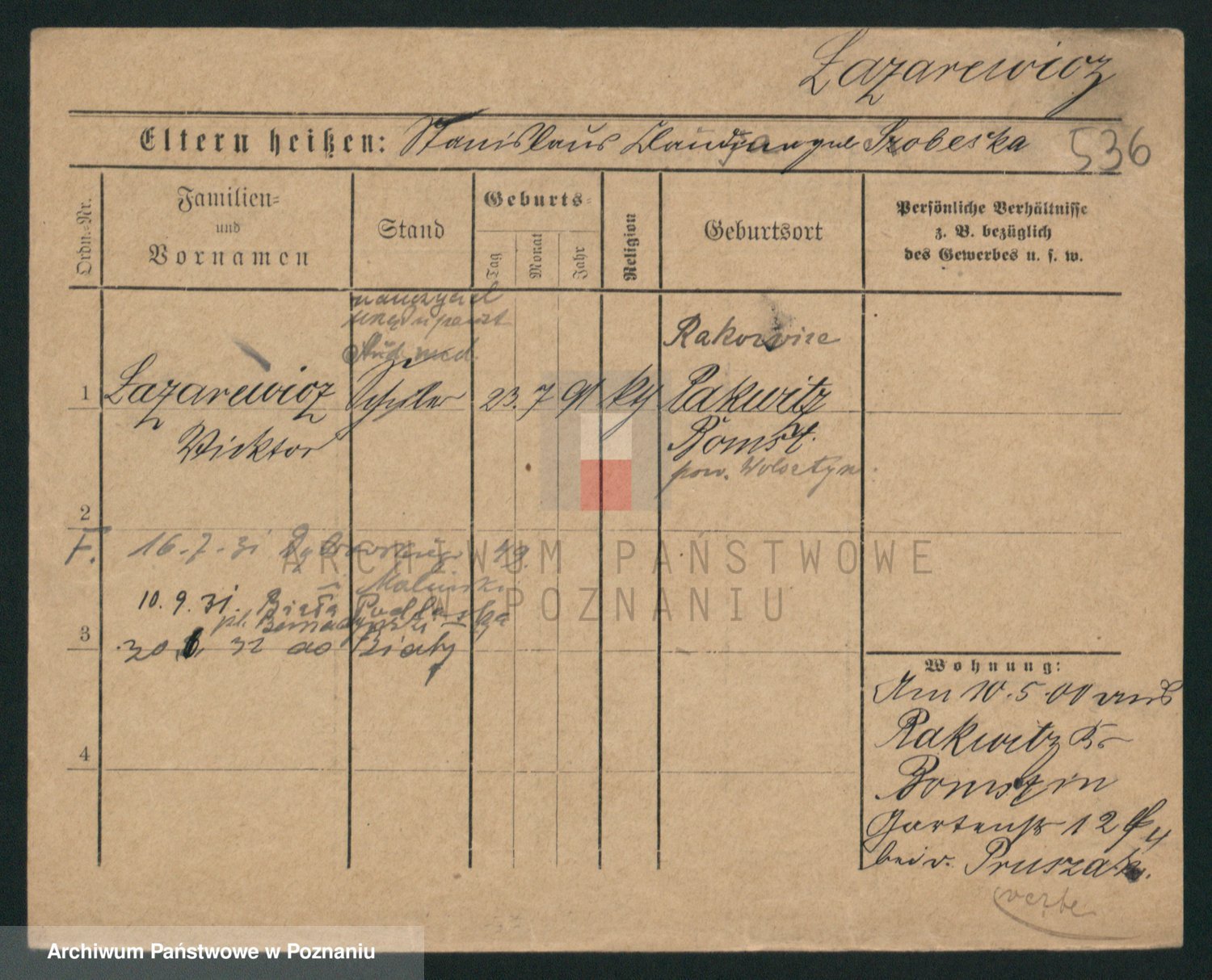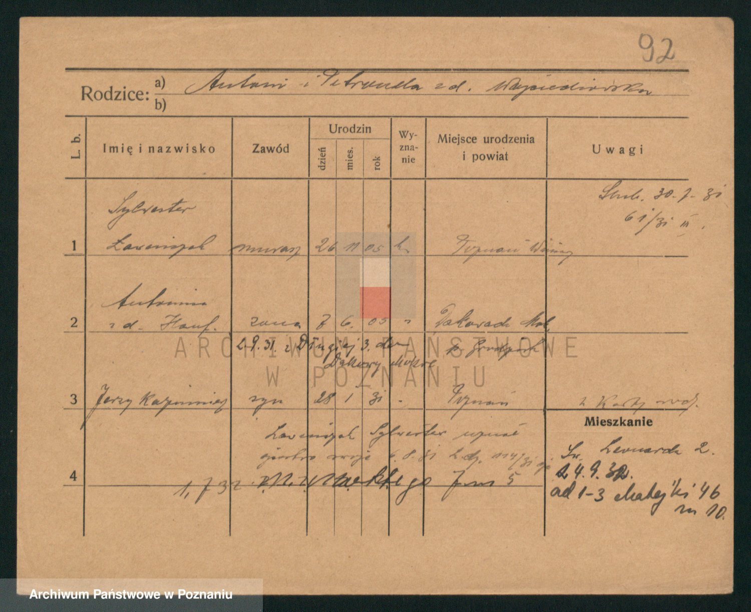 Podgląd karty osobowej dostępny jest po kliknięciu na nazwisko lub ikonkę karty. Można dokonywać powiększenia (ikony na górze) lub przechodzić między kolejnymi skanami (strzałki po bokach).