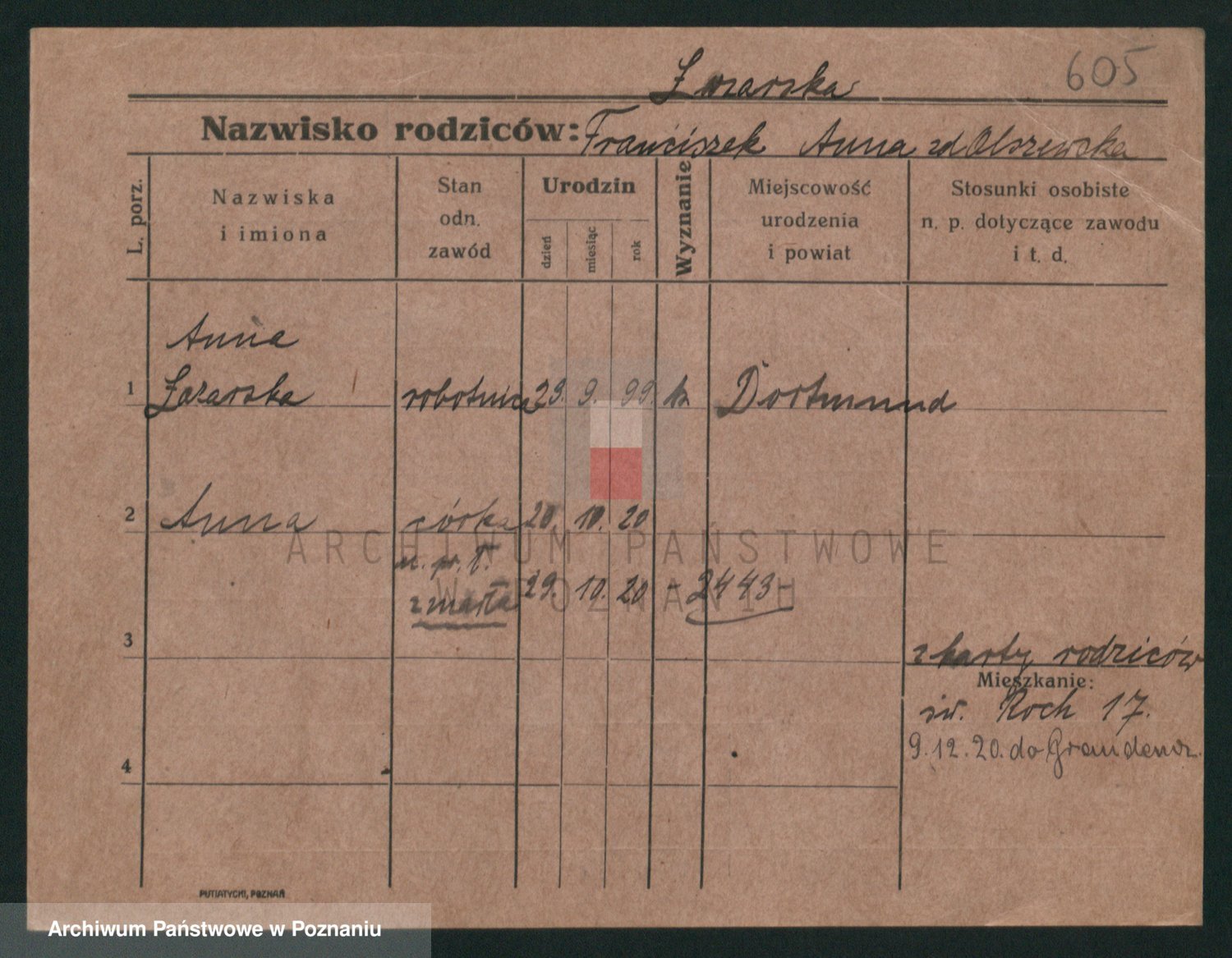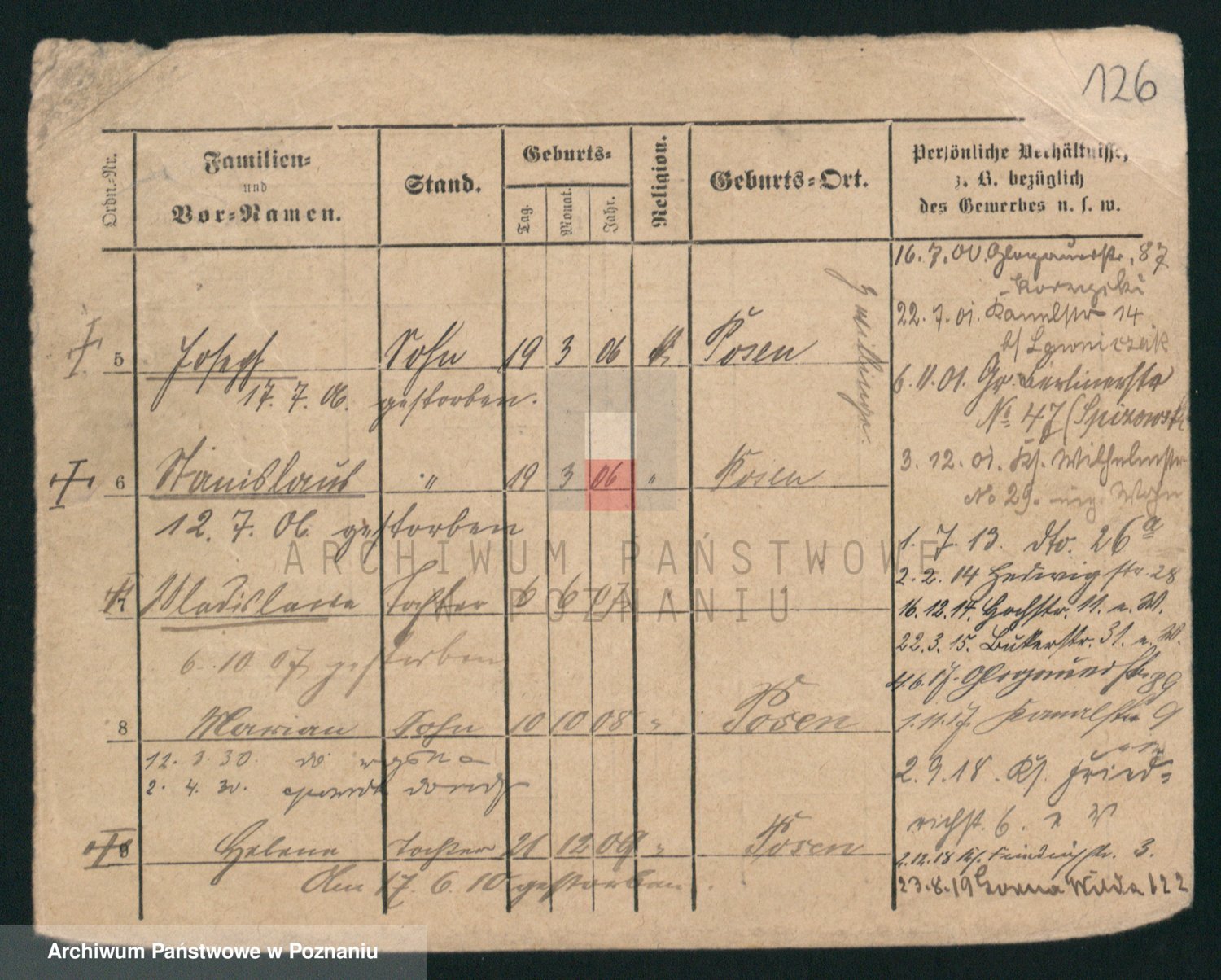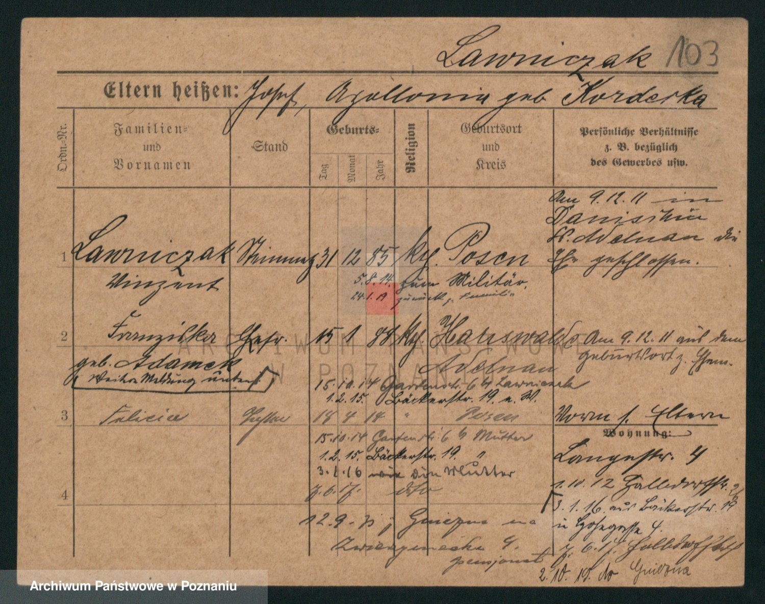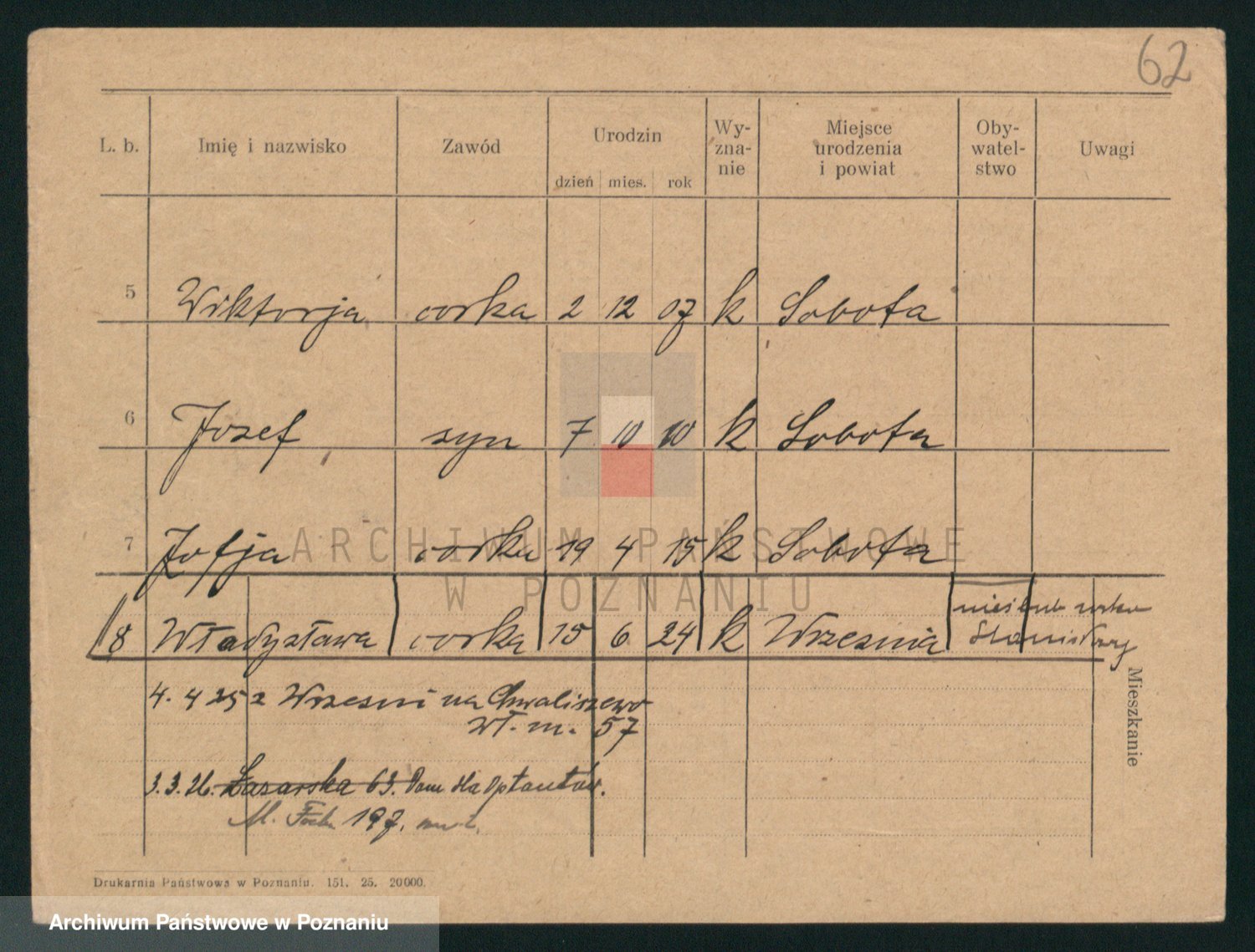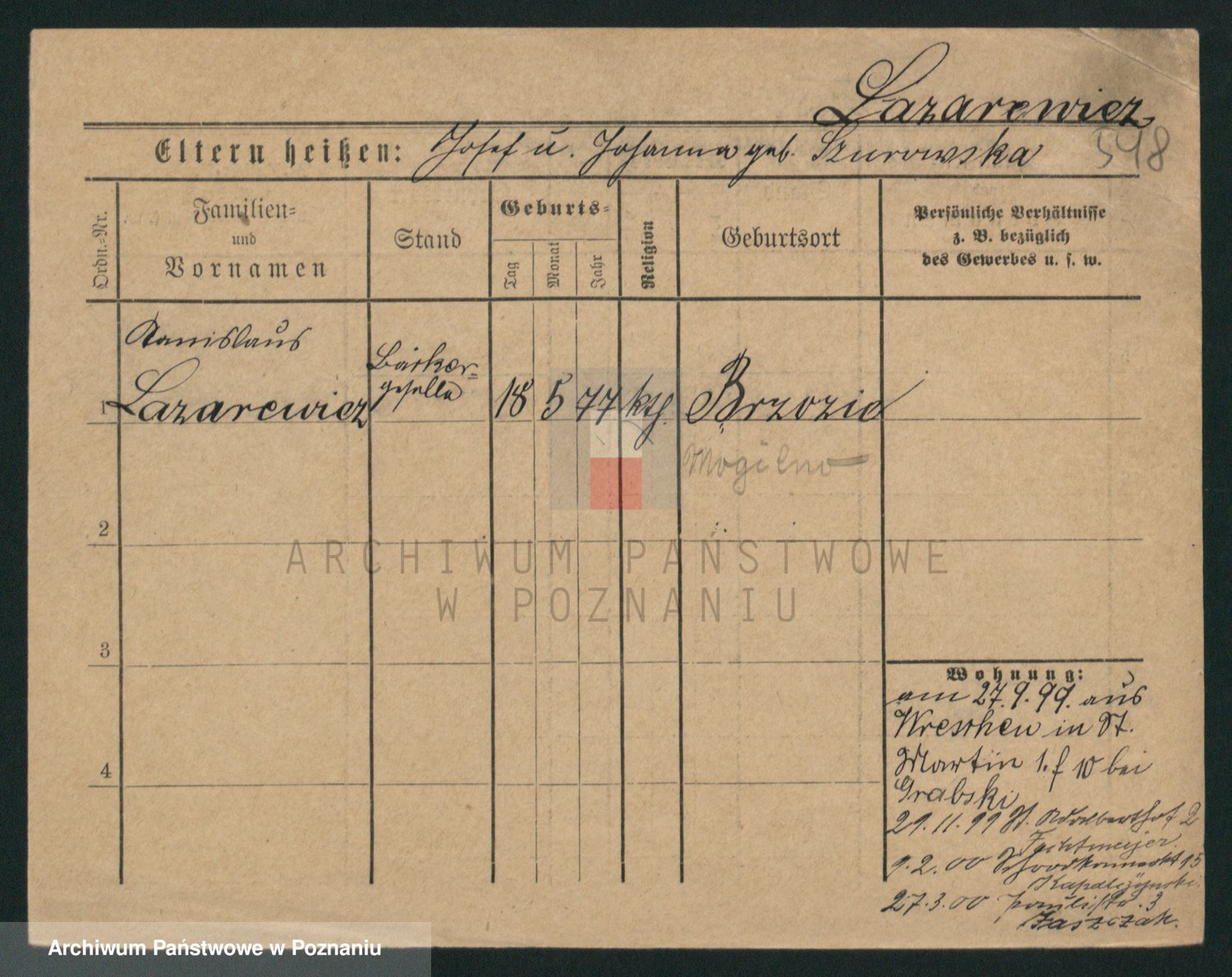 Podgląd karty osobowej dostępny jest po kliknięciu na nazwisko lub ikonkę karty. Można dokonywać powiększenia (ikony na górze) lub przechodzić między kolejnymi skanami (strzałki po bokach).