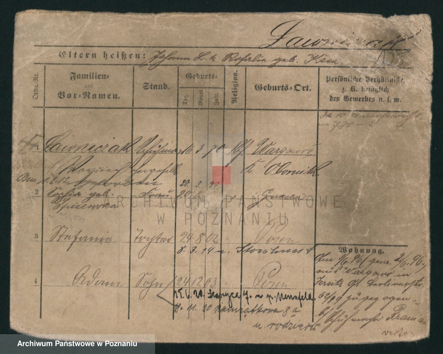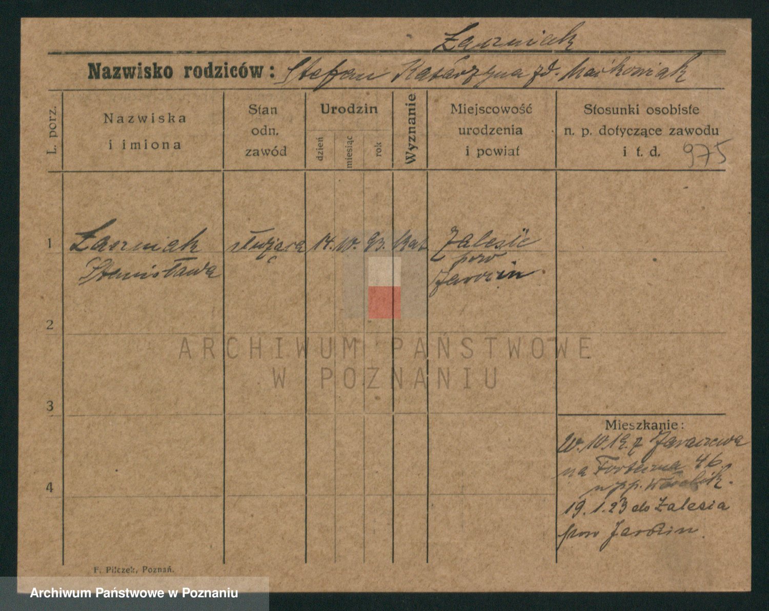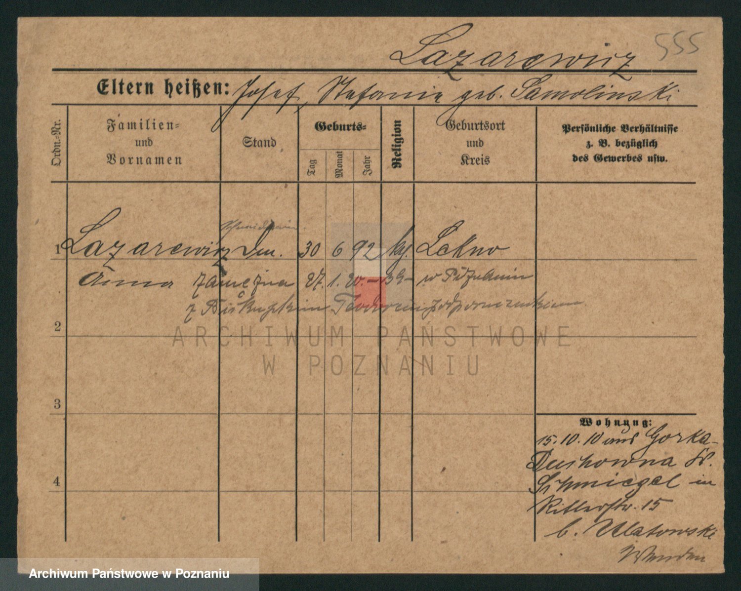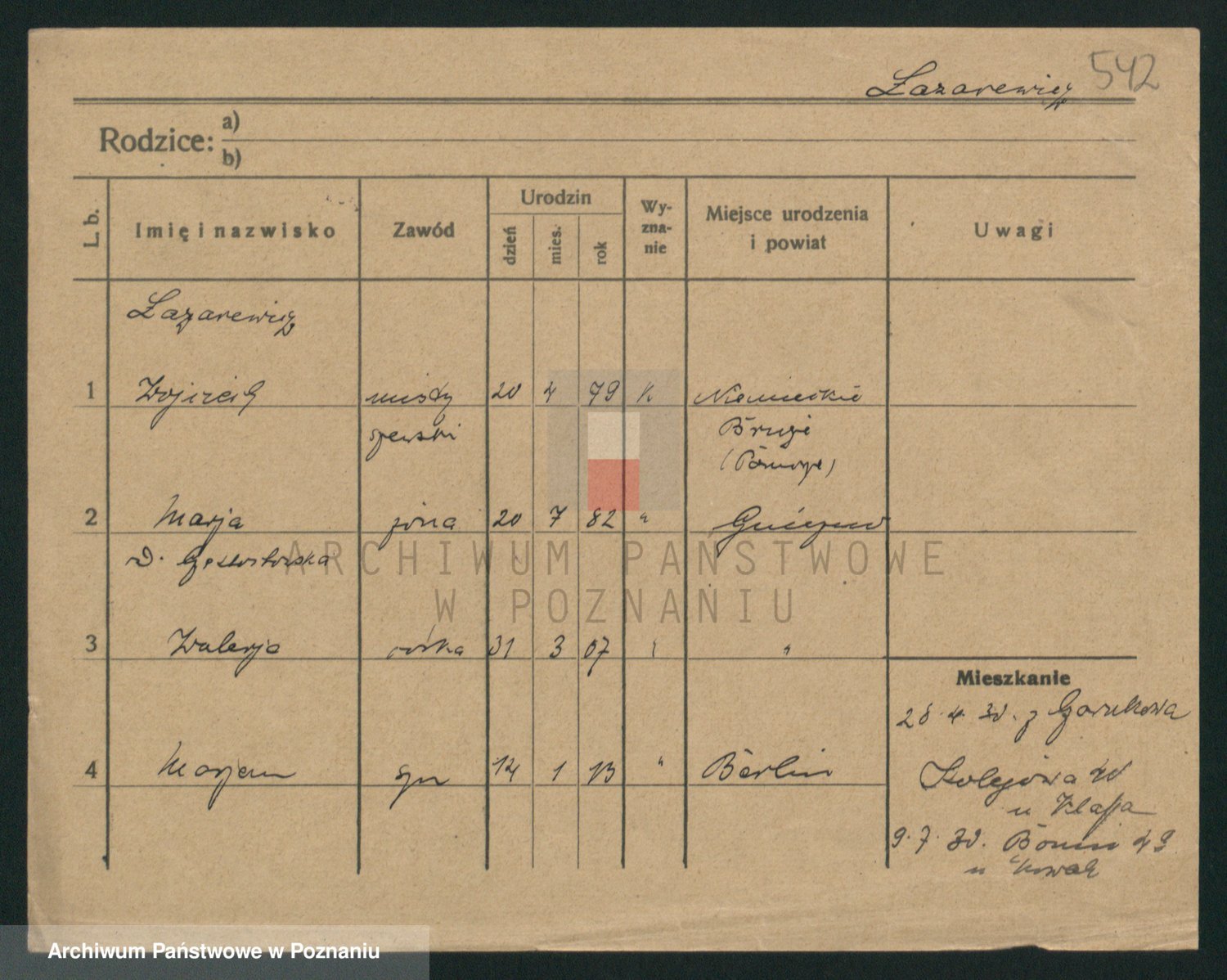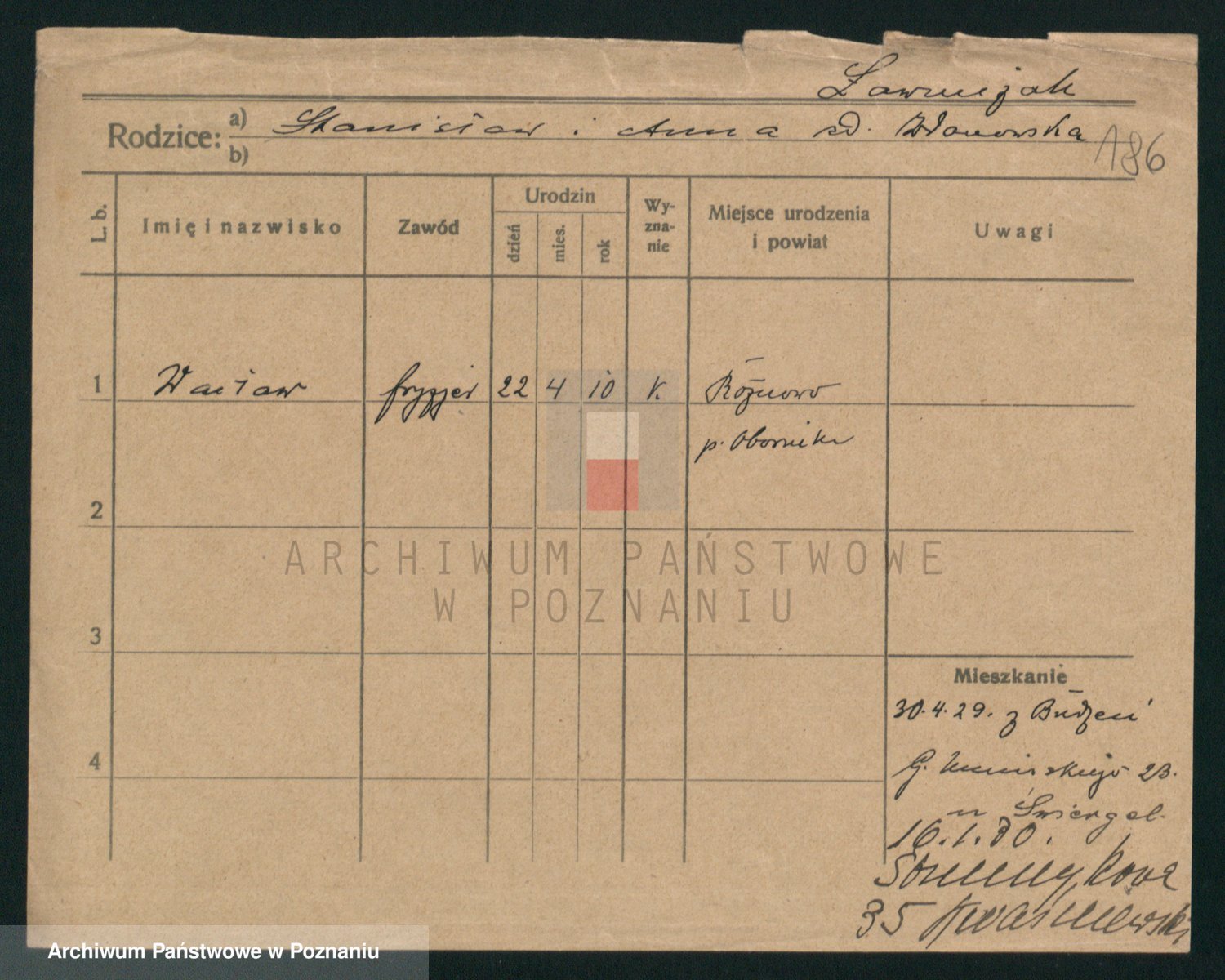 Podgląd karty osobowej dostępny jest po kliknięciu na nazwisko lub ikonkę karty. Można dokonywać powiększenia (ikony na górze) lub przechodzić między kolejnymi skanami (strzałki po bokach).