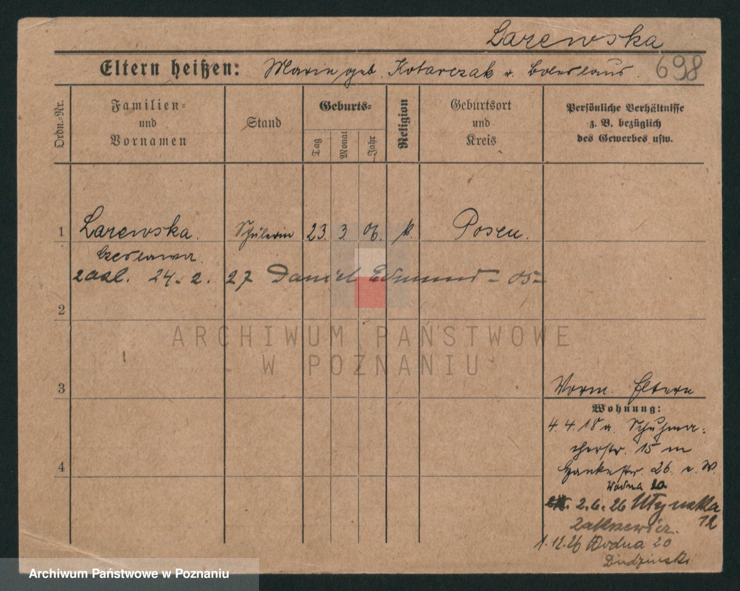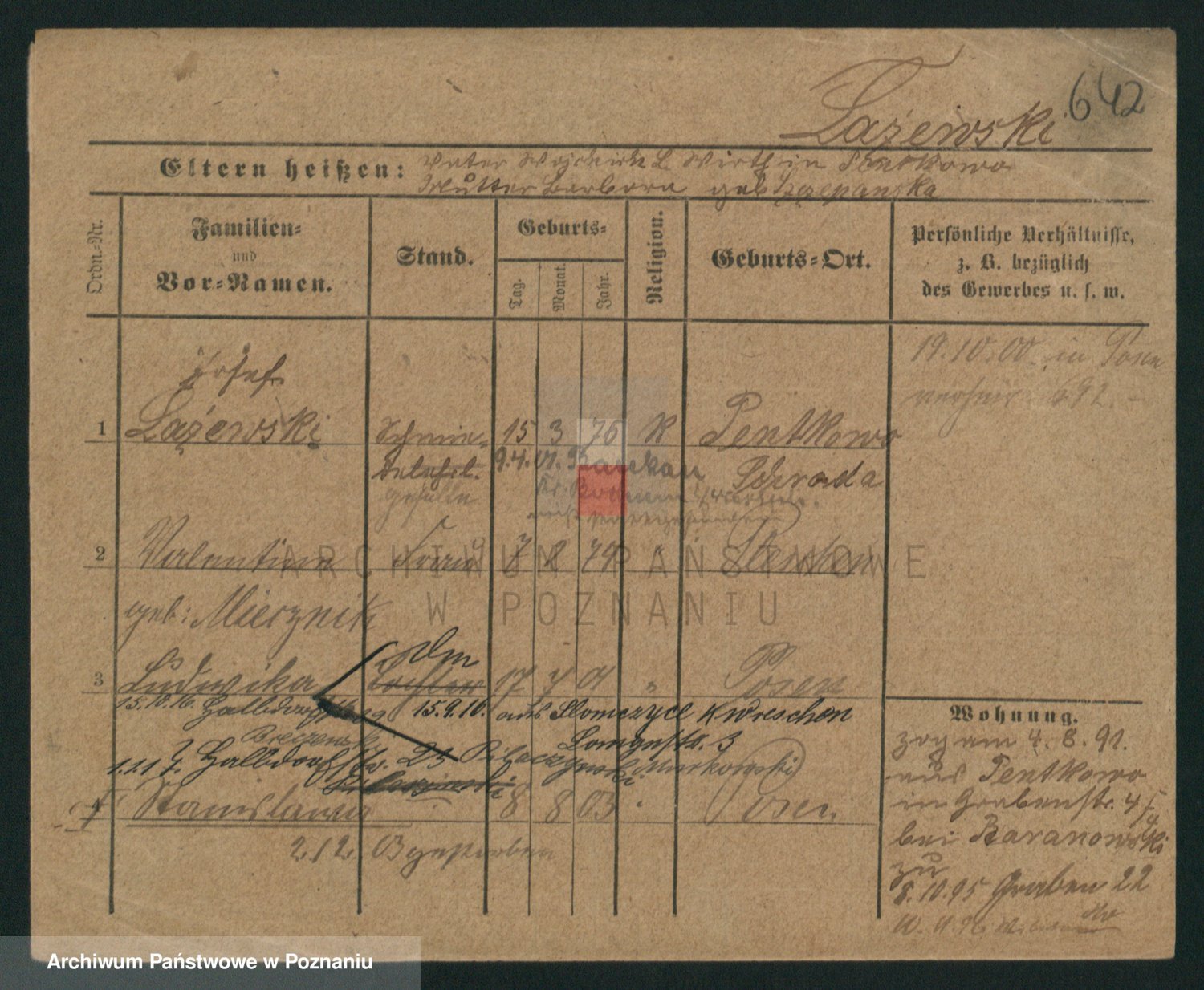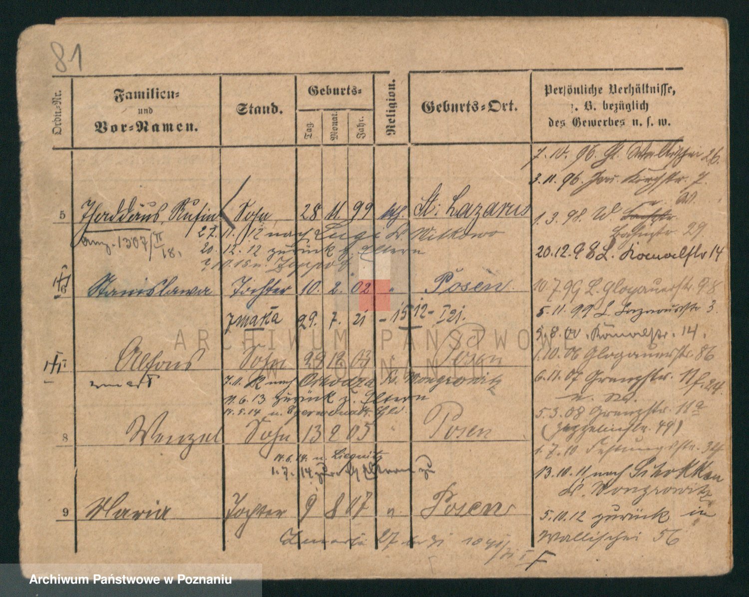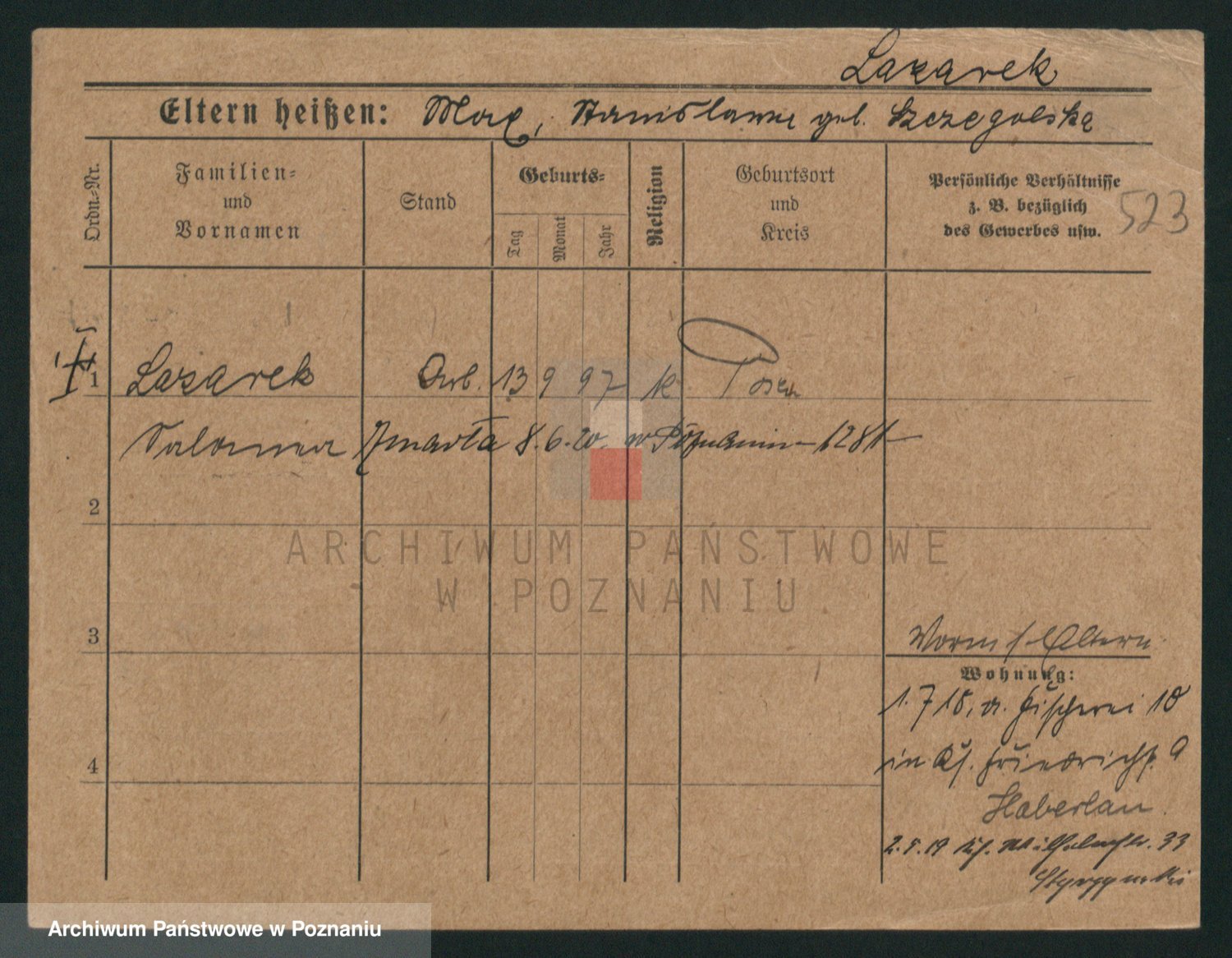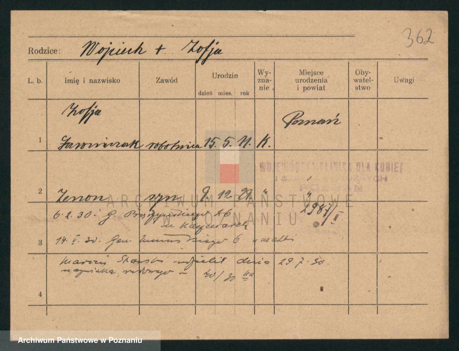 Podgląd karty osobowej dostępny jest po kliknięciu na nazwisko lub ikonkę karty. Można dokonywać powiększenia (ikony na górze) lub przechodzić między kolejnymi skanami (strzałki po bokach).