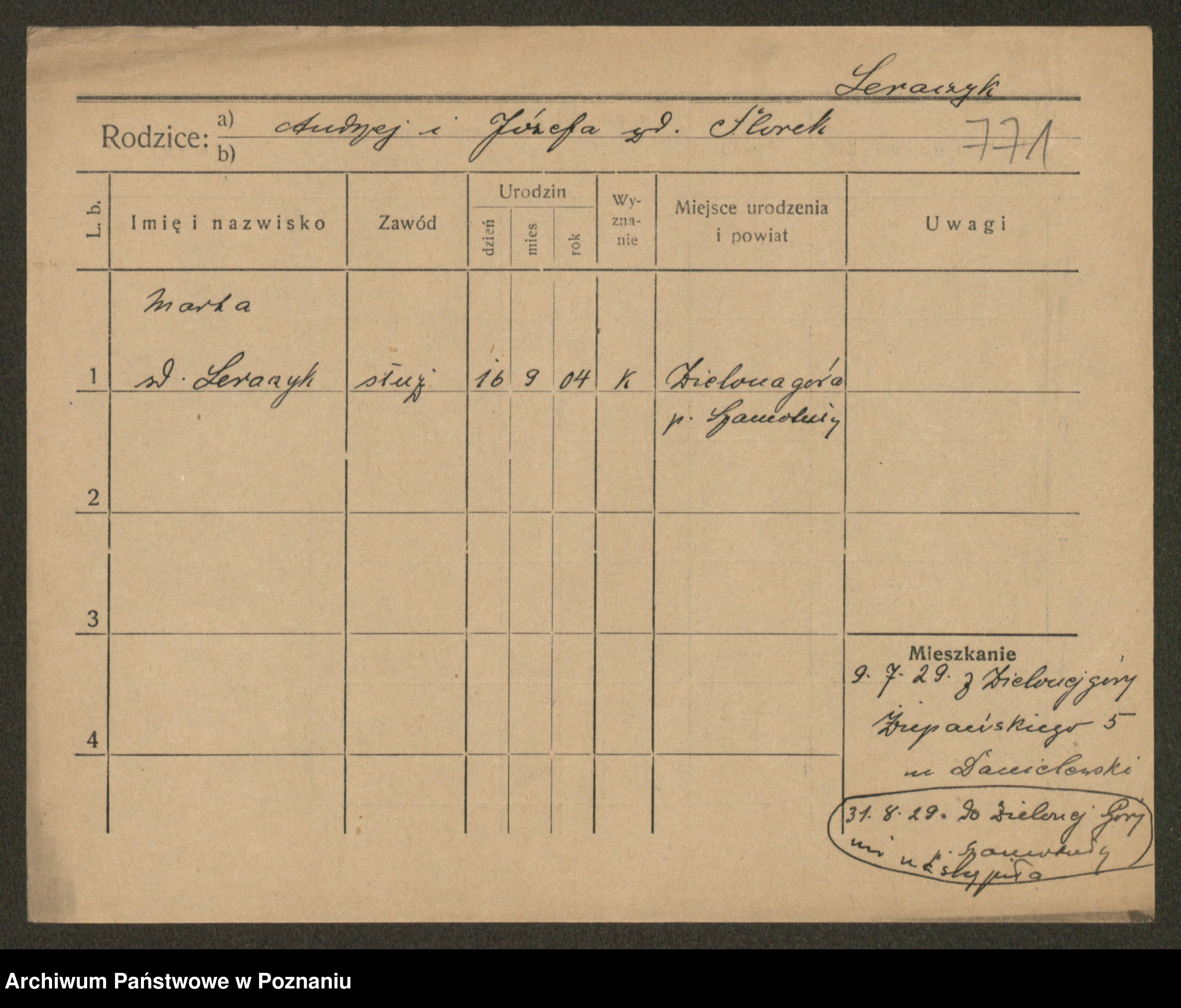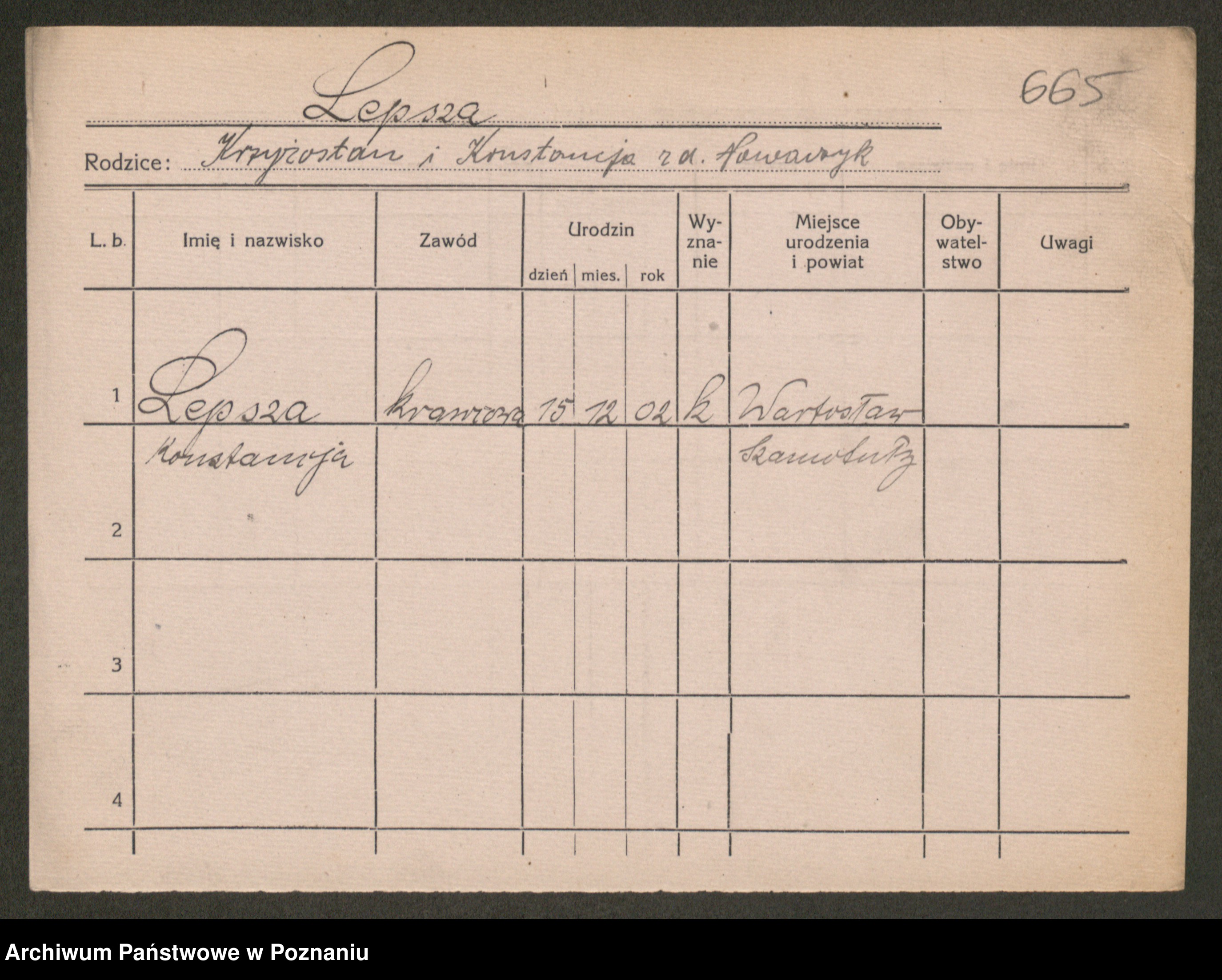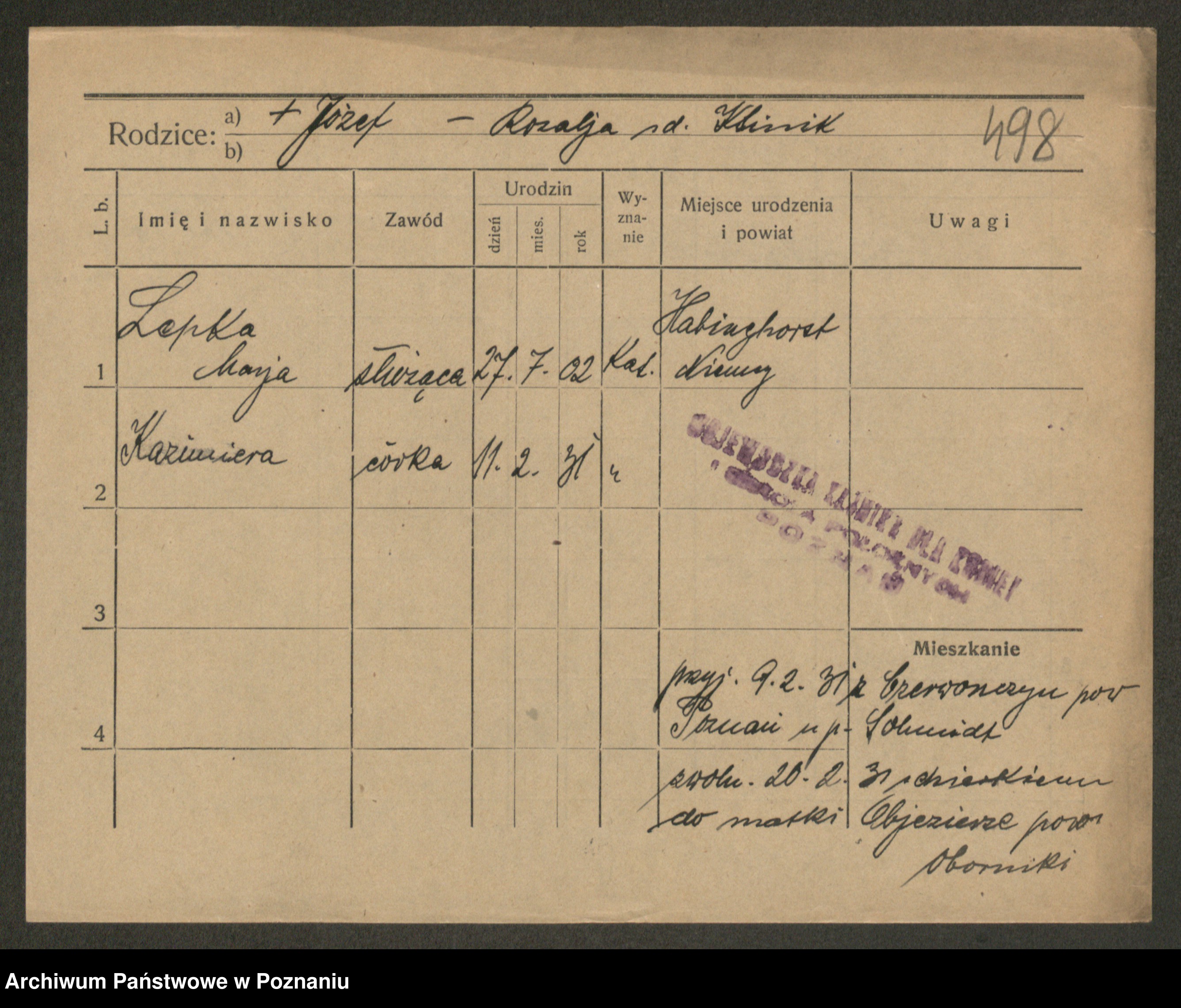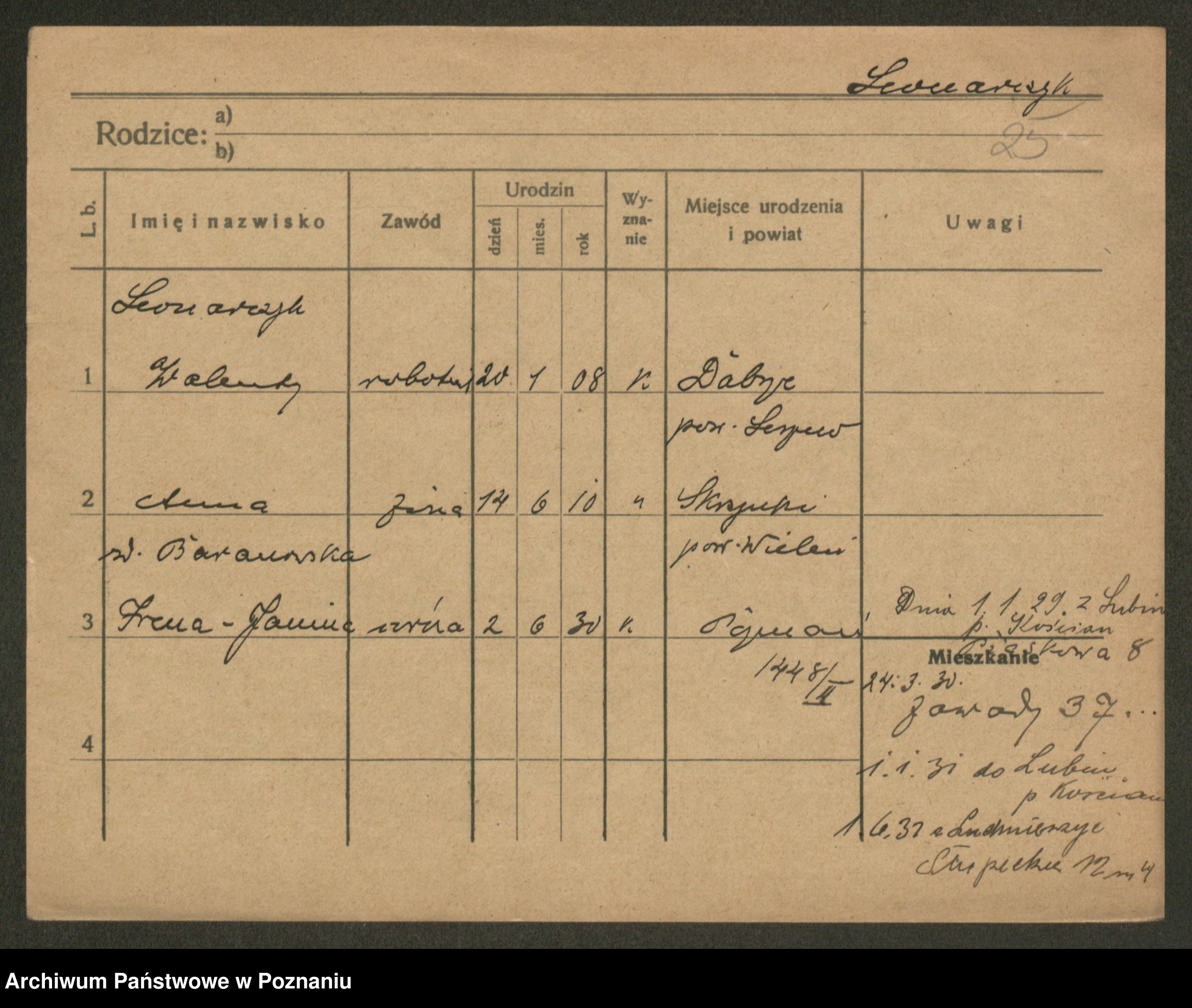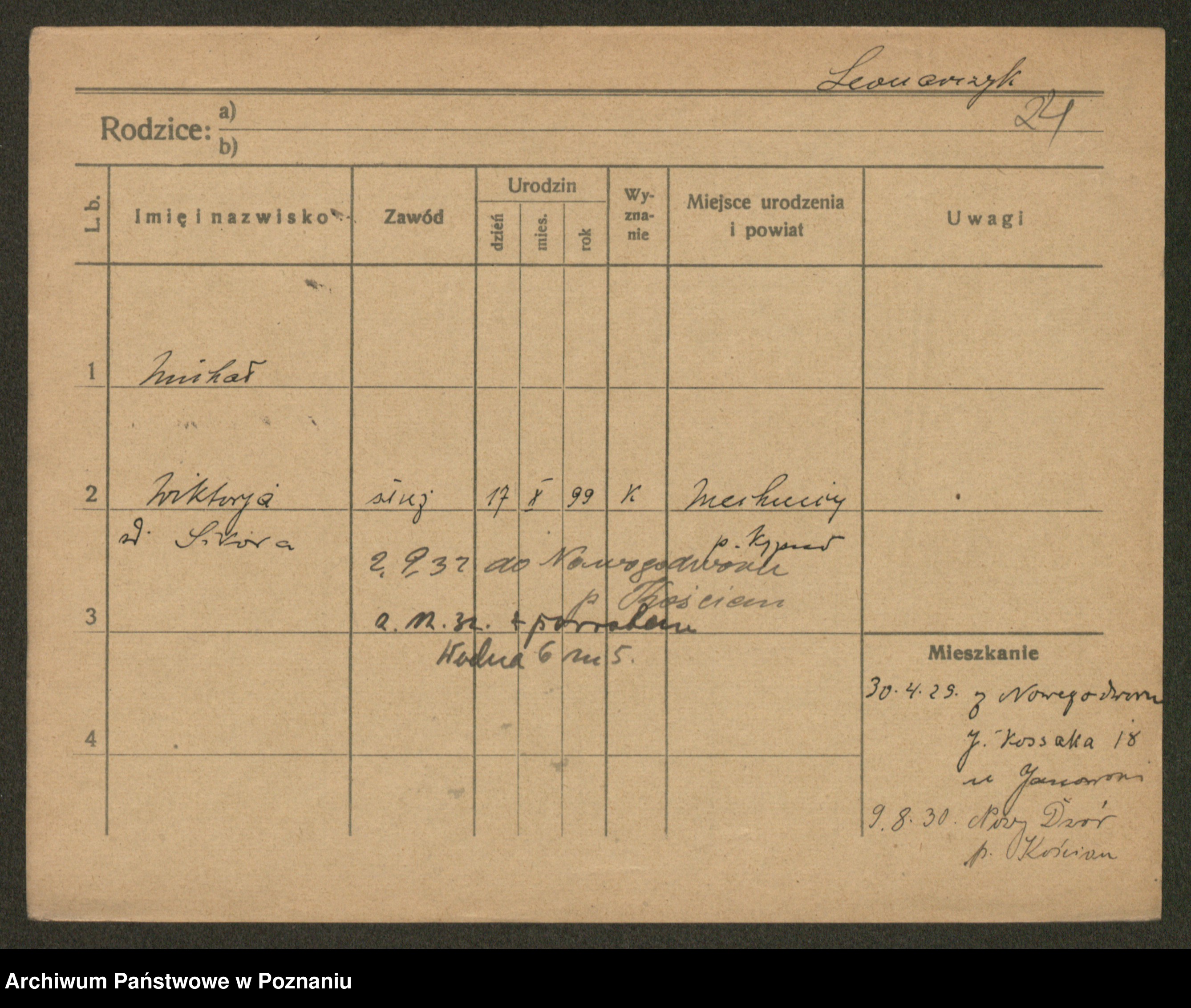 Podgląd karty osobowej dostępny jest po kliknięciu na nazwisko lub ikonkę karty. Można dokonywać powiększenia (ikony na górze) lub przechodzić między kolejnymi skanami (strzałki po bokach).