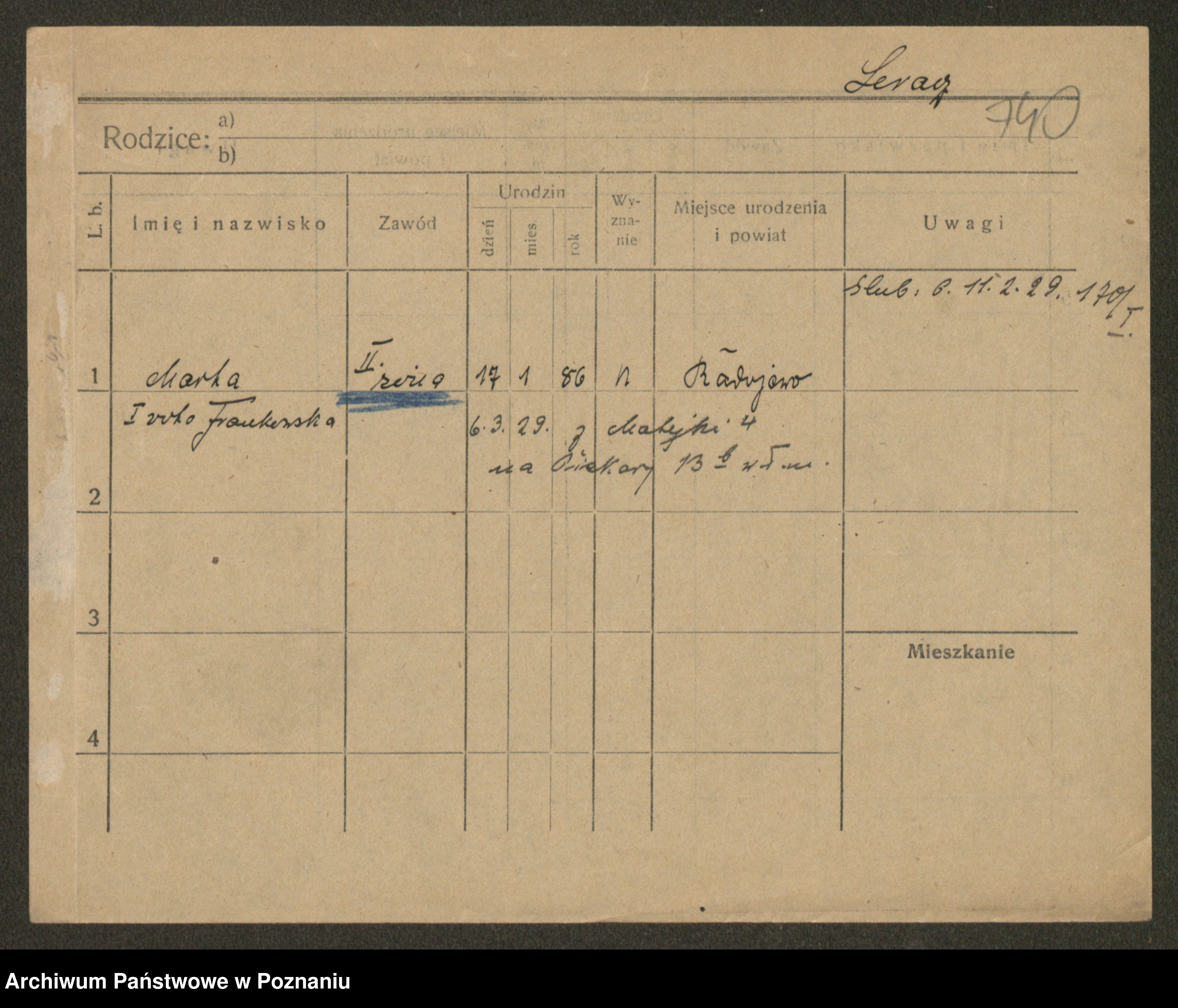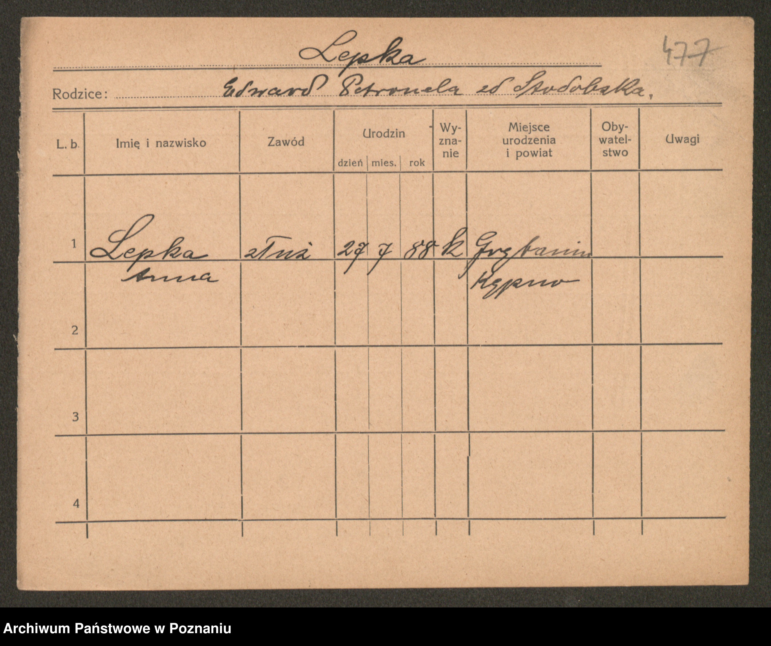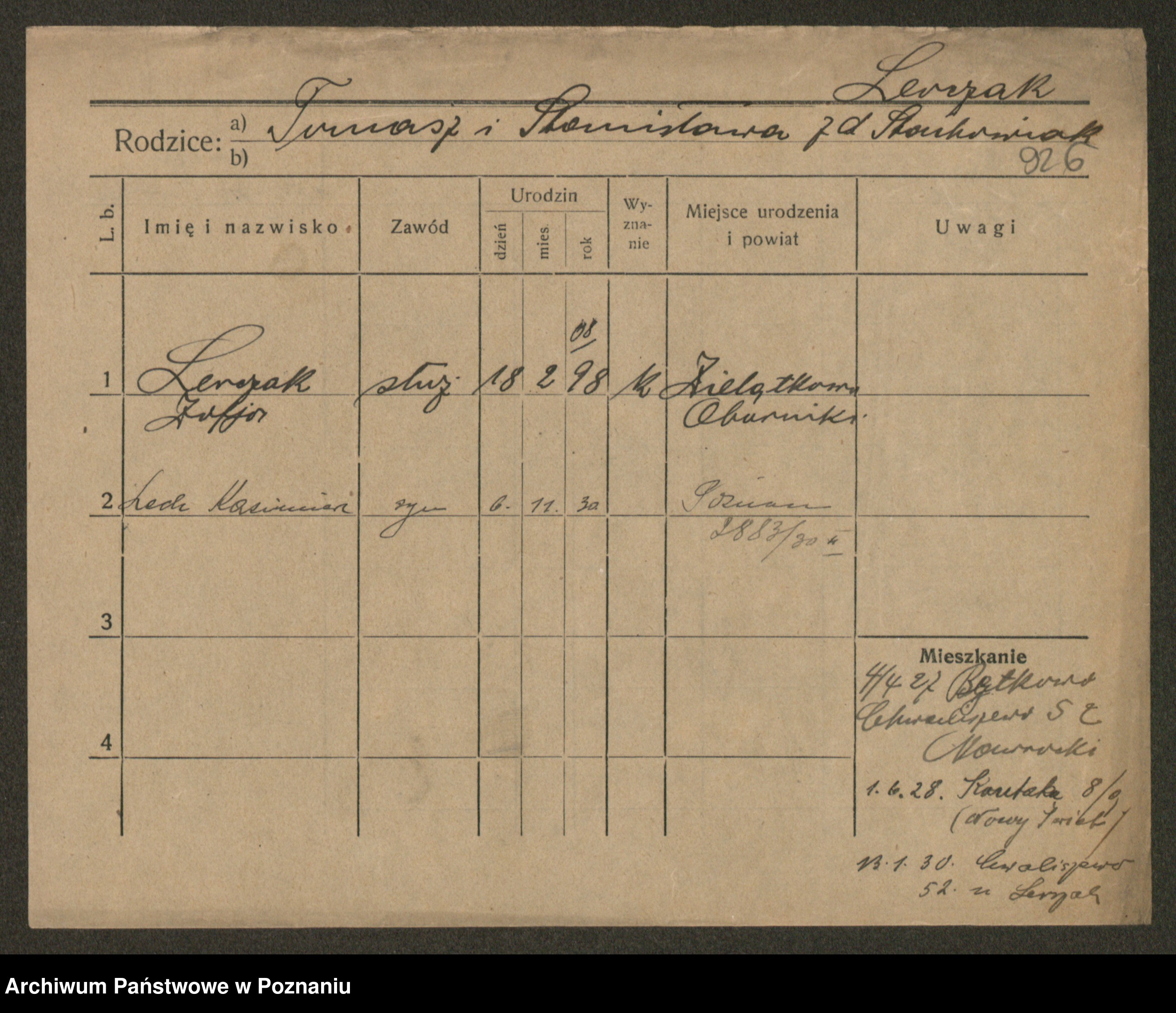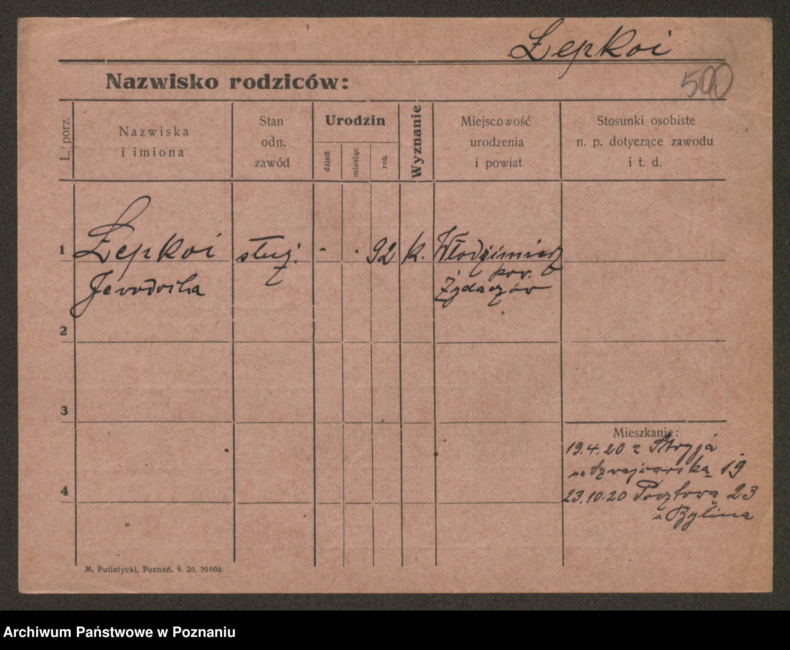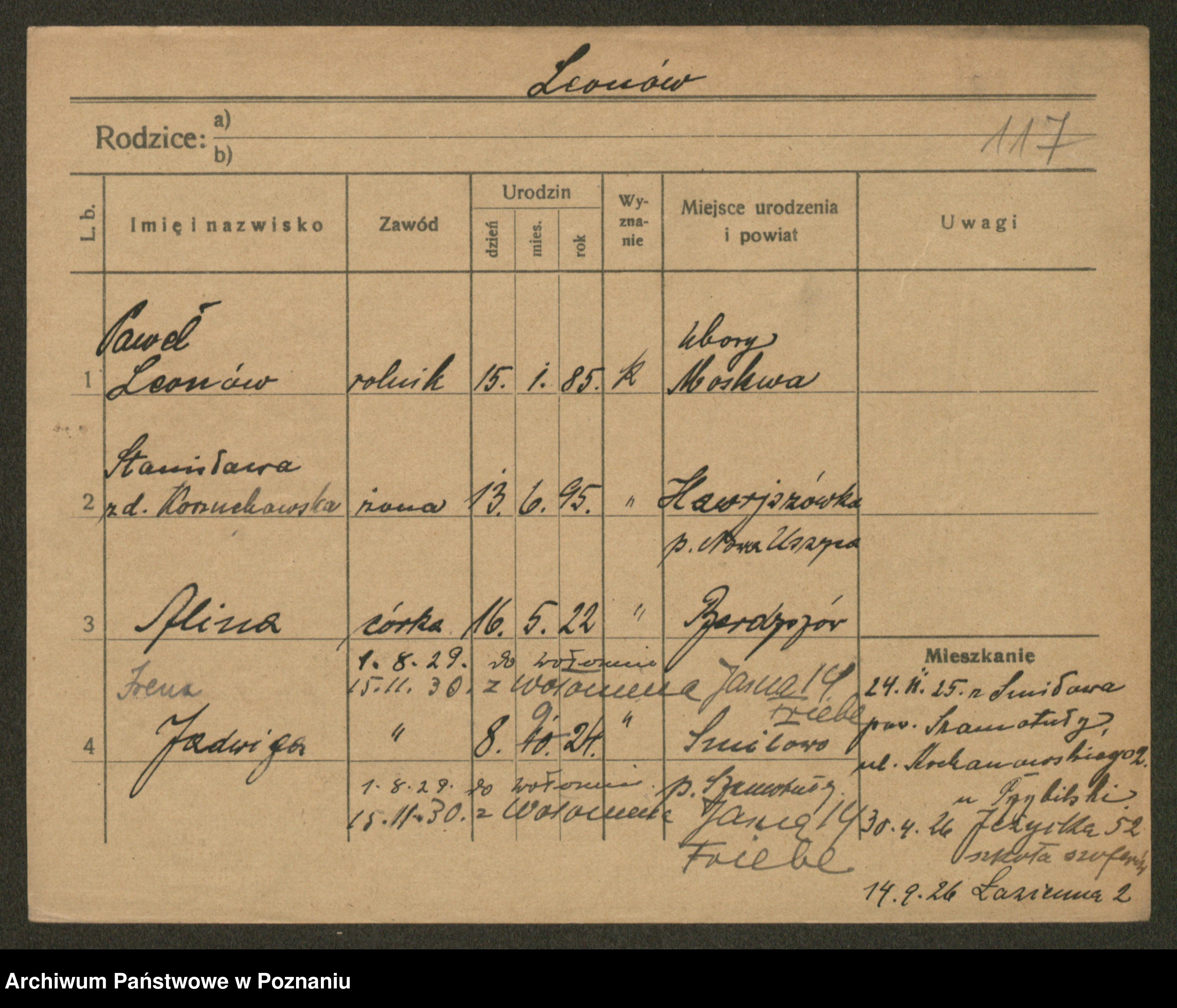 Podgląd karty osobowej dostępny jest po kliknięciu na nazwisko lub ikonkę karty. Można dokonywać powiększenia (ikony na górze) lub przechodzić między kolejnymi skanami (strzałki po bokach).