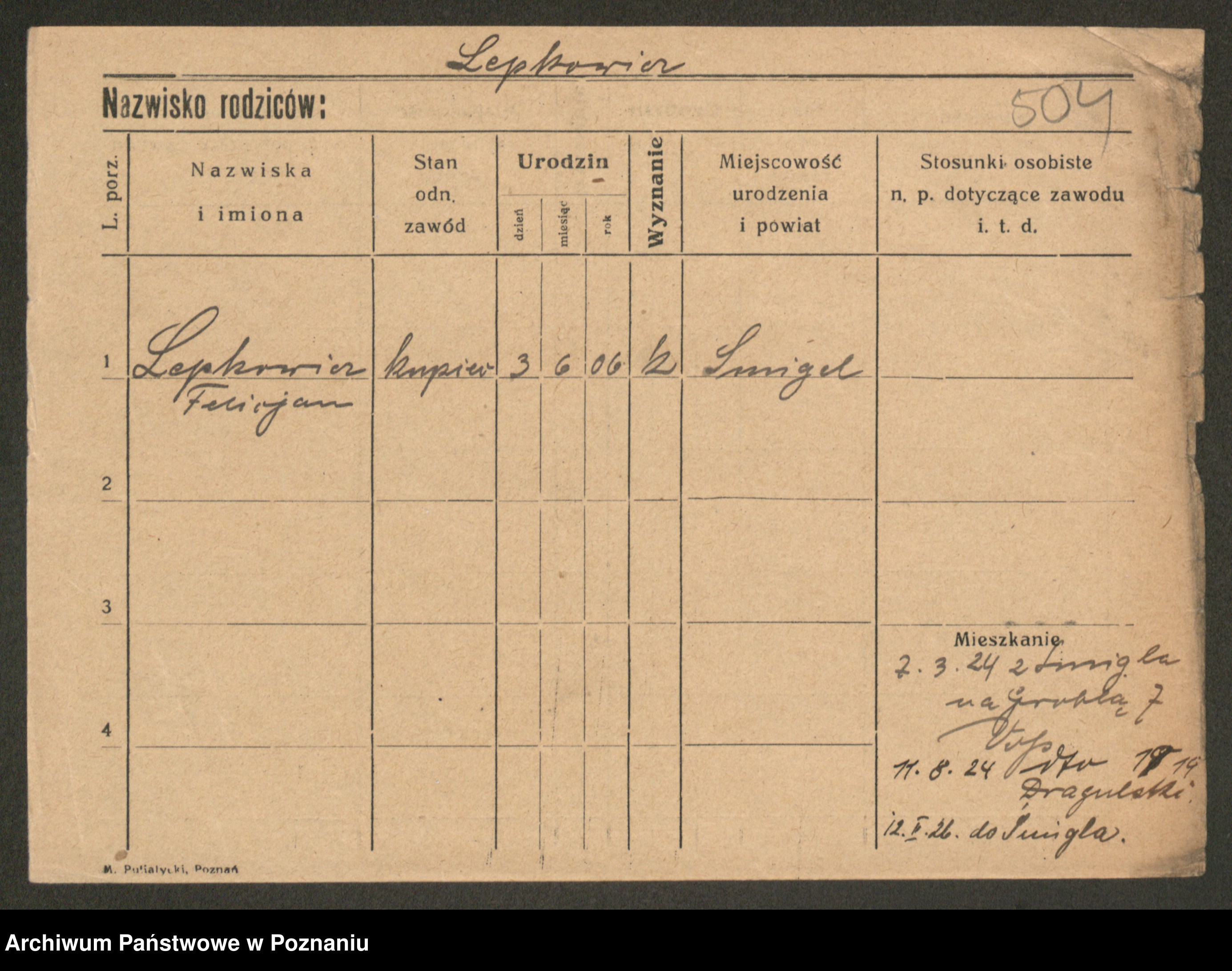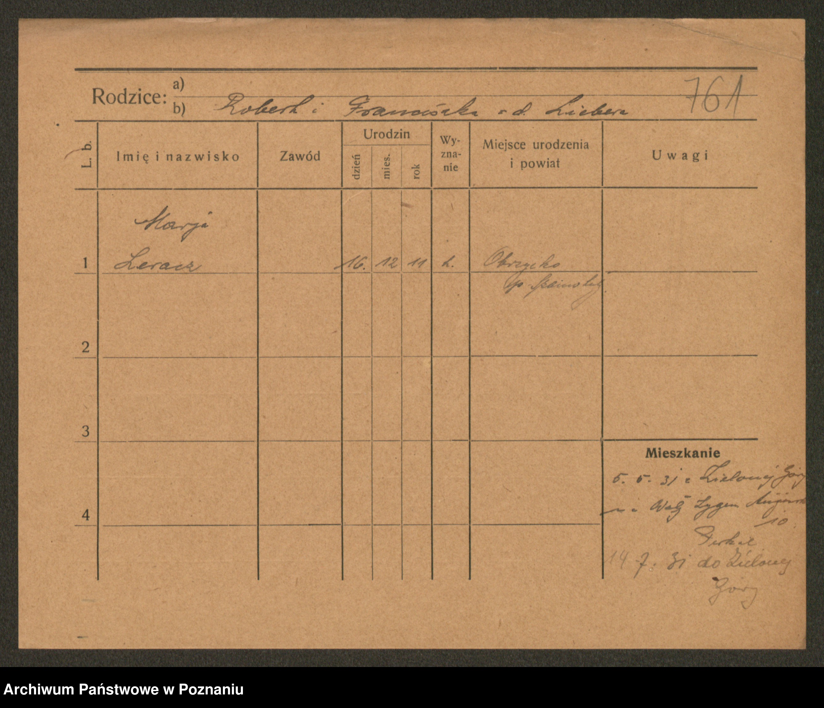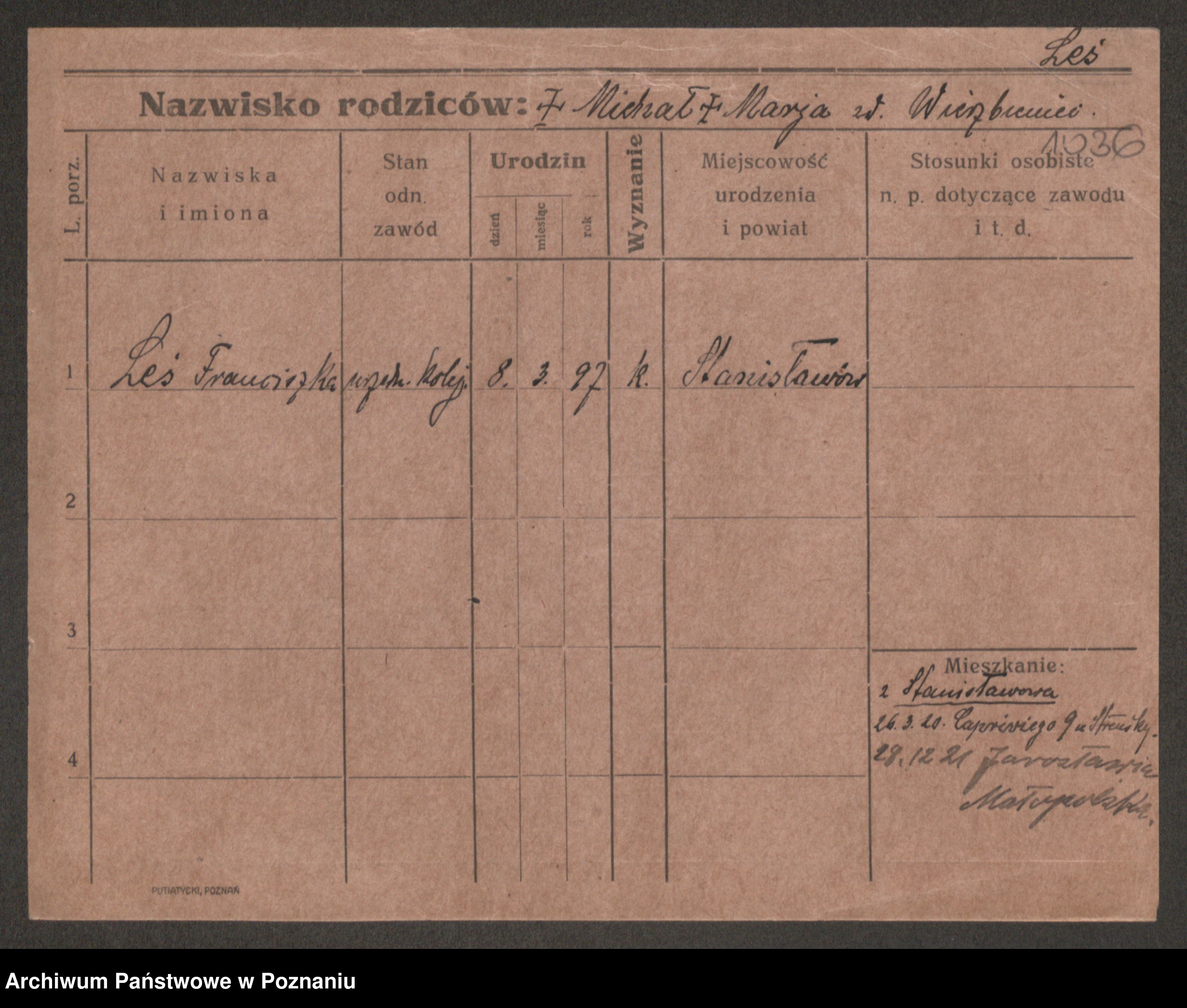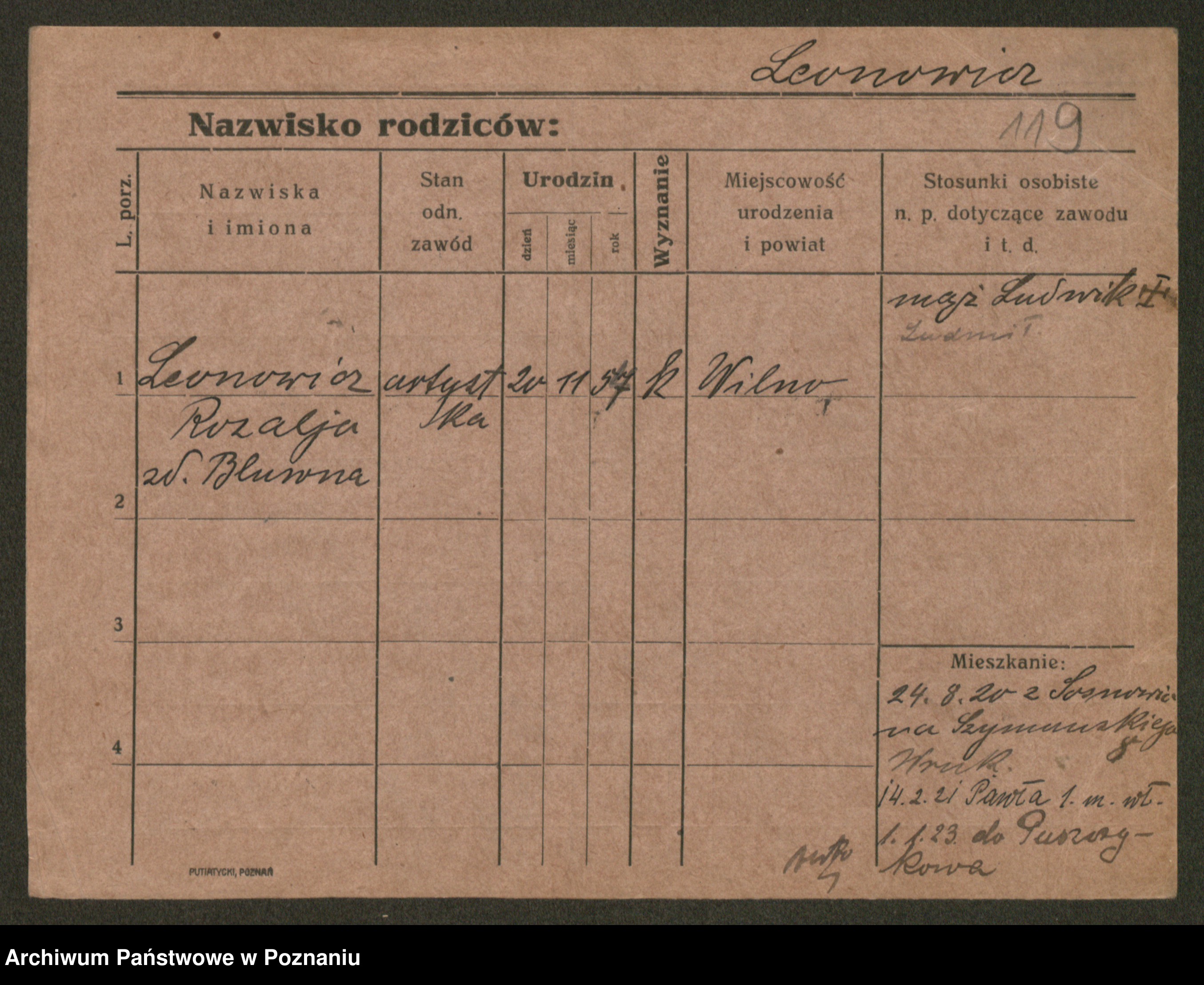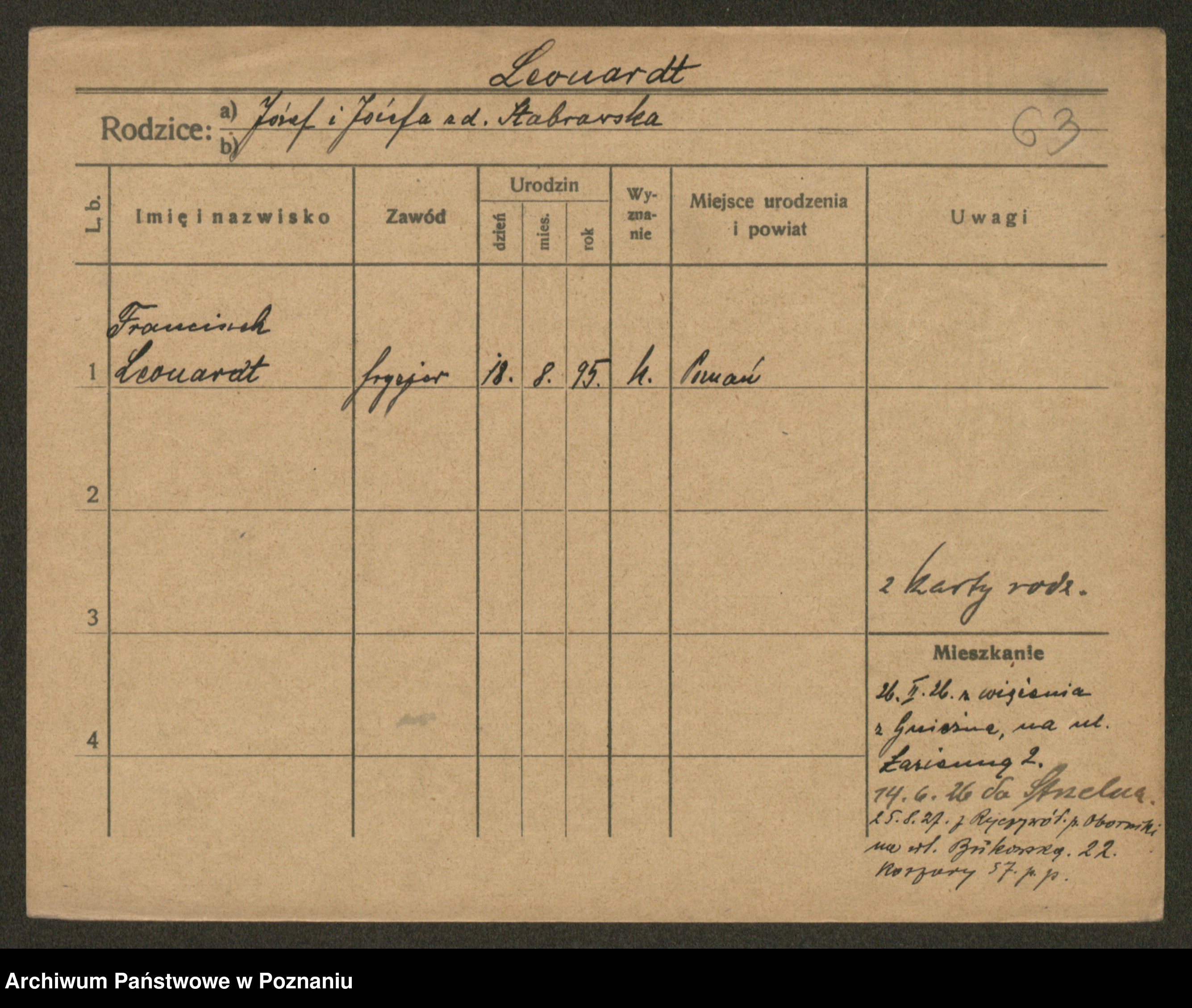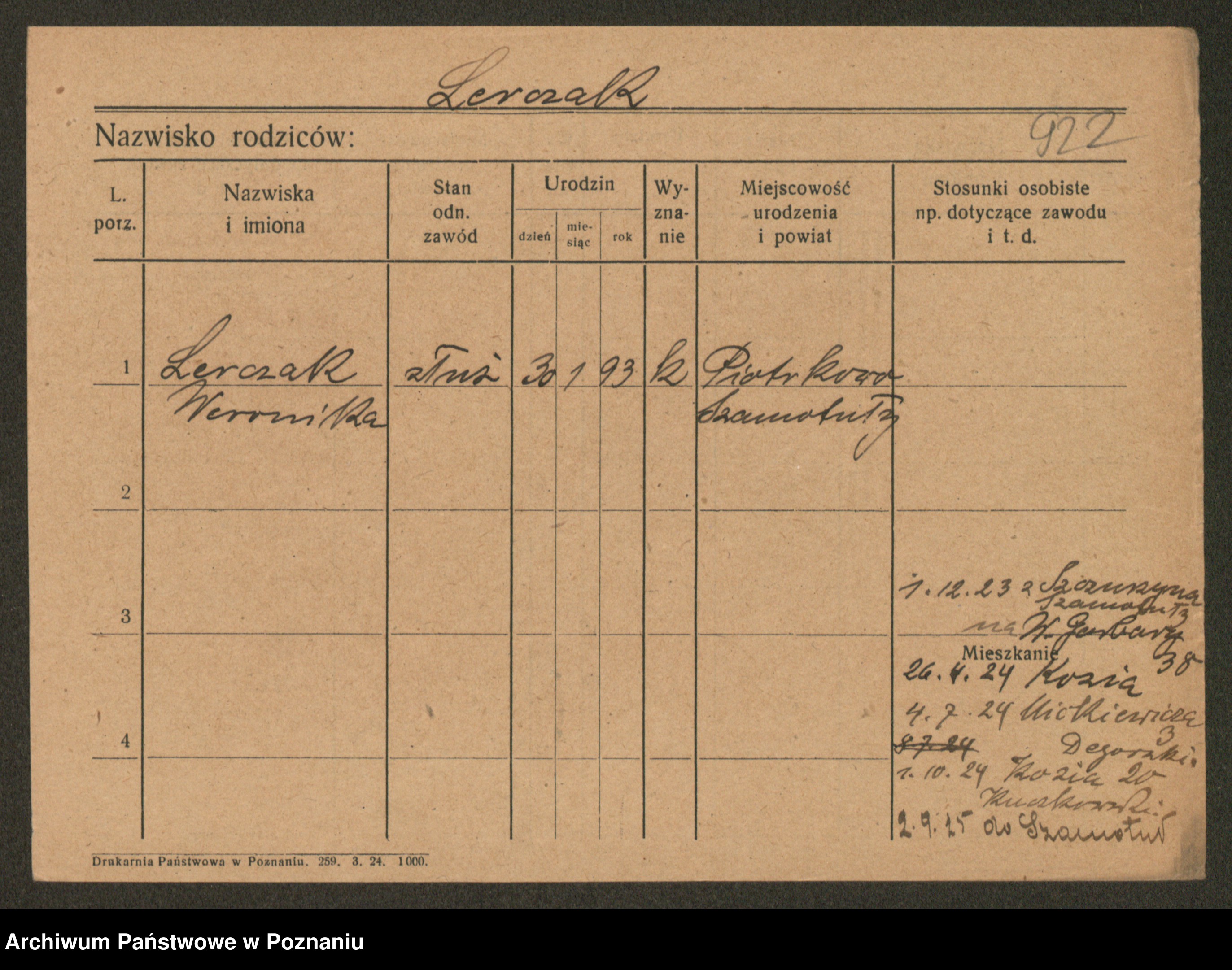 Podgląd karty osobowej dostępny jest po kliknięciu na nazwisko lub ikonkę karty. Można dokonywać powiększenia (ikony na górze) lub przechodzić między kolejnymi skanami (strzałki po bokach).