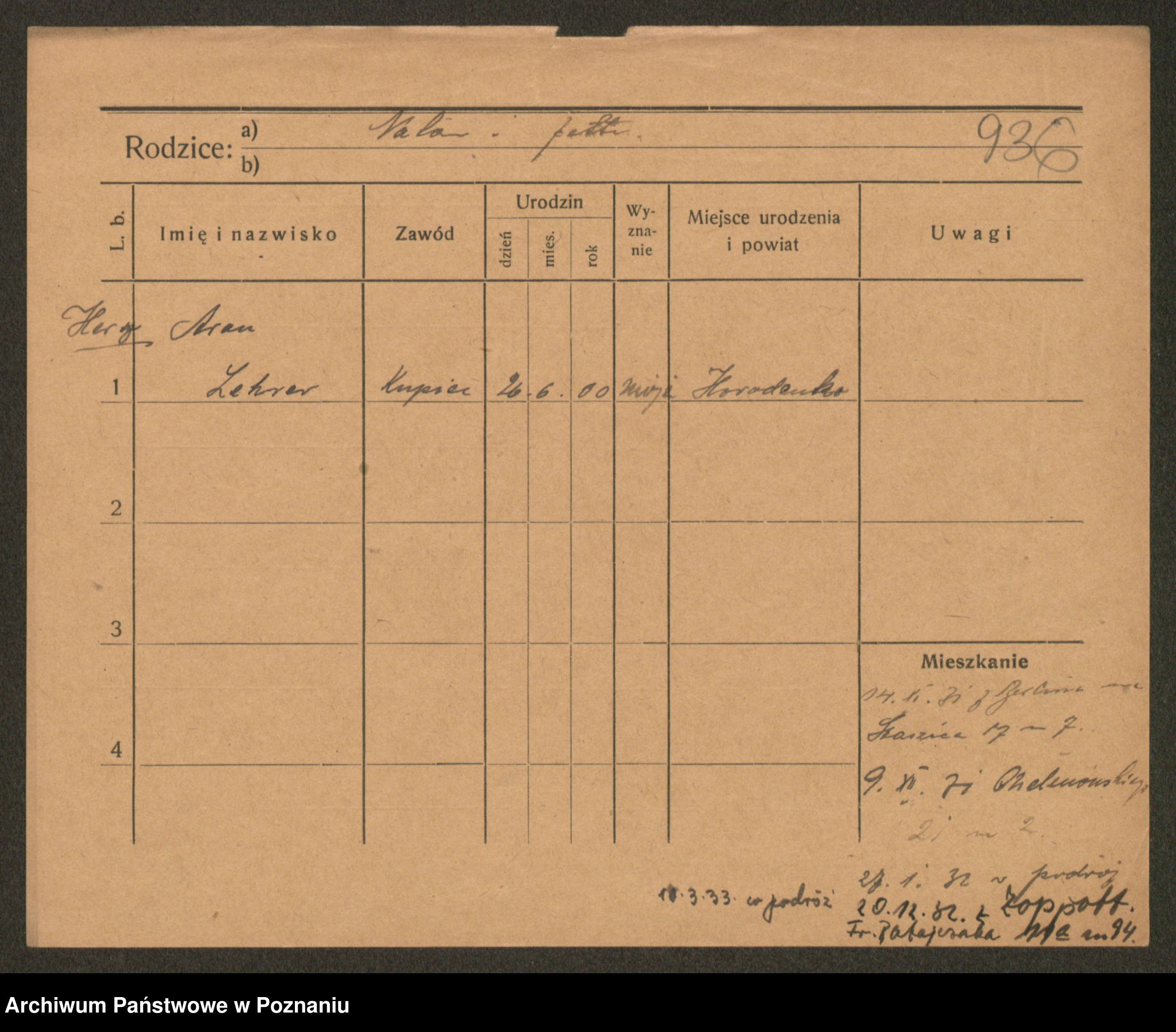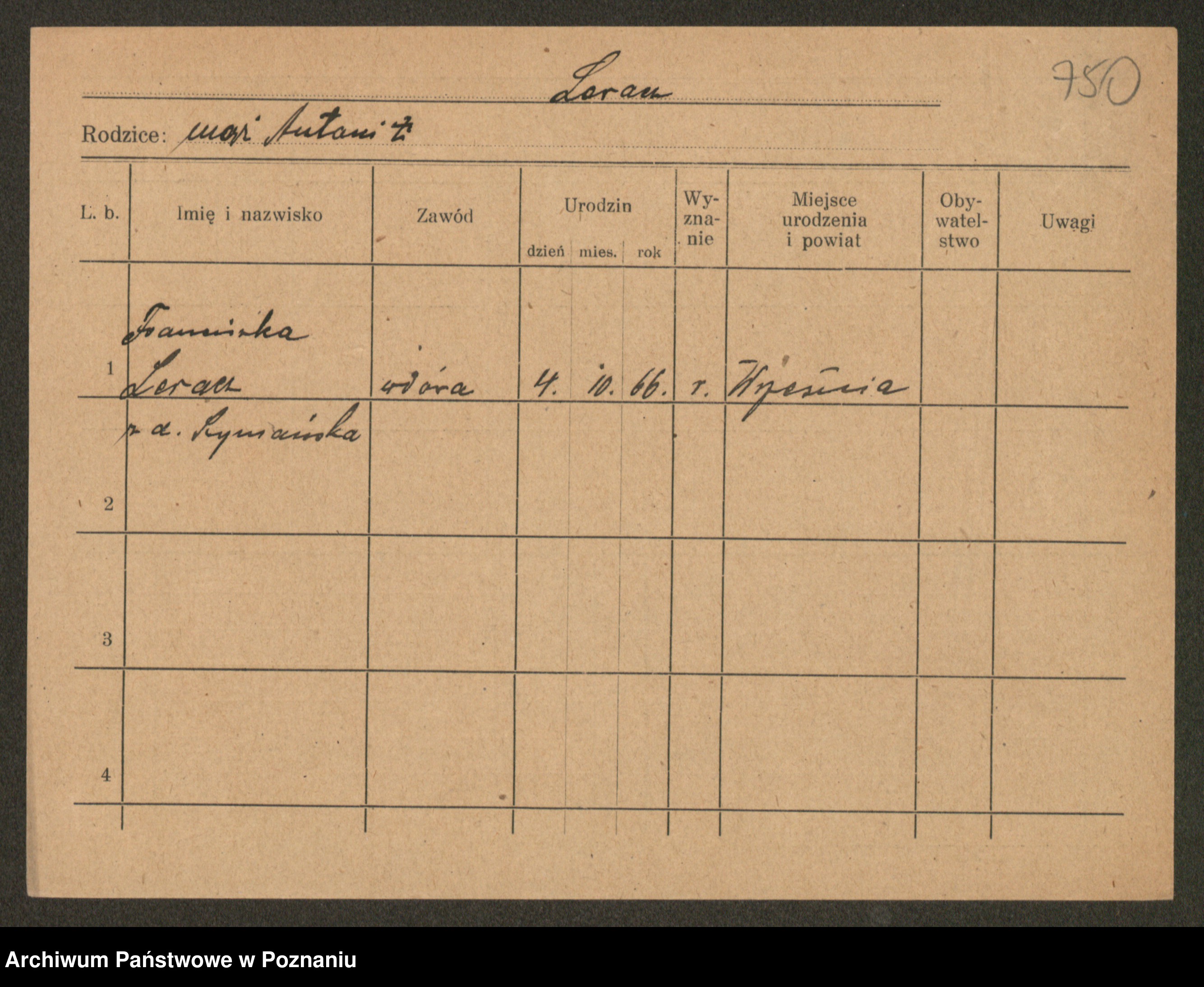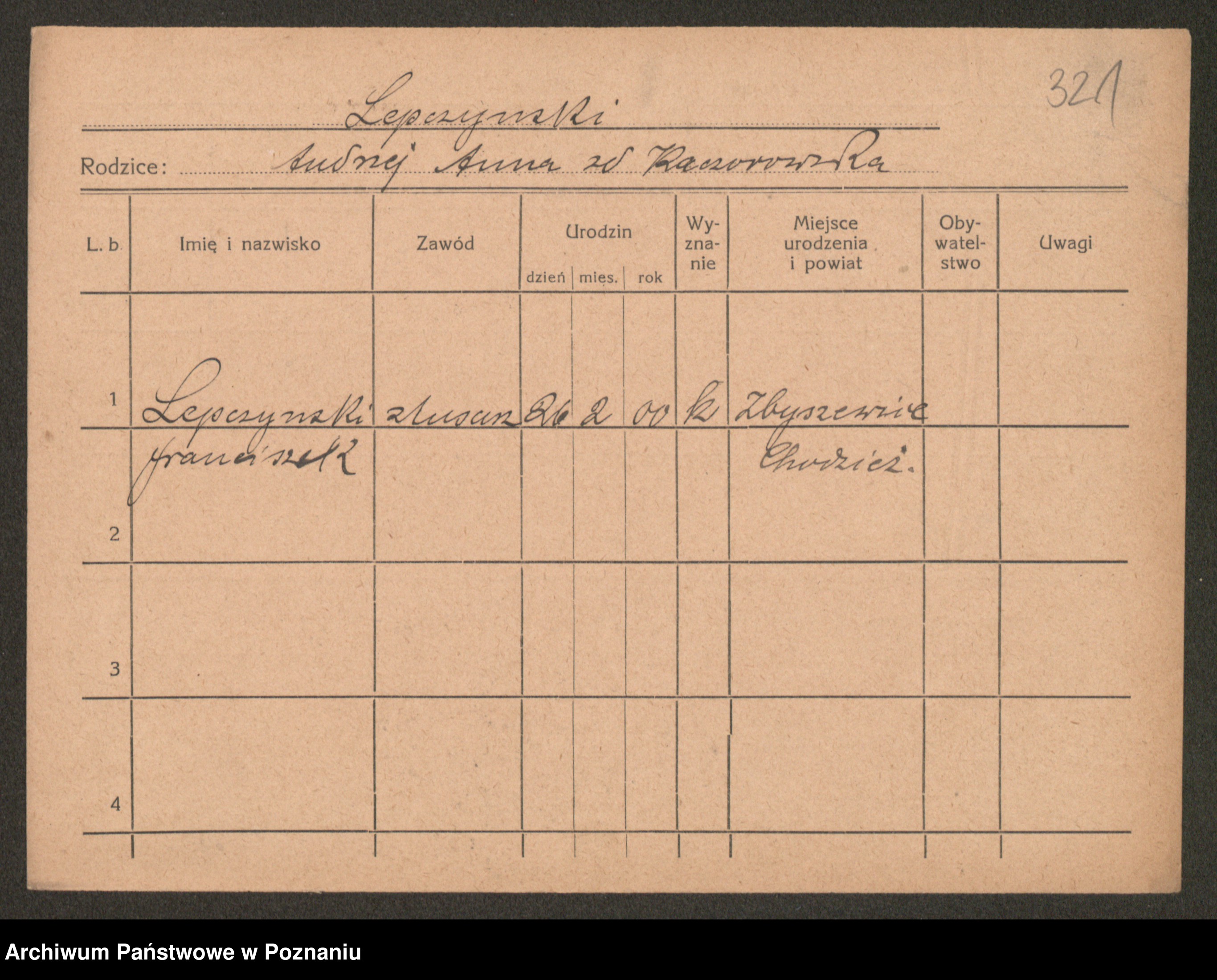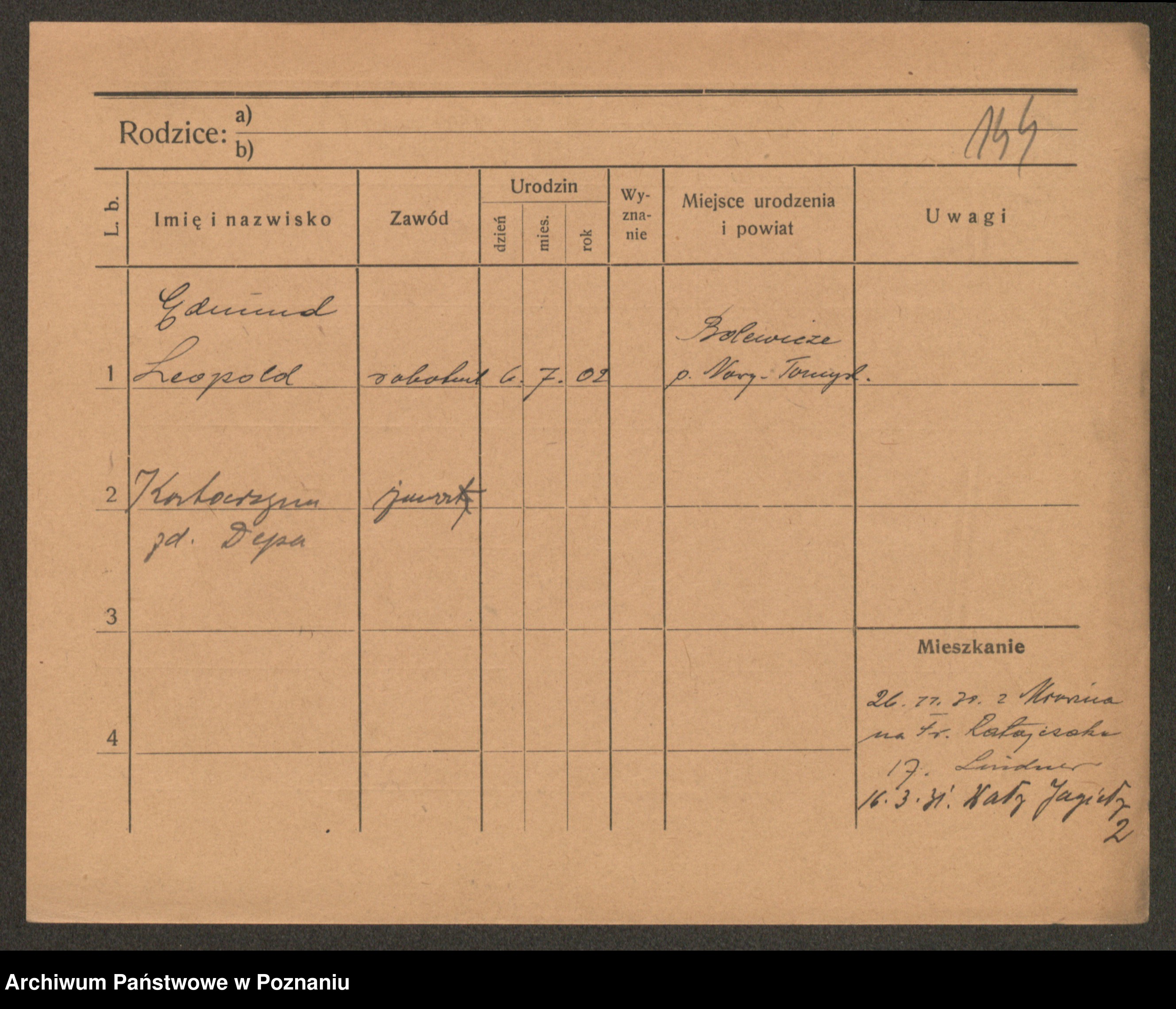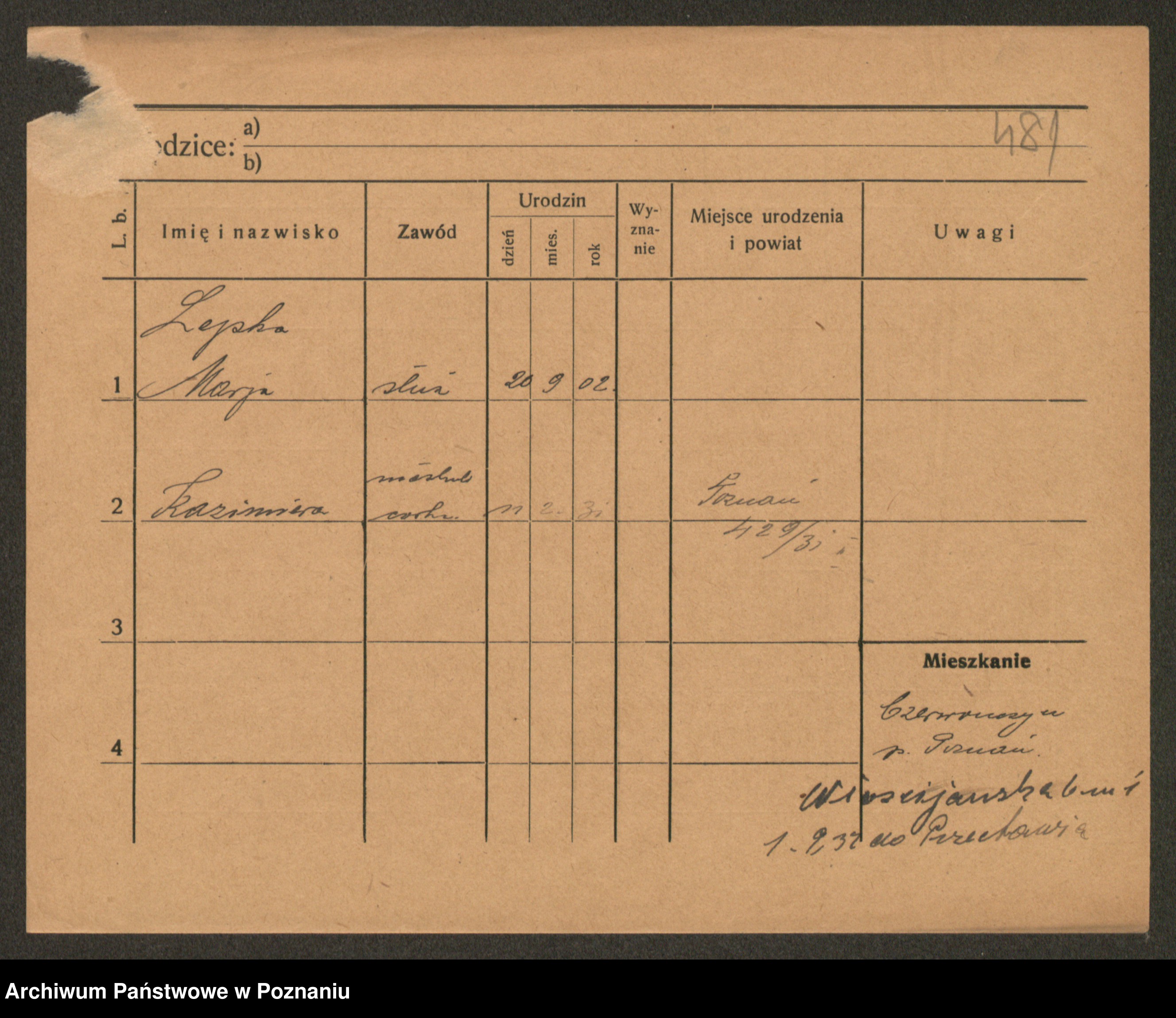 Podgląd karty osobowej dostępny jest po kliknięciu na nazwisko lub ikonkę karty. Można dokonywać powiększenia (ikony na górze) lub przechodzić między kolejnymi skanami (strzałki po bokach).