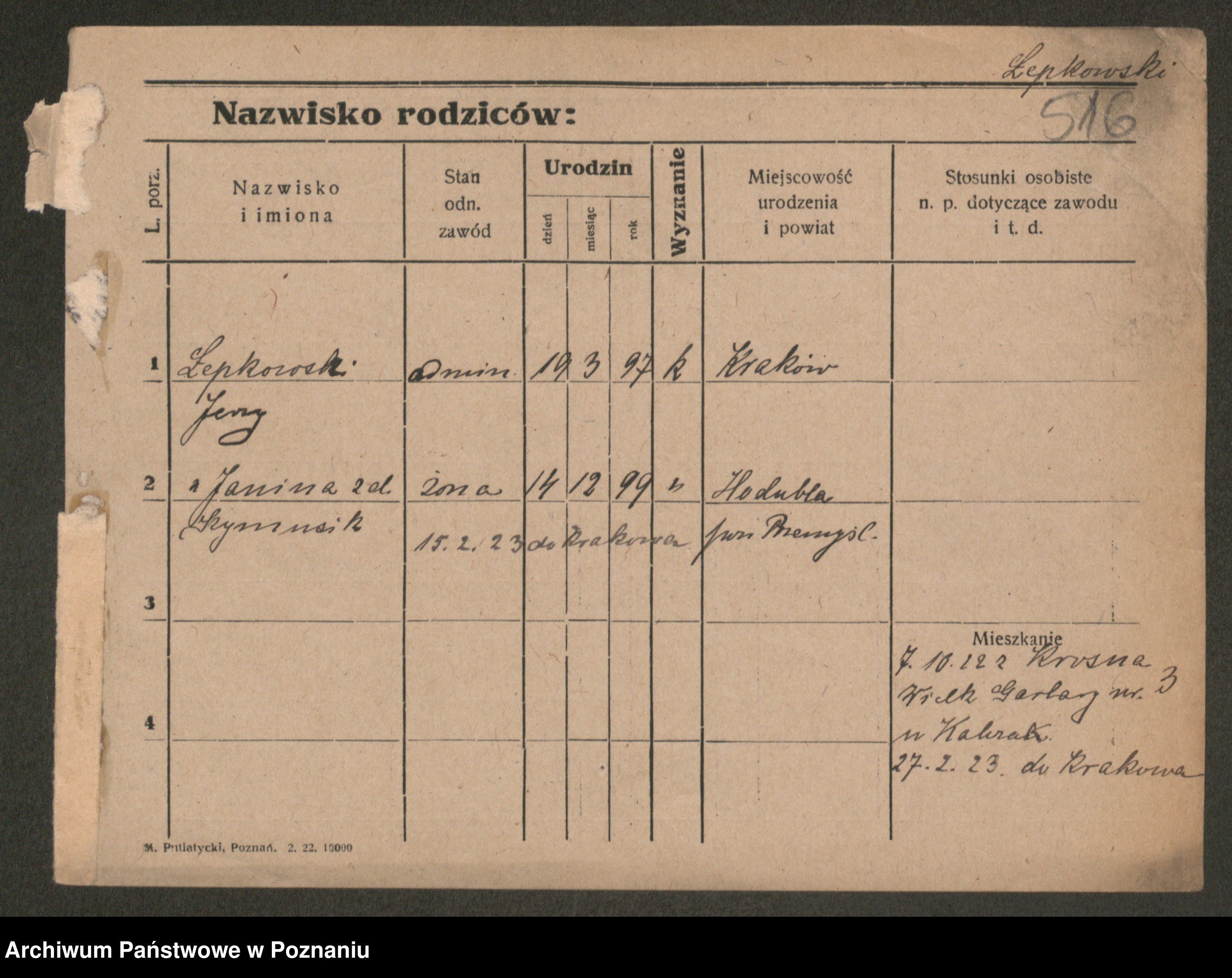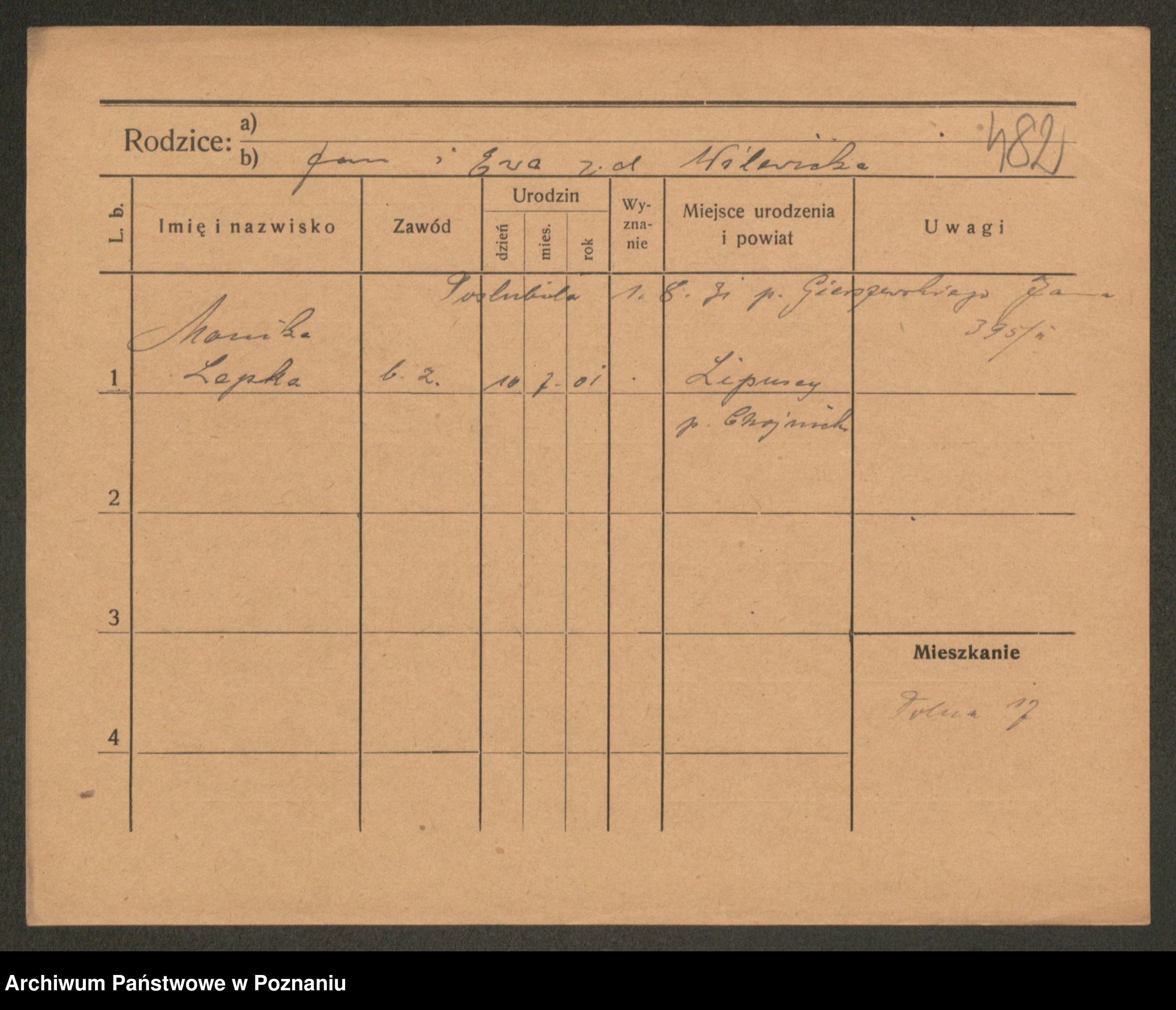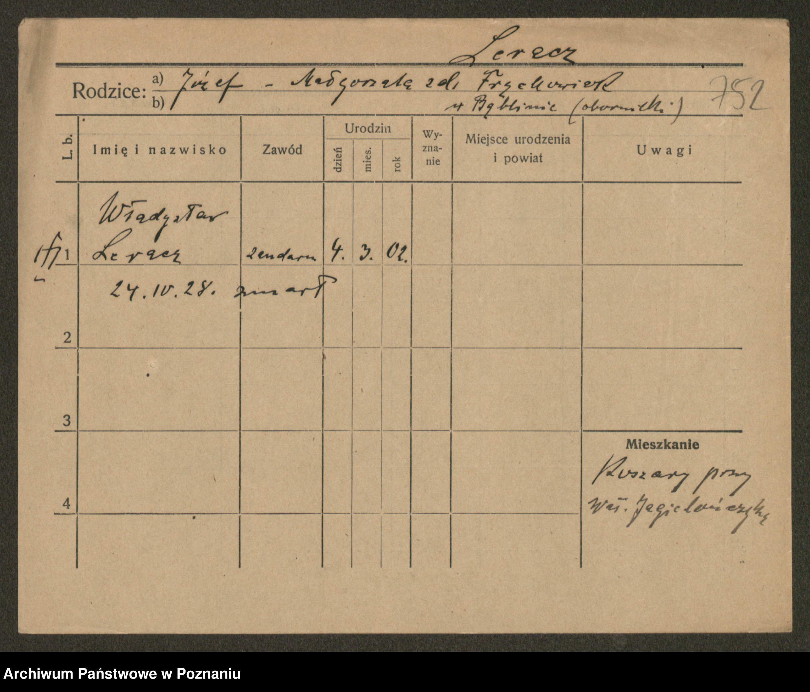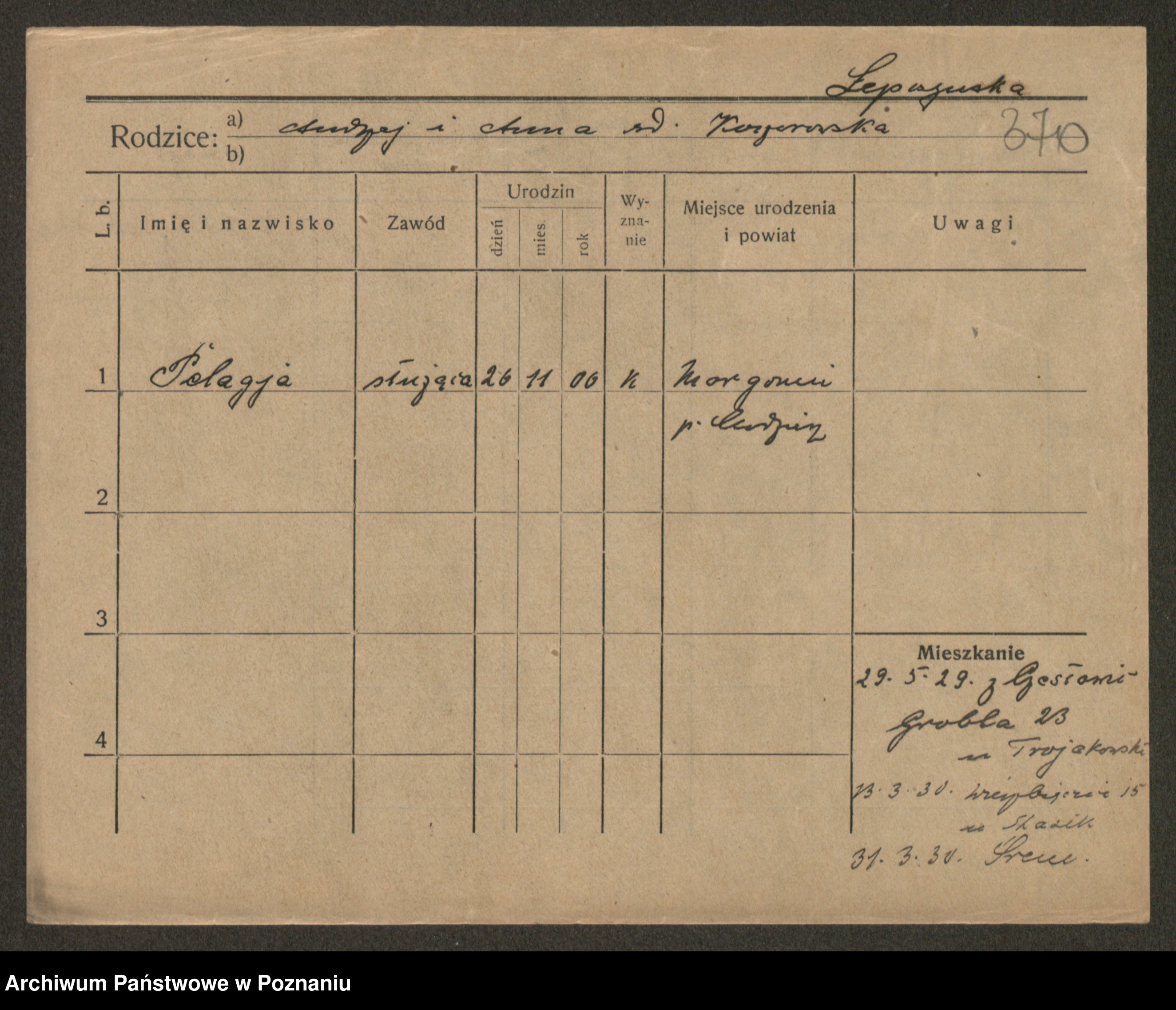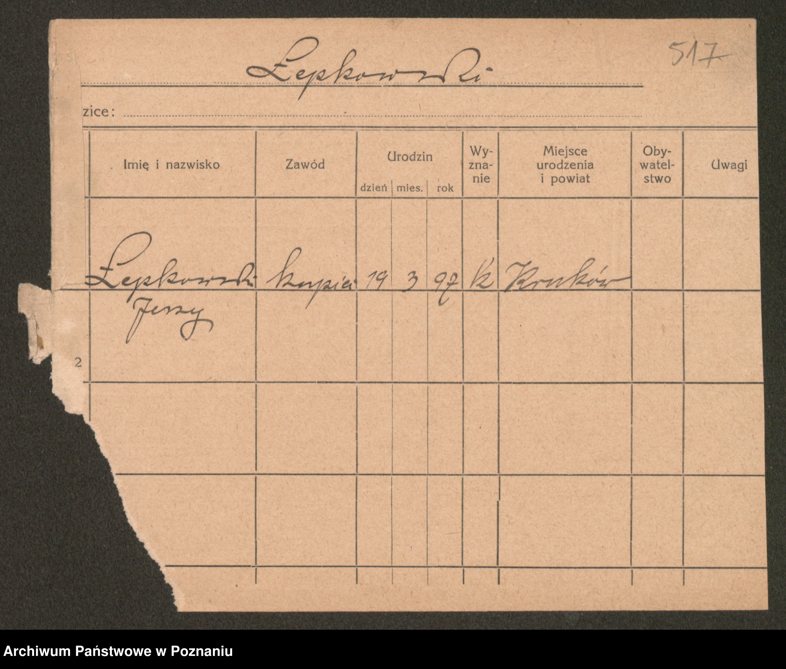 Podgląd karty osobowej dostępny jest po kliknięciu na nazwisko lub ikonkę karty. Można dokonywać powiększenia (ikony na górze) lub przechodzić między kolejnymi skanami (strzałki po bokach).