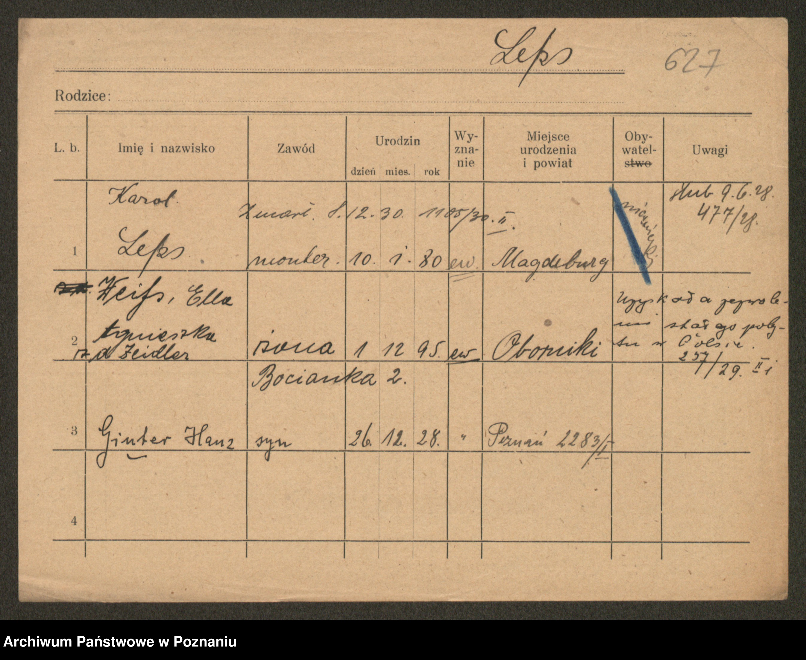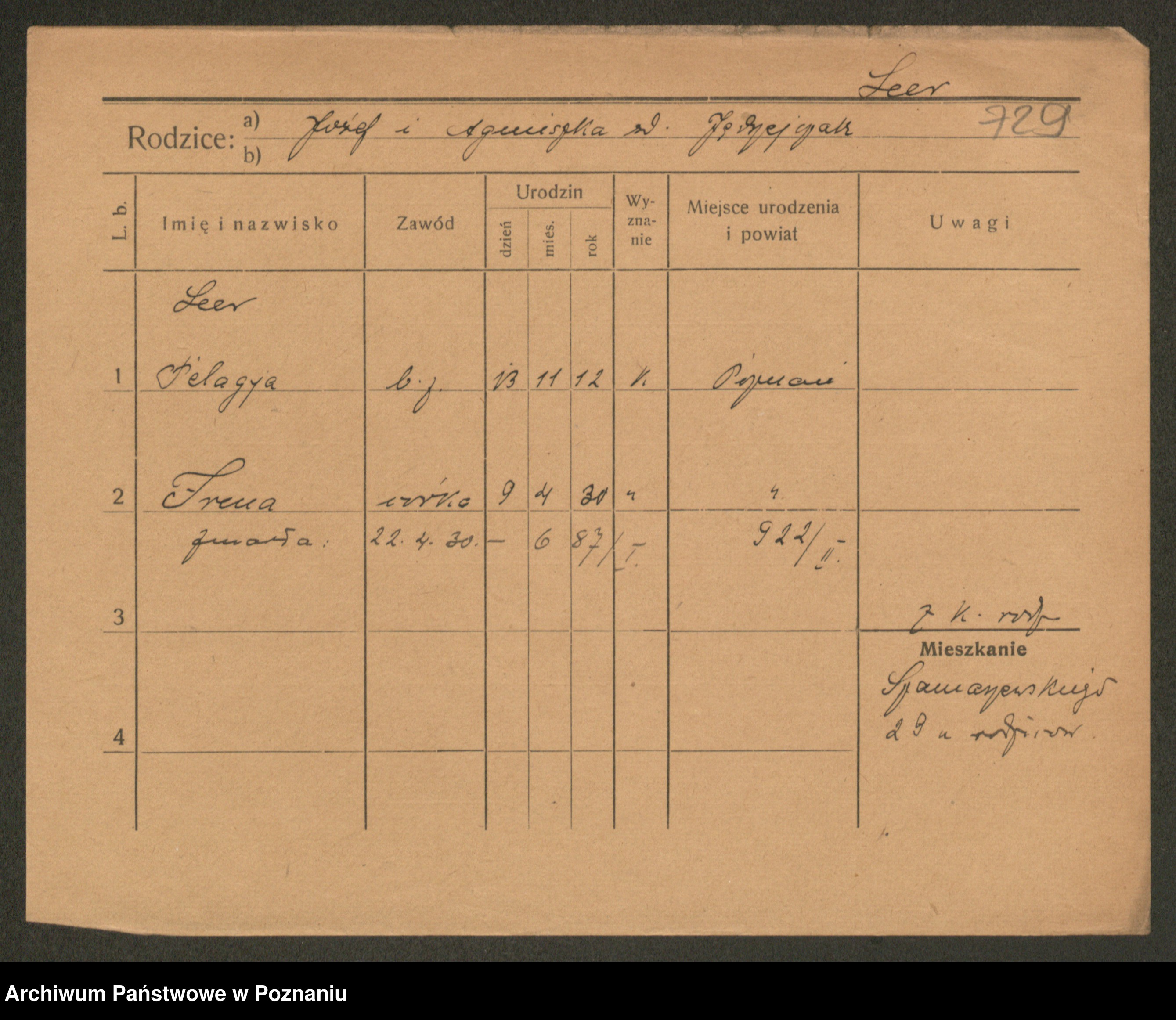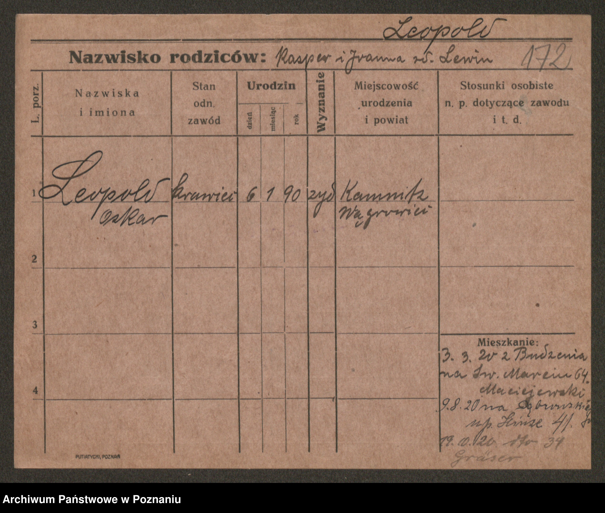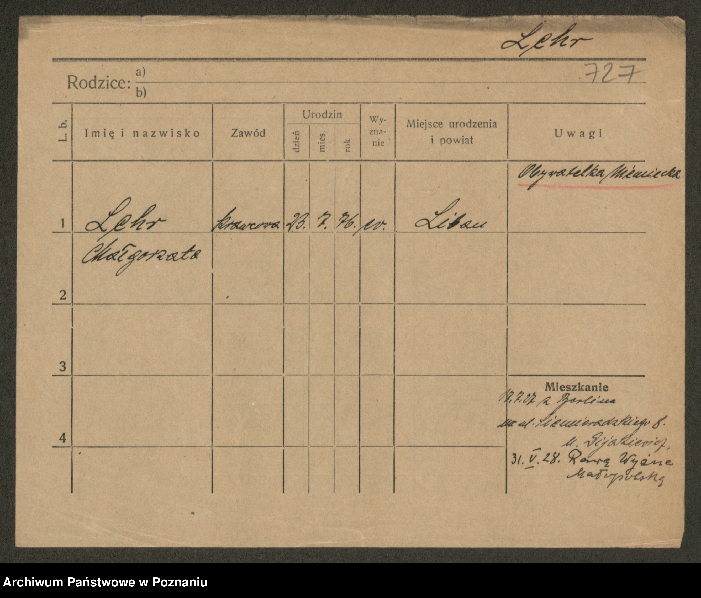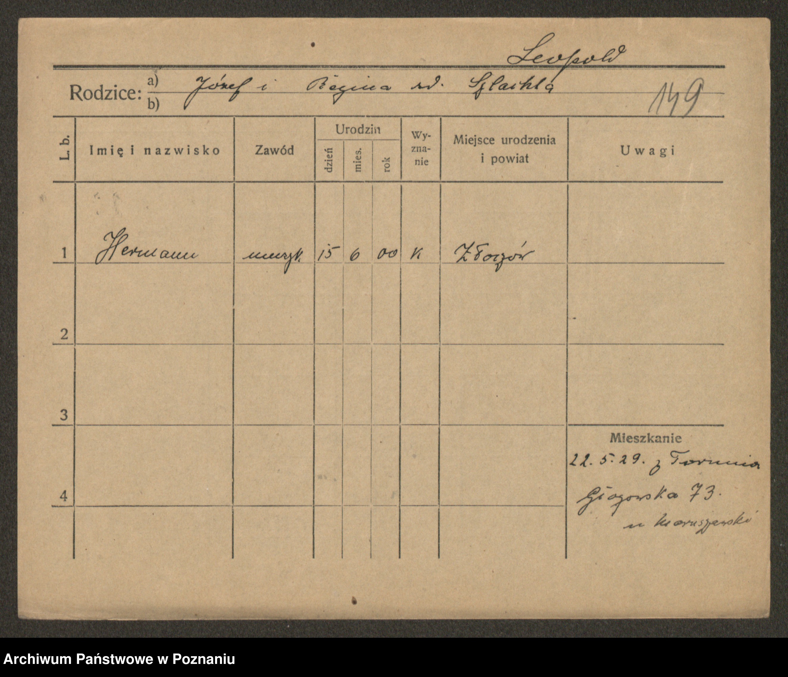 Podgląd karty osobowej dostępny jest po kliknięciu na nazwisko lub ikonkę karty. Można dokonywać powiększenia (ikony na górze) lub przechodzić między kolejnymi skanami (strzałki po bokach).
