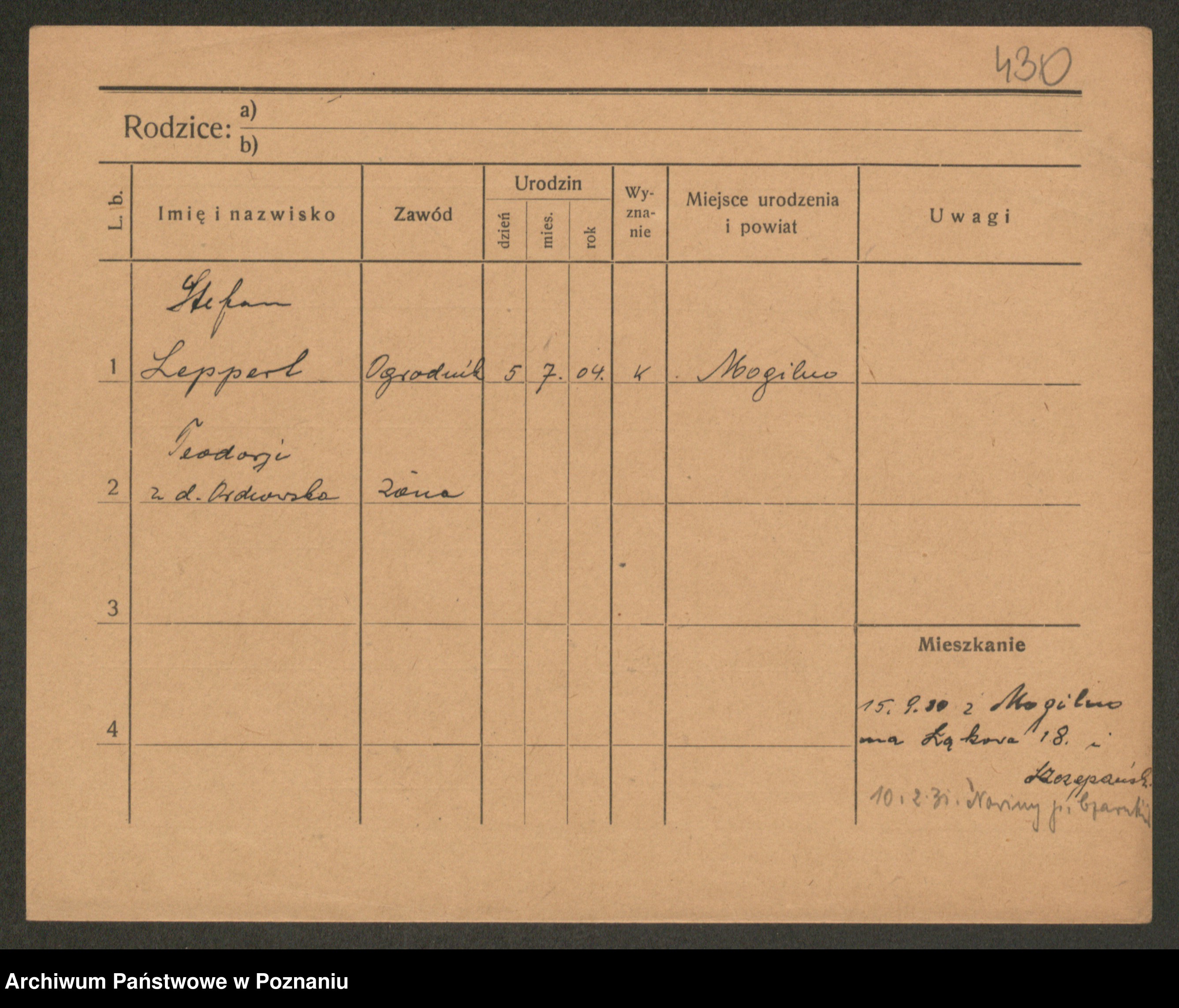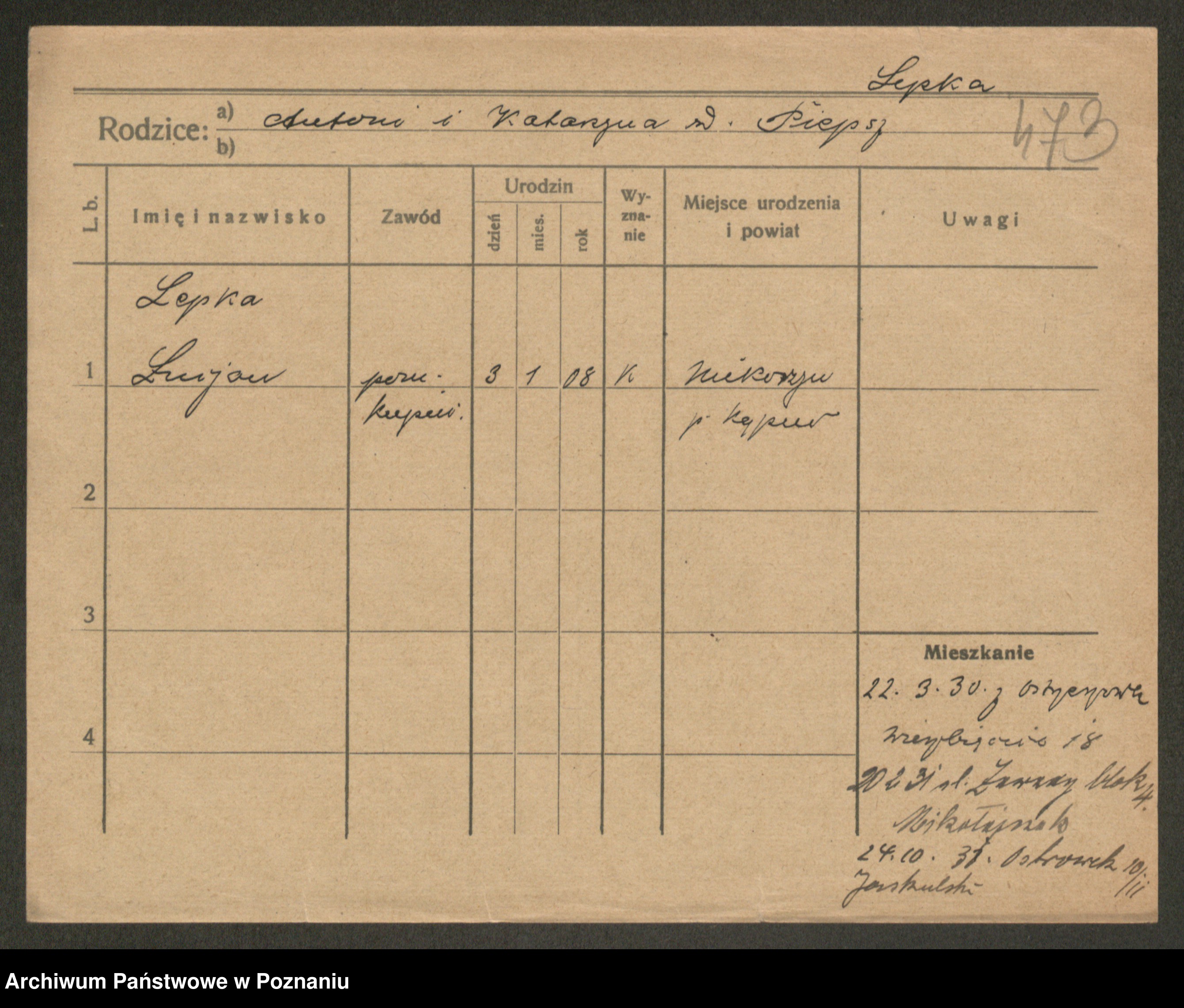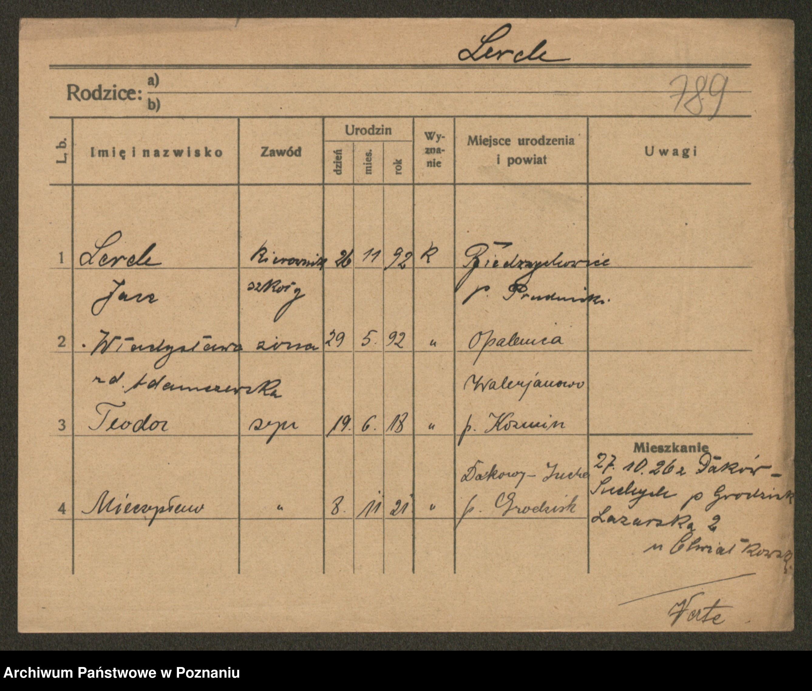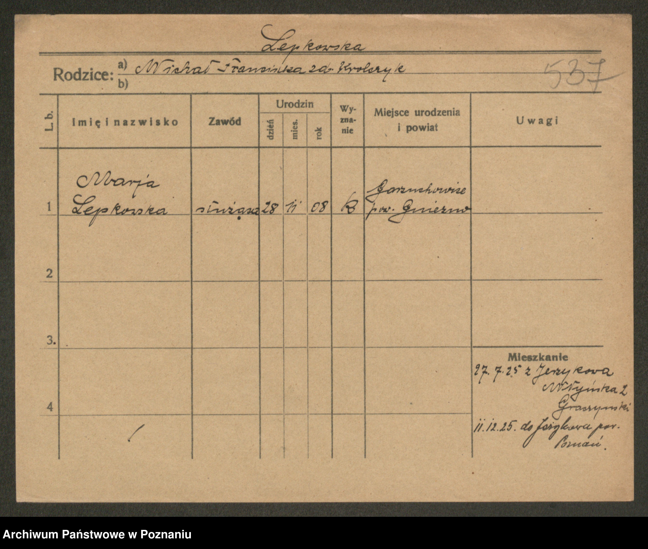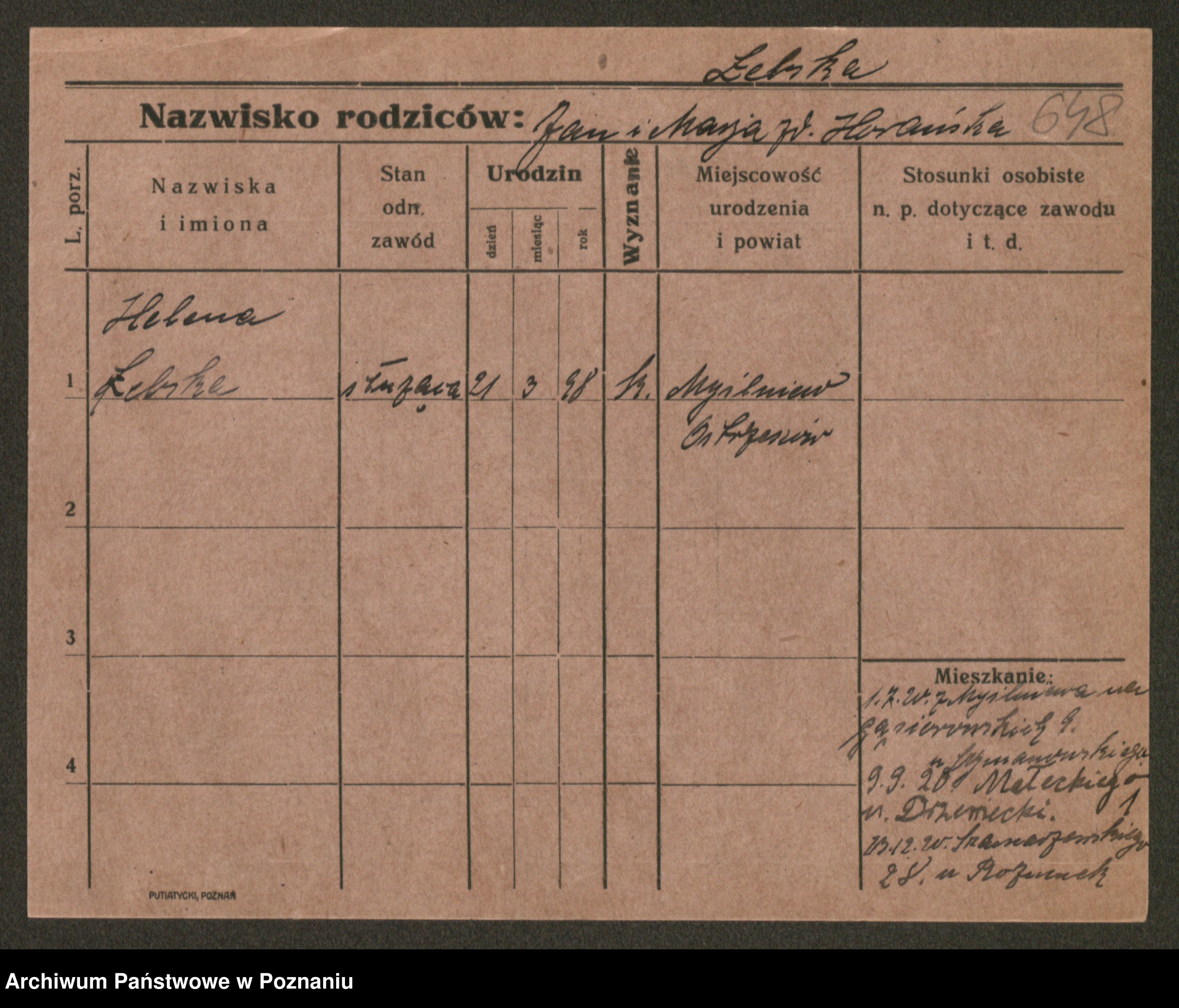 Podgląd karty osobowej dostępny jest po kliknięciu na nazwisko lub ikonkę karty. Można dokonywać powiększenia (ikony na górze) lub przechodzić między kolejnymi skanami (strzałki po bokach).