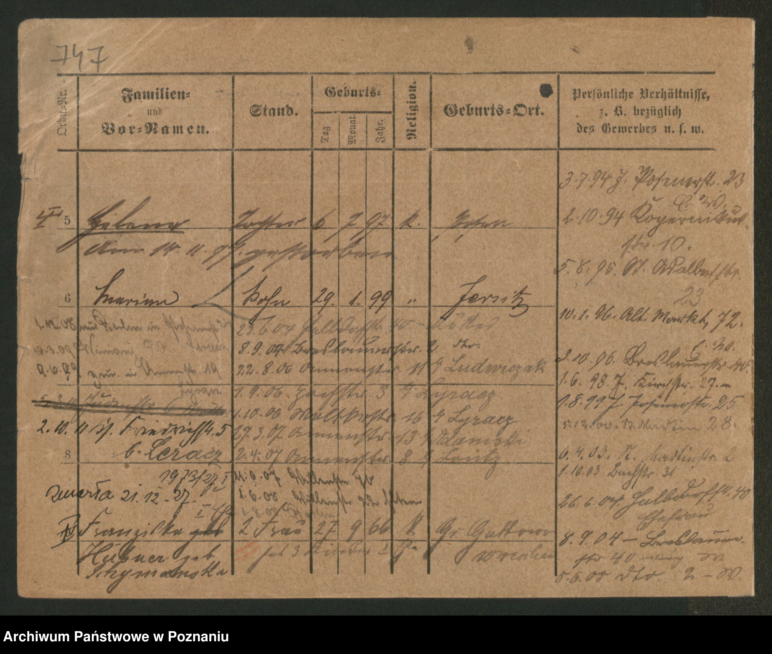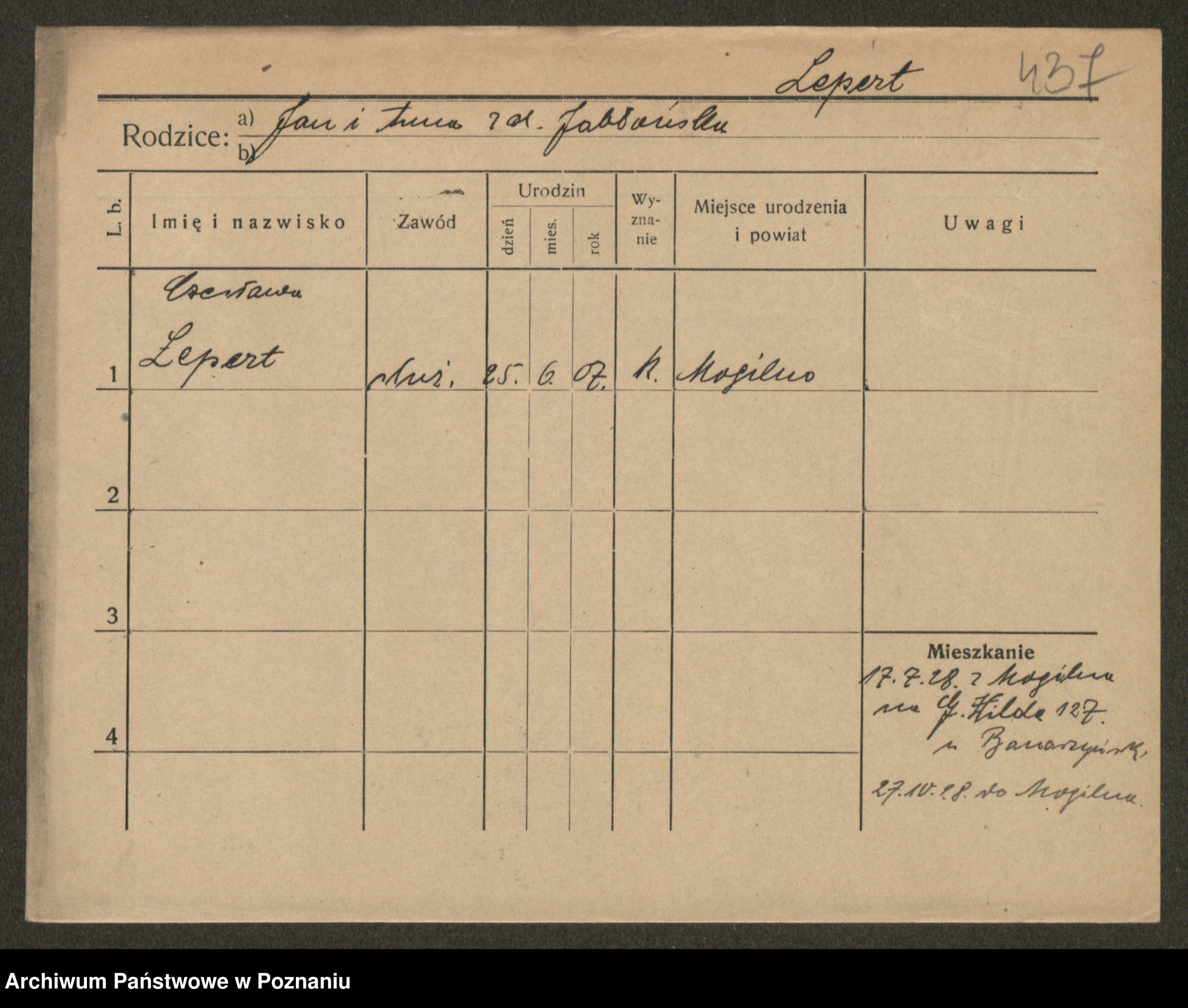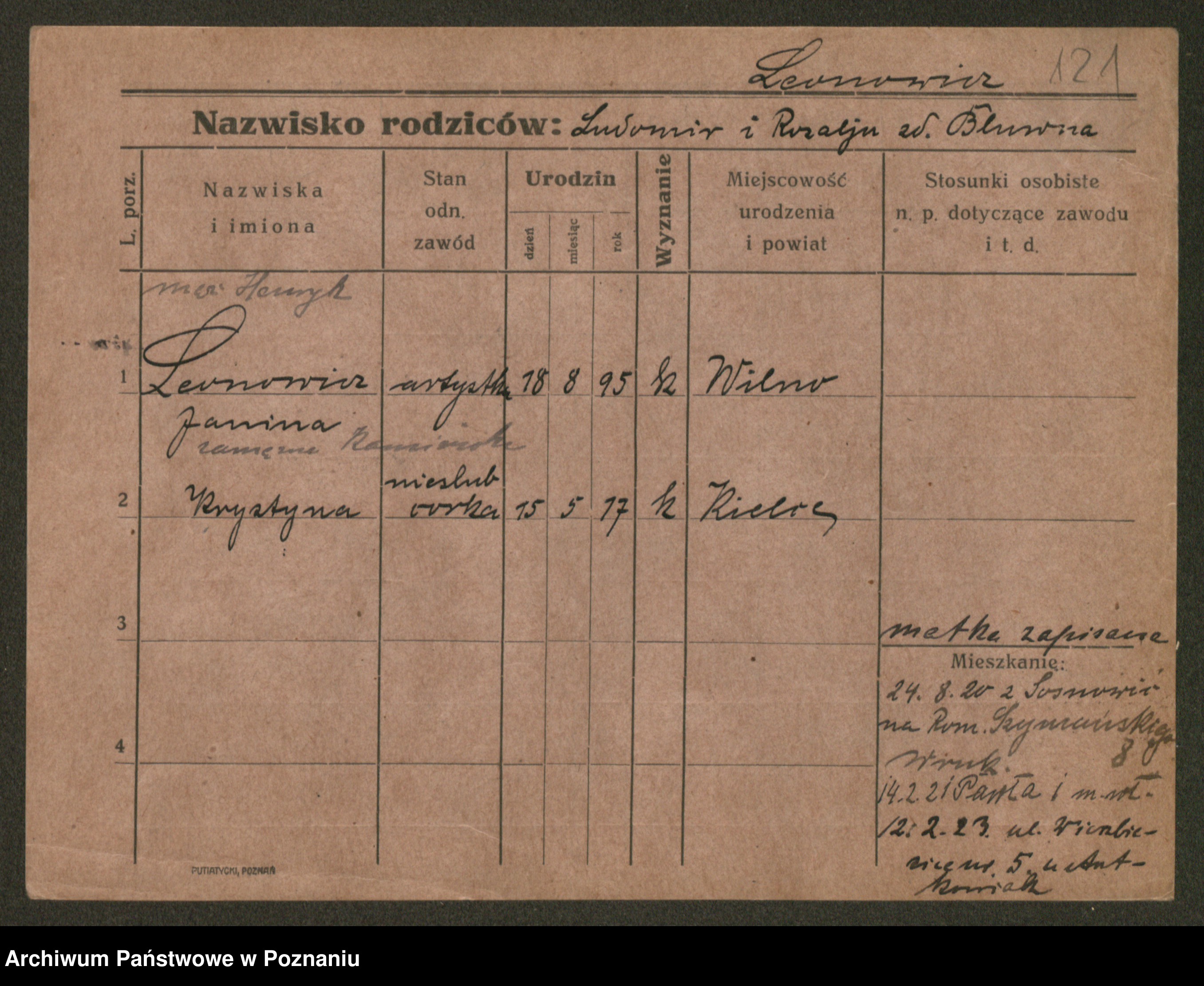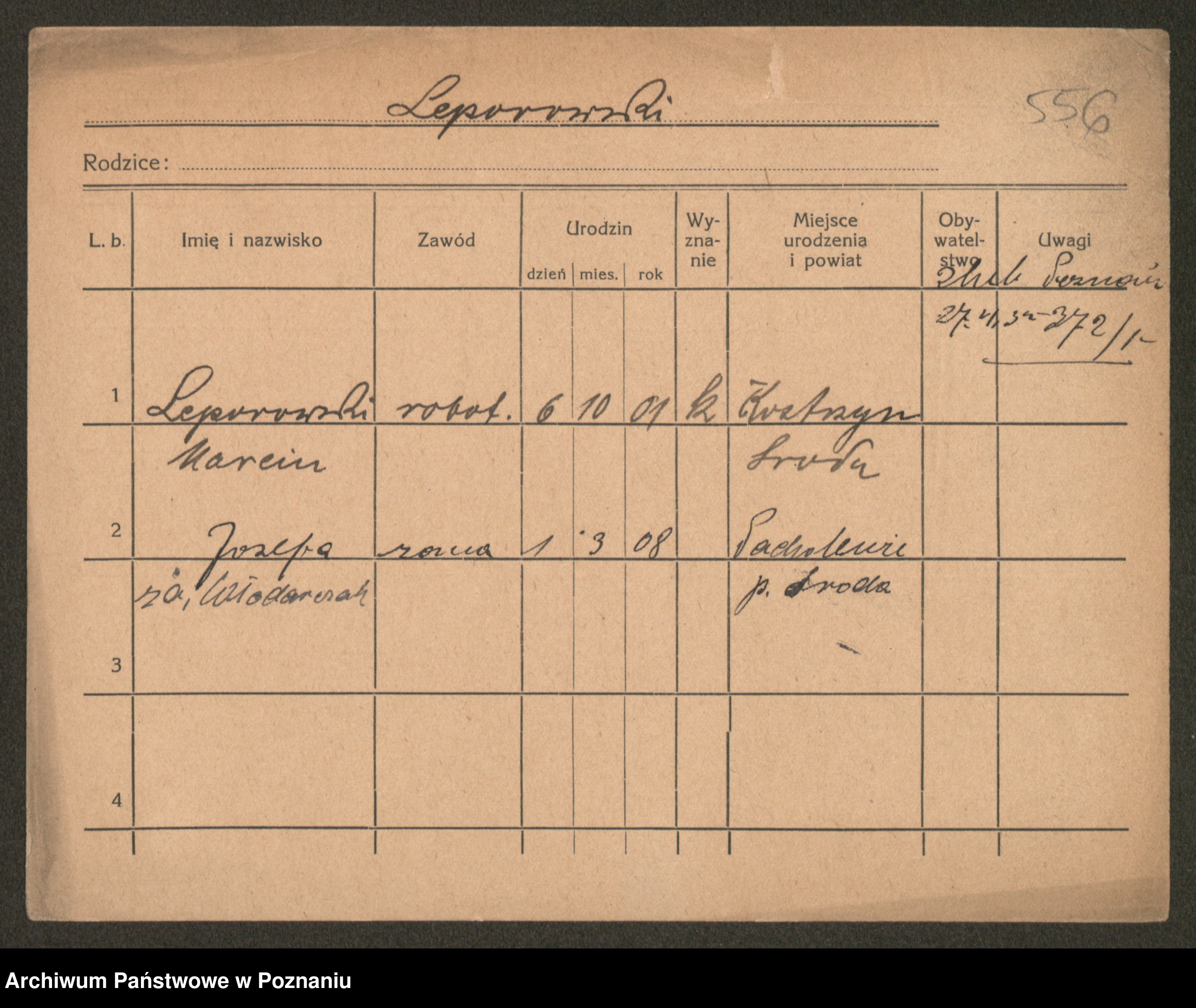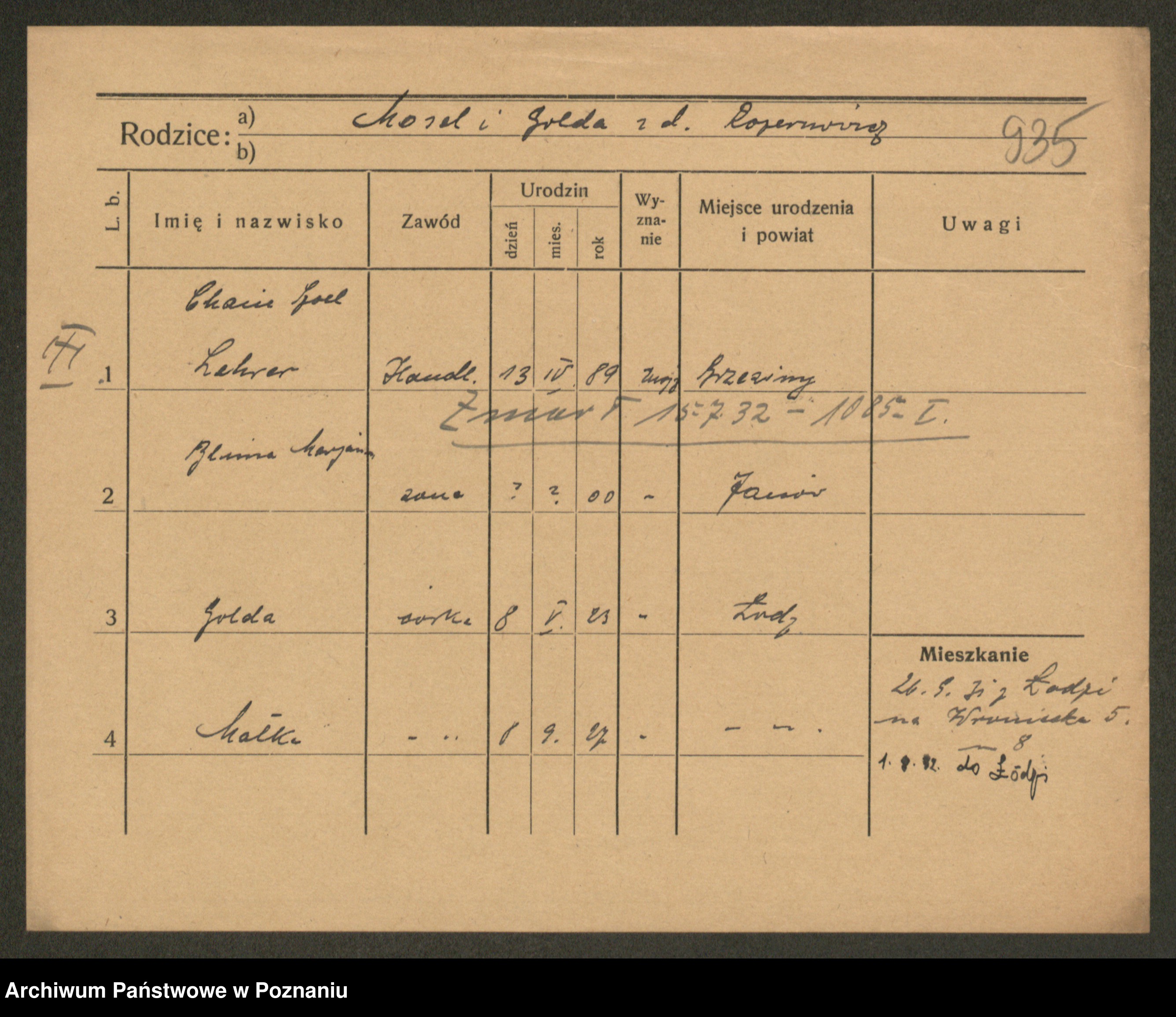 Podgląd karty osobowej dostępny jest po kliknięciu na nazwisko lub ikonkę karty. Można dokonywać powiększenia (ikony na górze) lub przechodzić między kolejnymi skanami (strzałki po bokach).