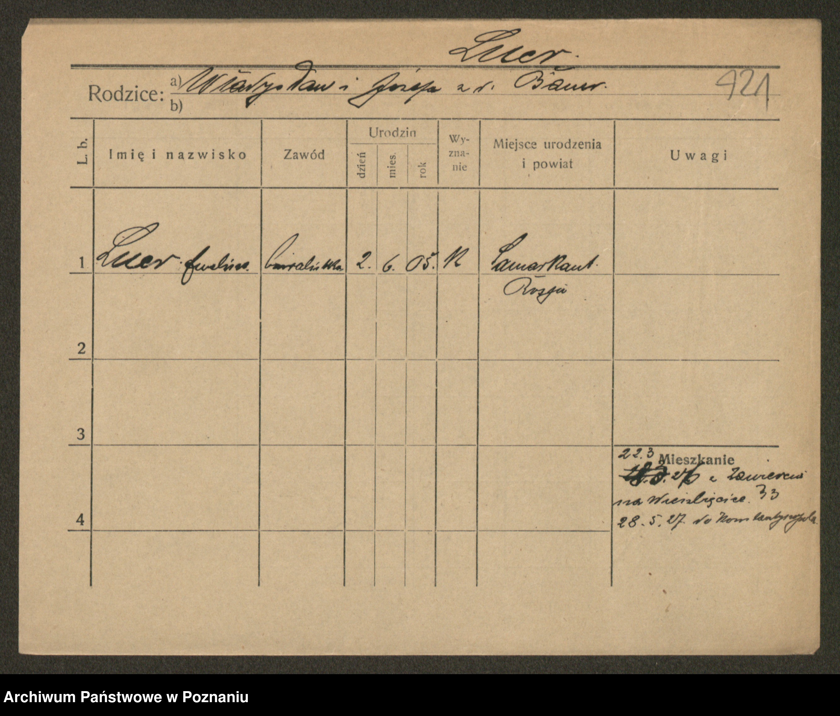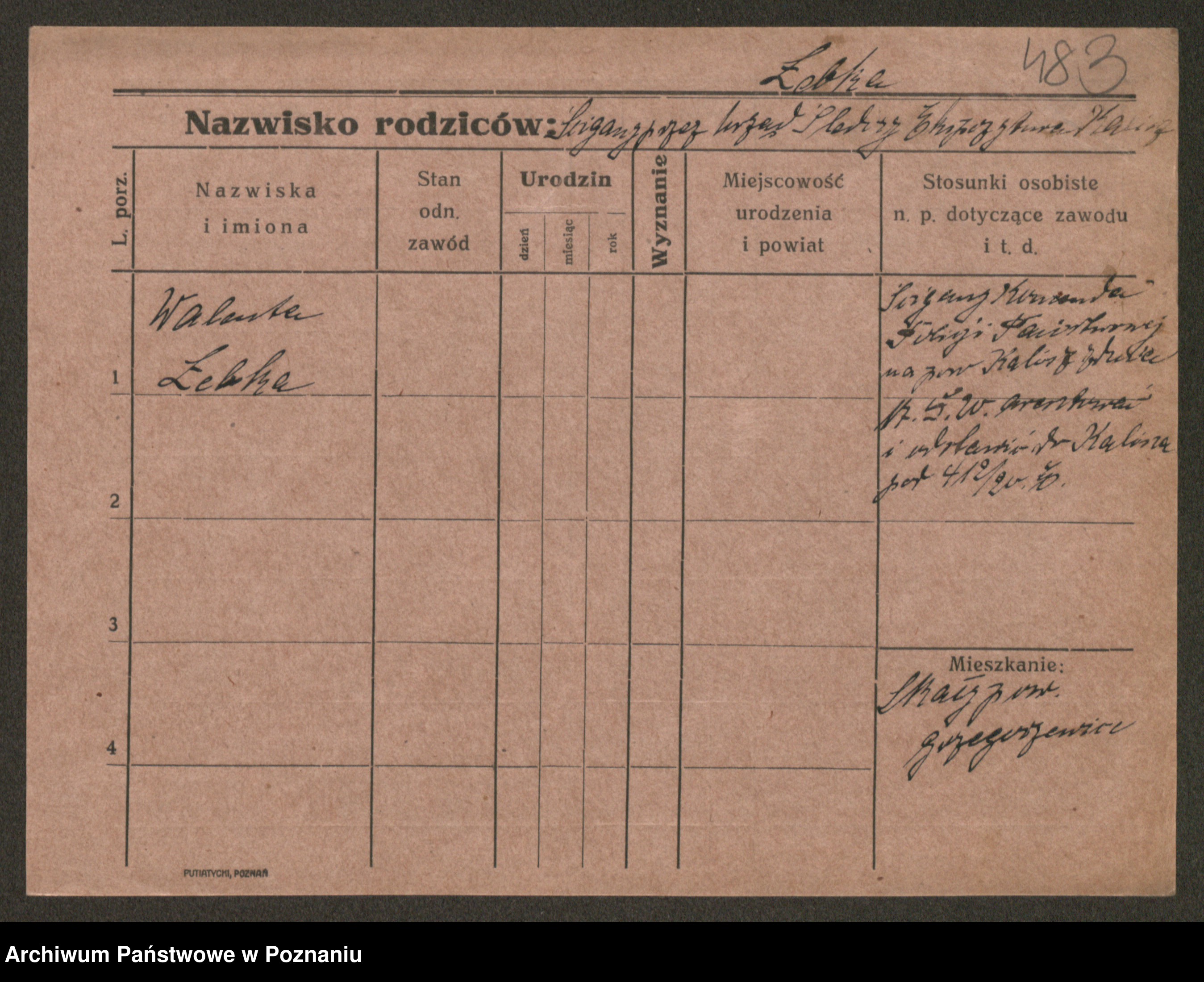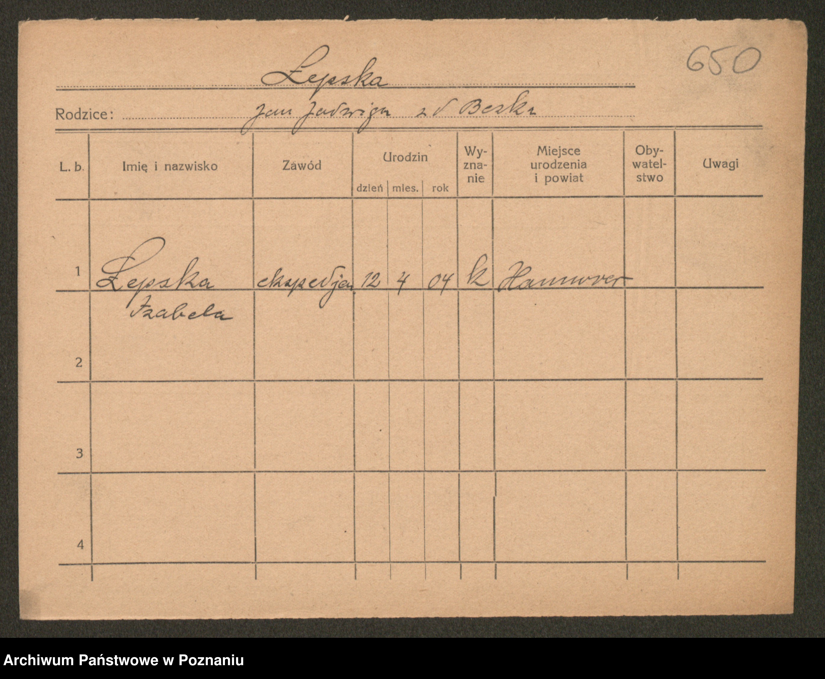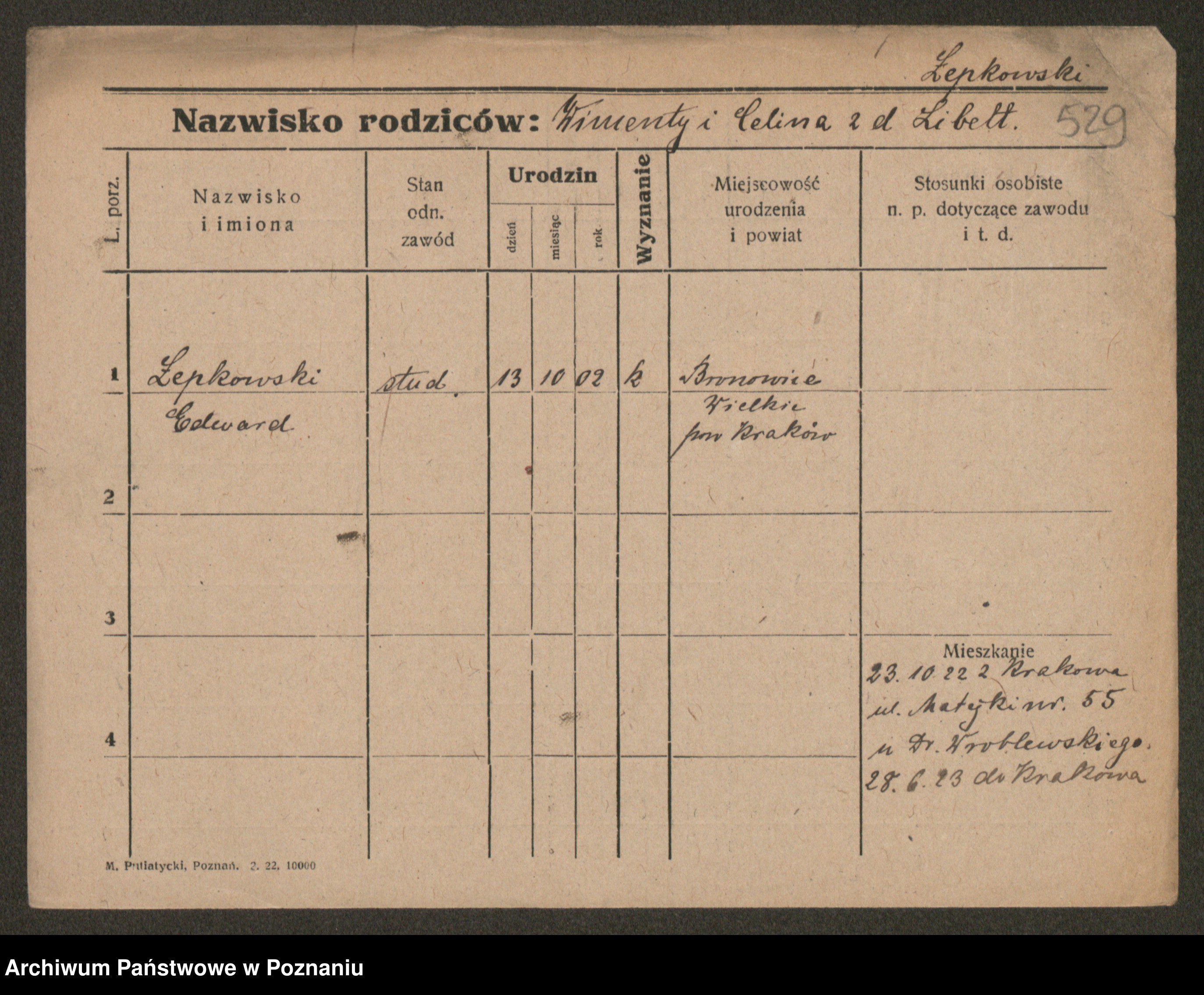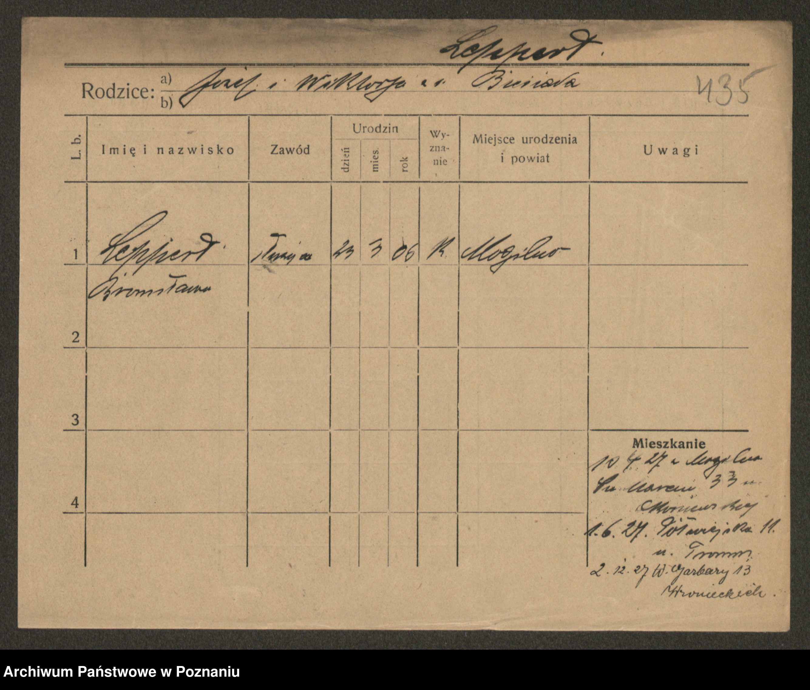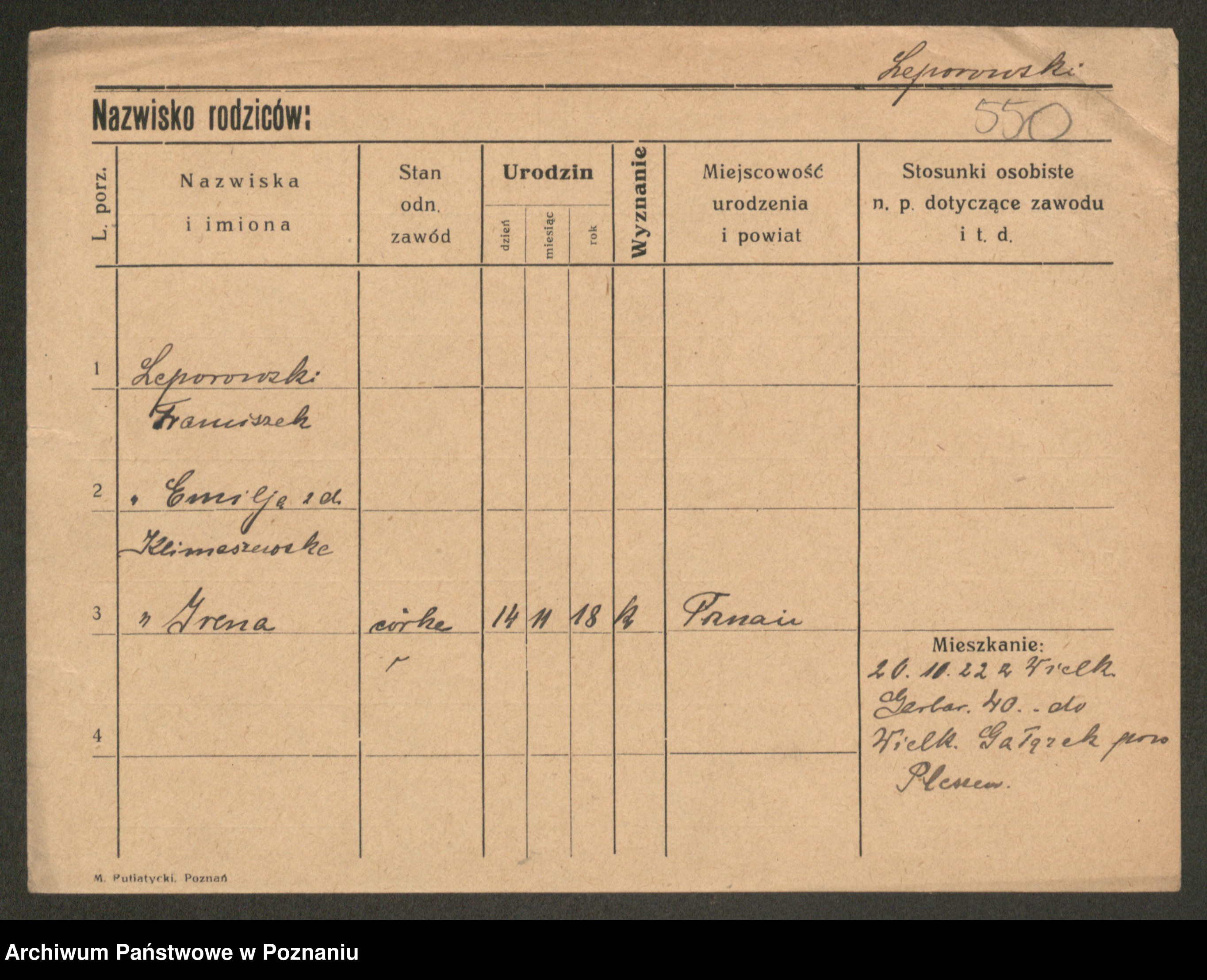 Podgląd karty osobowej dostępny jest po kliknięciu na nazwisko lub ikonkę karty. Można dokonywać powiększenia (ikony na górze) lub przechodzić między kolejnymi skanami (strzałki po bokach).