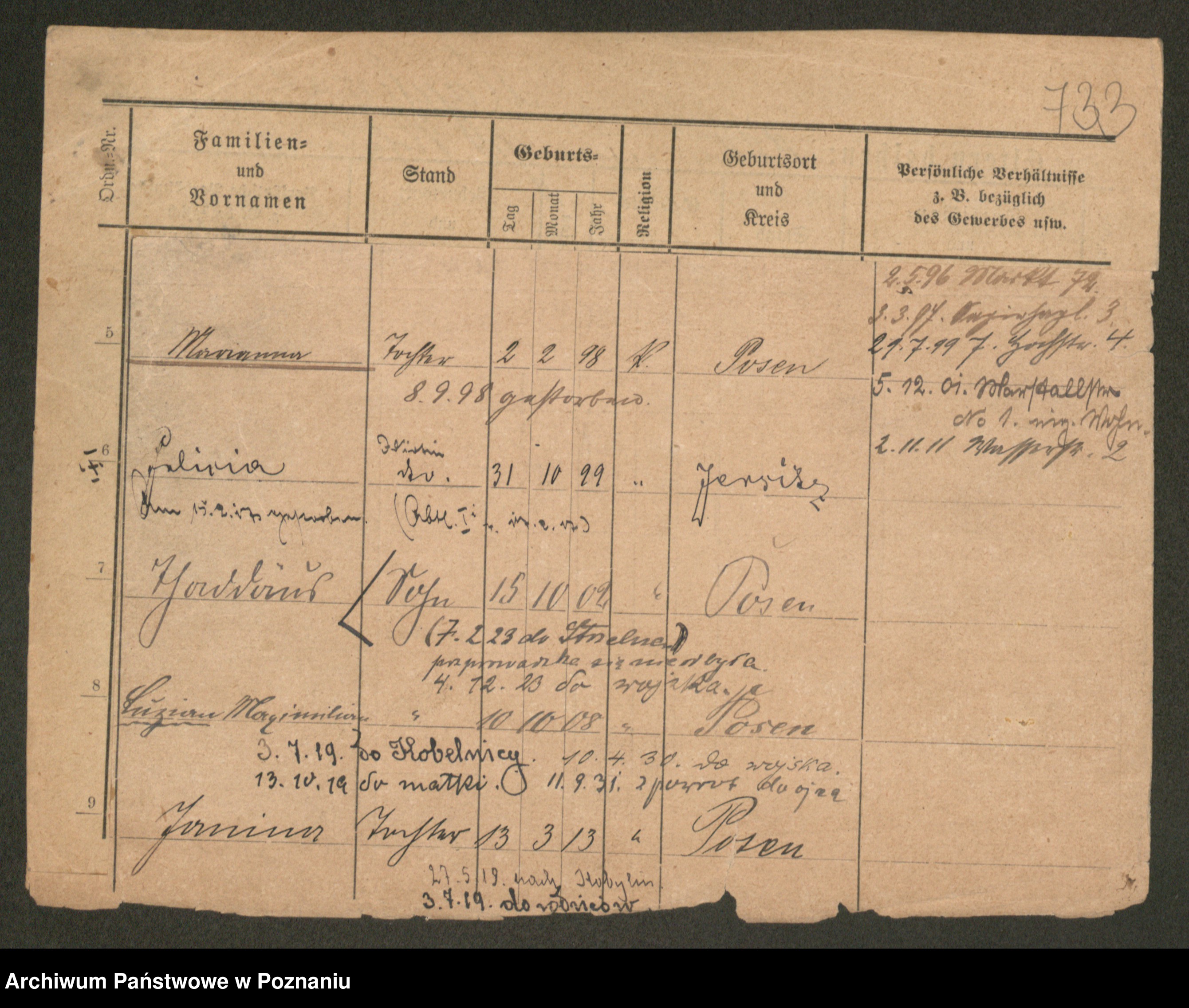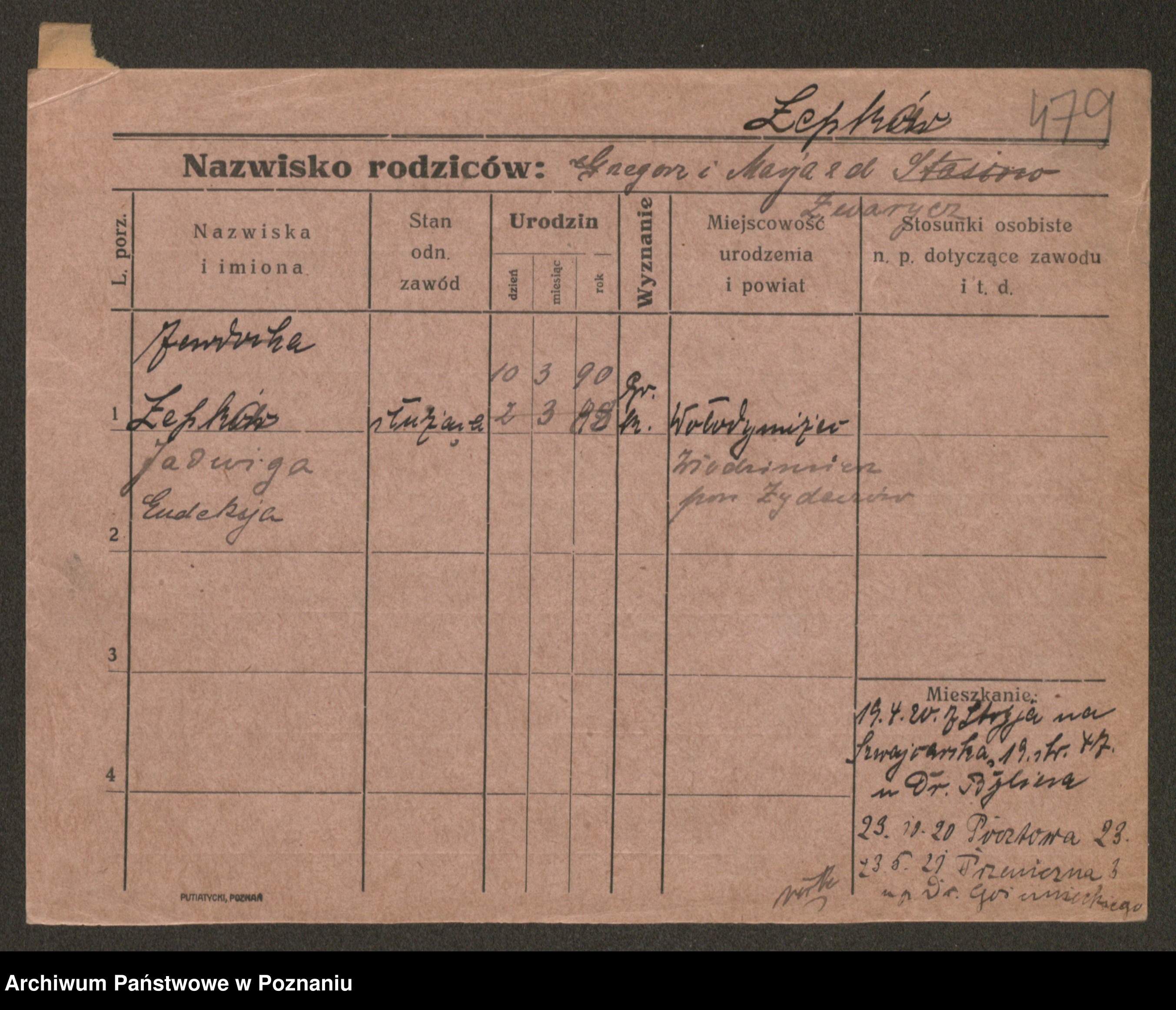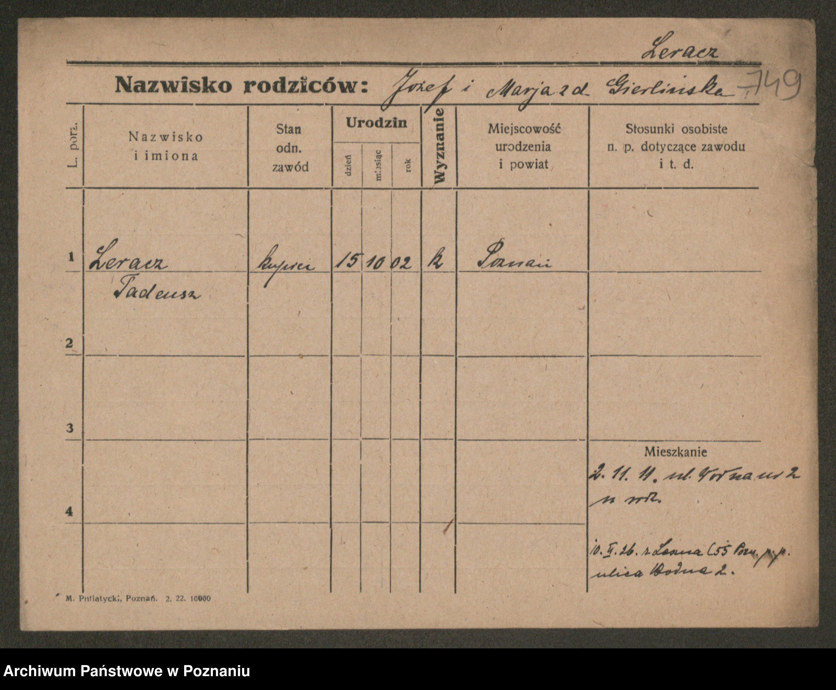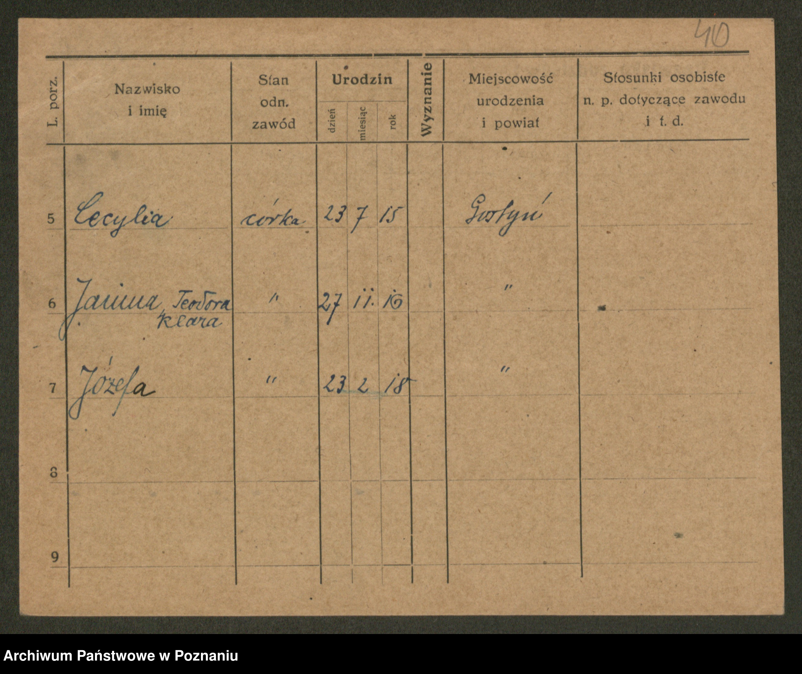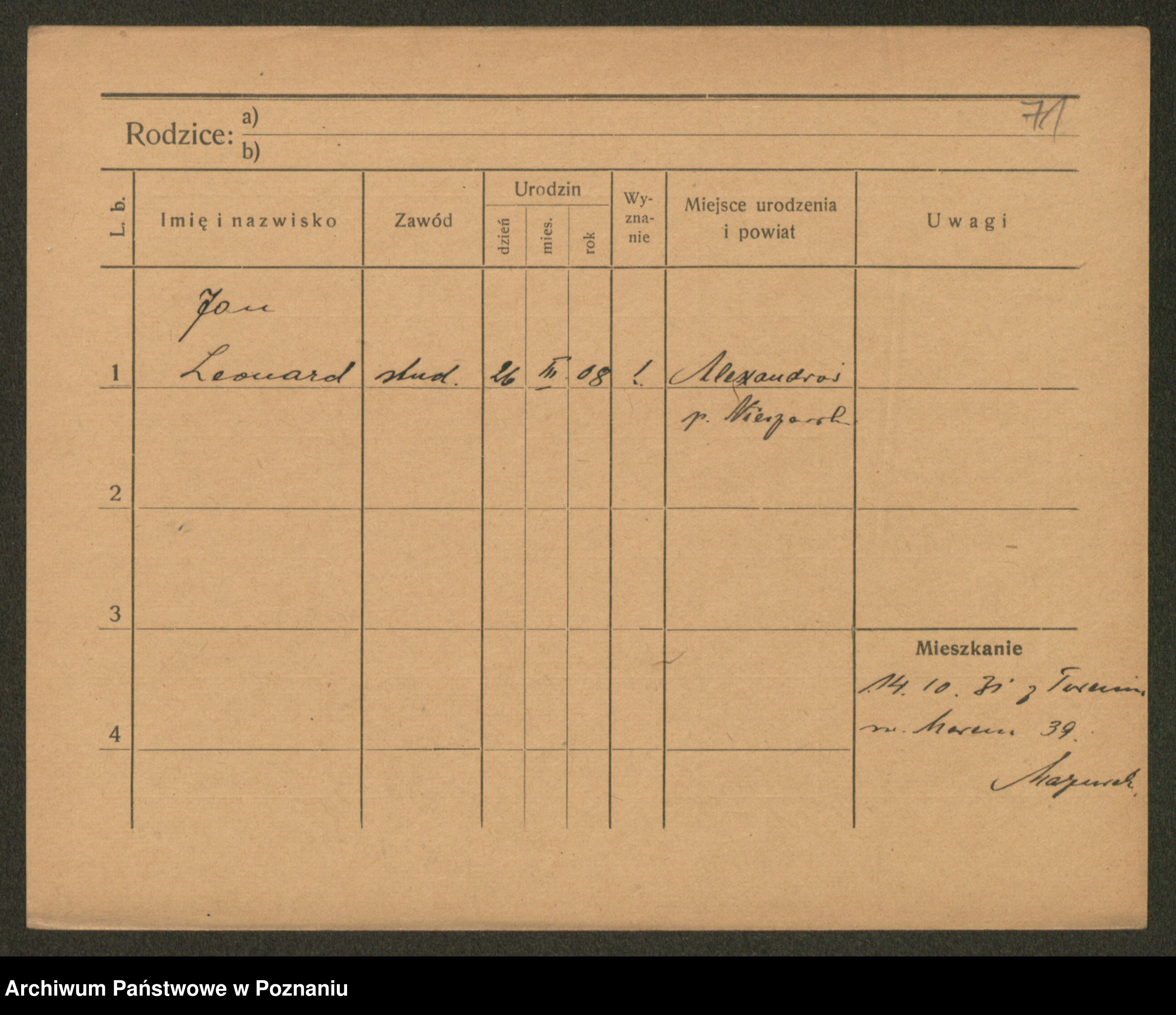 Podgląd karty osobowej dostępny jest po kliknięciu na nazwisko lub ikonkę karty. Można dokonywać powiększenia (ikony na górze) lub przechodzić między kolejnymi skanami (strzałki po bokach).