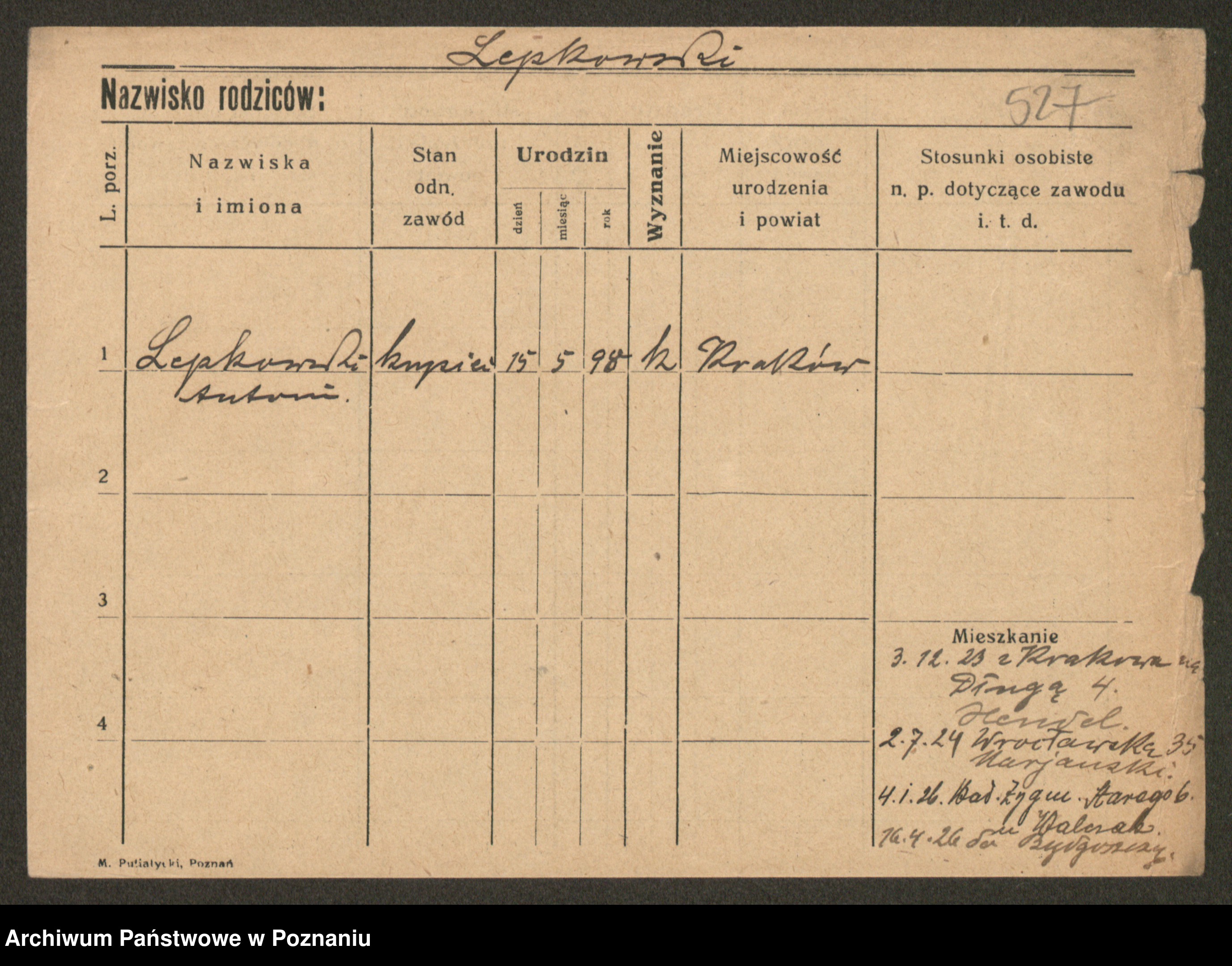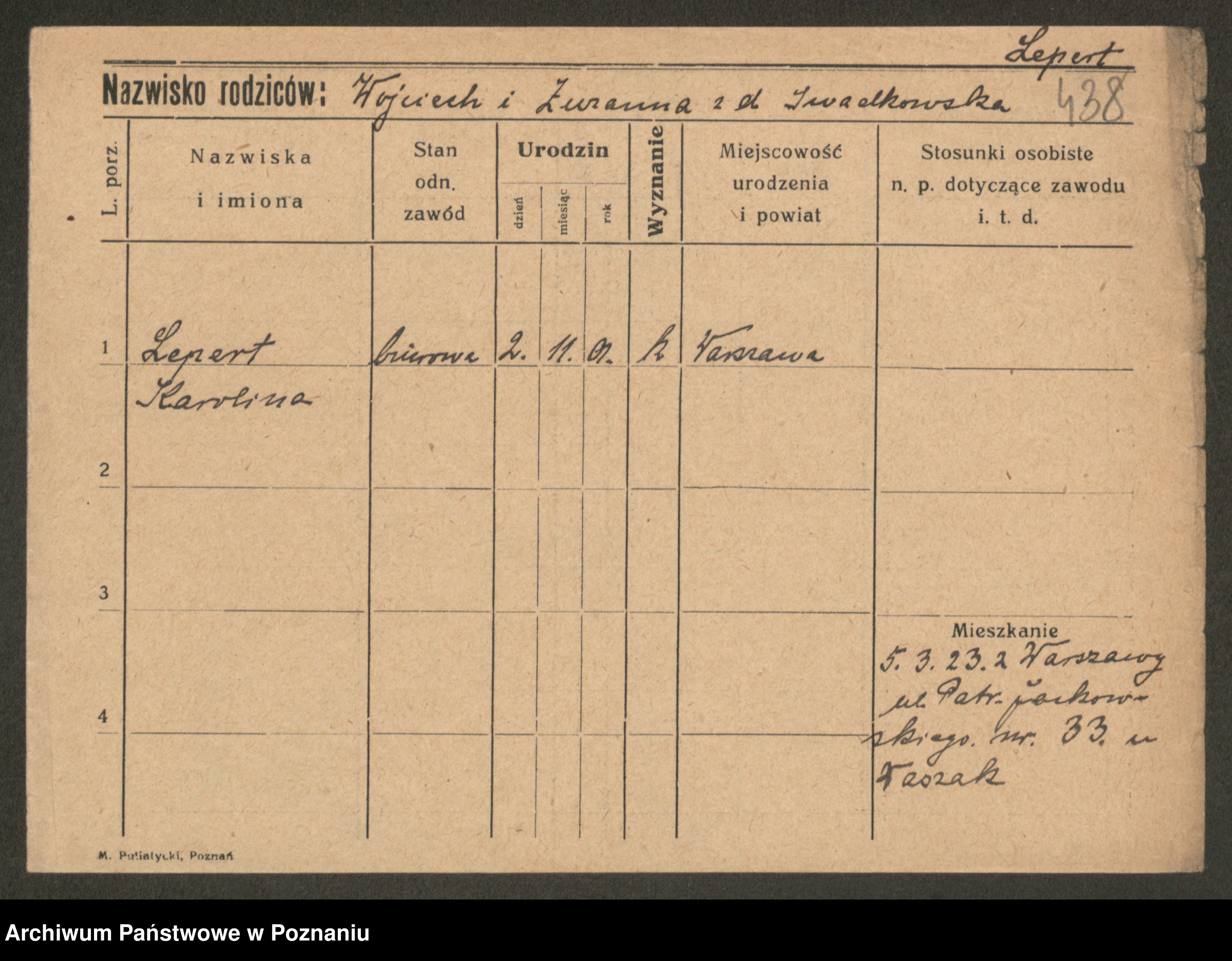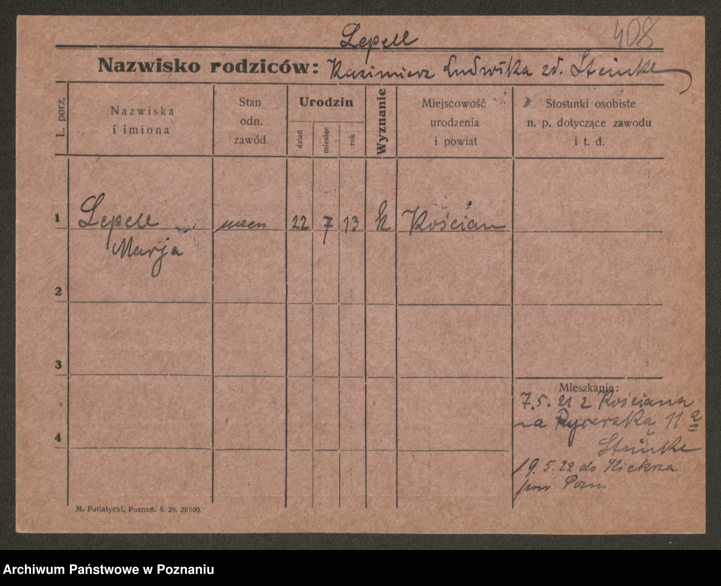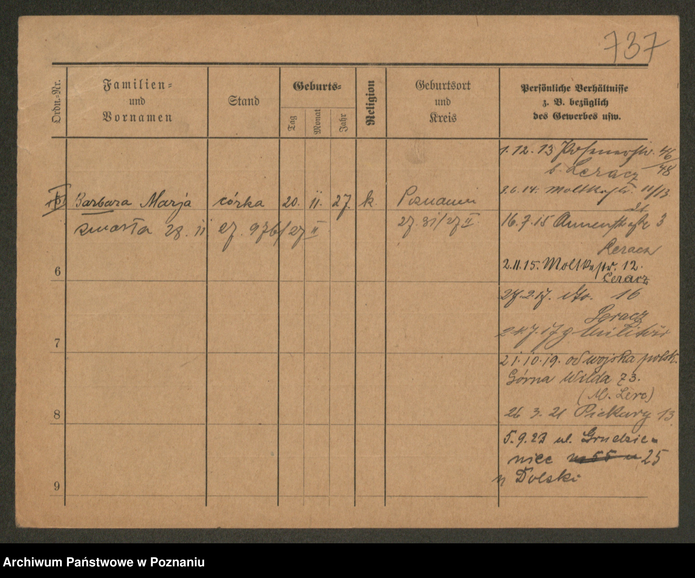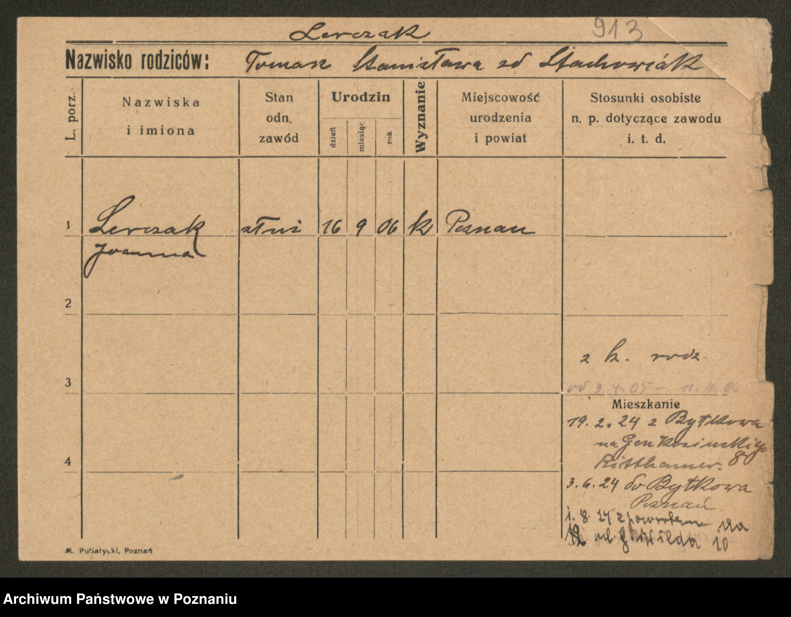 Podgląd karty osobowej dostępny jest po kliknięciu na nazwisko lub ikonkę karty. Można dokonywać powiększenia (ikony na górze) lub przechodzić między kolejnymi skanami (strzałki po bokach).