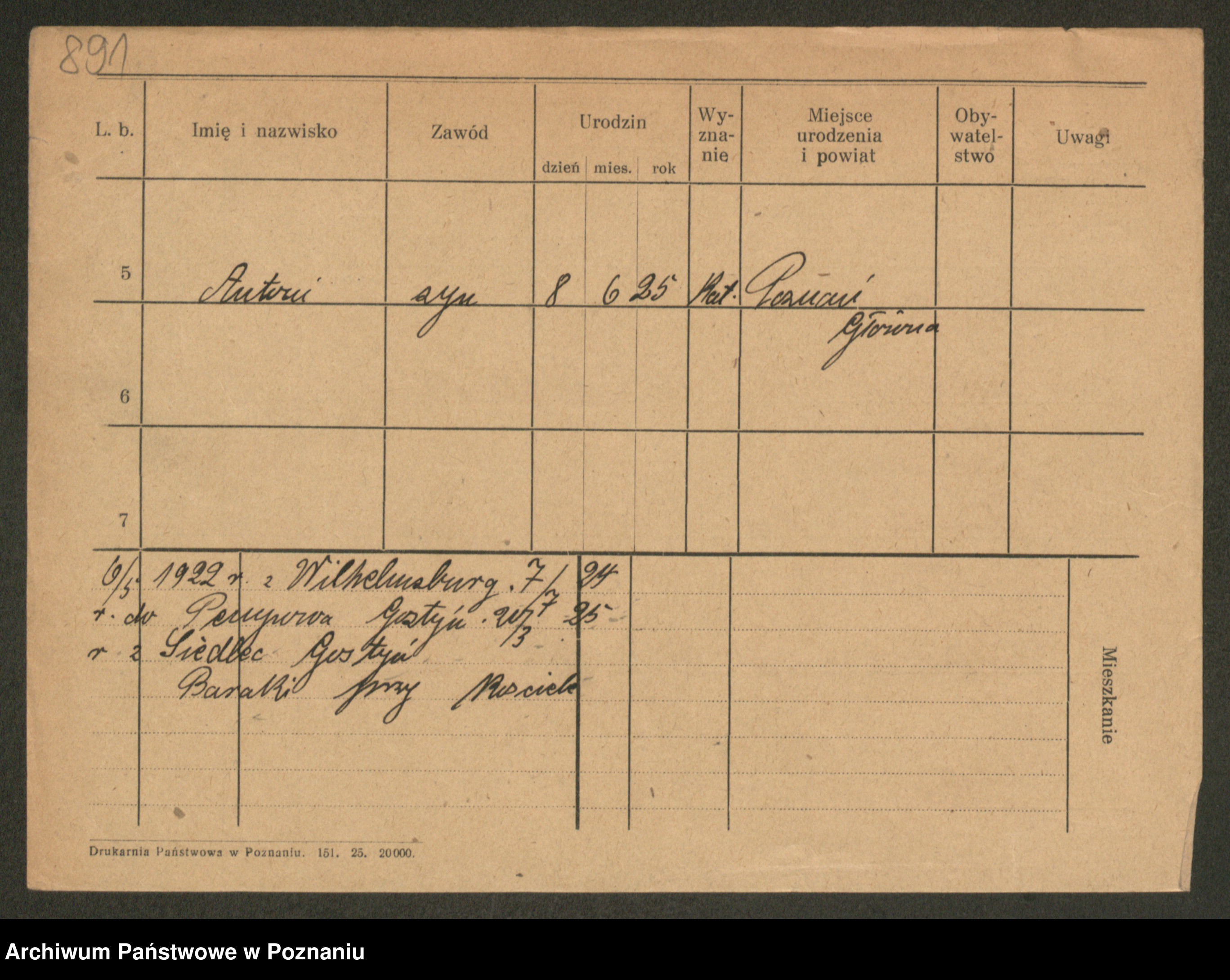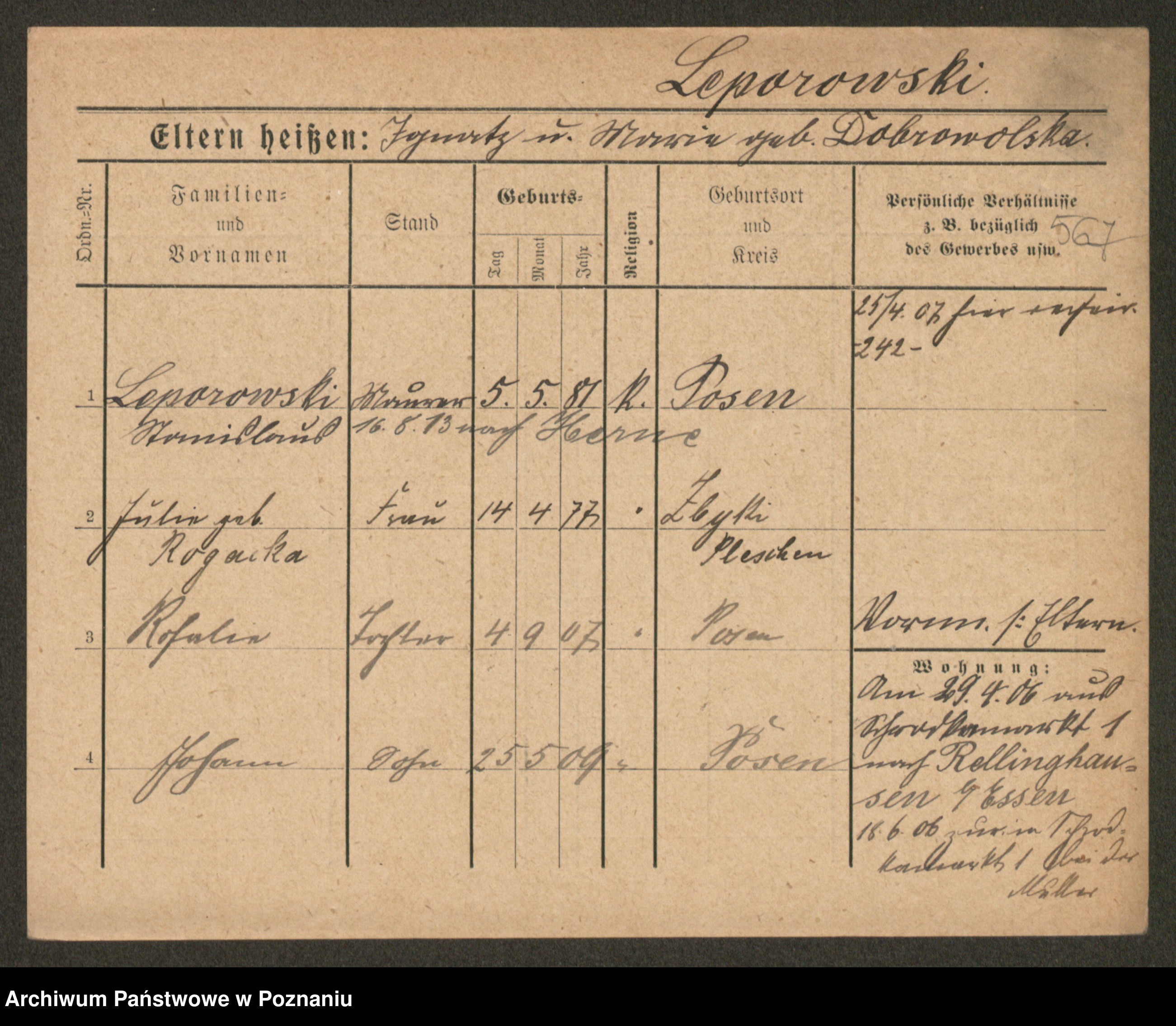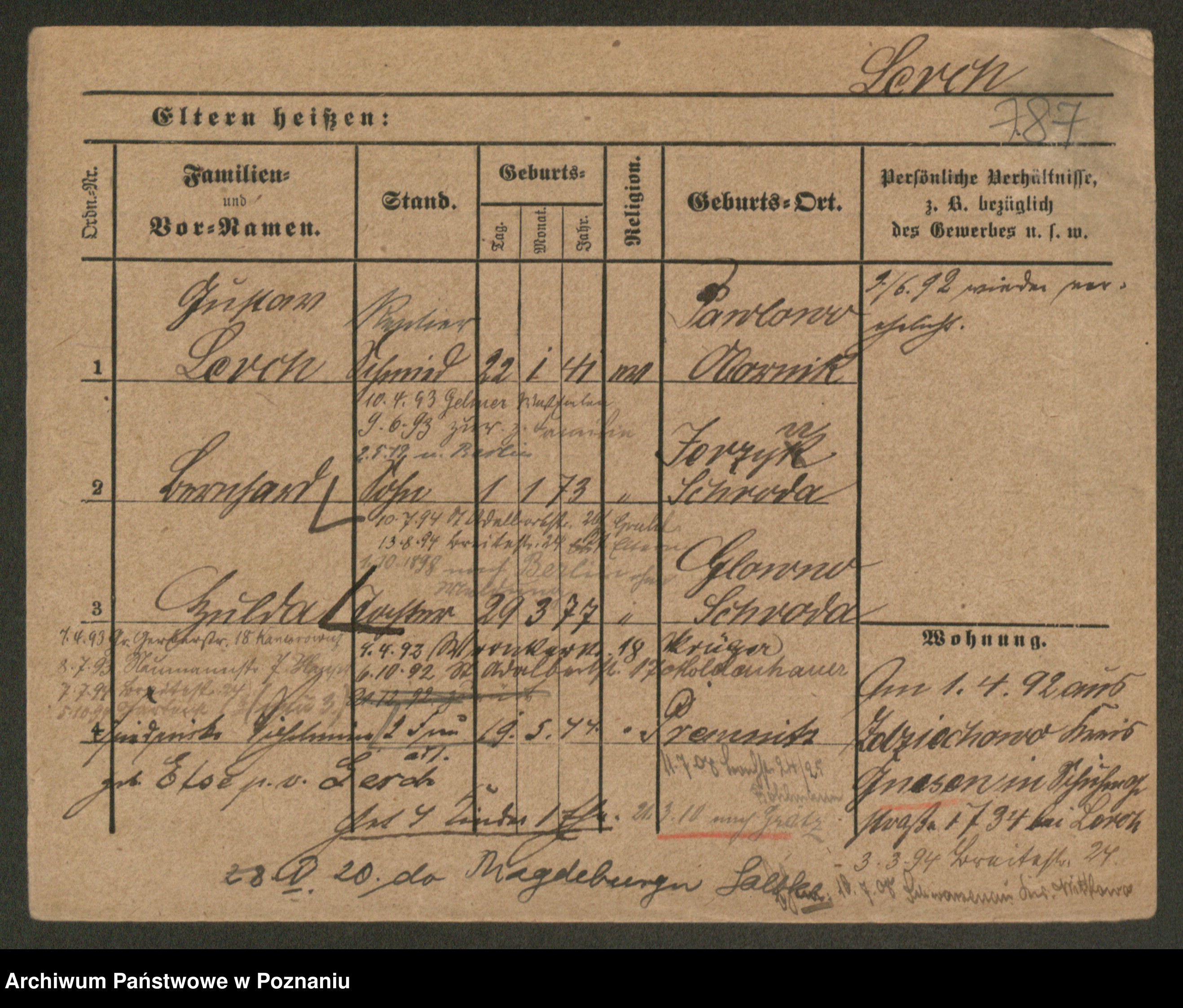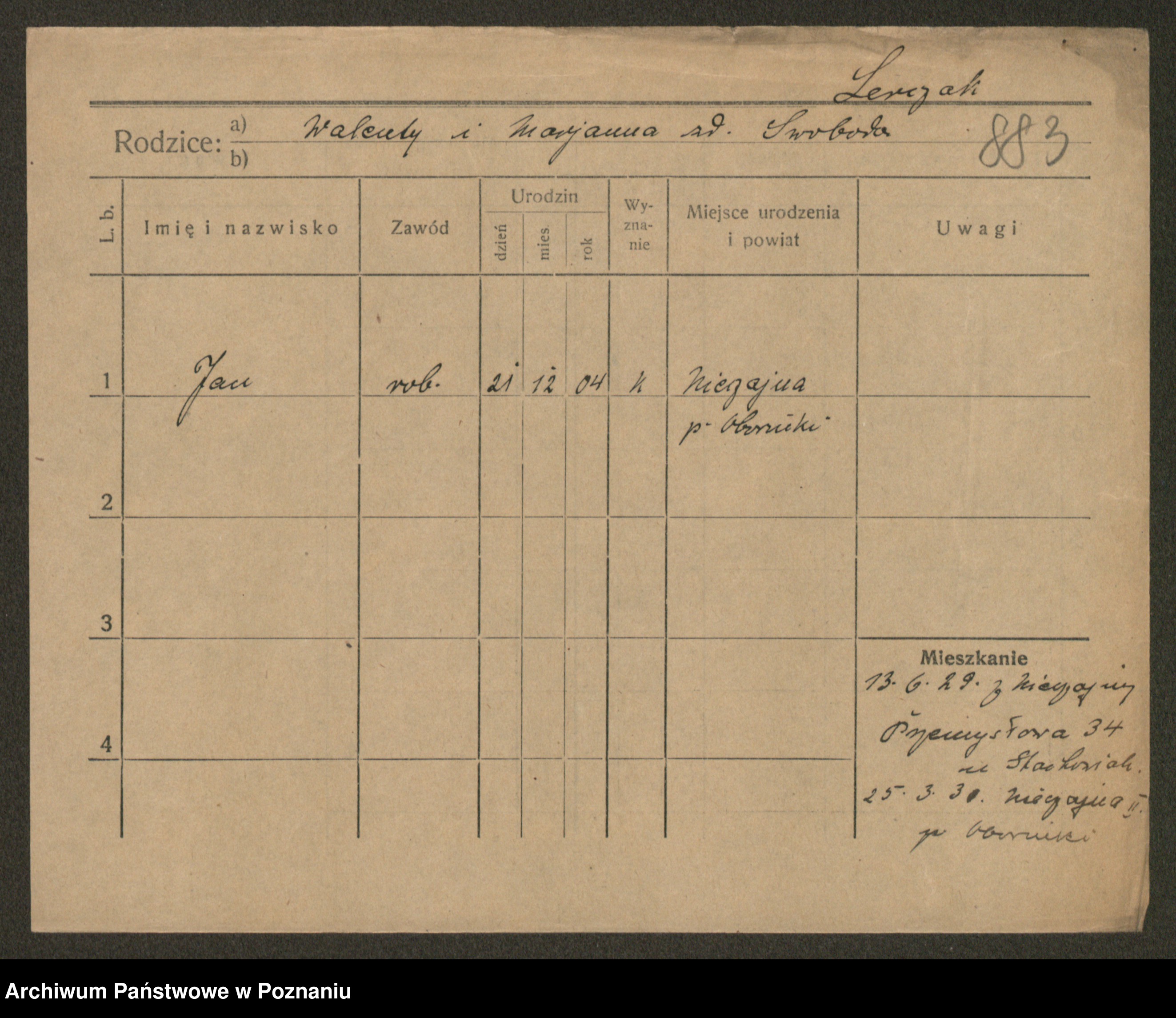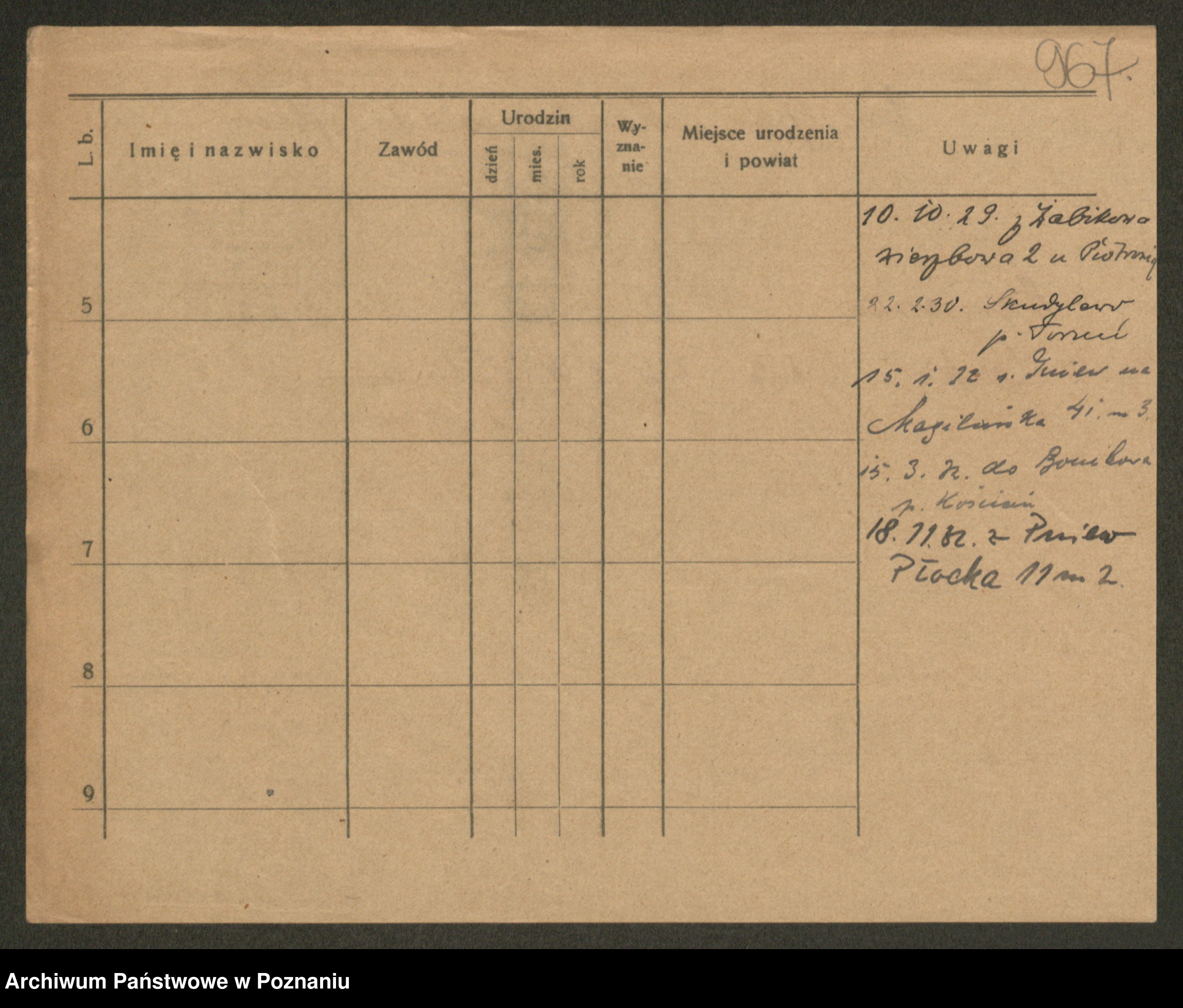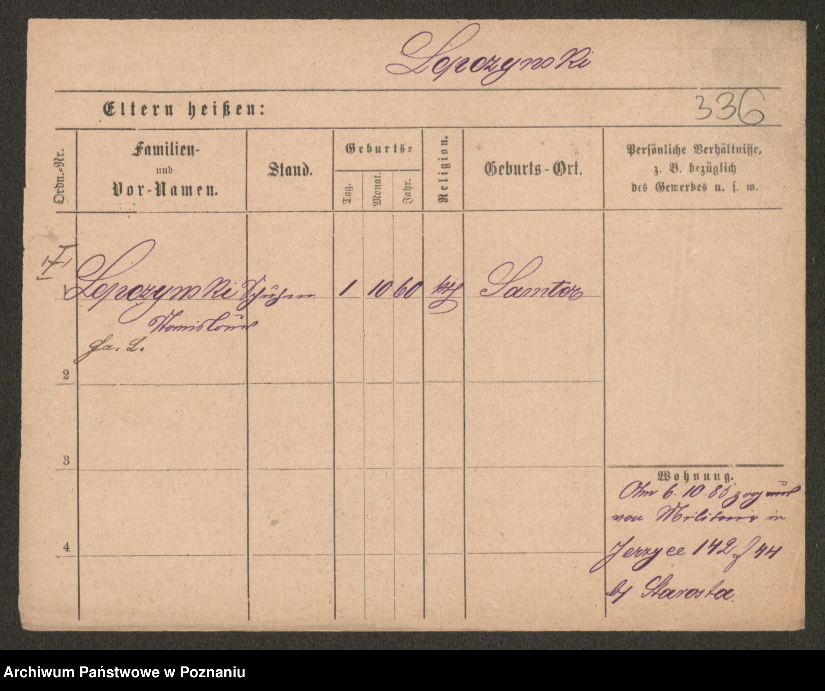 Podgląd karty osobowej dostępny jest po kliknięciu na nazwisko lub ikonkę karty. Można dokonywać powiększenia (ikony na górze) lub przechodzić między kolejnymi skanami (strzałki po bokach).