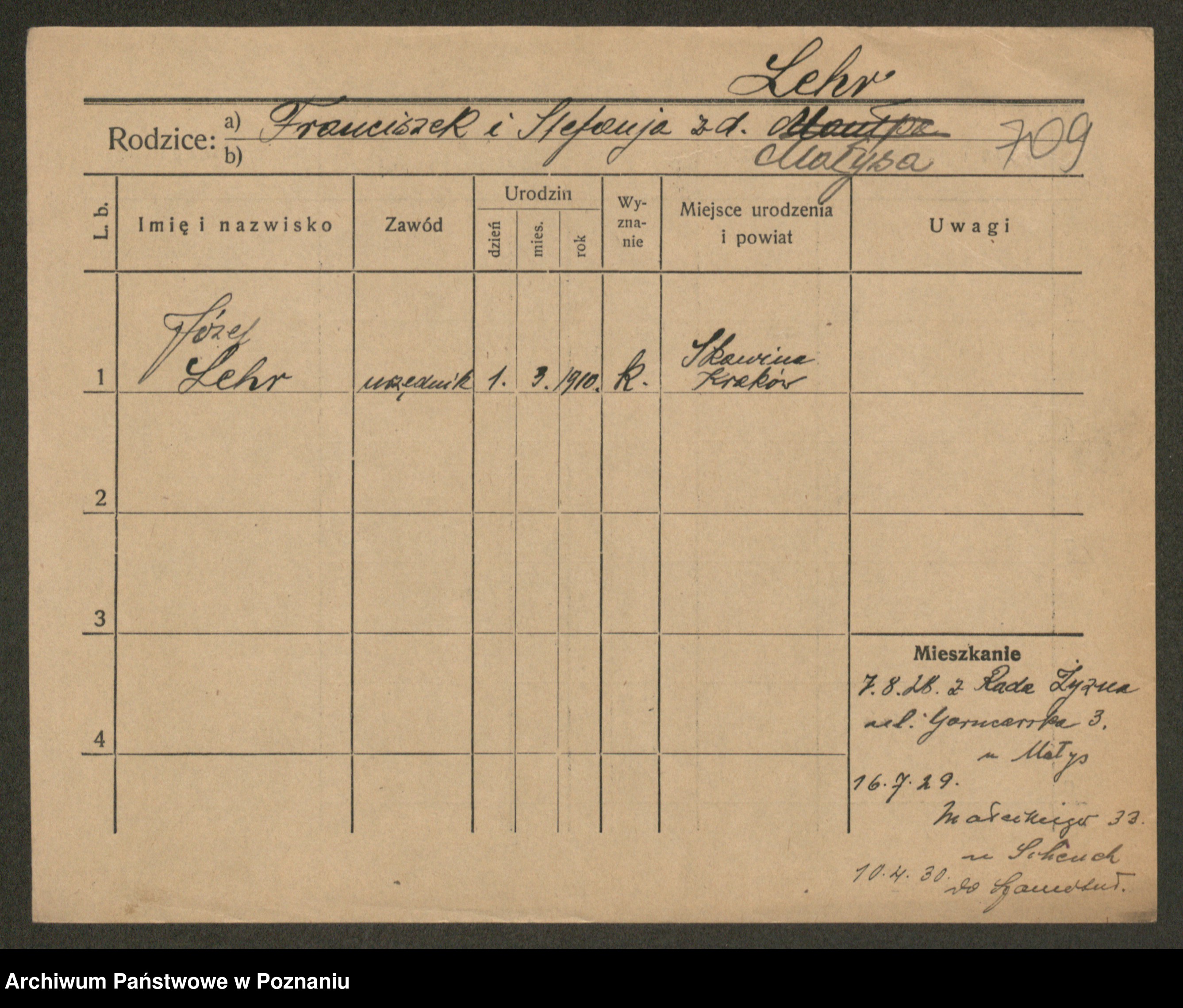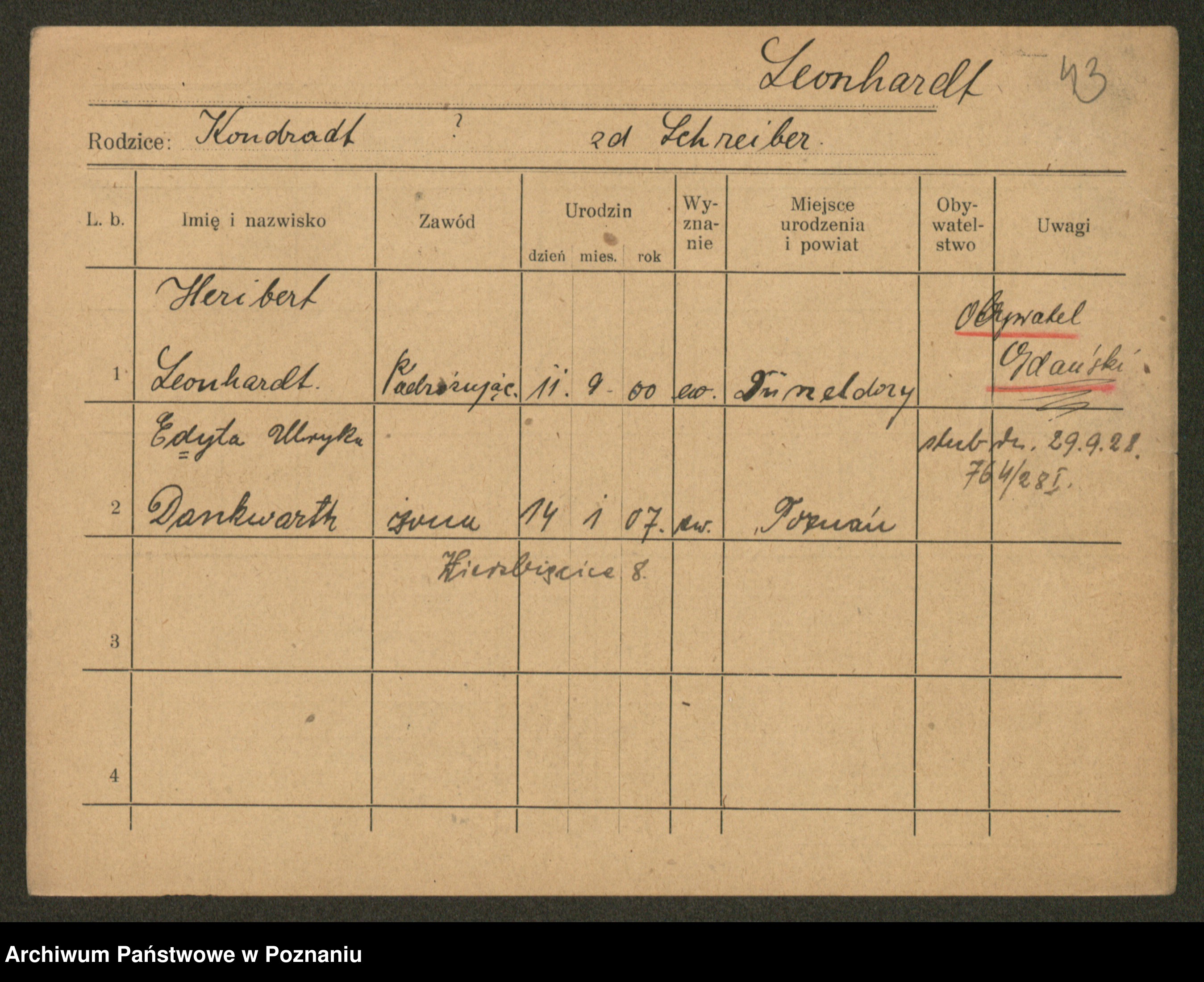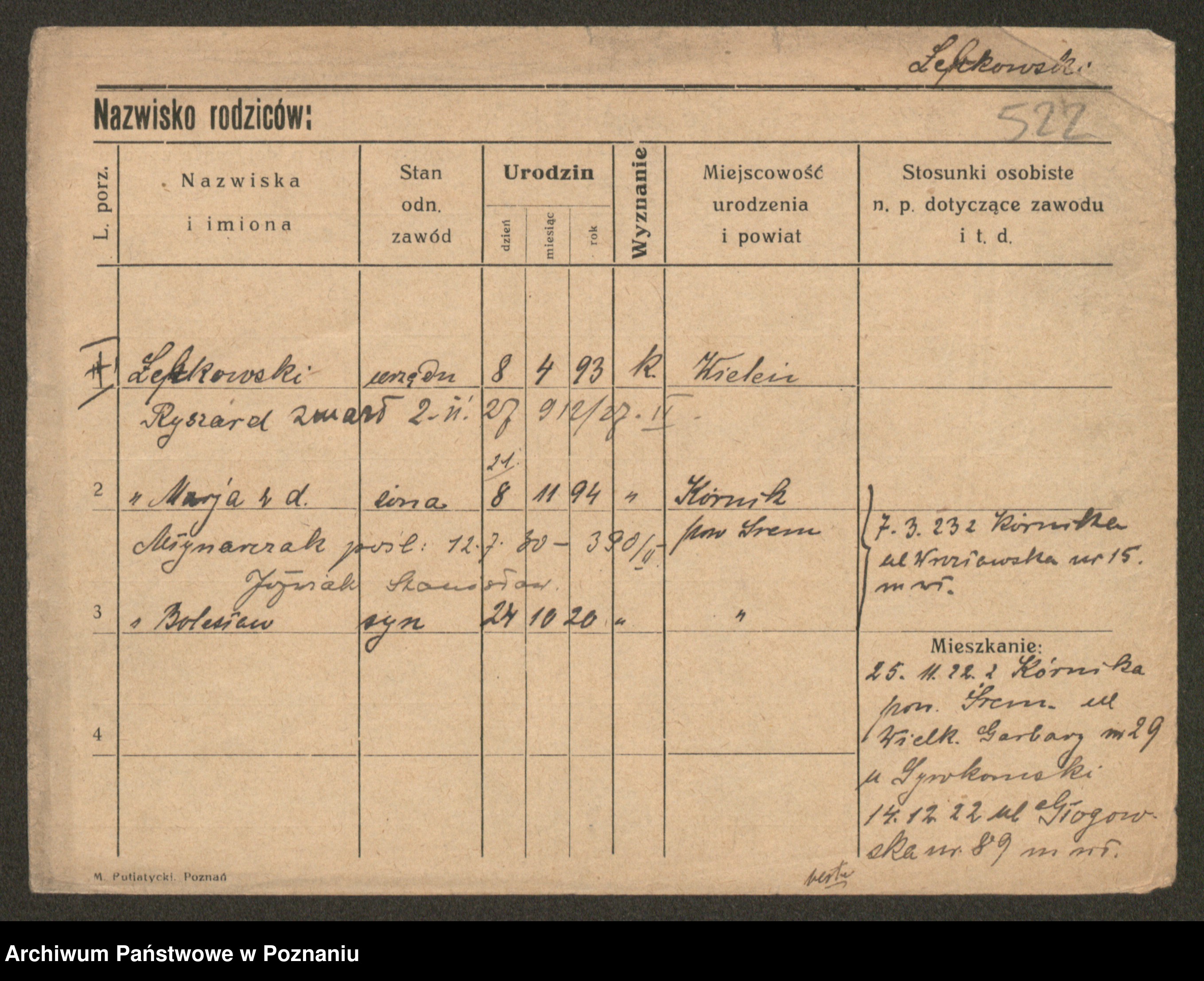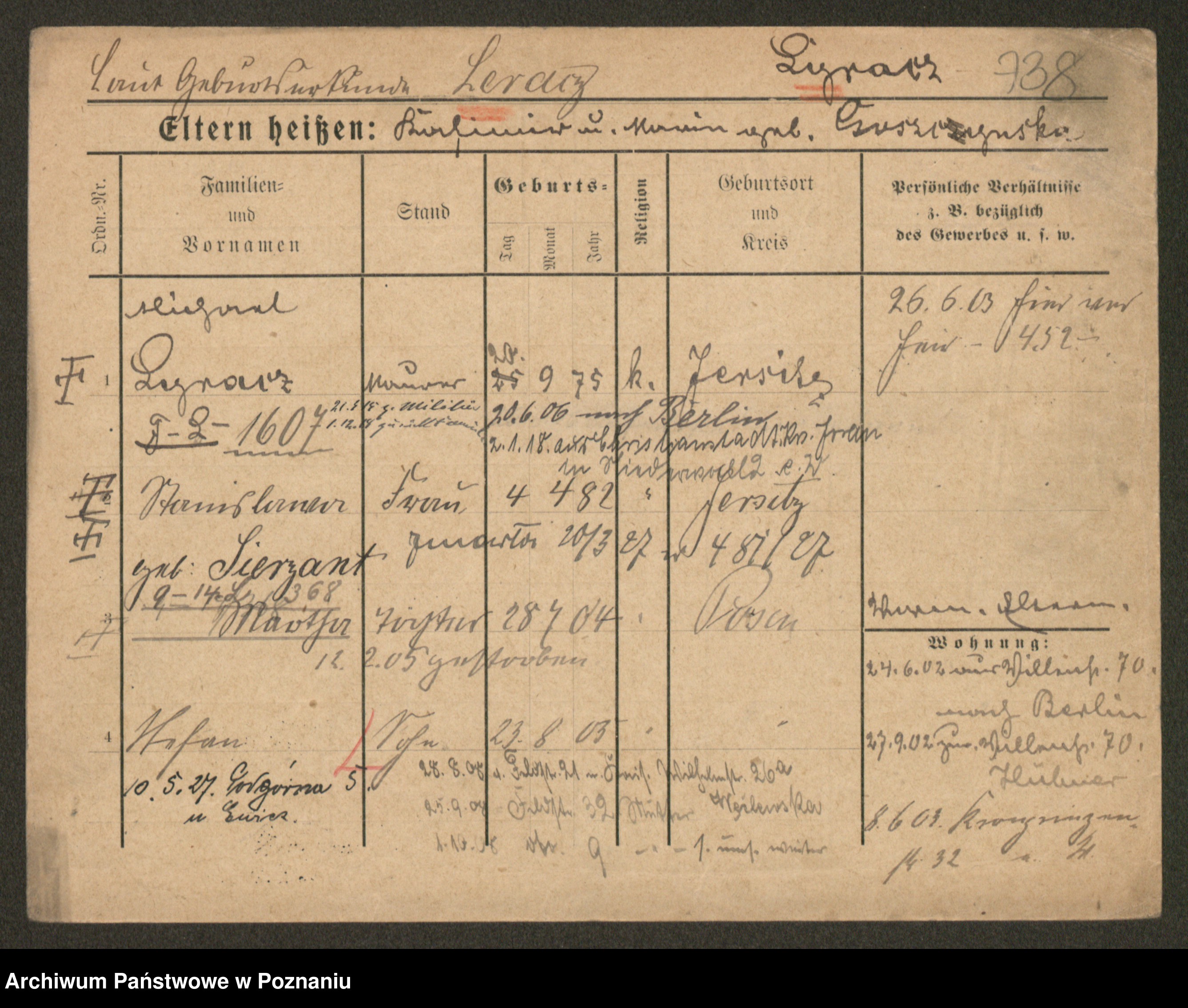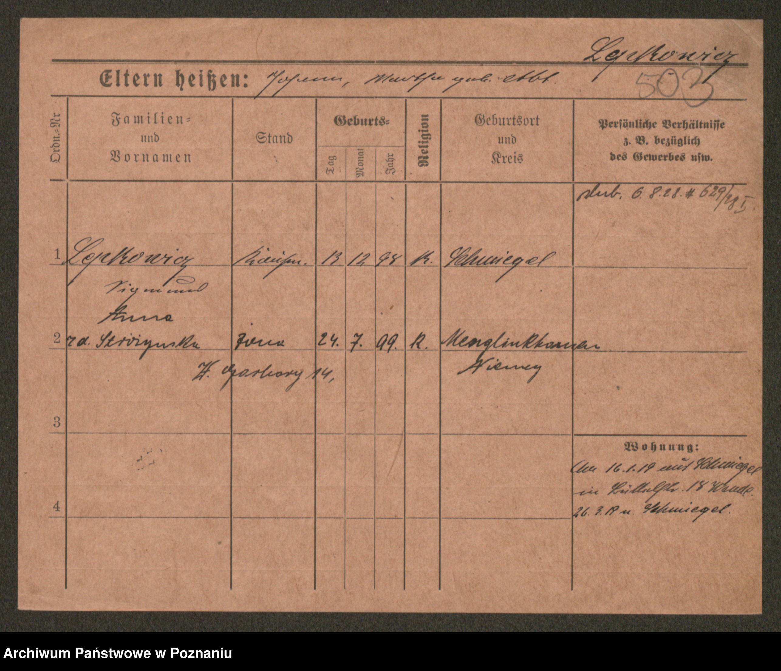 Podgląd karty osobowej dostępny jest po kliknięciu na nazwisko lub ikonkę karty. Można dokonywać powiększenia (ikony na górze) lub przechodzić między kolejnymi skanami (strzałki po bokach).