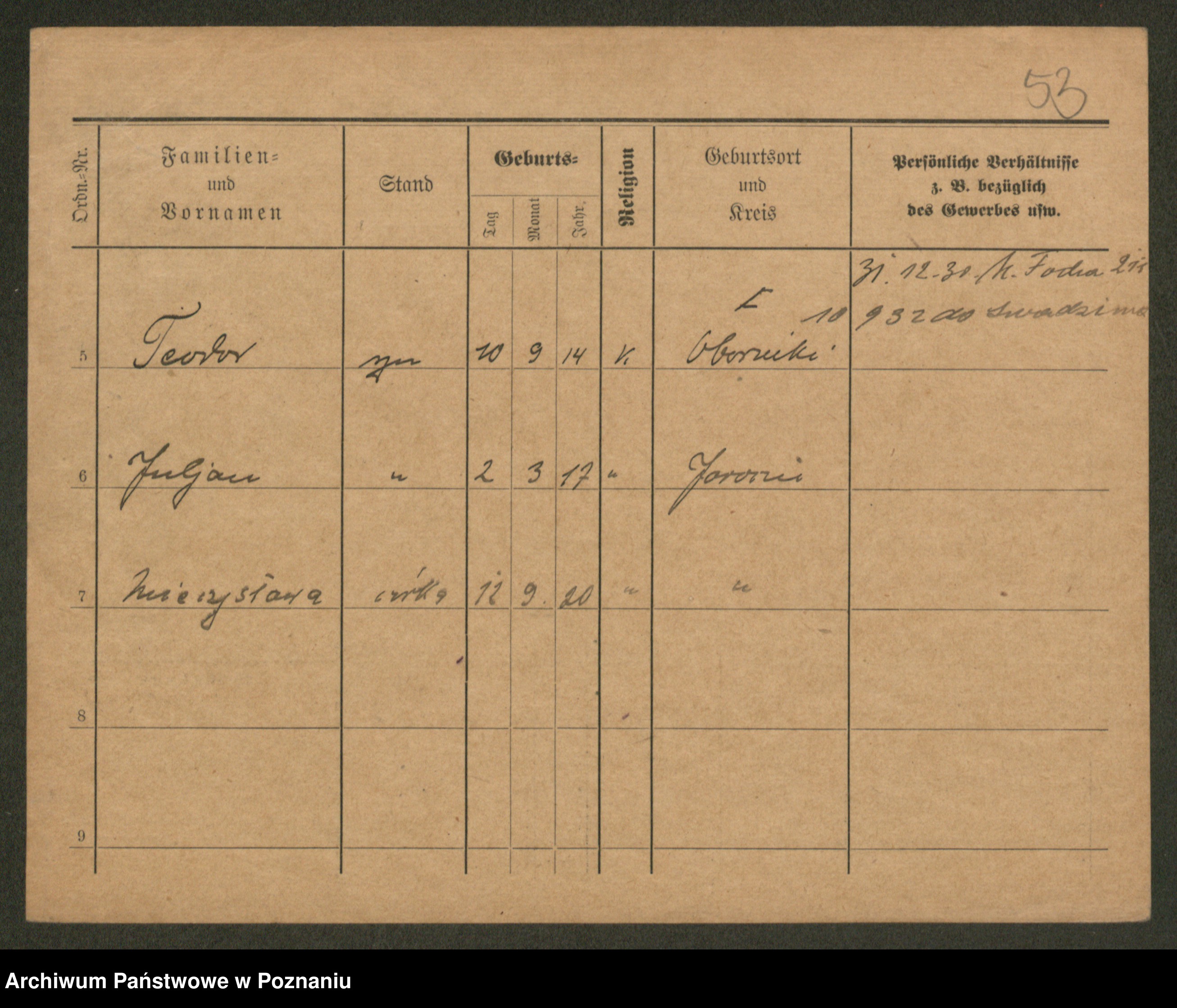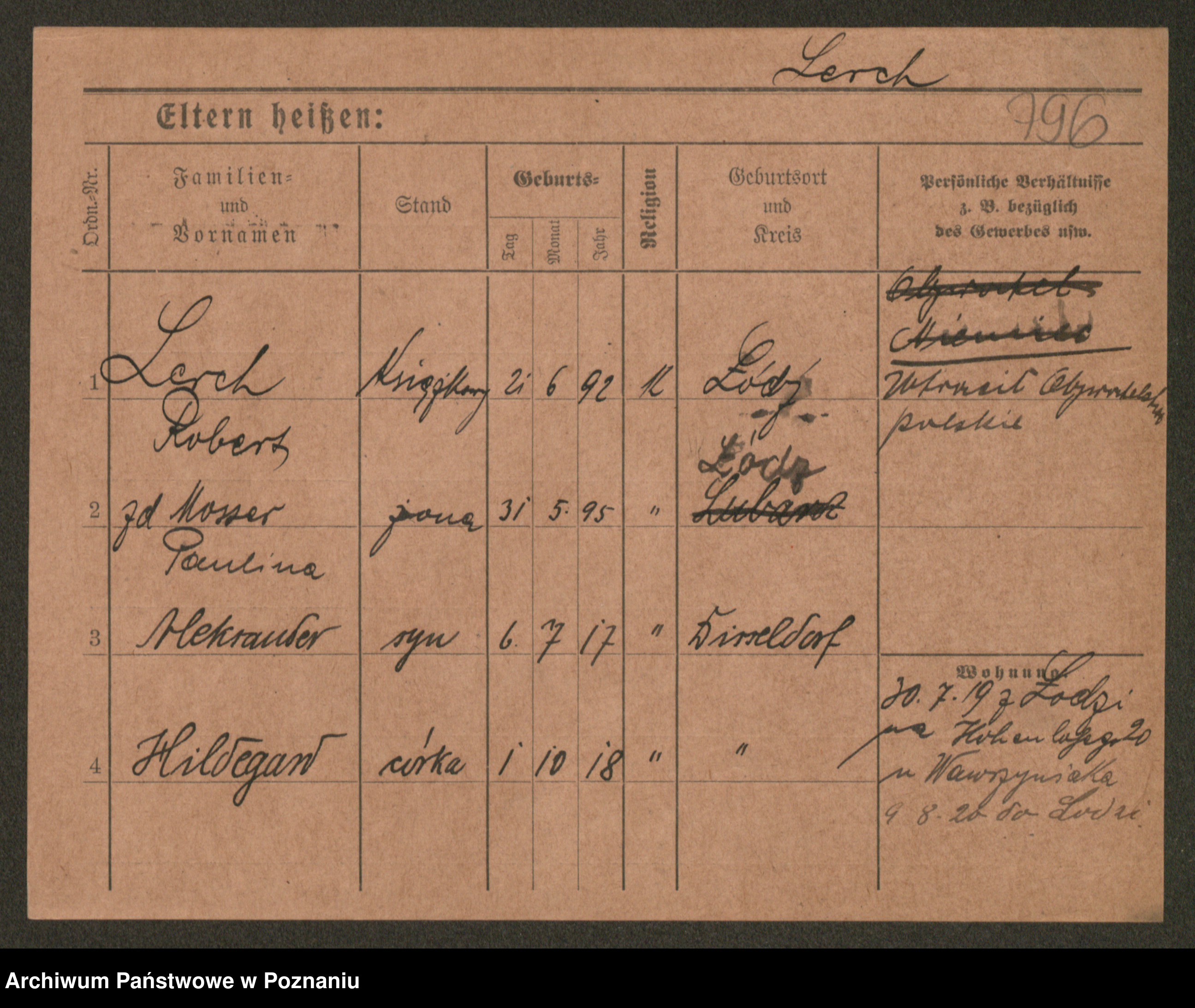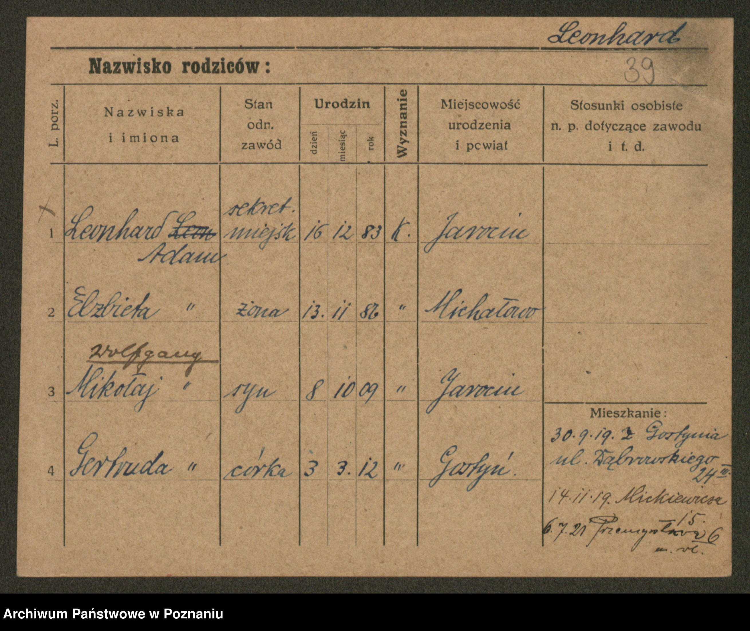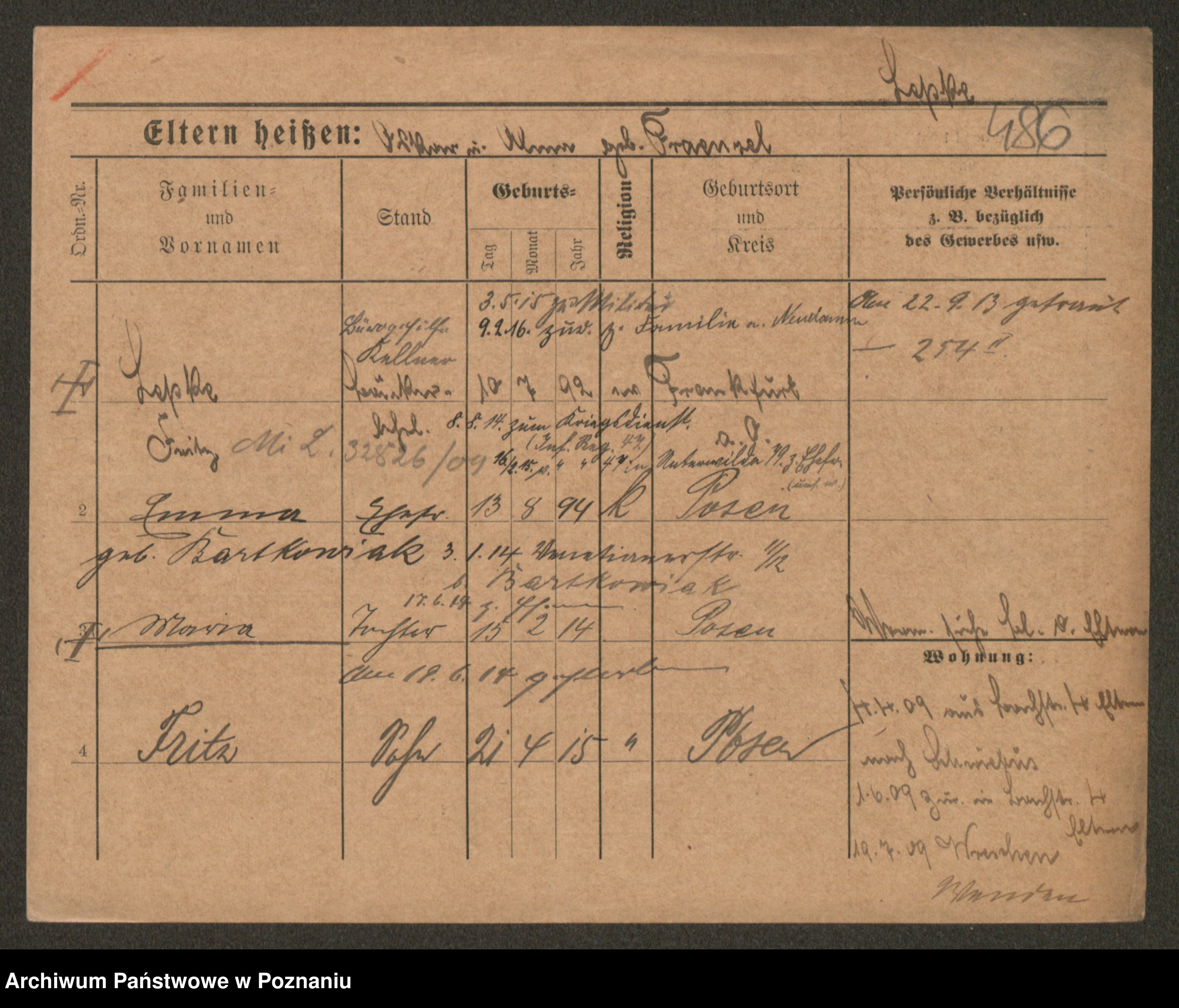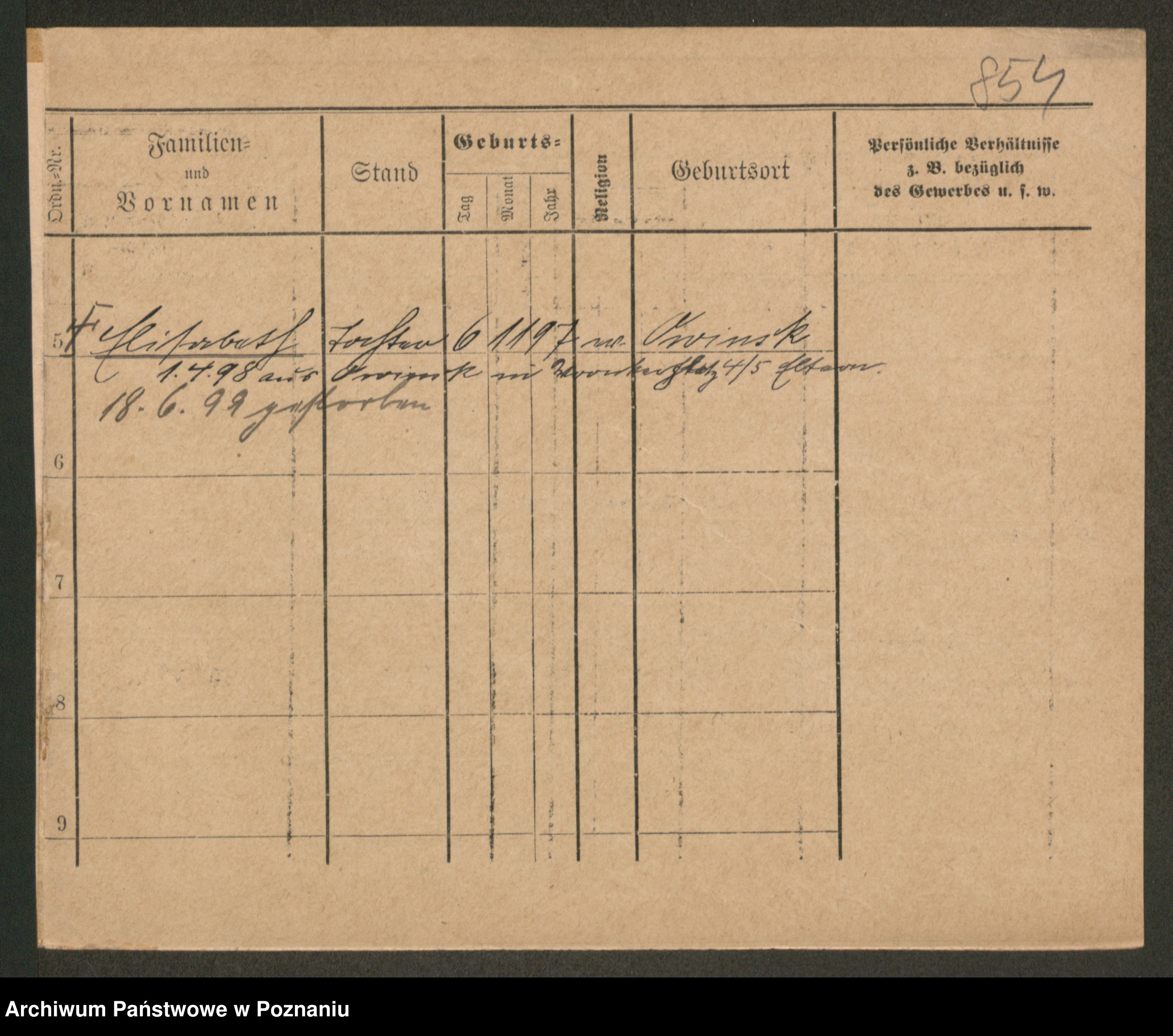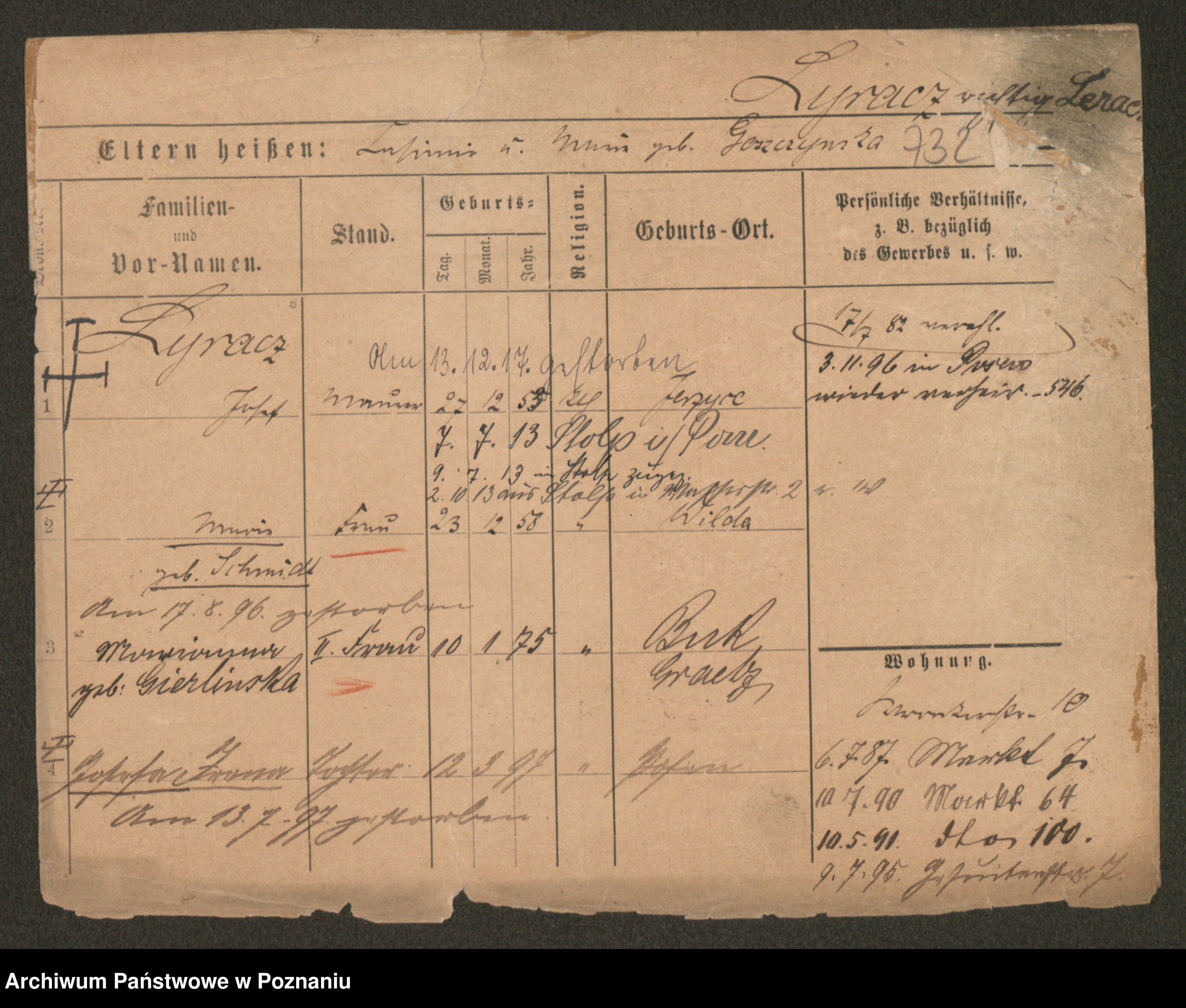 Podgląd karty osobowej dostępny jest po kliknięciu na nazwisko lub ikonkę karty. Można dokonywać powiększenia (ikony na górze) lub przechodzić między kolejnymi skanami (strzałki po bokach).