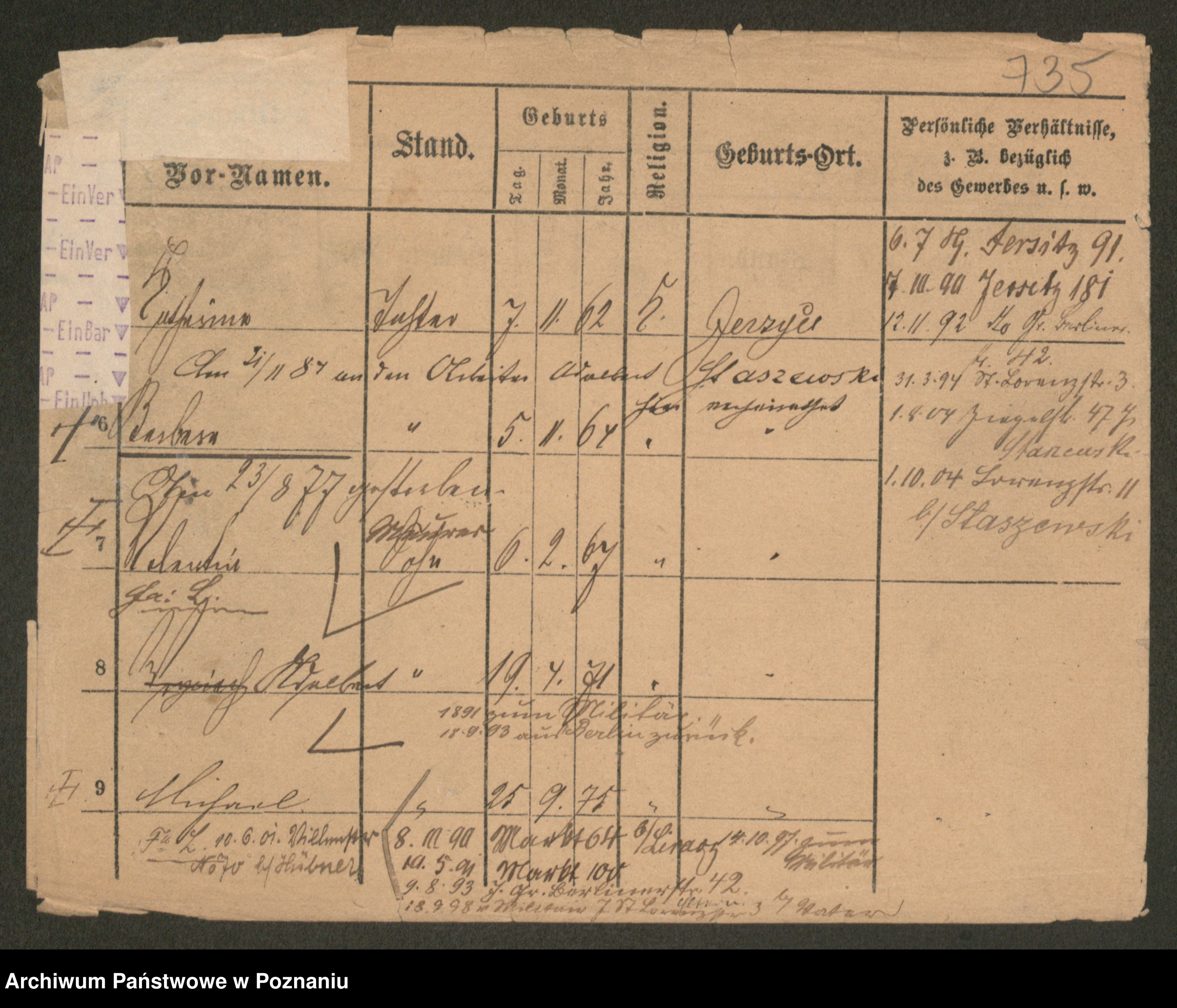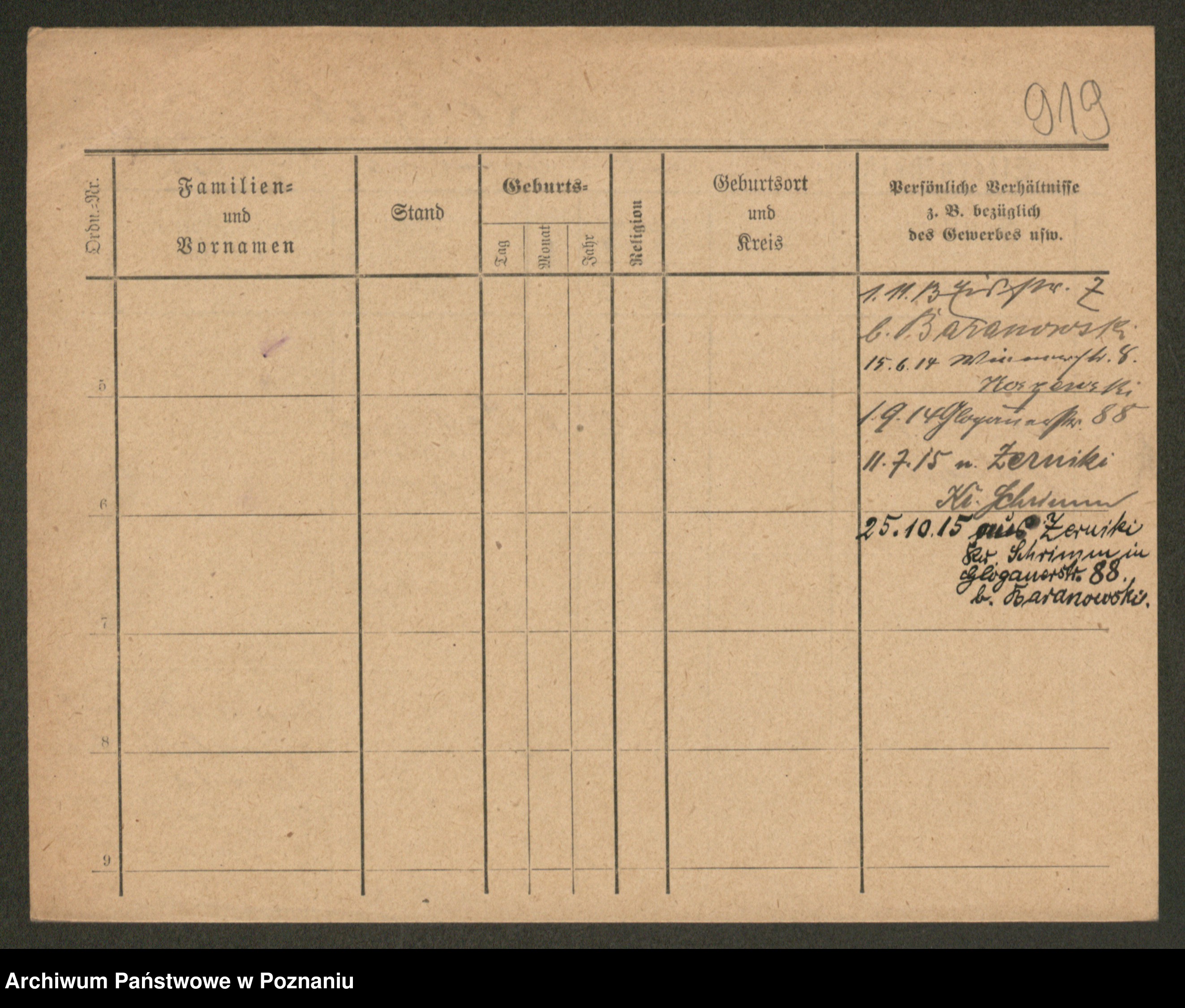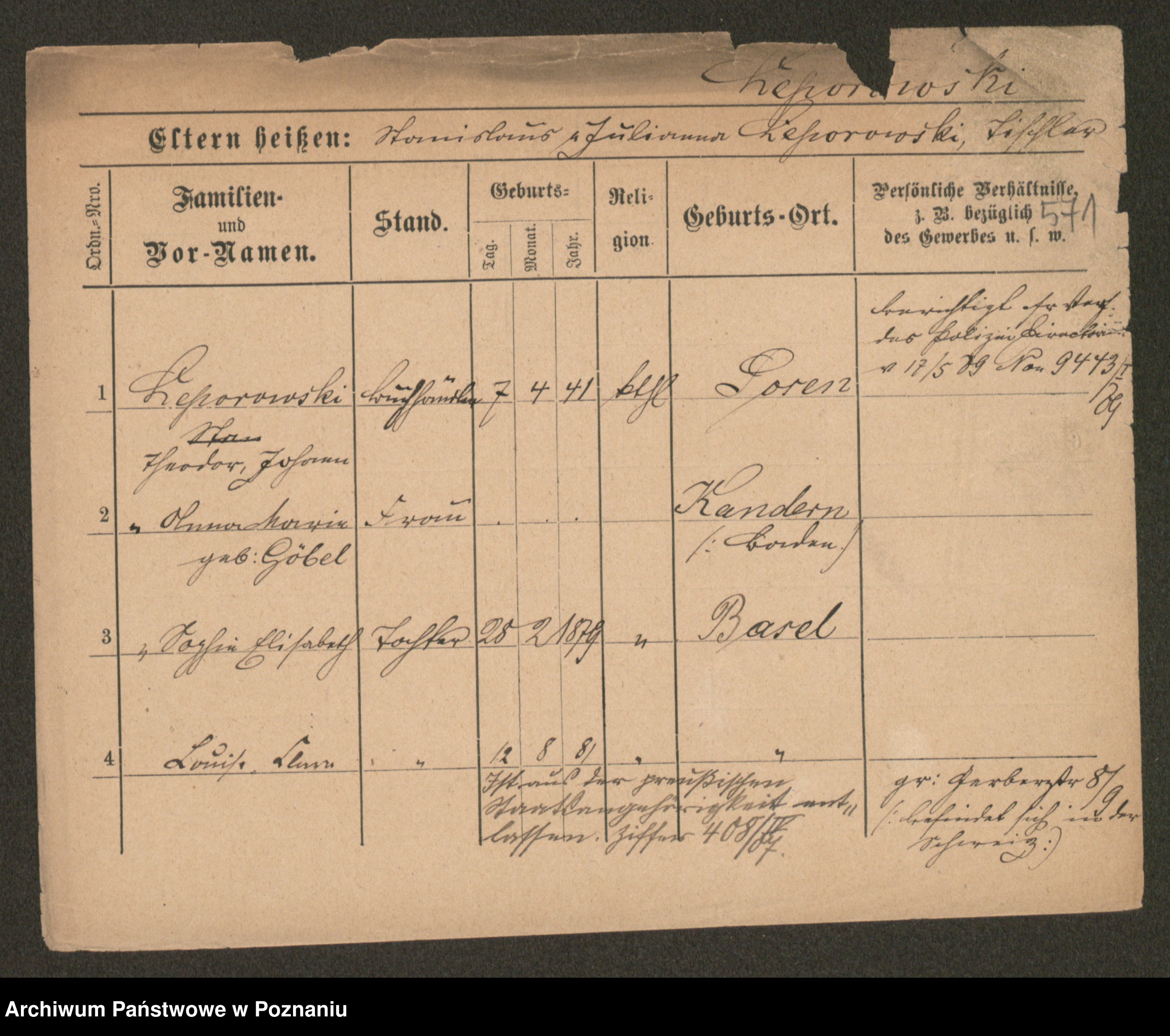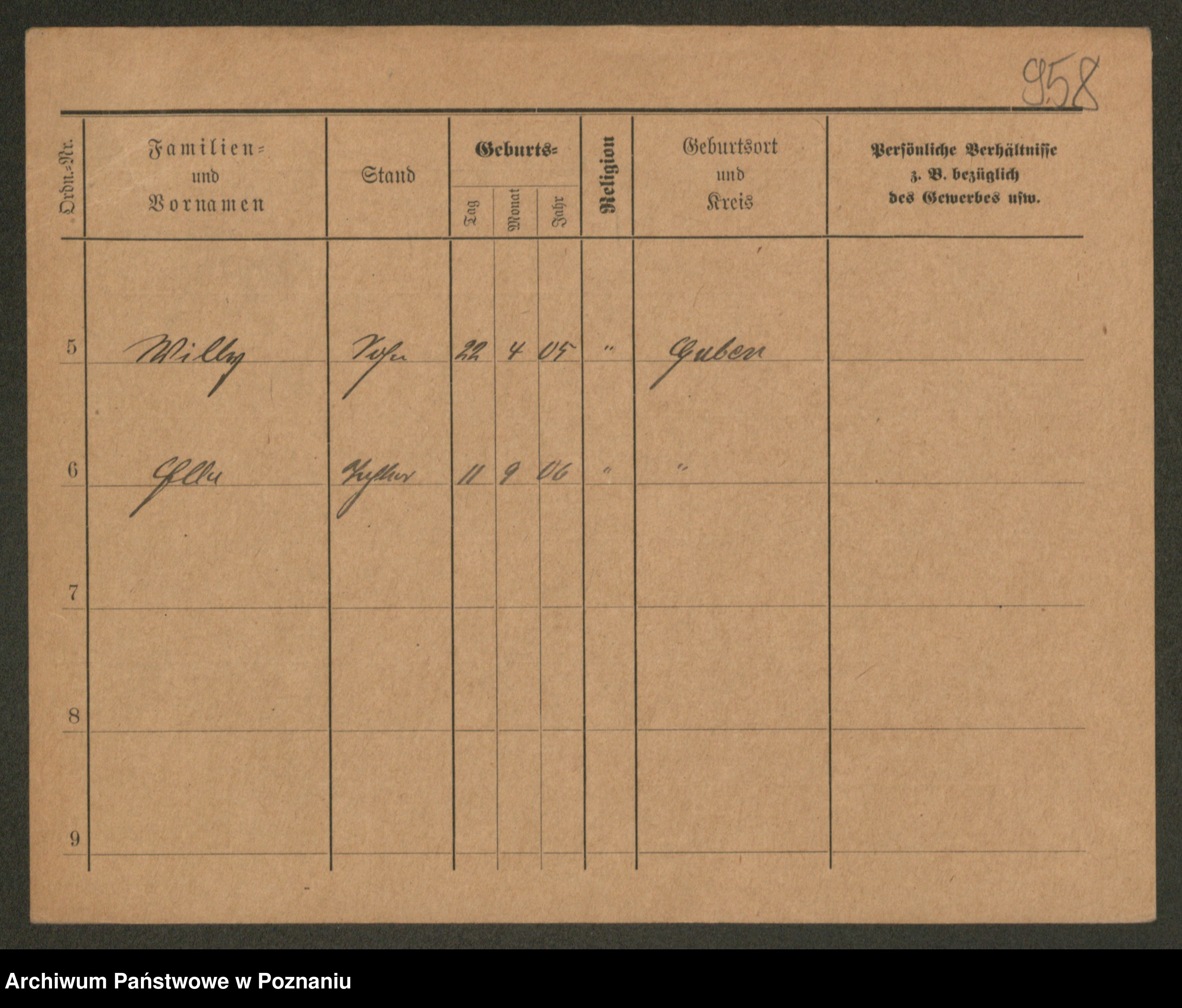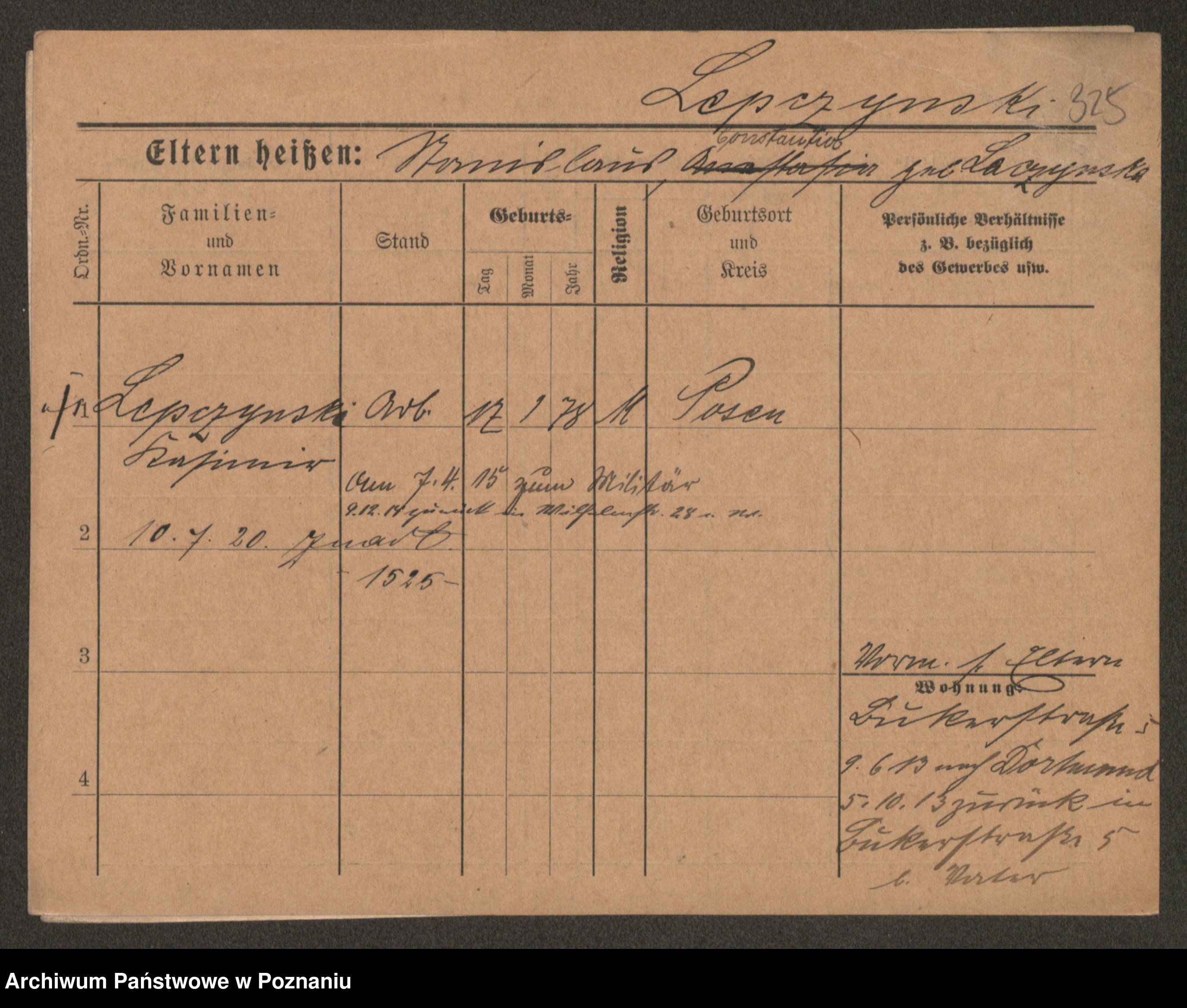 Podgląd karty osobowej dostępny jest po kliknięciu na nazwisko lub ikonkę karty. Można dokonywać powiększenia (ikony na górze) lub przechodzić między kolejnymi skanami (strzałki po bokach).